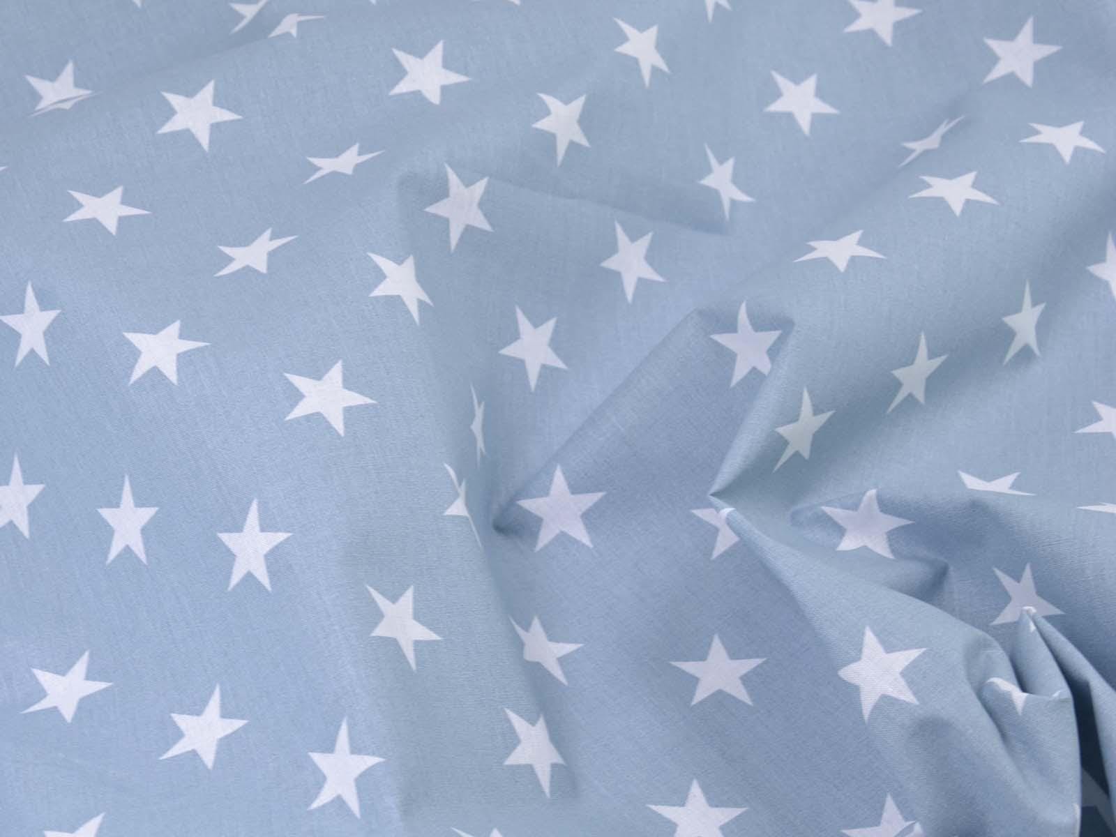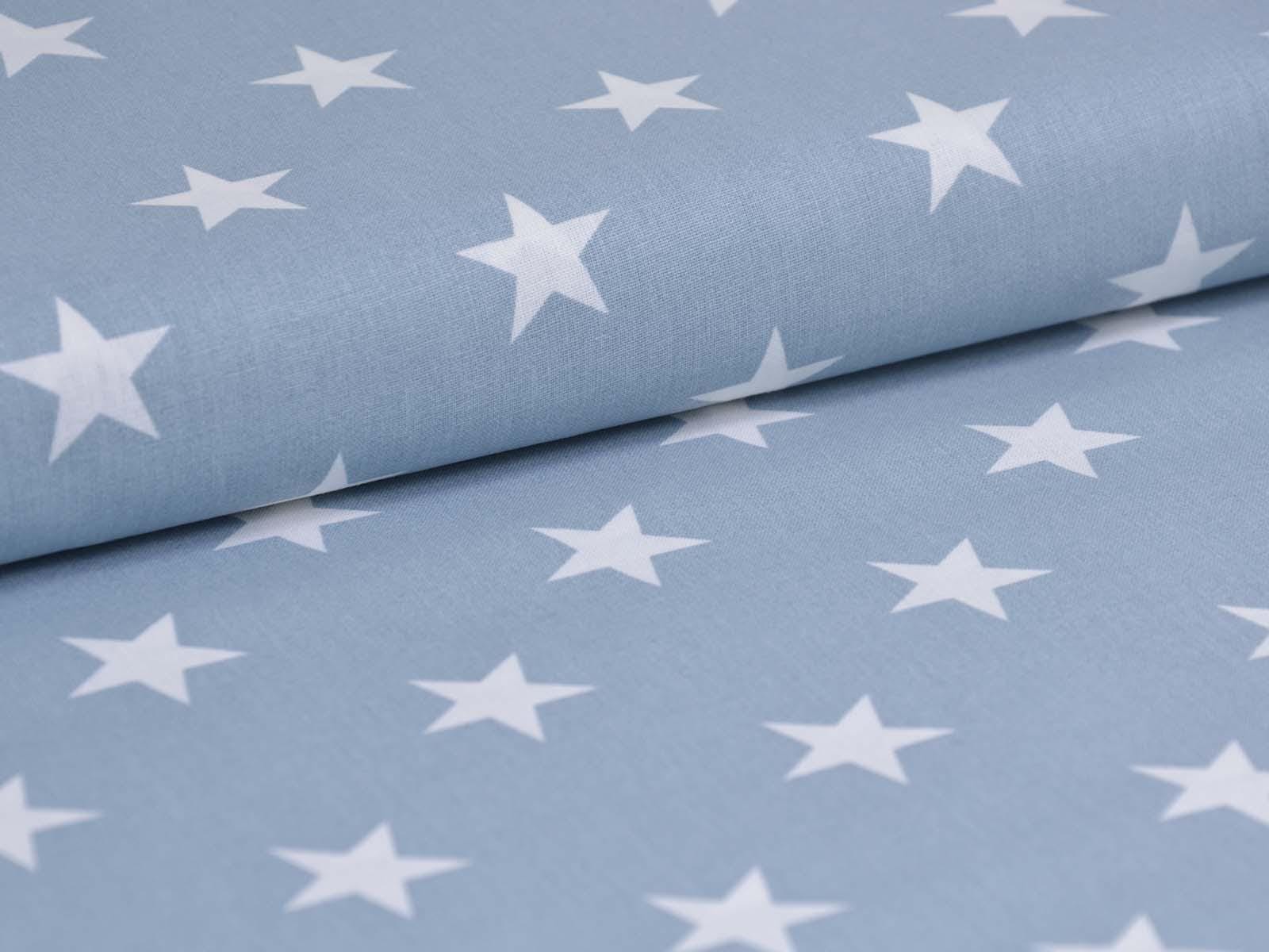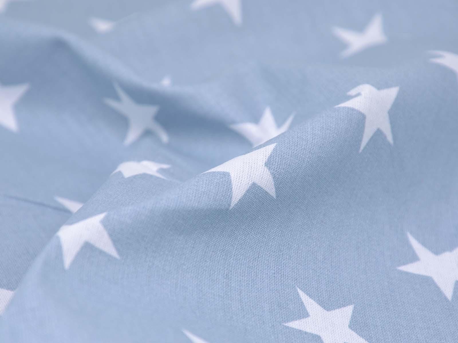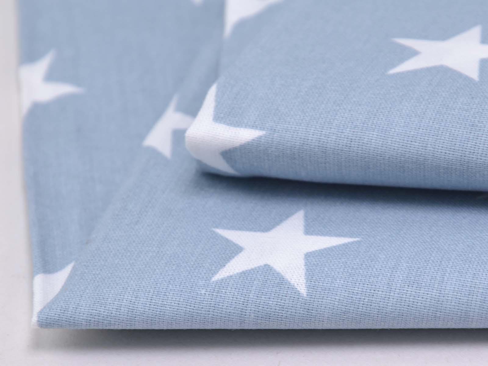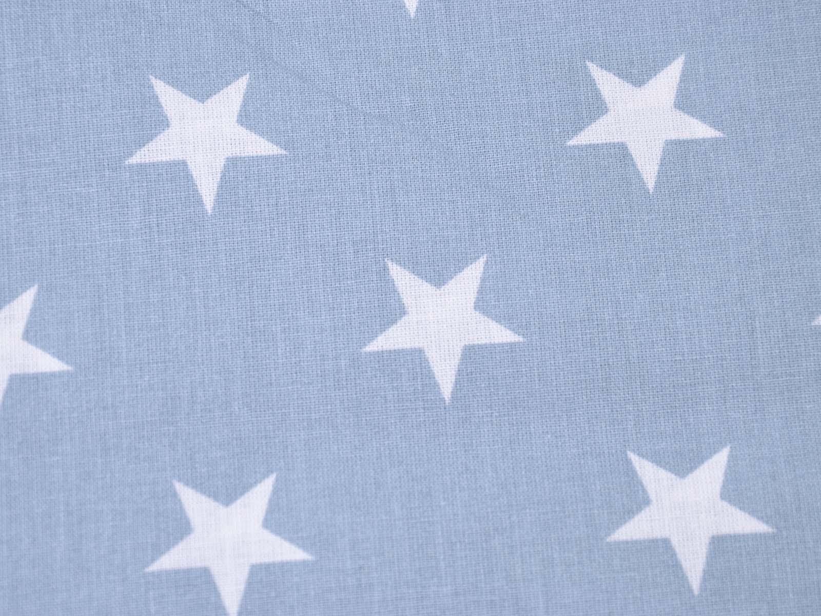 Light blue cotton fabric with white stars. Each star is approximately 2.5 cm in size. The smooth, firm fabric is ideal for patchwork projects and sewing bags, cushions, decorative items, and much more. The extra-wide fabric is 2.95 m wide.