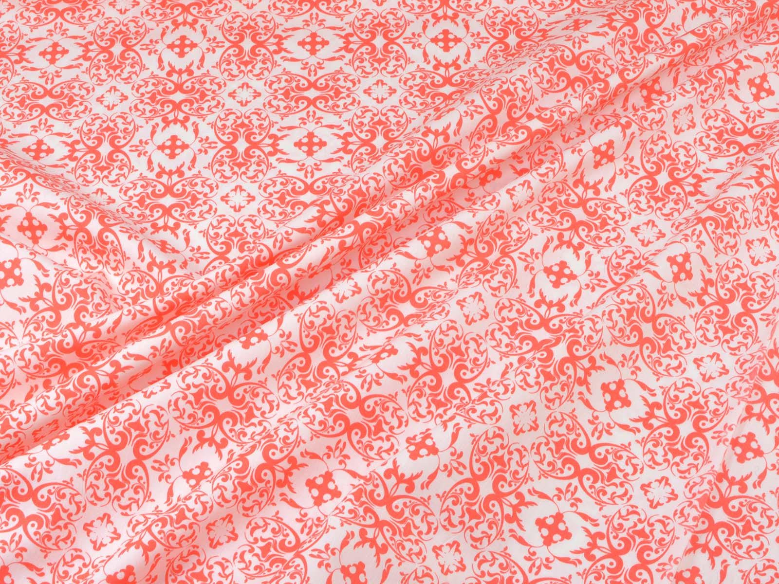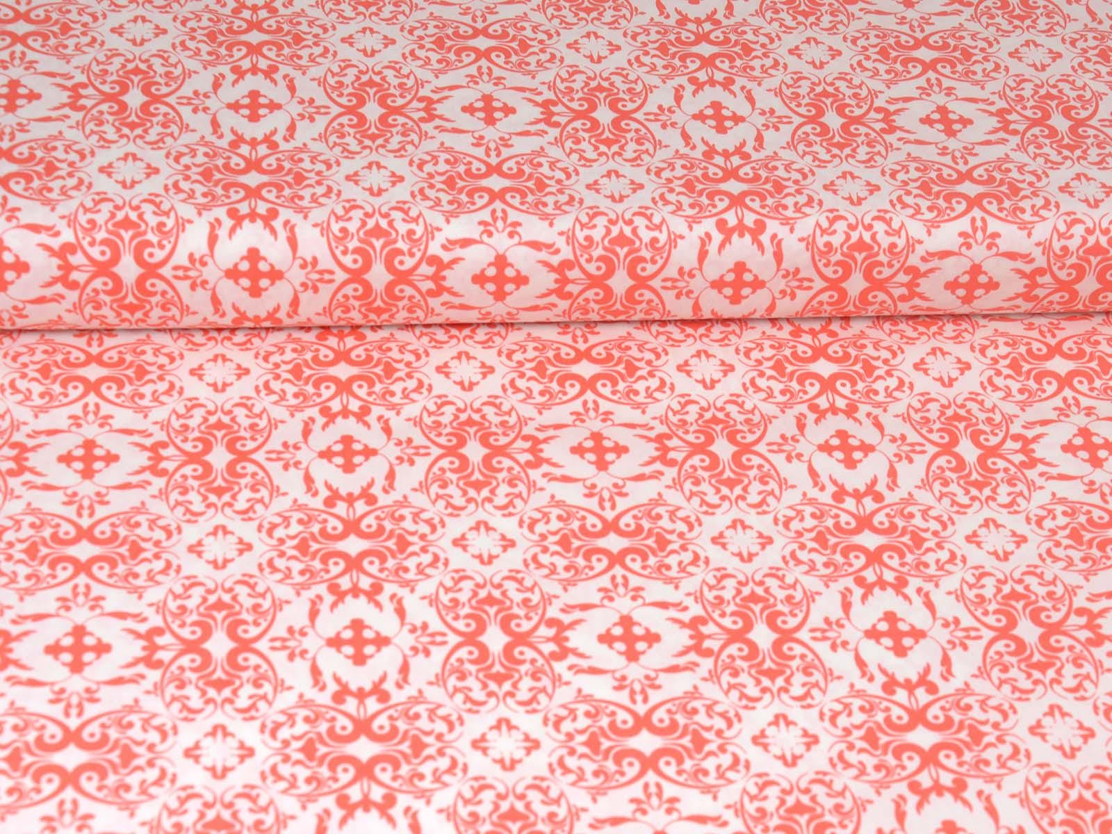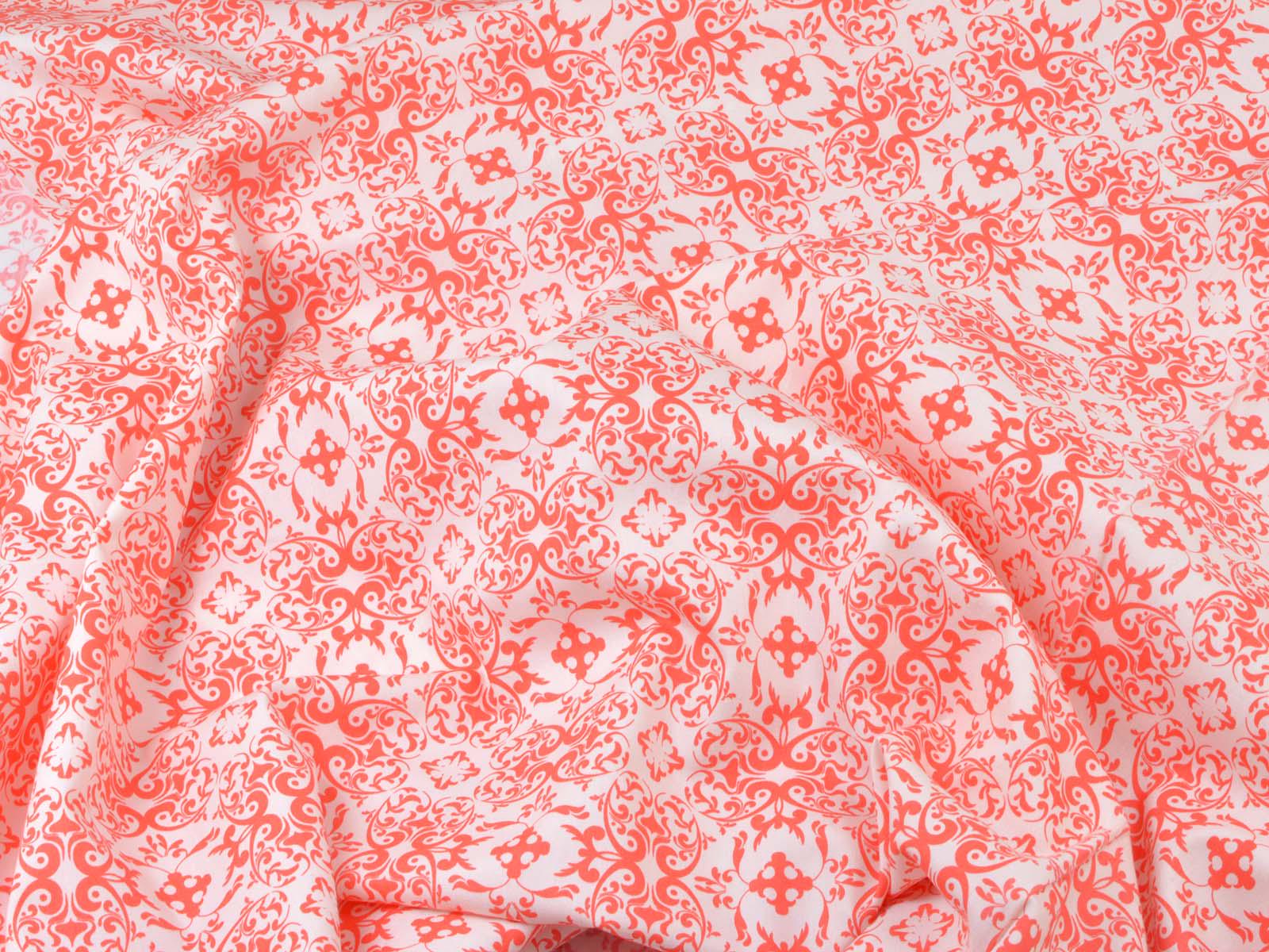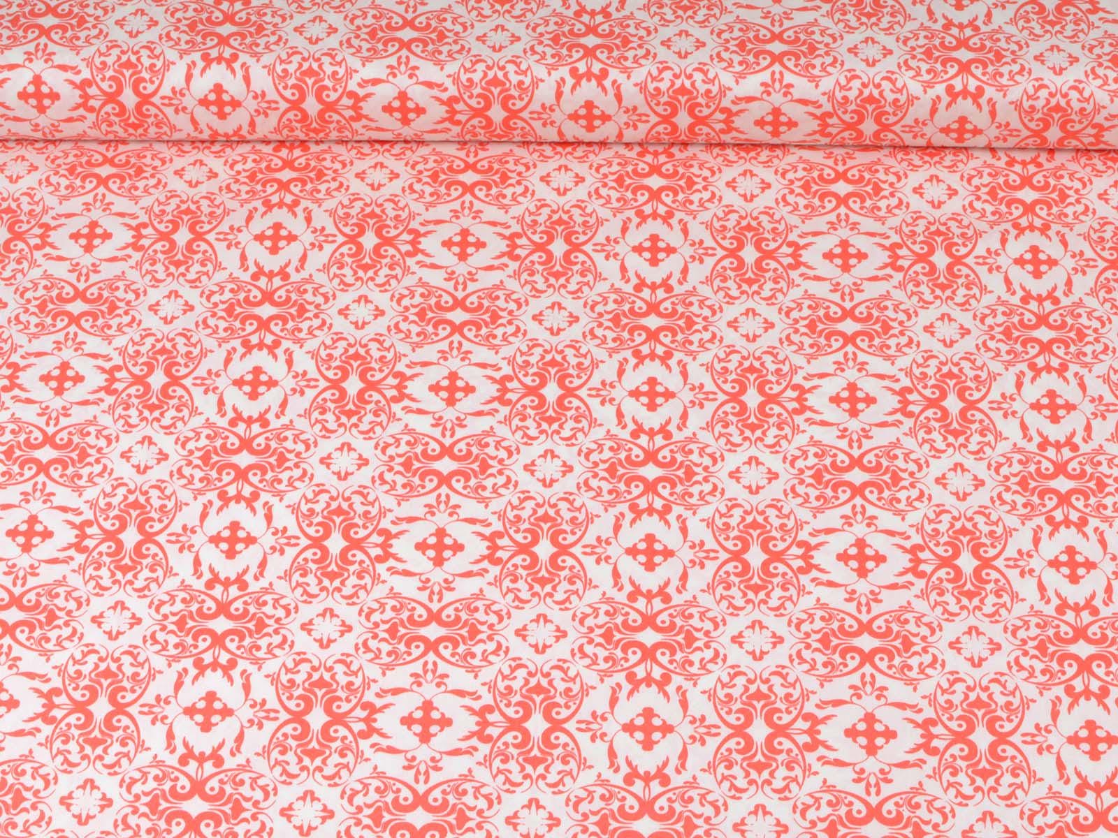 White cotton fabric with orange ornaments. The smooth, firm fabric is ideal for patchwork projects and for sewing bags, cushions, decorative items, and much more.