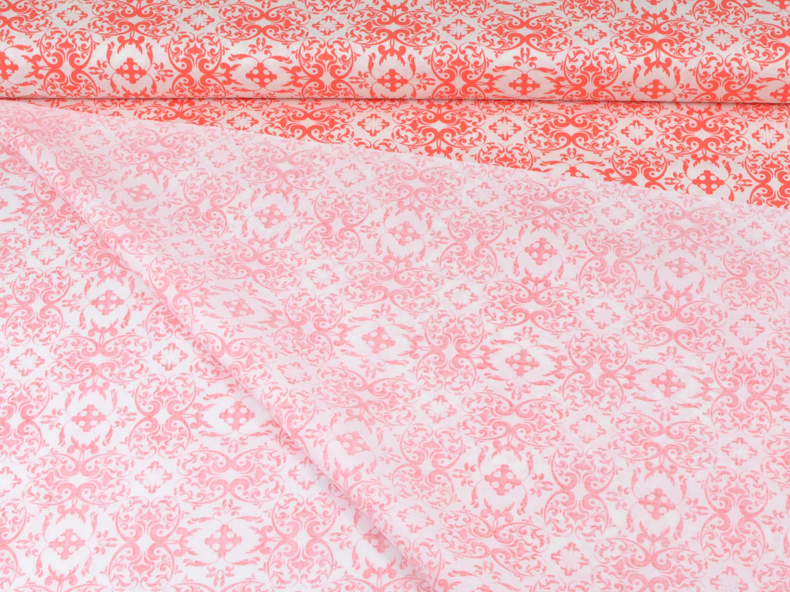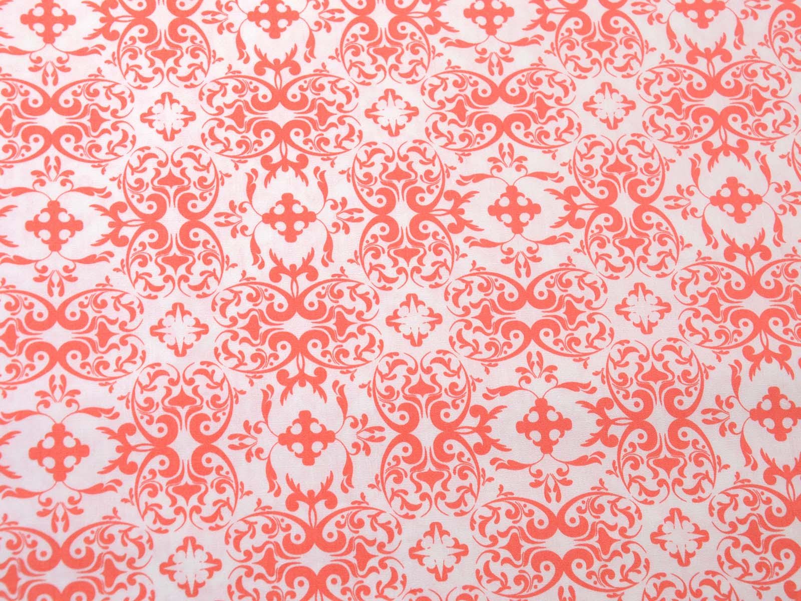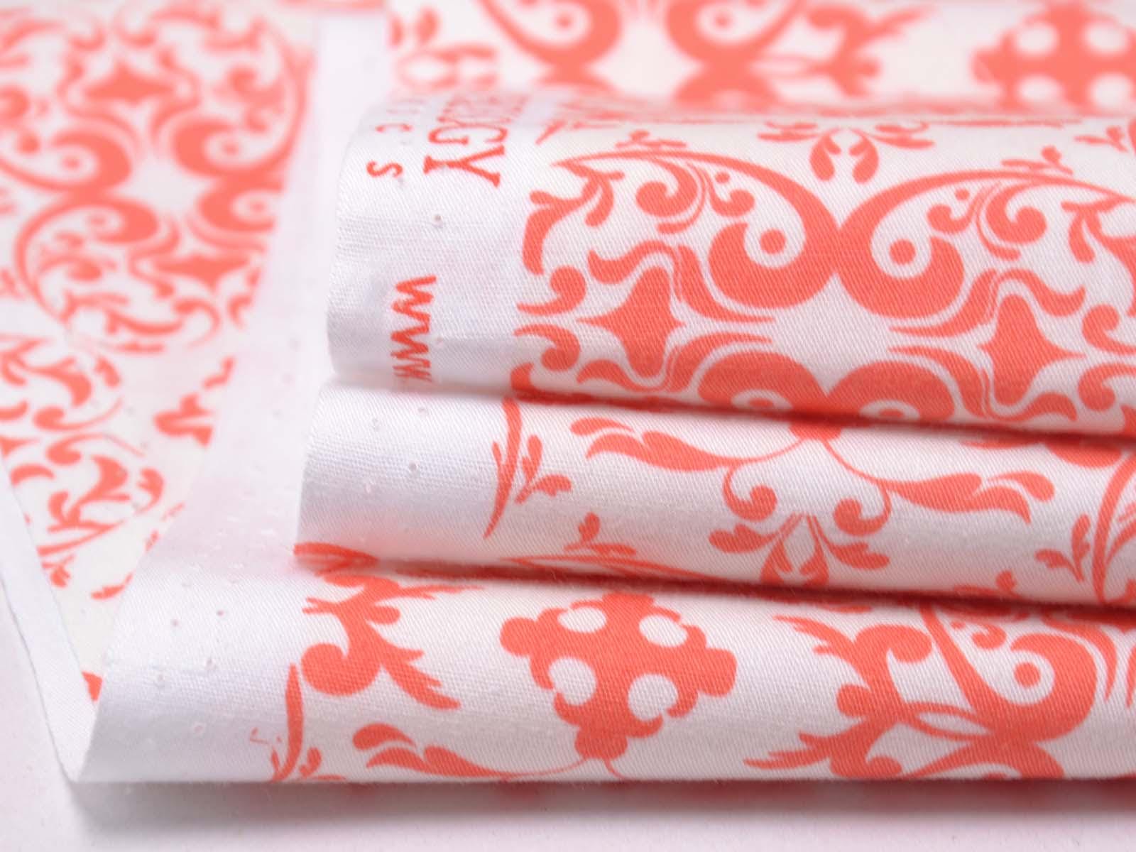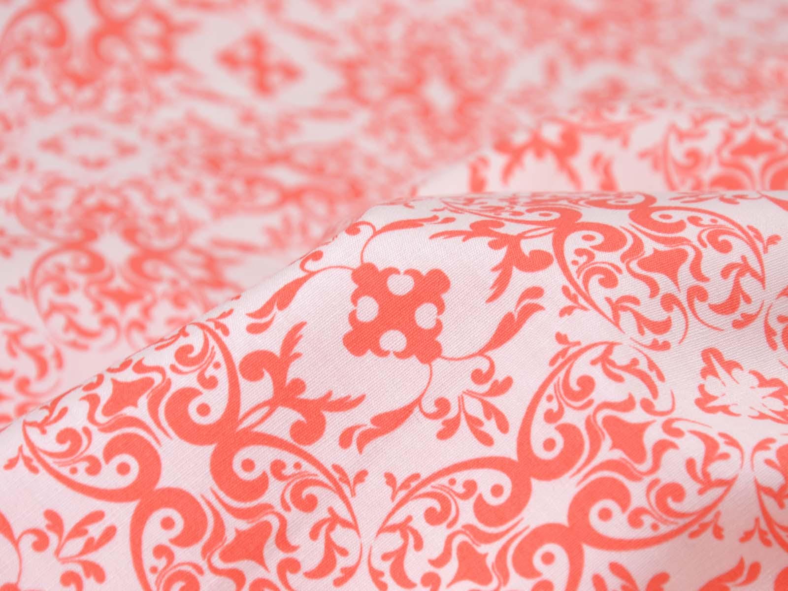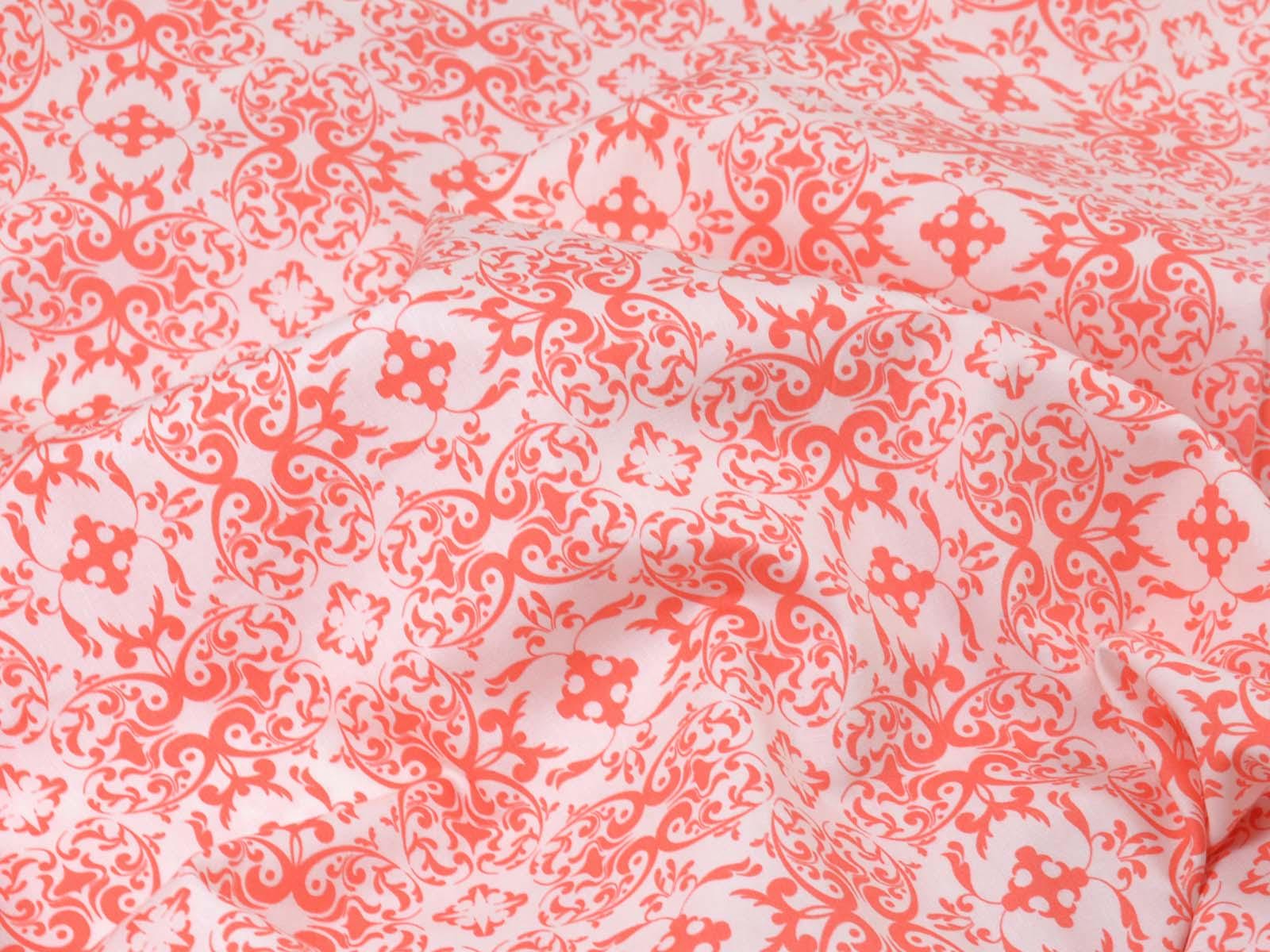 White cotton fabric with orange ornaments. The smooth, firm fabric is ideal for patchwork projects and for sewing bags, cushions, decorative items, and much more.