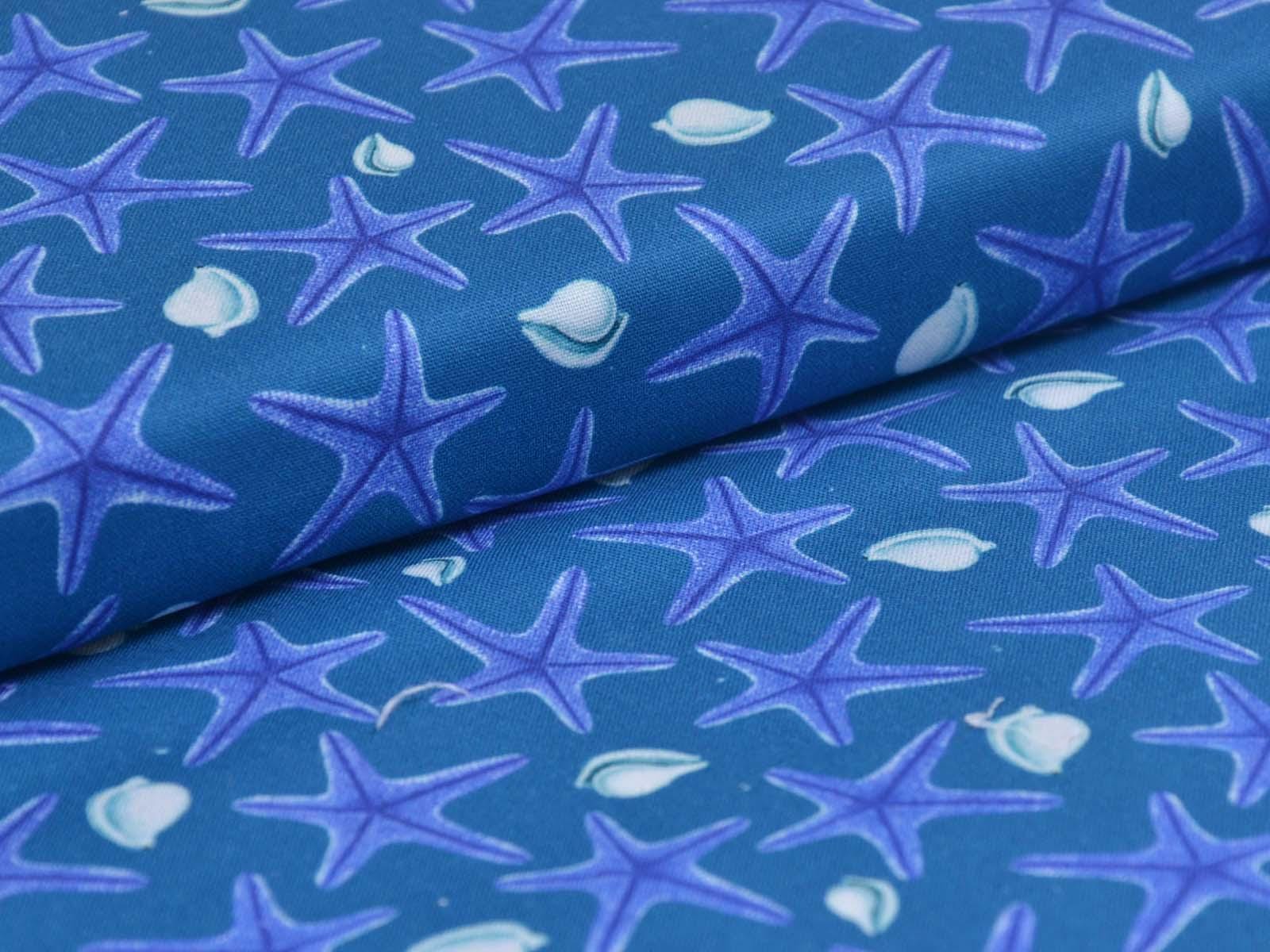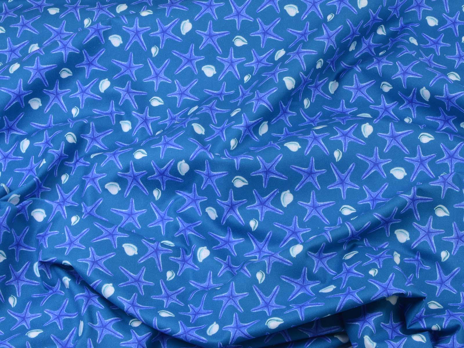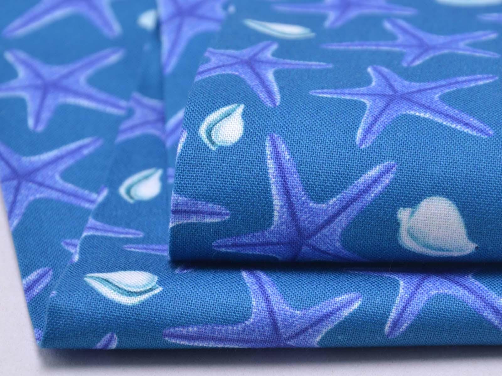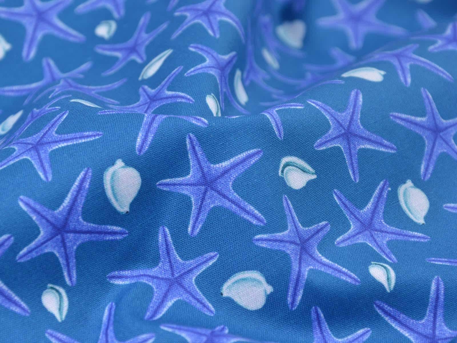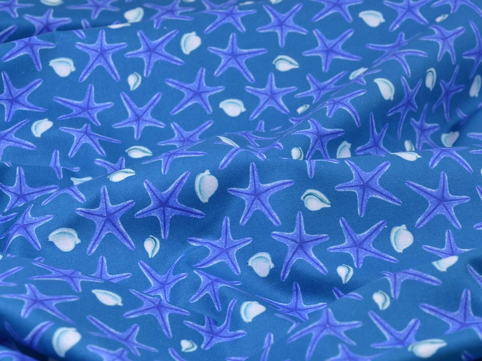 Blue cotton fabric with dark blue starfish and white seashells. Each starfish is approximately 3 cm in size. The fabric is smooth and firm. It is ideal for patchwork projects and for sewing tablecloths, cushions, decorative items, and much more.