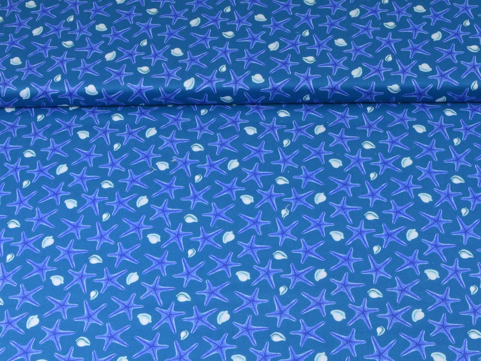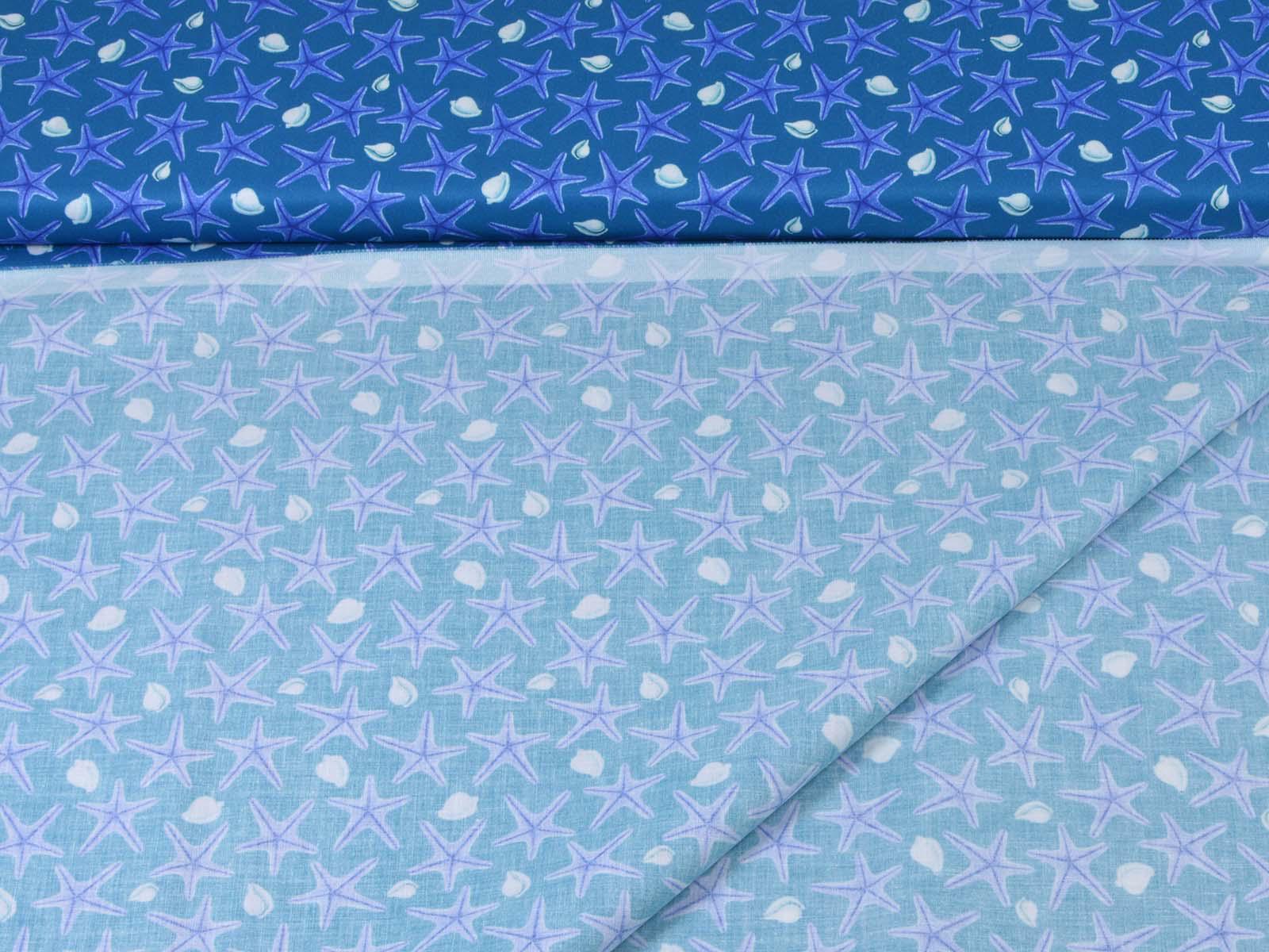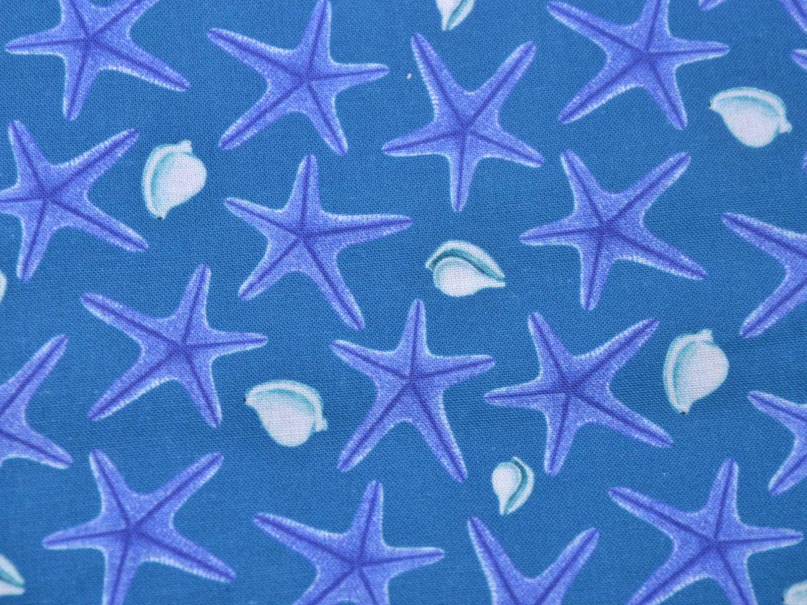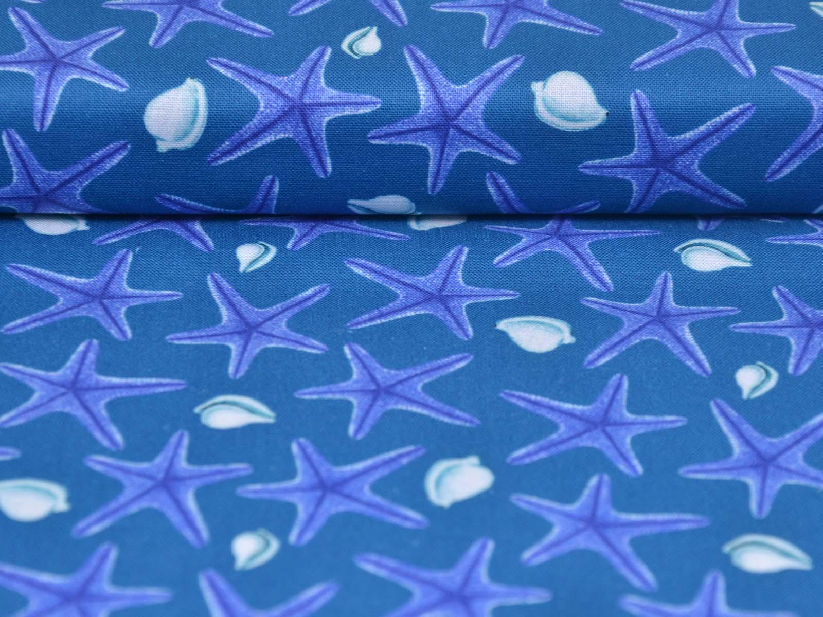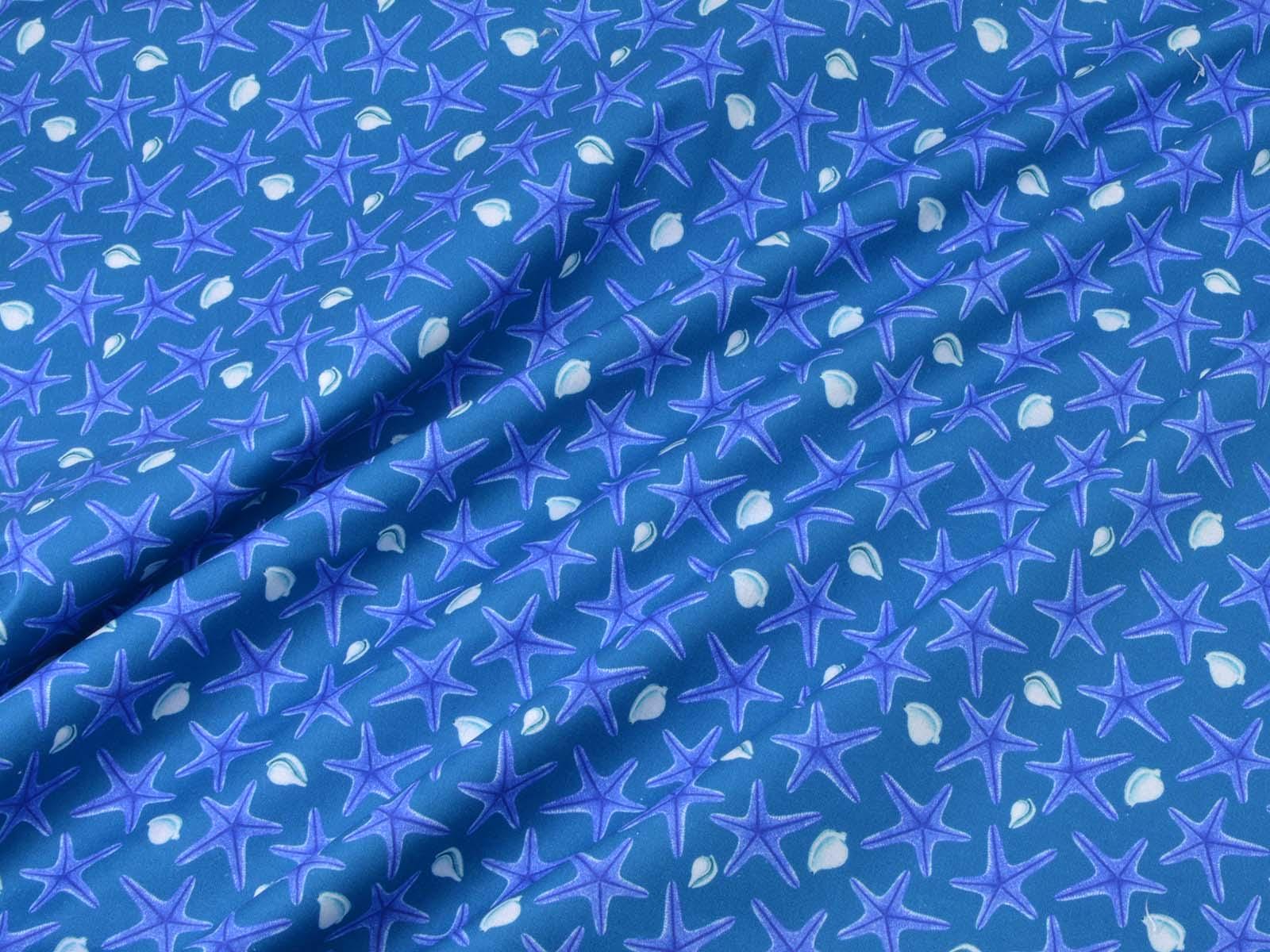 Blue cotton fabric with dark blue starfish and white seashells. Each starfish is approximately 3 cm in size. The fabric is smooth and firm. It is ideal for patchwork projects and for sewing tablecloths, cushions, decorative items, and much more.
