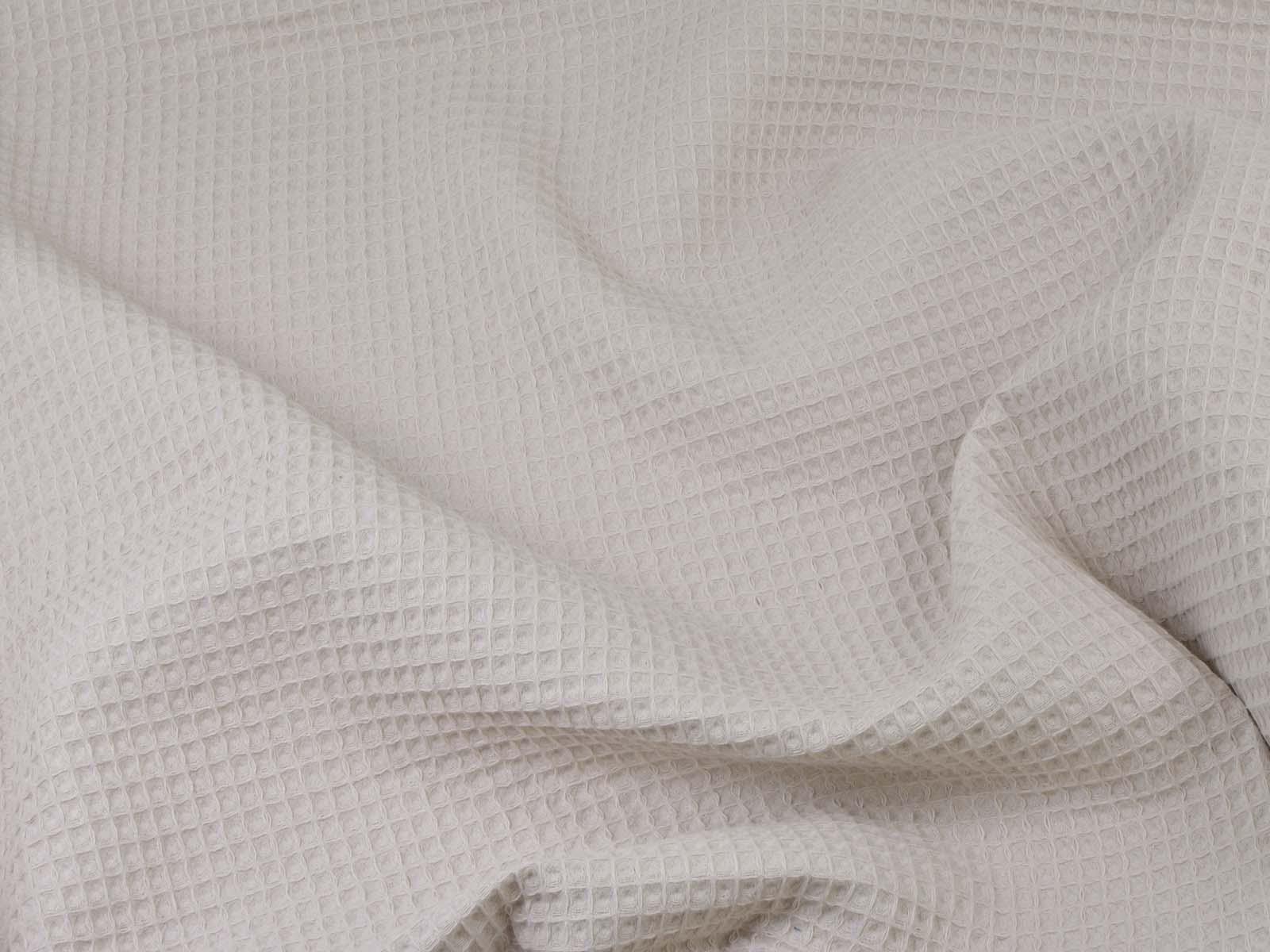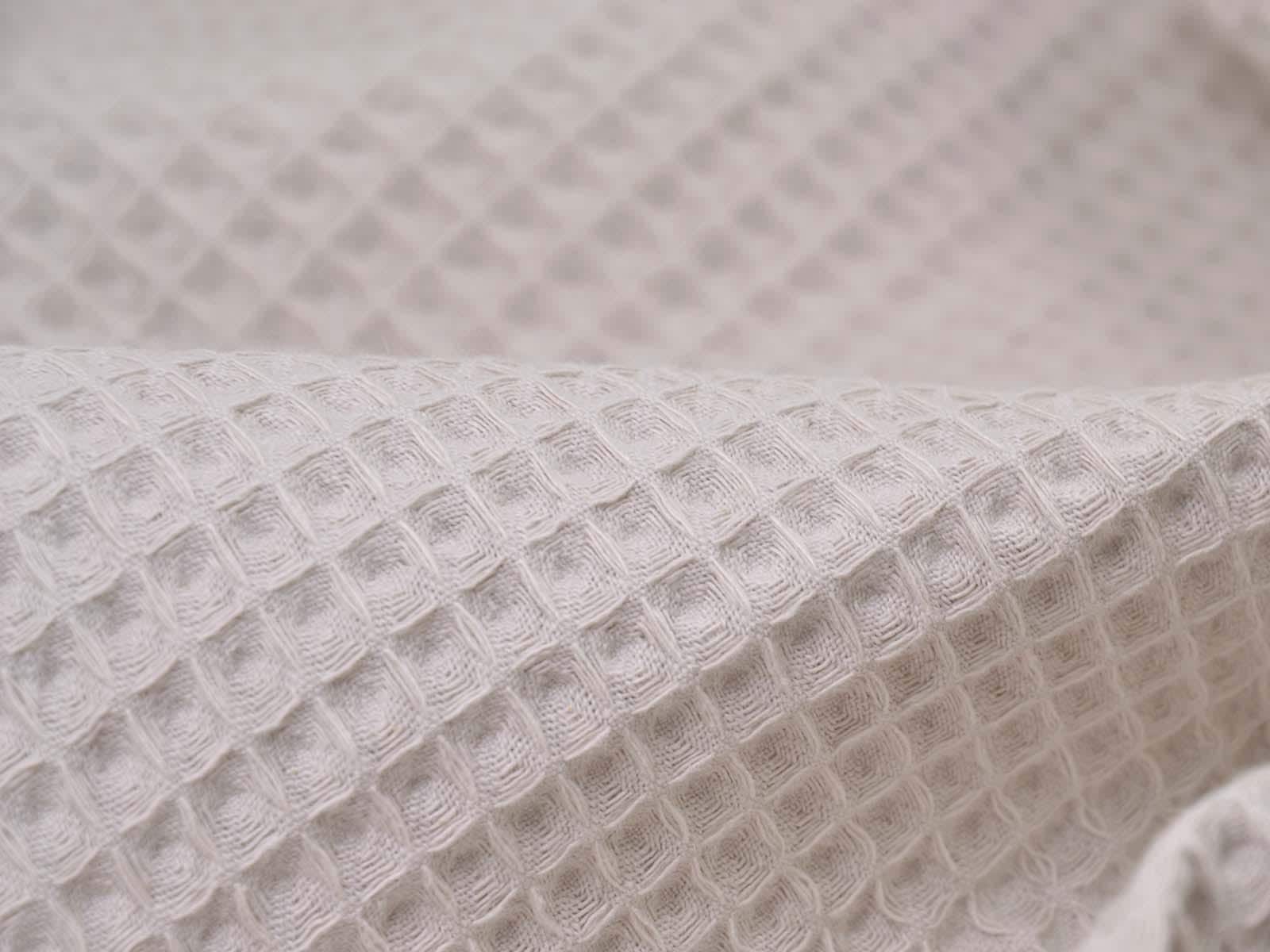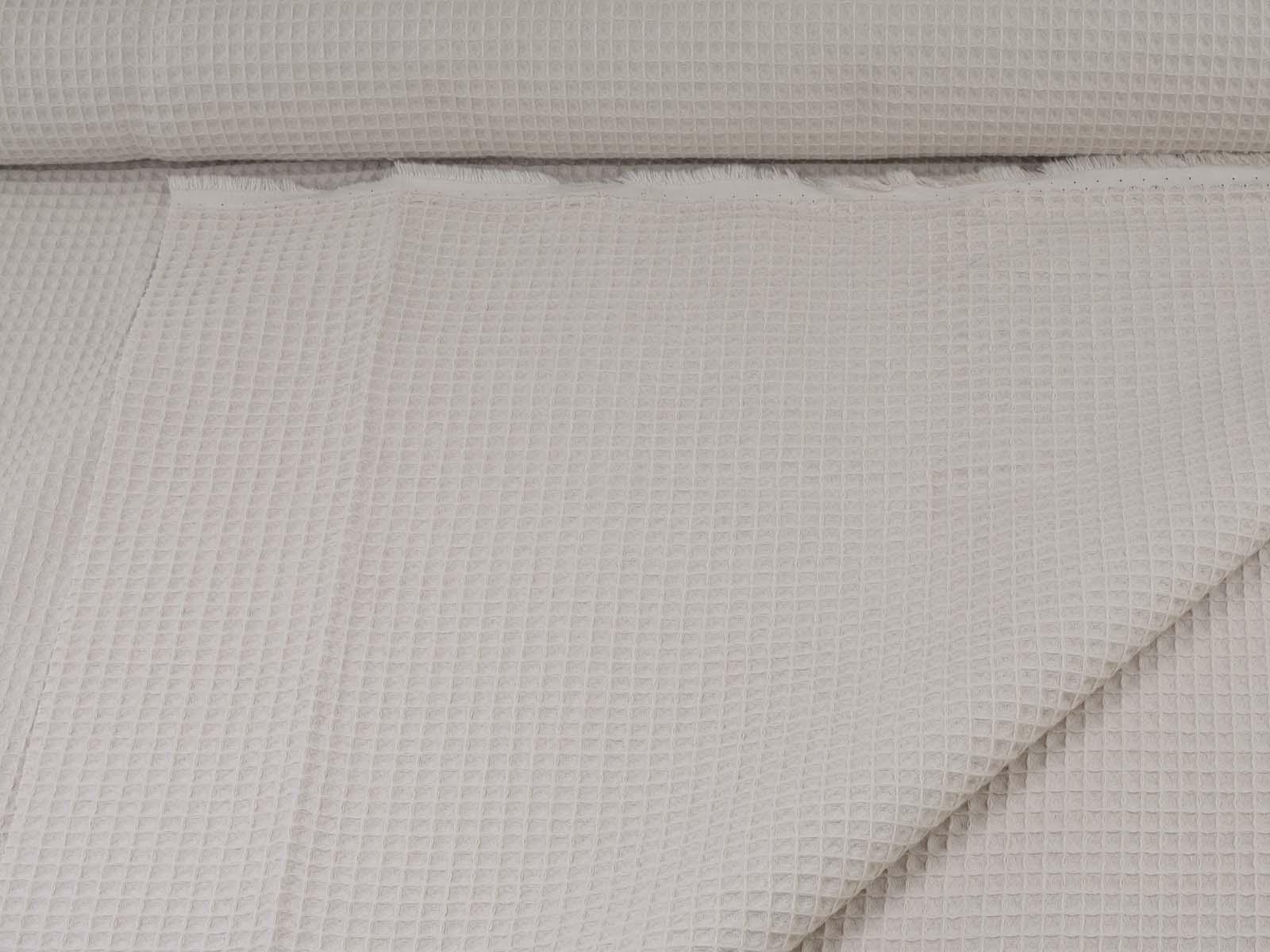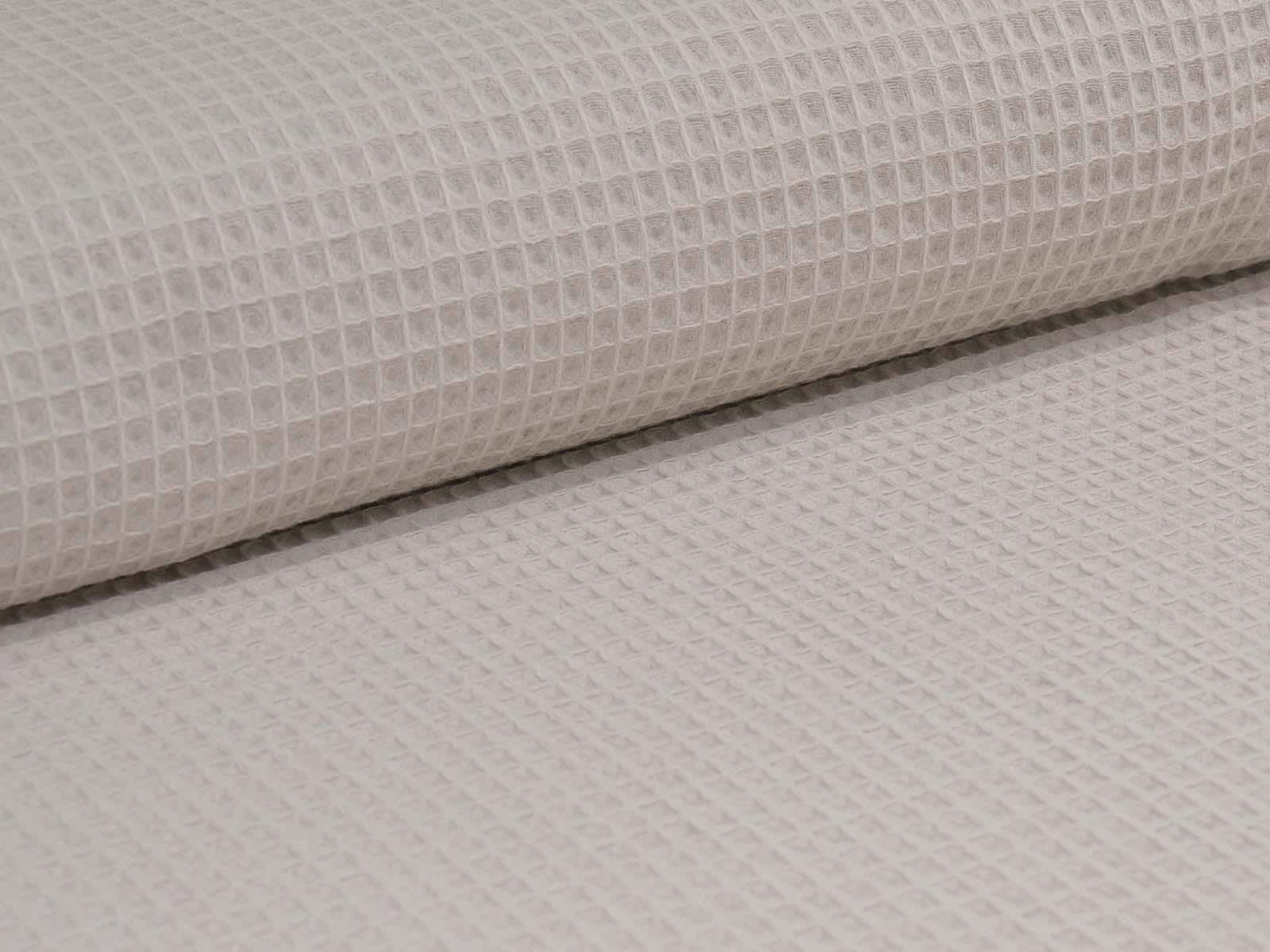 Waffle piqué cotton fabric from Hilco. The fabric is solid beige, has the typical waffle texture, feels pleasant to the touch, and is woven. This waffle piqué is perfect for sewing towels, bathrobes, changing mats, blankets, storage containers, and so much more.