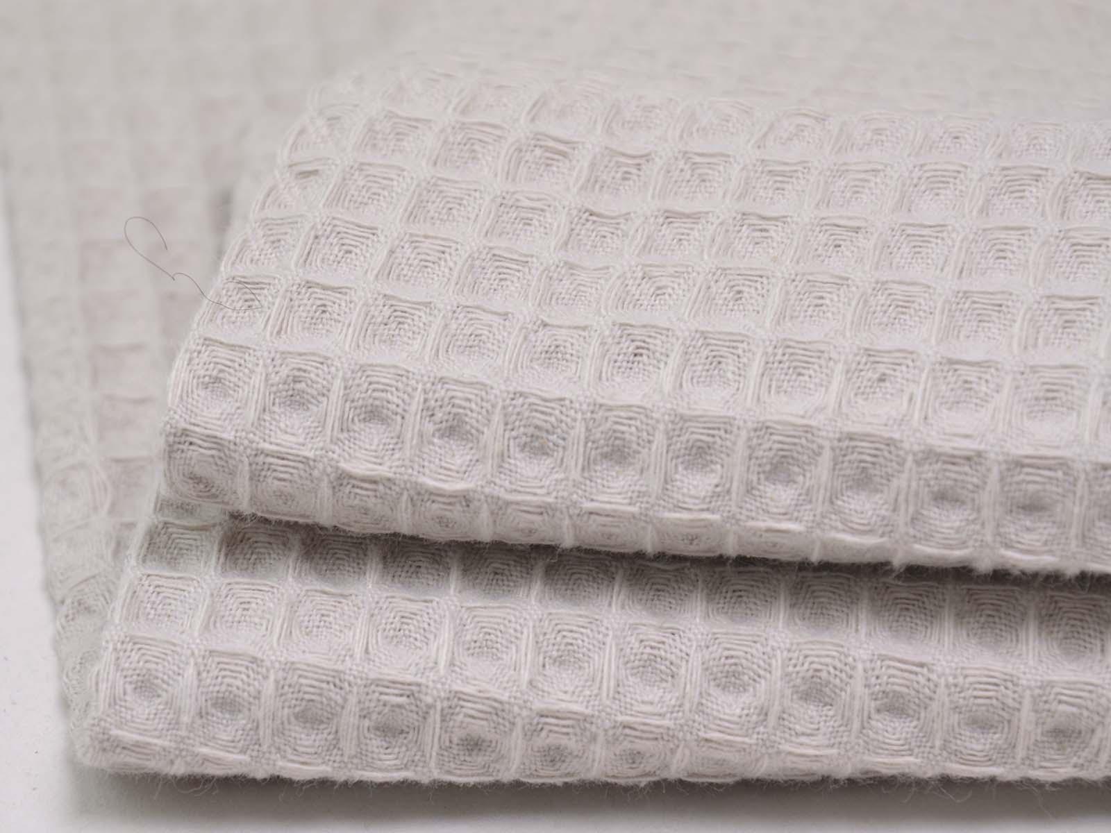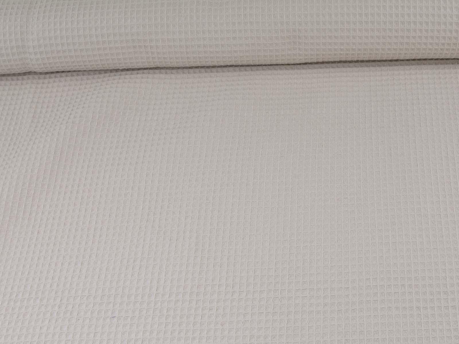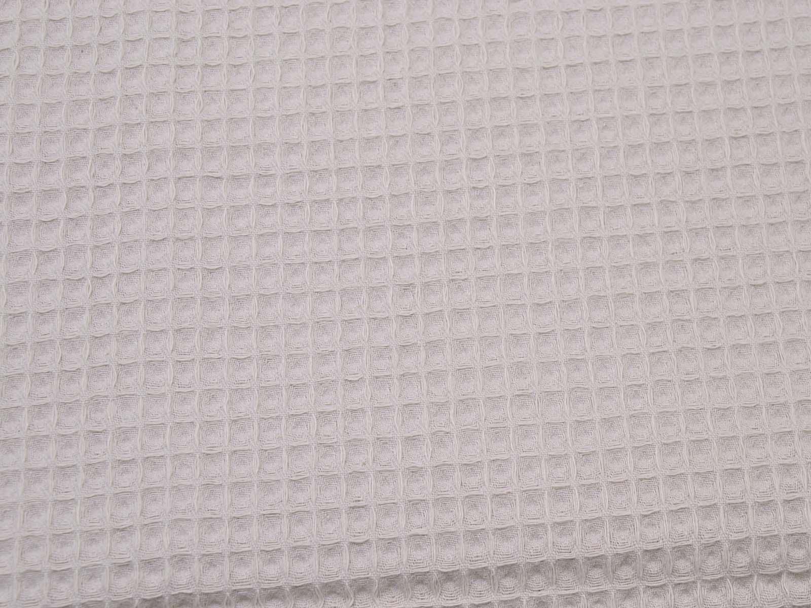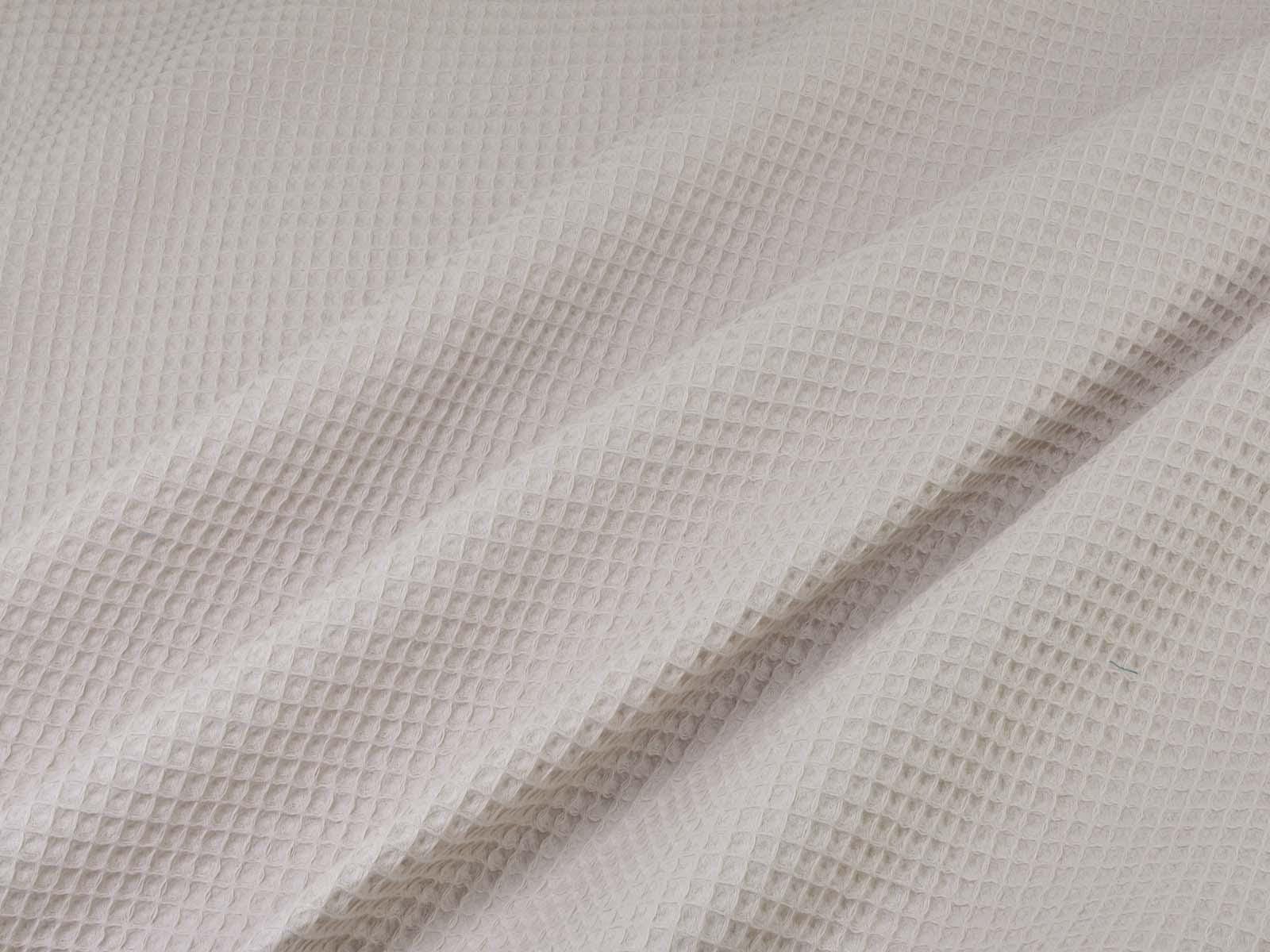 Waffle piqué cotton fabric from Hilco. The fabric is solid beige, has the typical waffle texture, feels pleasant to the touch, and is woven. This waffle piqué is perfect for sewing towels, bathrobes, changing mats, blankets, storage containers, and so much more.