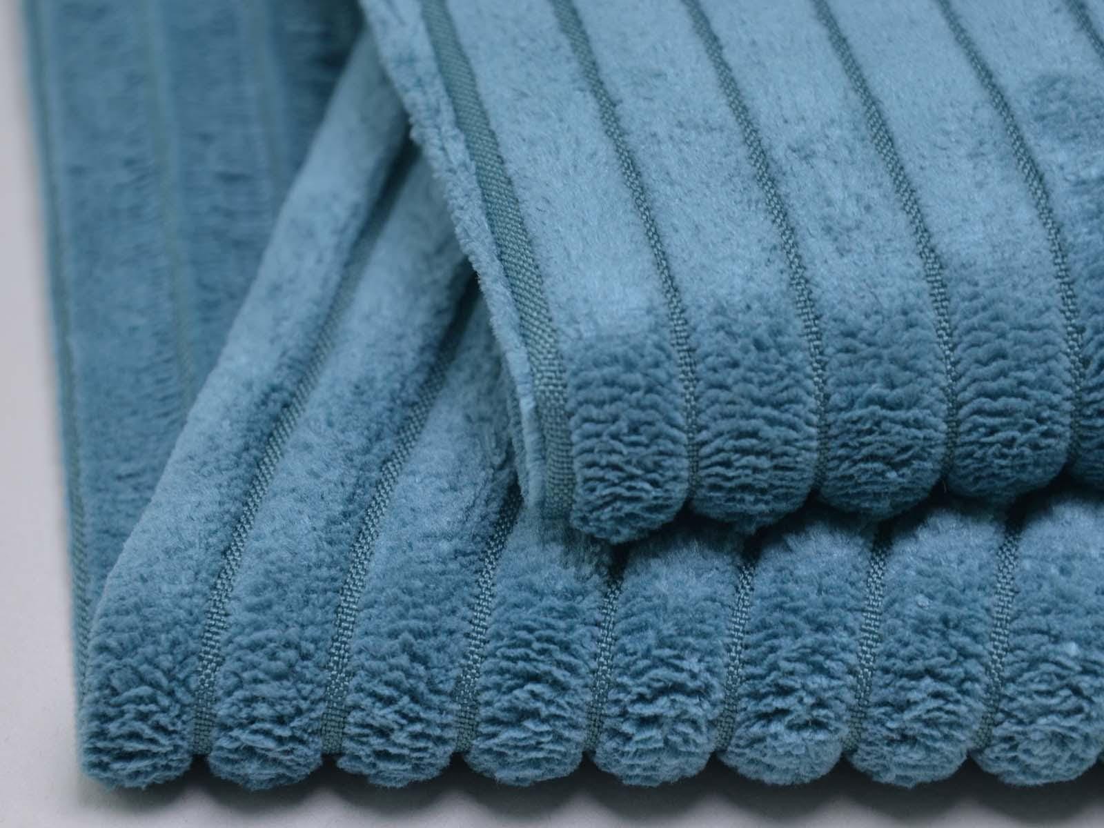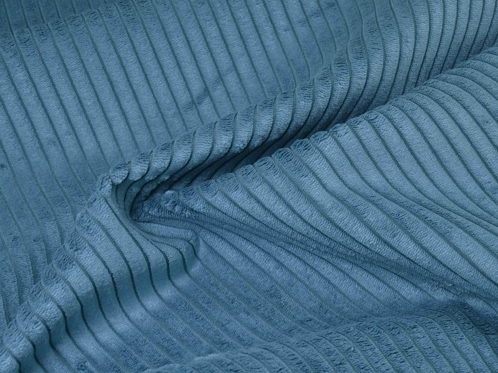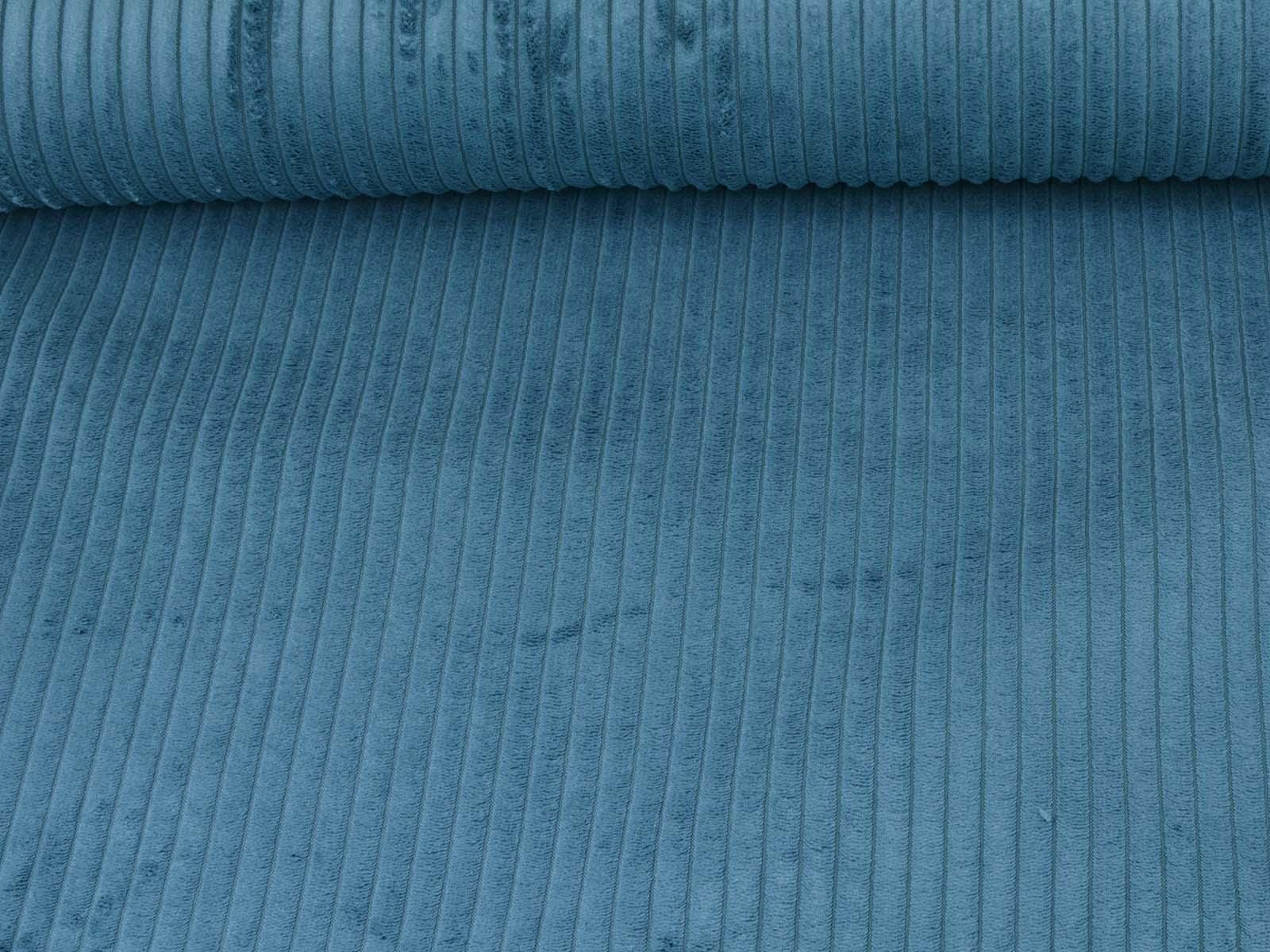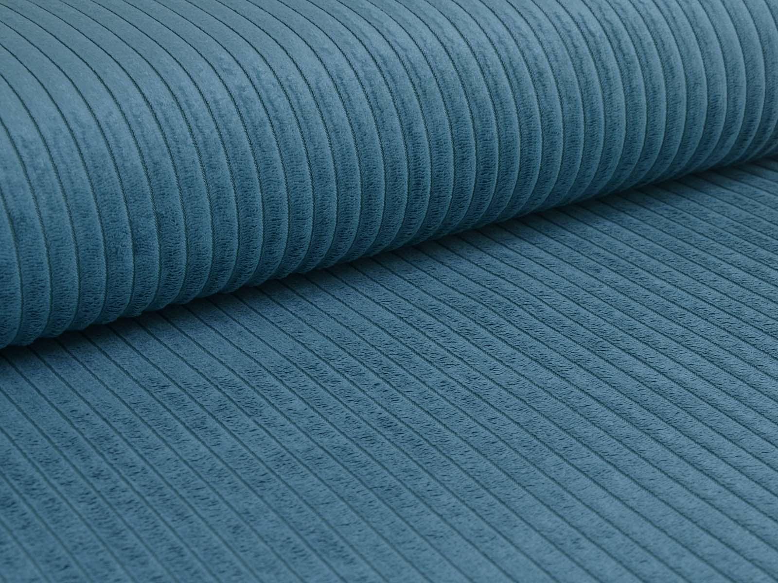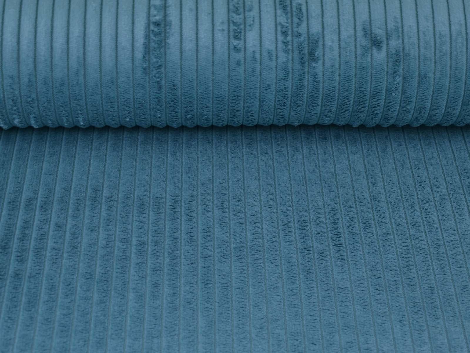 Wide corduroy fabric in petrol blue. Each rib is approximately 1 cm wide. The cord has a velvety, soft feel. You can use it for upholstering armchairs, chairs, and sofas. Sew stylish fanny packs, tote bags, cushions, makeup bags, and much more from this wonderful fabric.
