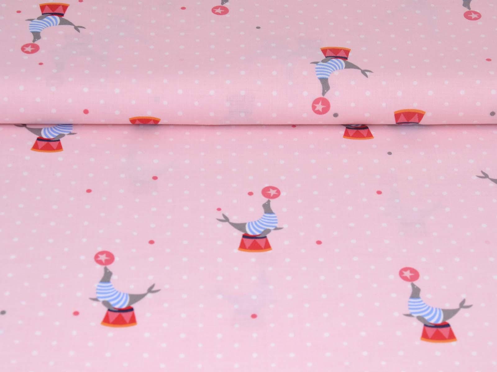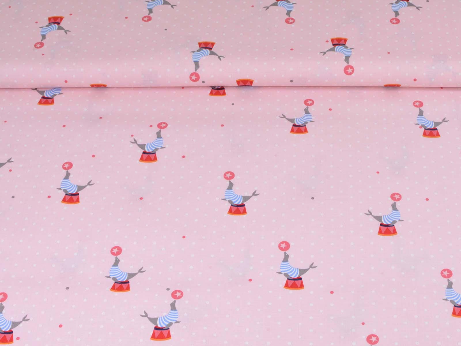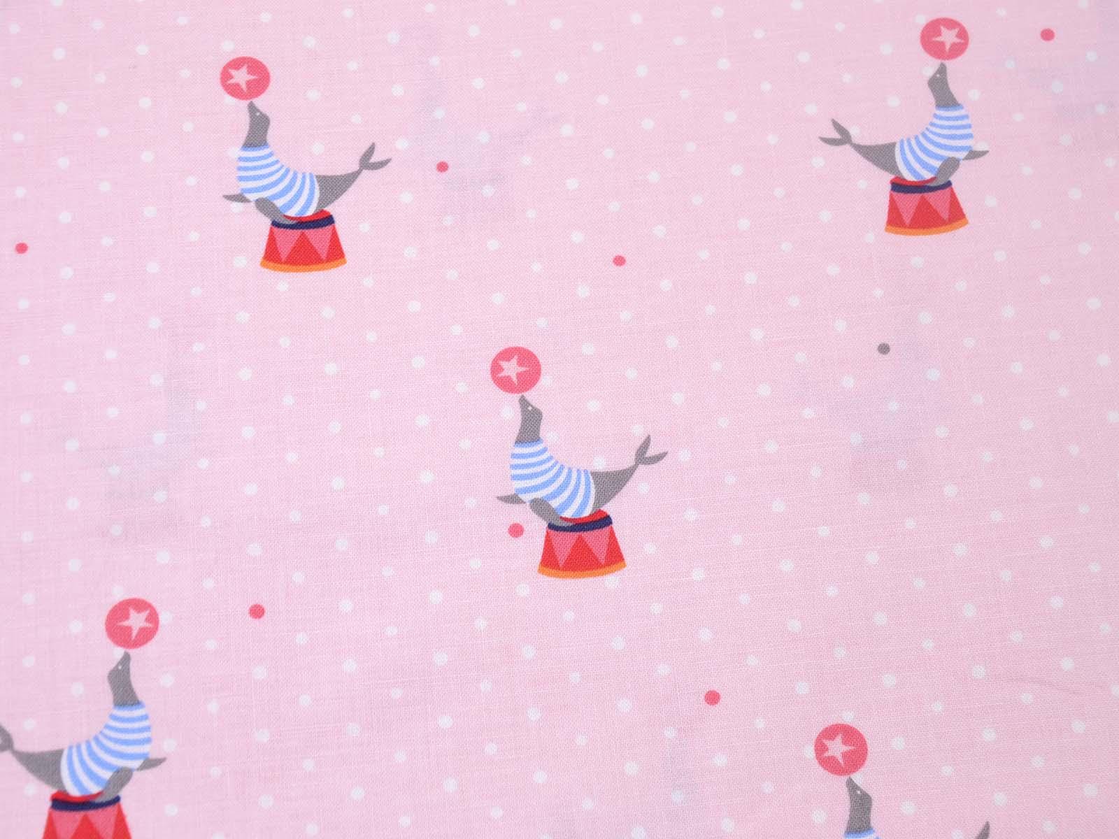 Pink cotton fabric with seals balancing balls and small white dots in the background. Each seal motif with a stool and ball is approximately 5.5 cm in size. The smooth, firm fabric is perfect for patchwork projects and sewing bags, cushions, decorative items, and much more.