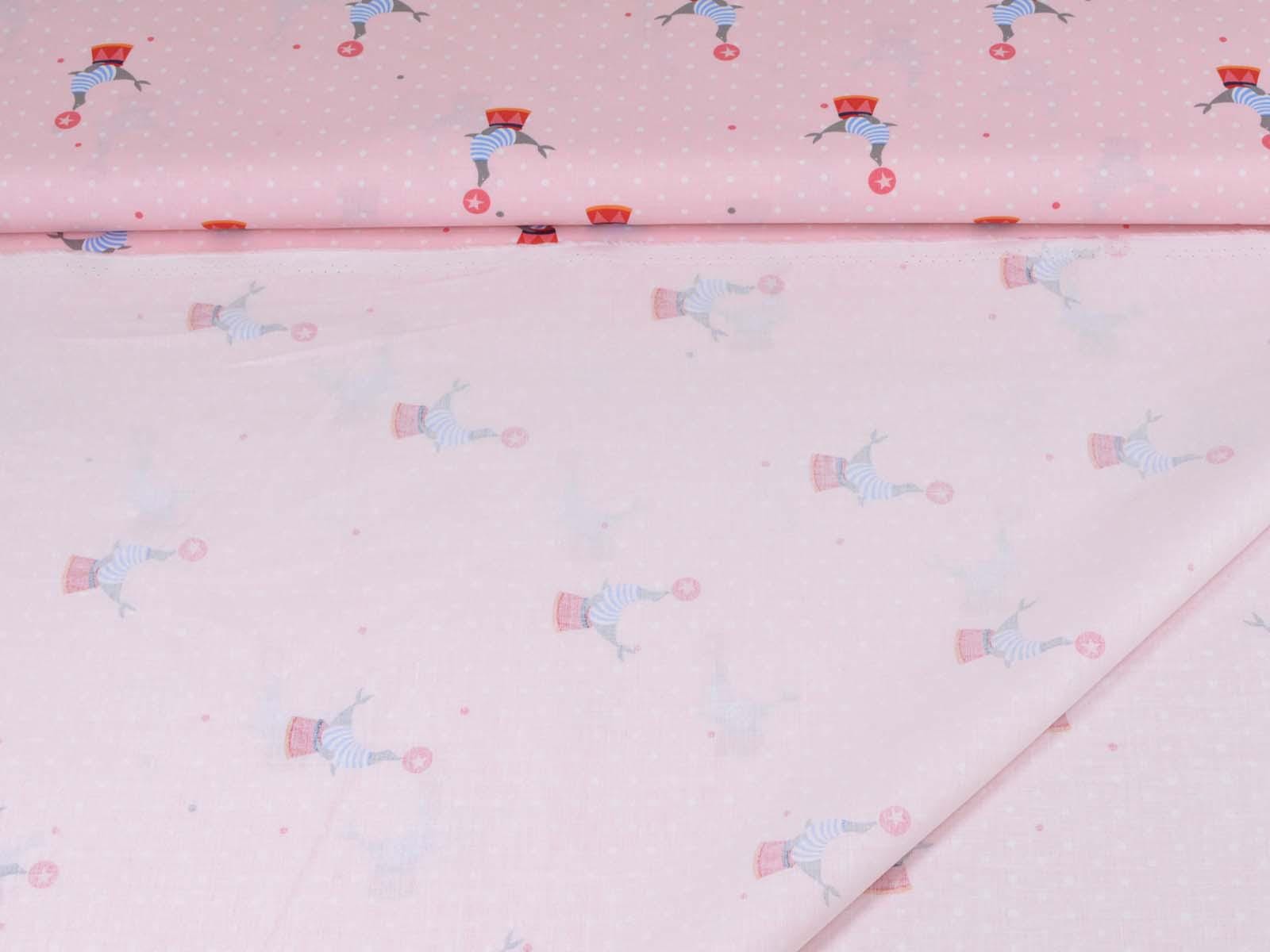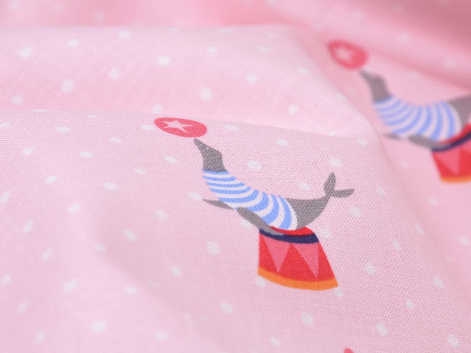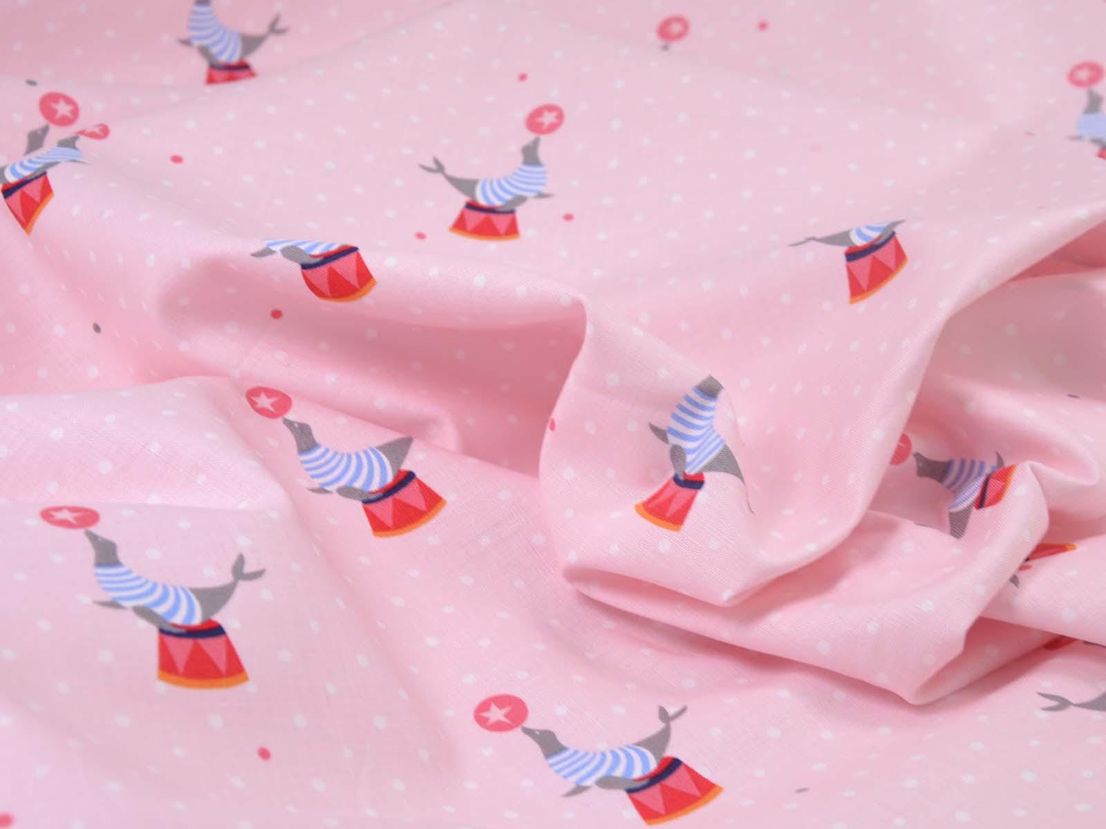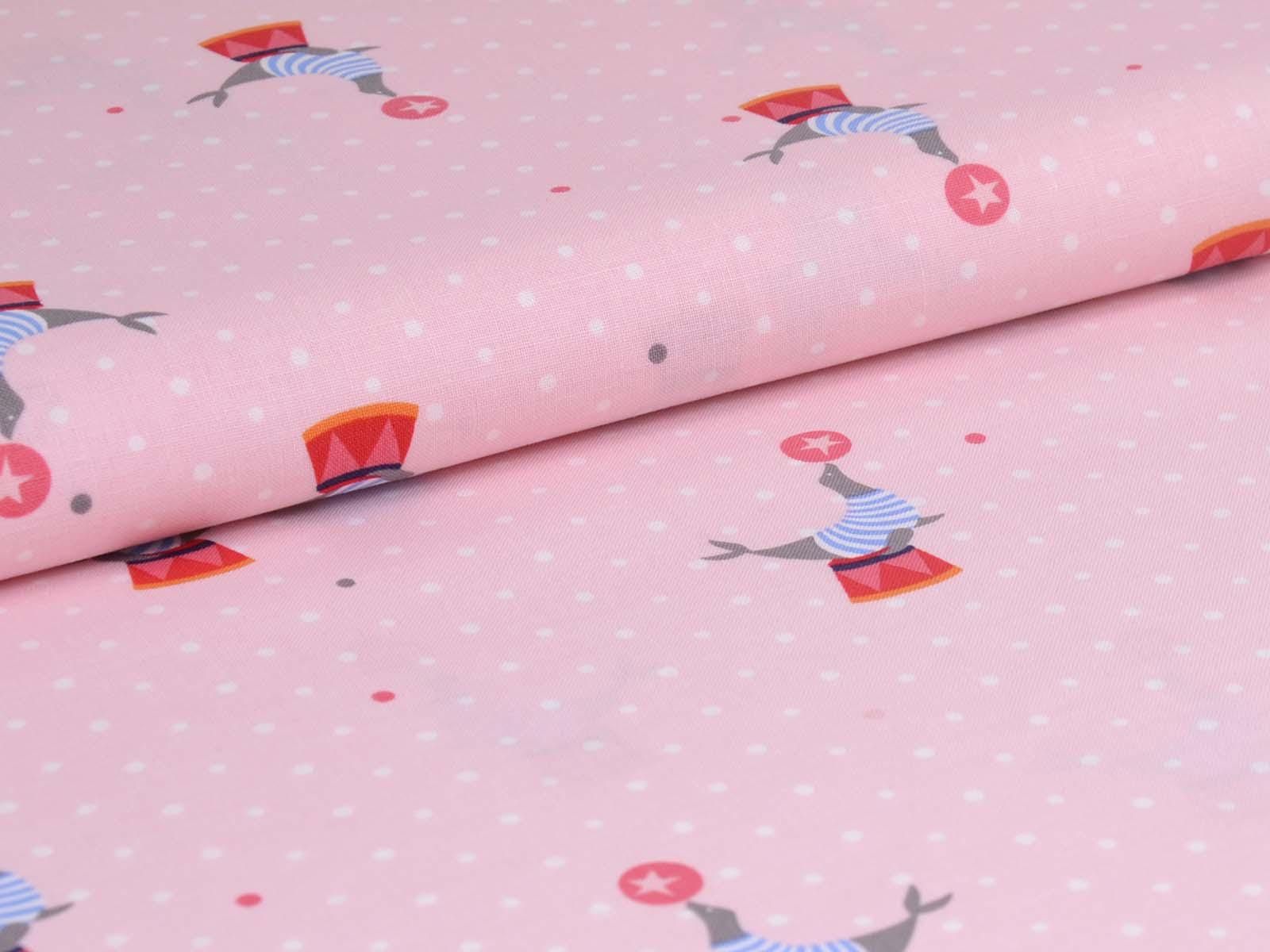 Pink cotton fabric with seals balancing balls and small white dots in the background. Each seal motif with a stool and ball is approximately 5.5 cm in size. The smooth, firm fabric is perfect for patchwork projects and sewing bags, cushions, decorative items, and much more.