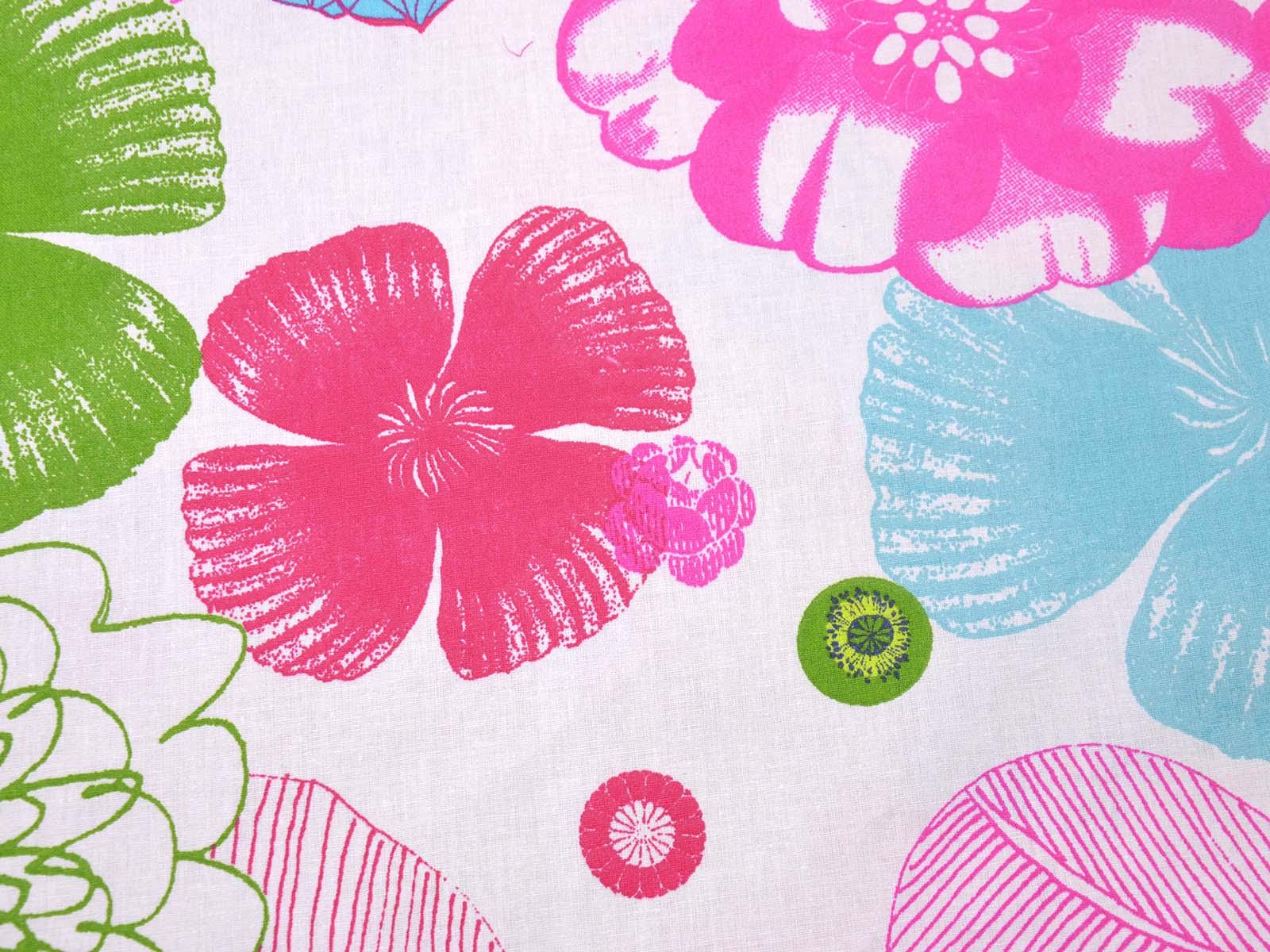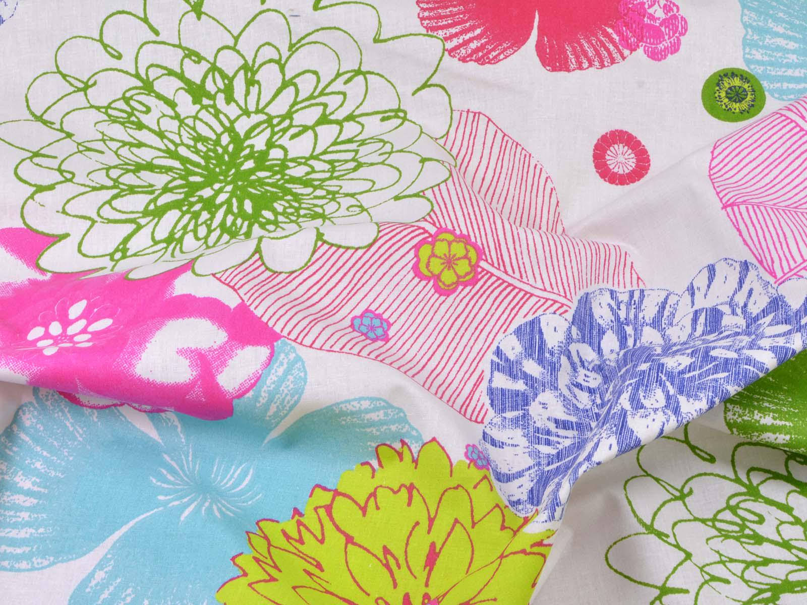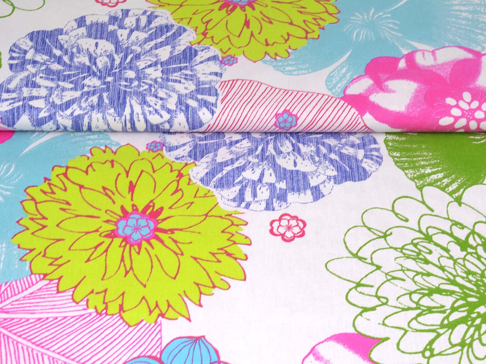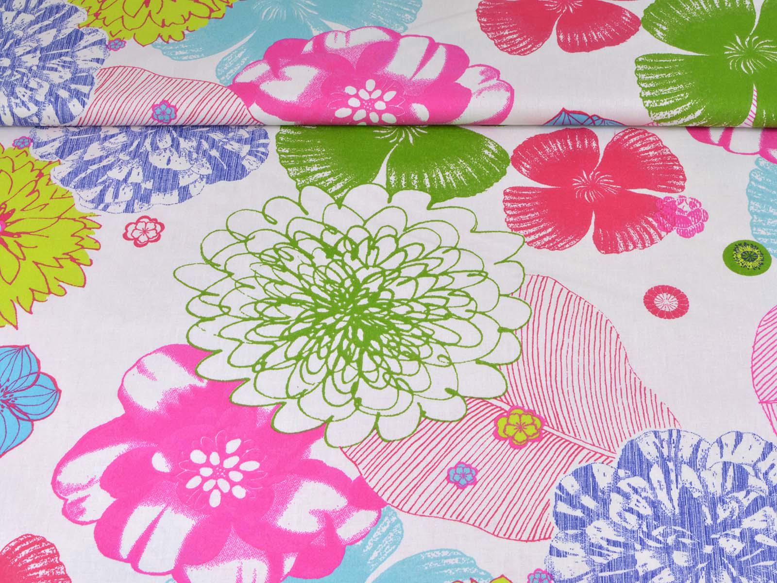 White cotton fabric with large, assorted flowers in pink, blue, and green. Each blue and white flower is approximately 17 cm across. The smooth, firm fabric is perfect for patchwork projects and sewing bags, cushions, decorative items, and much more.