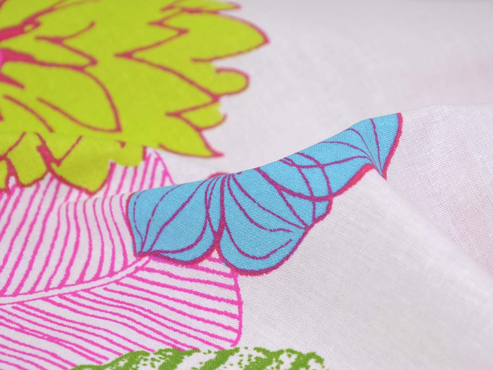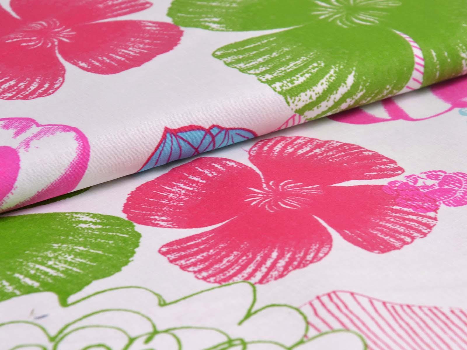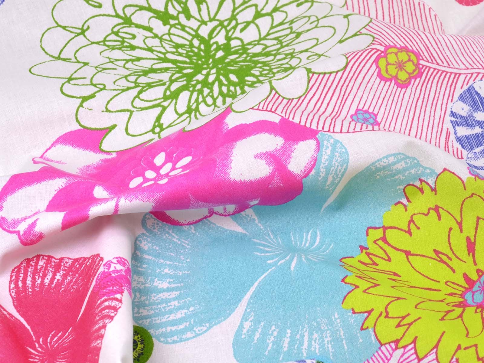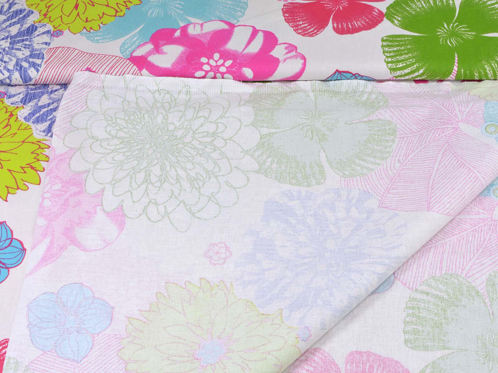 White cotton fabric with large, assorted flowers in pink, blue, and green. Each blue and white flower is approximately 17 cm across. The smooth, firm fabric is perfect for patchwork projects and sewing bags, cushions, decorative items, and much more.