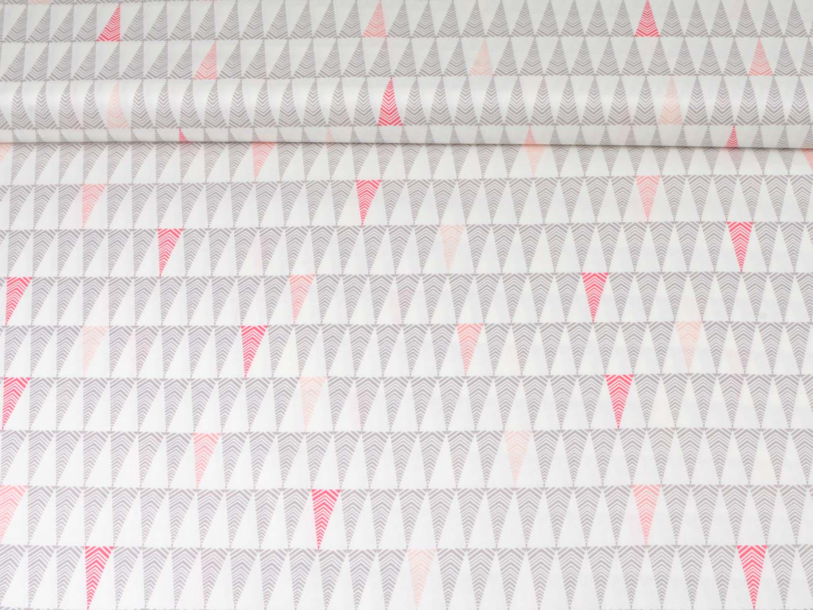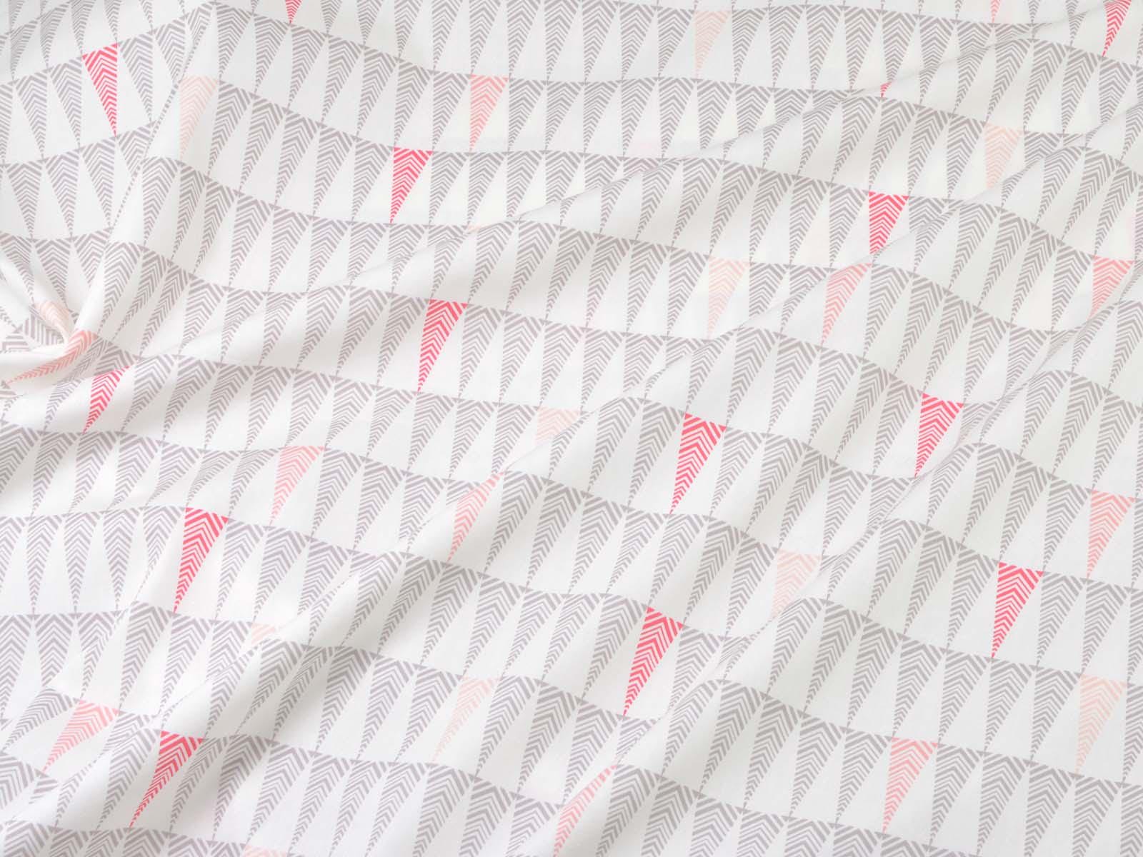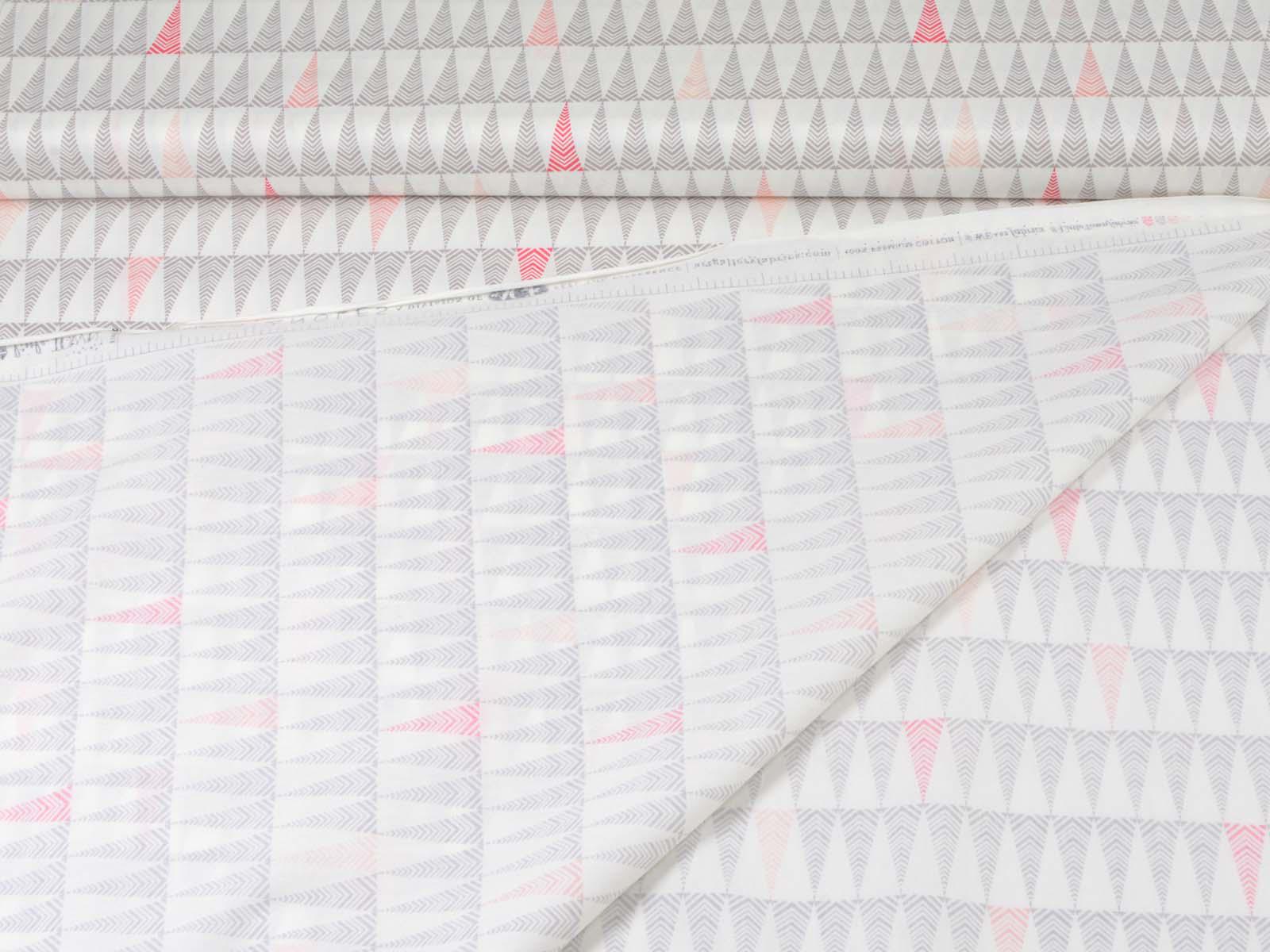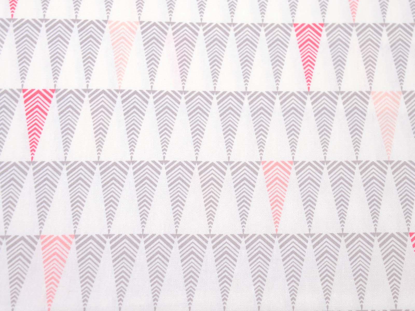 White cotton fabric with small grey and pink fir trees. Each tree is approximately 3.5 cm tall. The smooth, firm fabric is perfect for patchwork projects and sewing bags, cushions, decorative items, and much more.