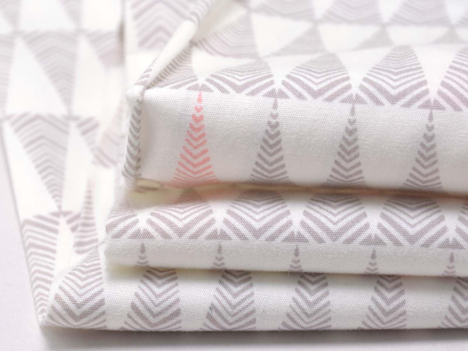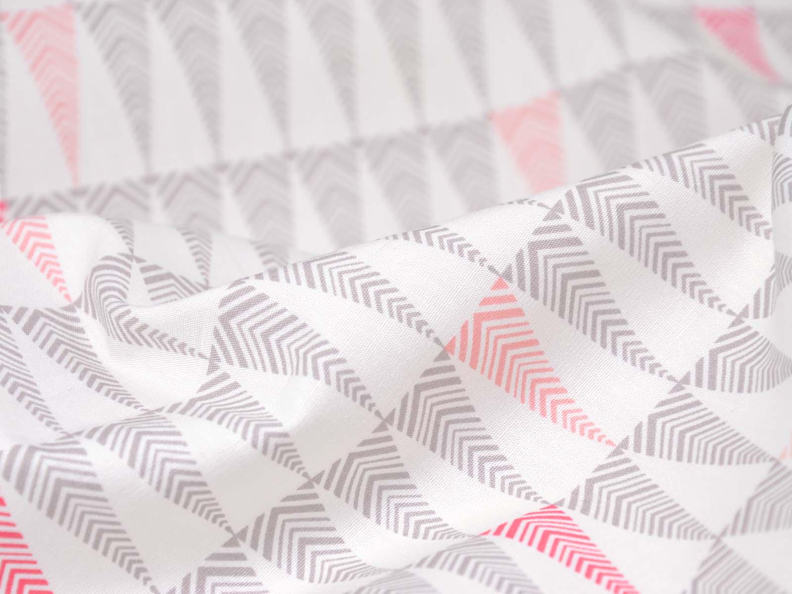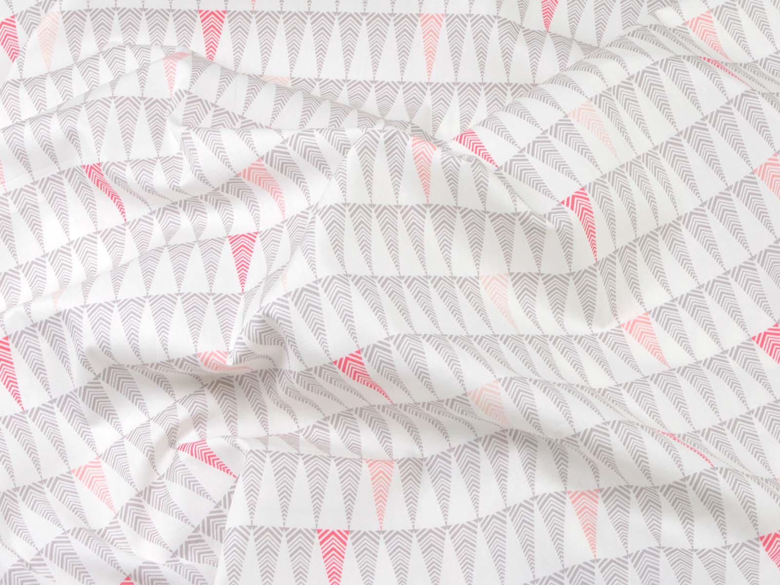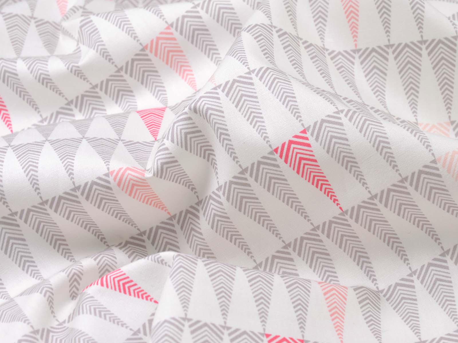 White cotton fabric with small grey and pink fir trees. Each tree is approximately 3.5 cm tall. The smooth, firm fabric is perfect for patchwork projects and sewing bags, cushions, decorative items, and much more.