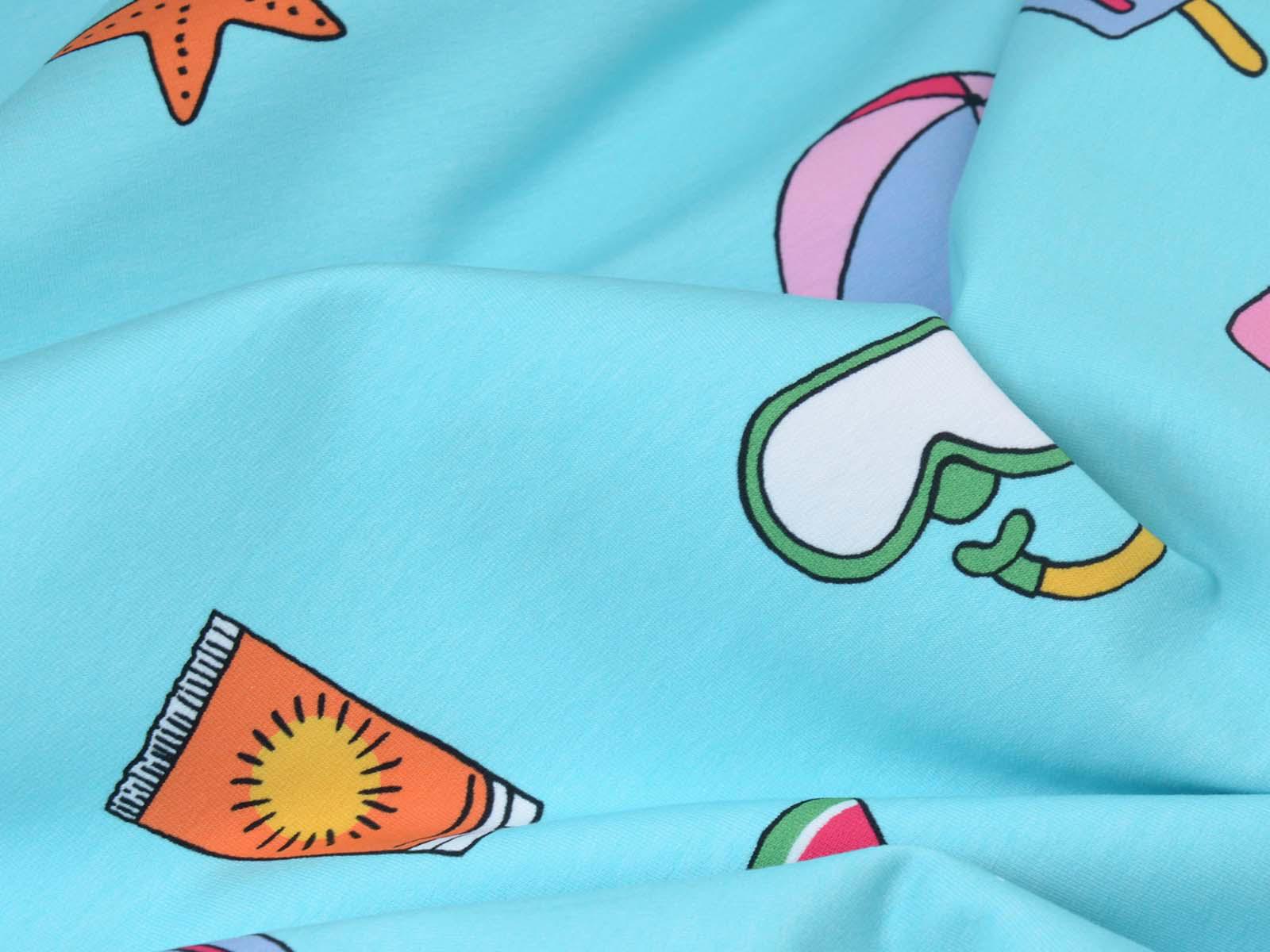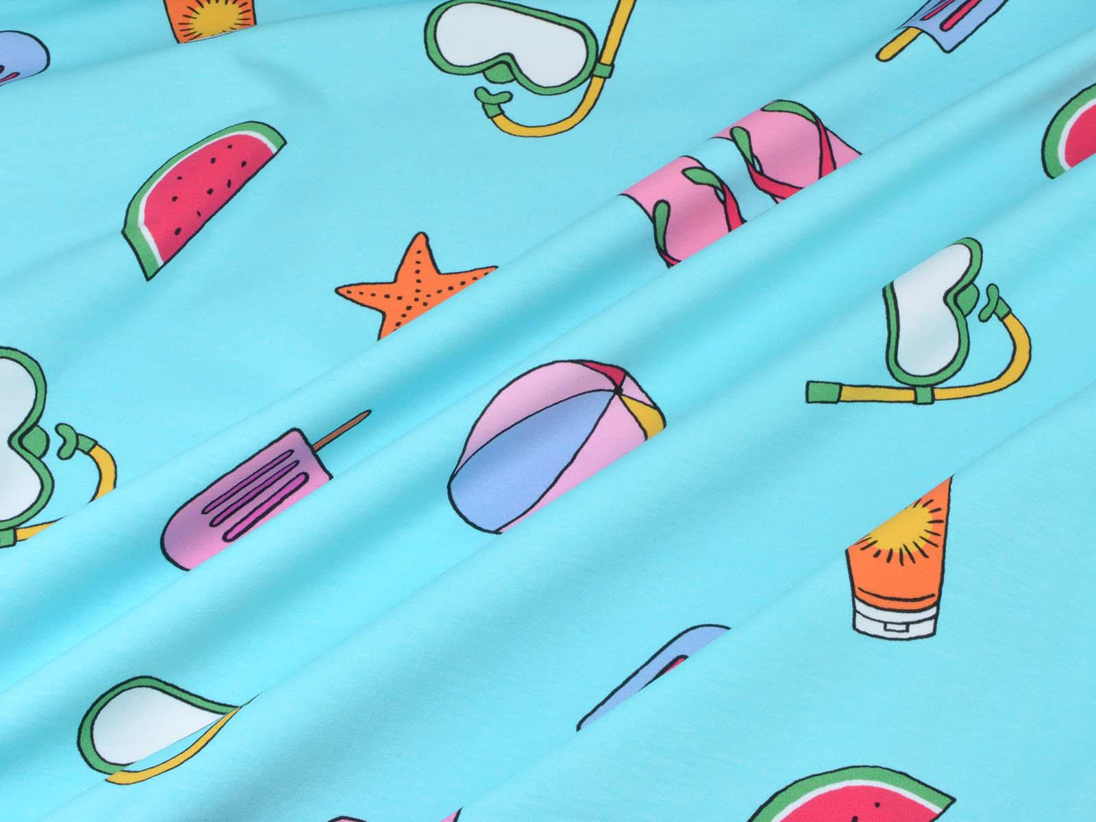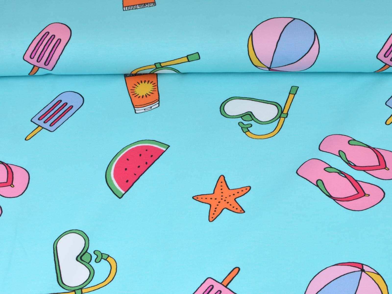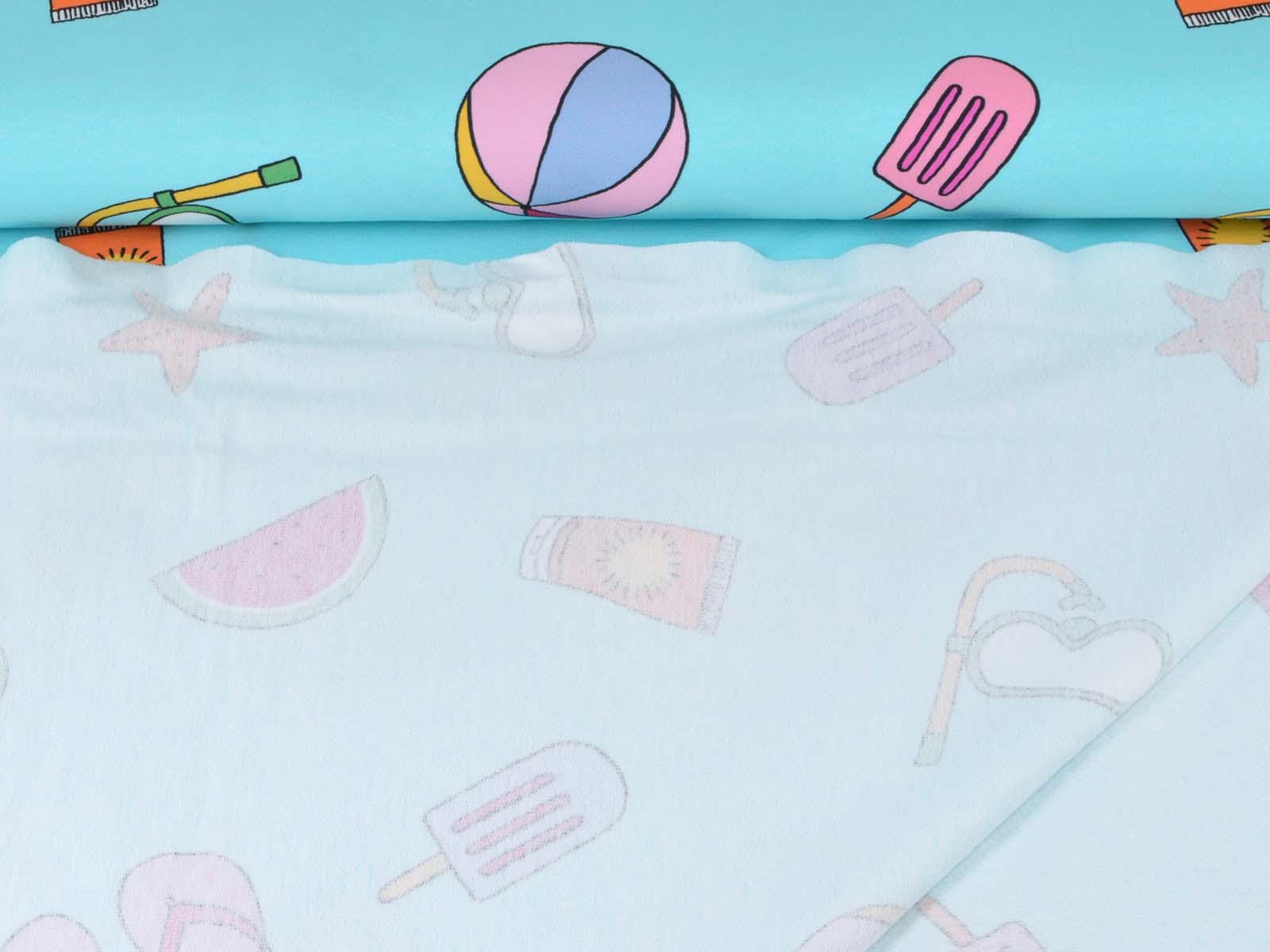 High-quality sweatshirt fabric from Hilco. The fabric is blue with a print of balls, sunscreen, snorkels, popsicles, starfish, and watermelons. Each watermelon is approximately 4 cm high and 8.5 cm wide. The fabric is smooth on one side and has soft loops on the other. It's suitable for sewing sweaters, comfortable pants, and much more.
