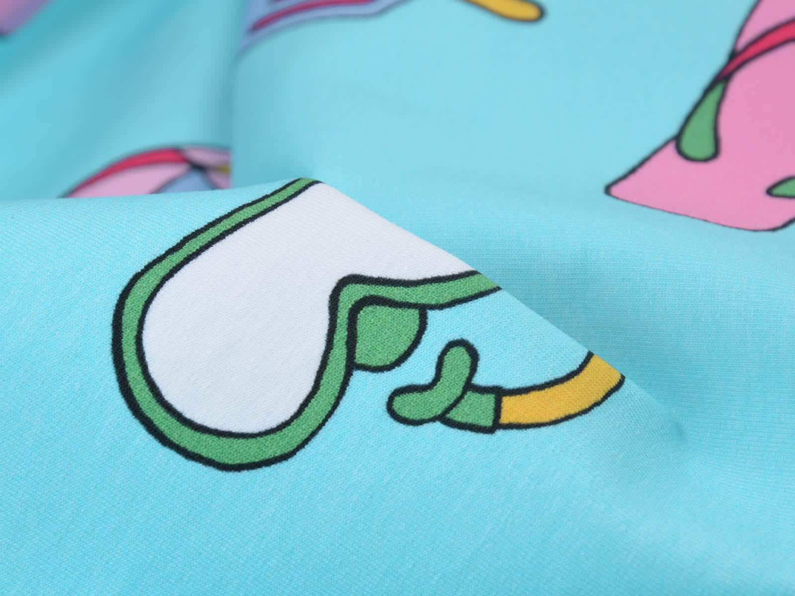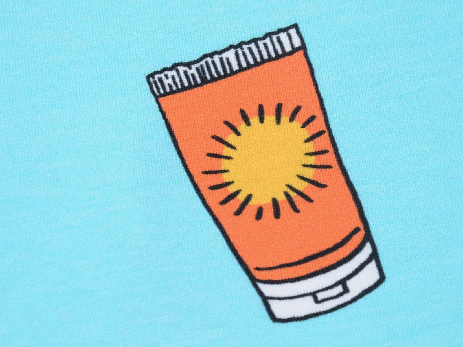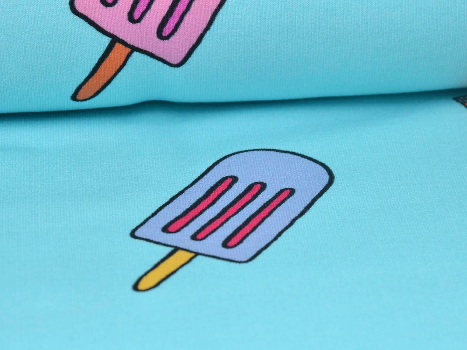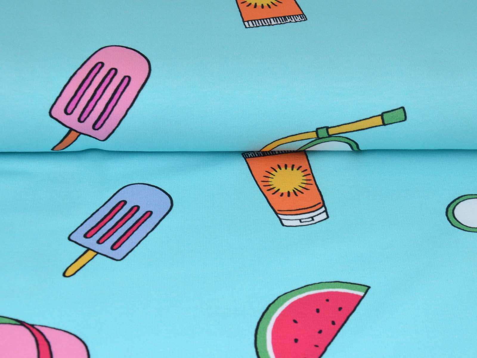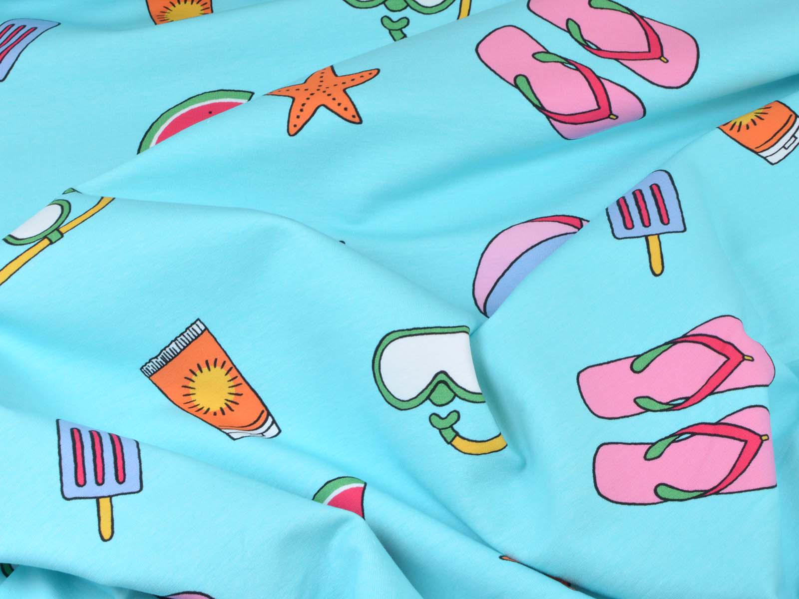High-quality sweatshirt fabric from Hilco. The fabric is blue with a print of balls, sunscreen, snorkels, popsicles, starfish, and watermelons. Each watermelon is approximately 4 cm high and 8.5 cm wide. The fabric is smooth on one side and has soft loops on the other. It's suitable for sewing sweaters, comfortable pants, and much more.