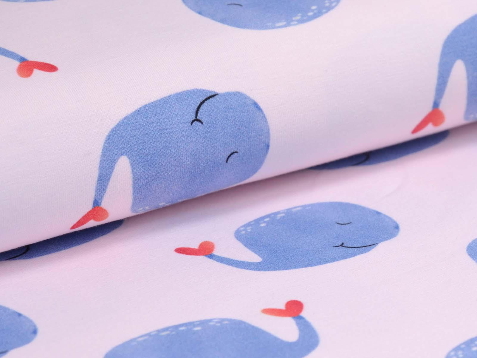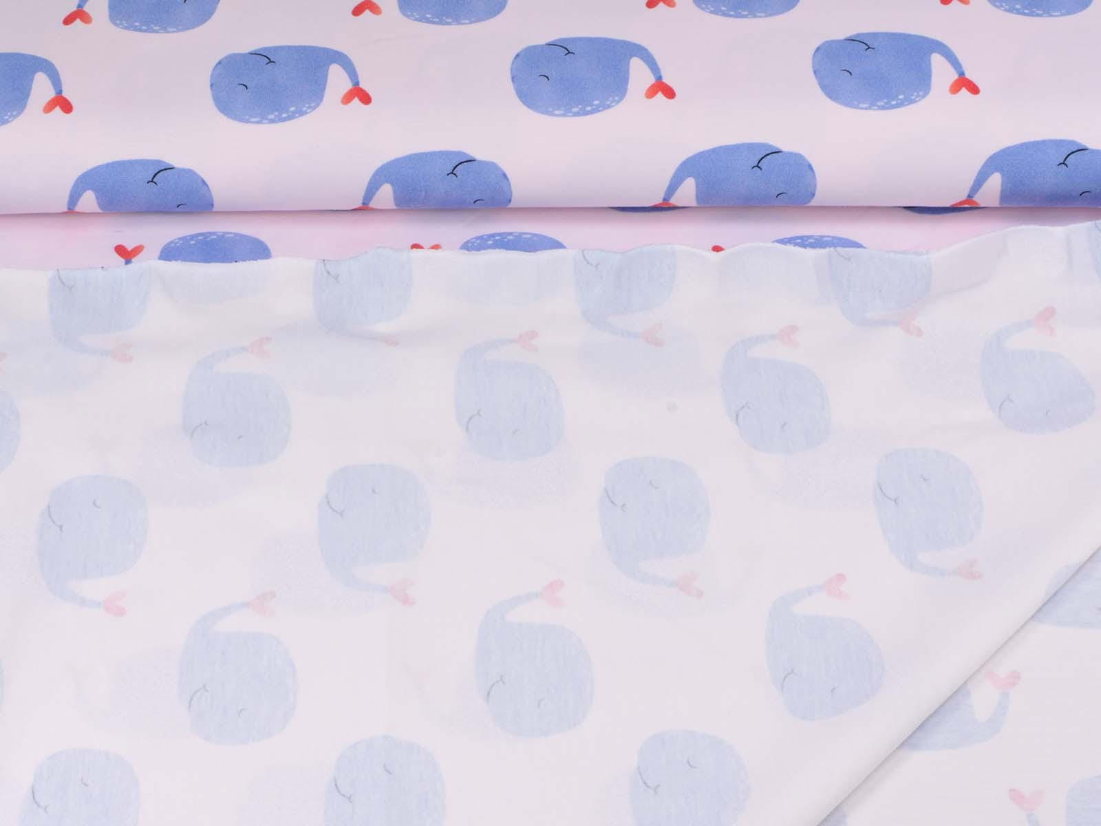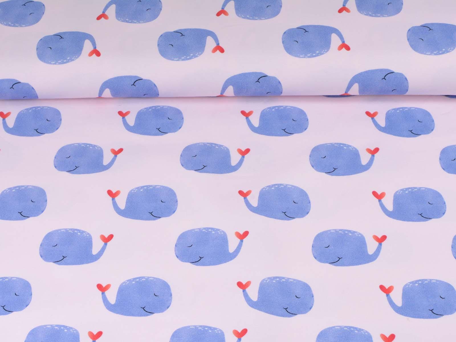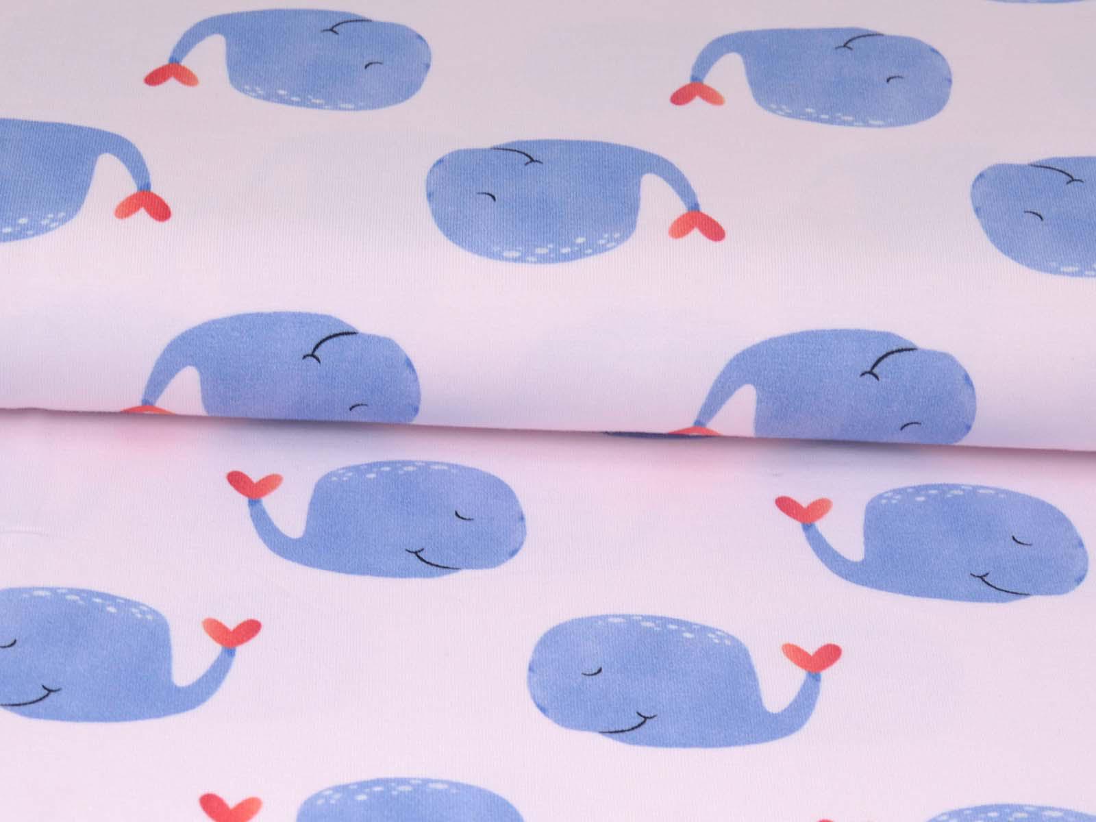 High-quality cotton jersey from Hilco. The fabric is smooth and matte. The jersey is light pink with blue whales. Each whale is approximately 4 cm high and 6.5 cm wide. Perfect for sewing T-shirts, harem pants, leggings, dresses, and much more.