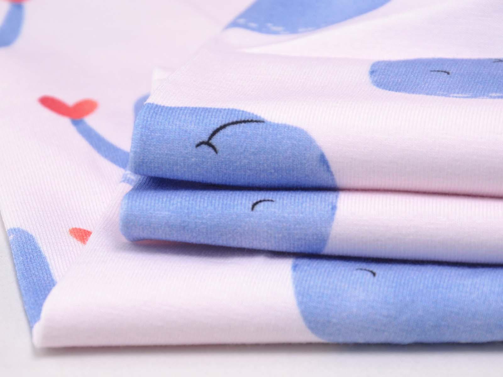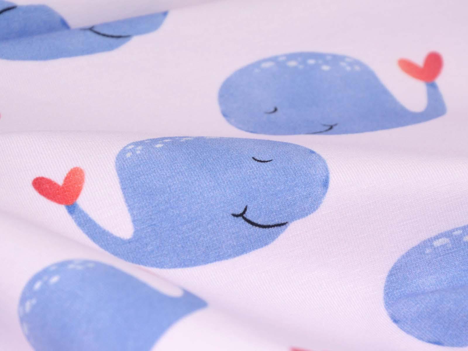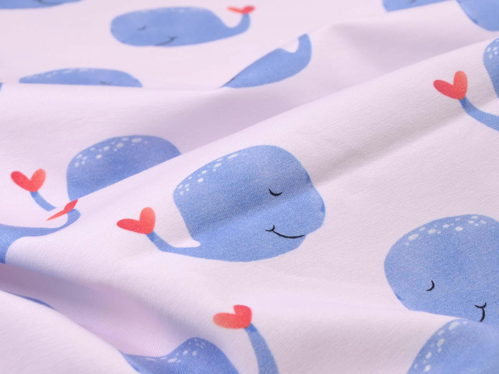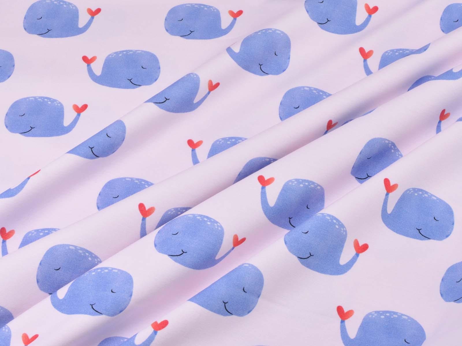 High-quality cotton jersey from Hilco. The fabric is smooth and matte. The jersey is light pink with blue whales. Each whale is approximately 4 cm high and 6.5 cm wide. Perfect for sewing T-shirts, harem pants, leggings, dresses, and much more.