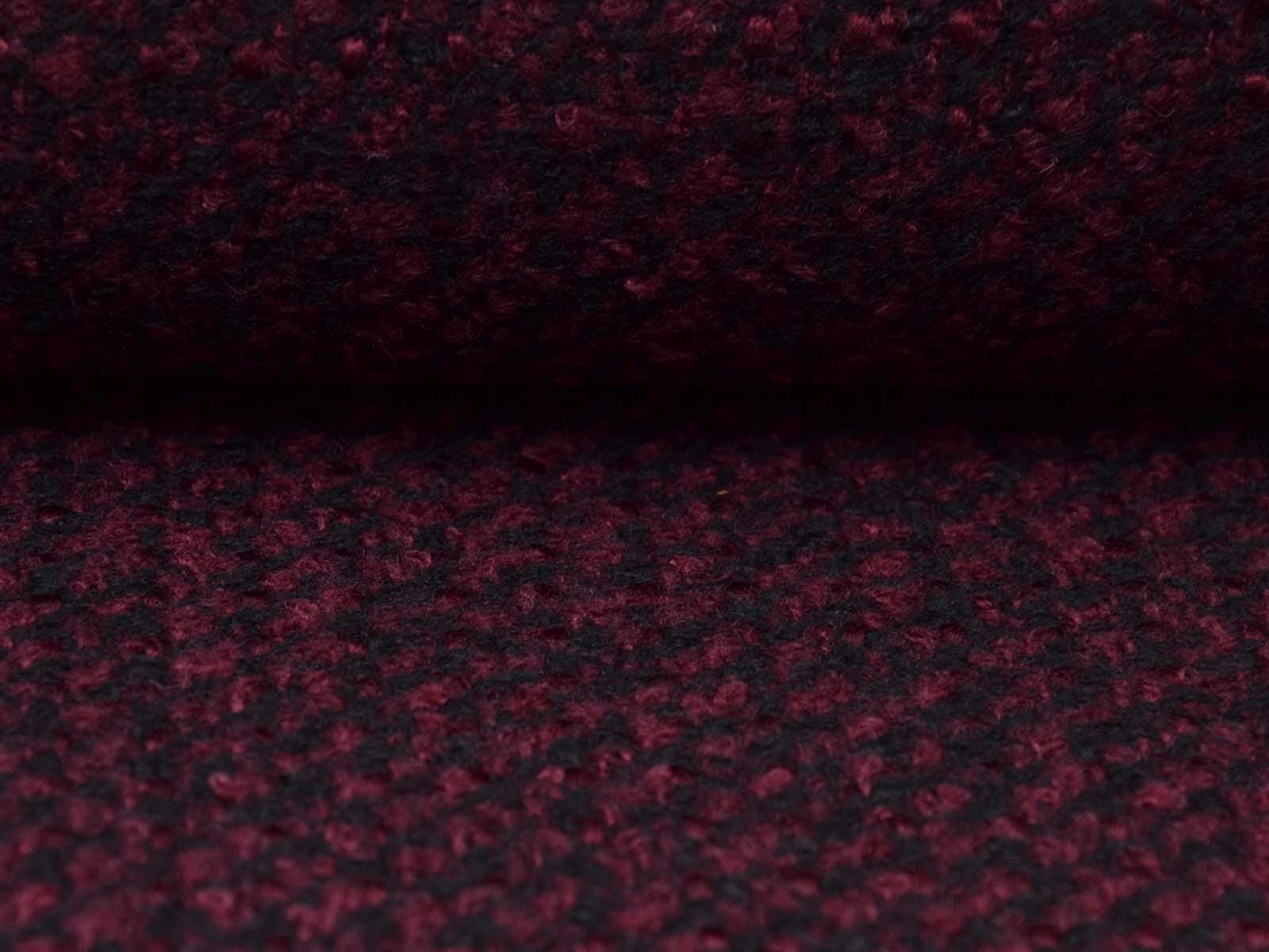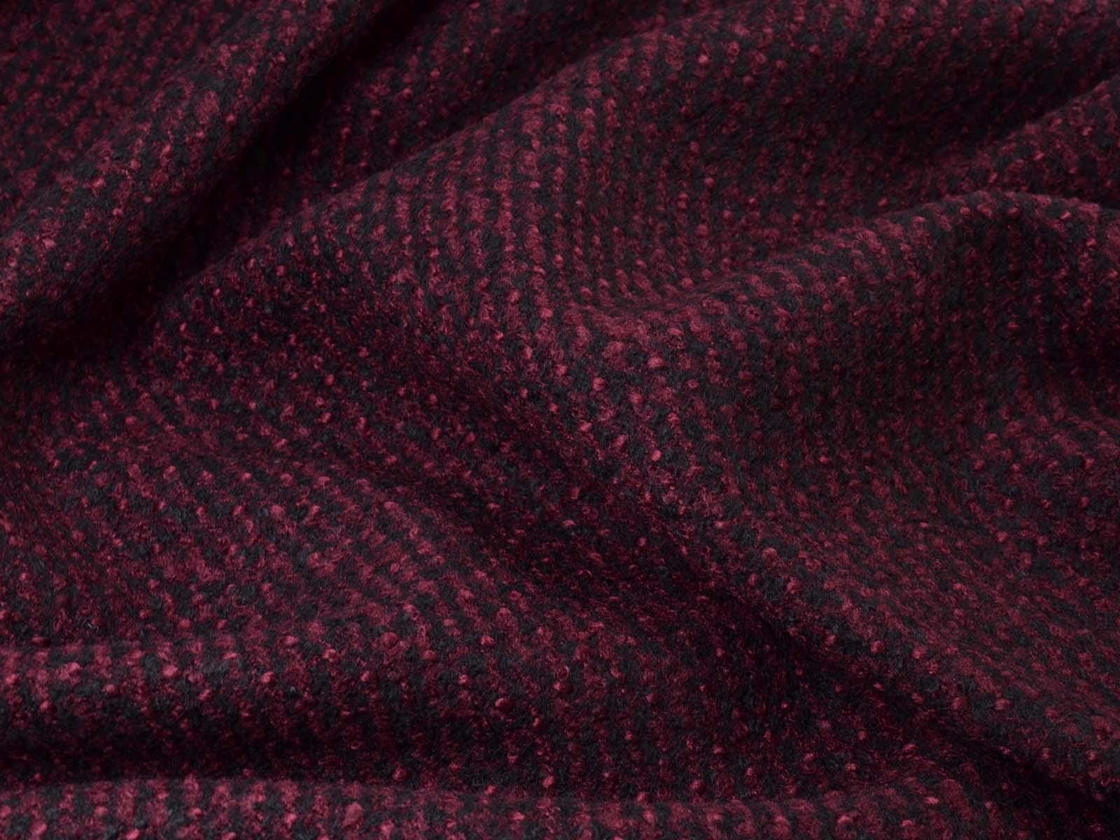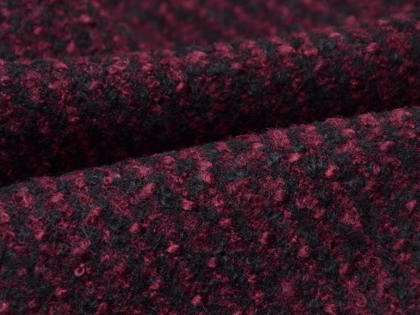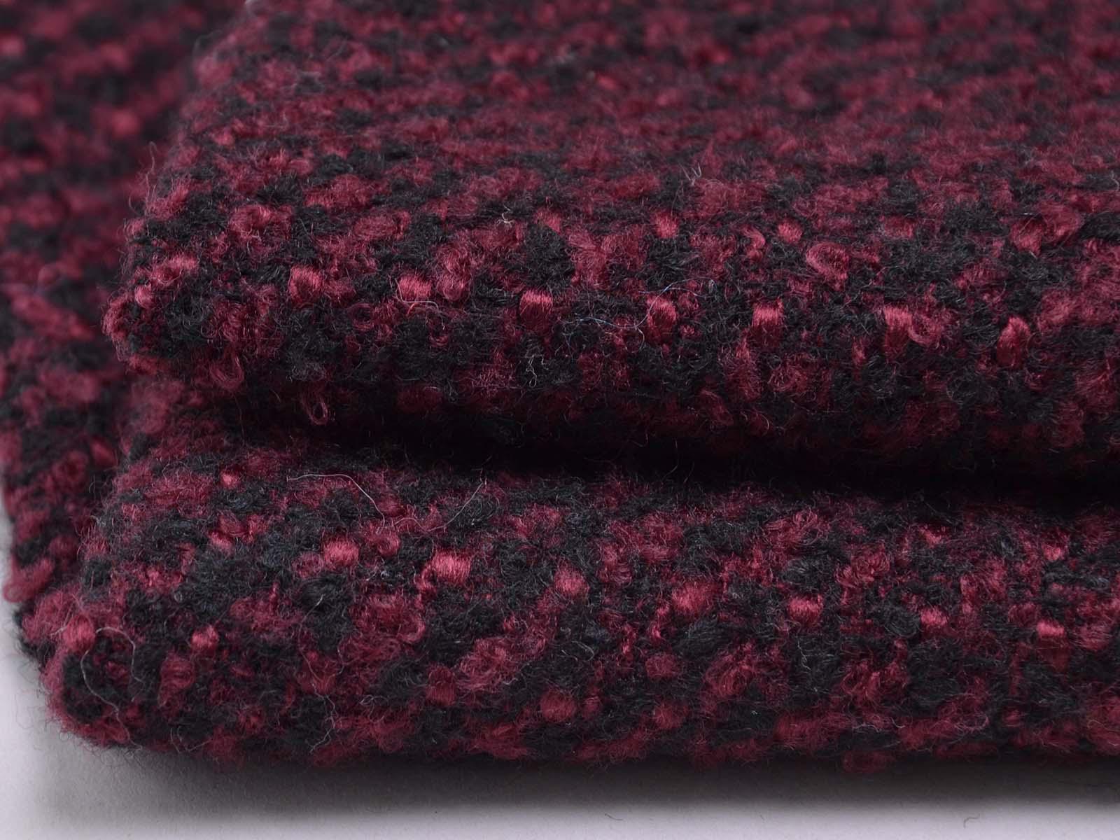 High-quality woven fabric made of wool and cotton in mottled red and black. The fabric is sturdy, heavy, and medium-thick. It looks like a boucle fabric due to the varying thickness of the threads. The fabric is suitable for sewing jackets and coats.