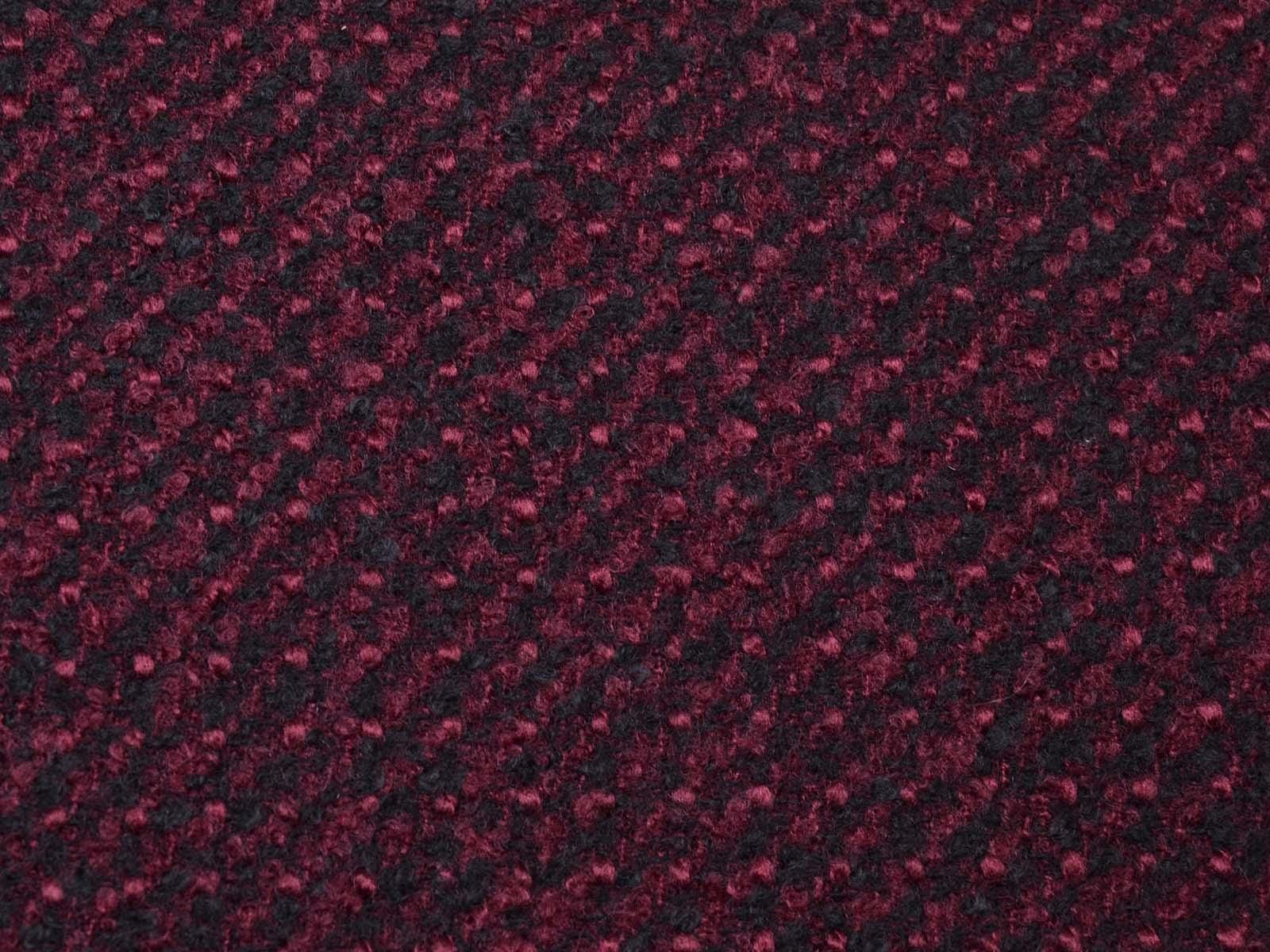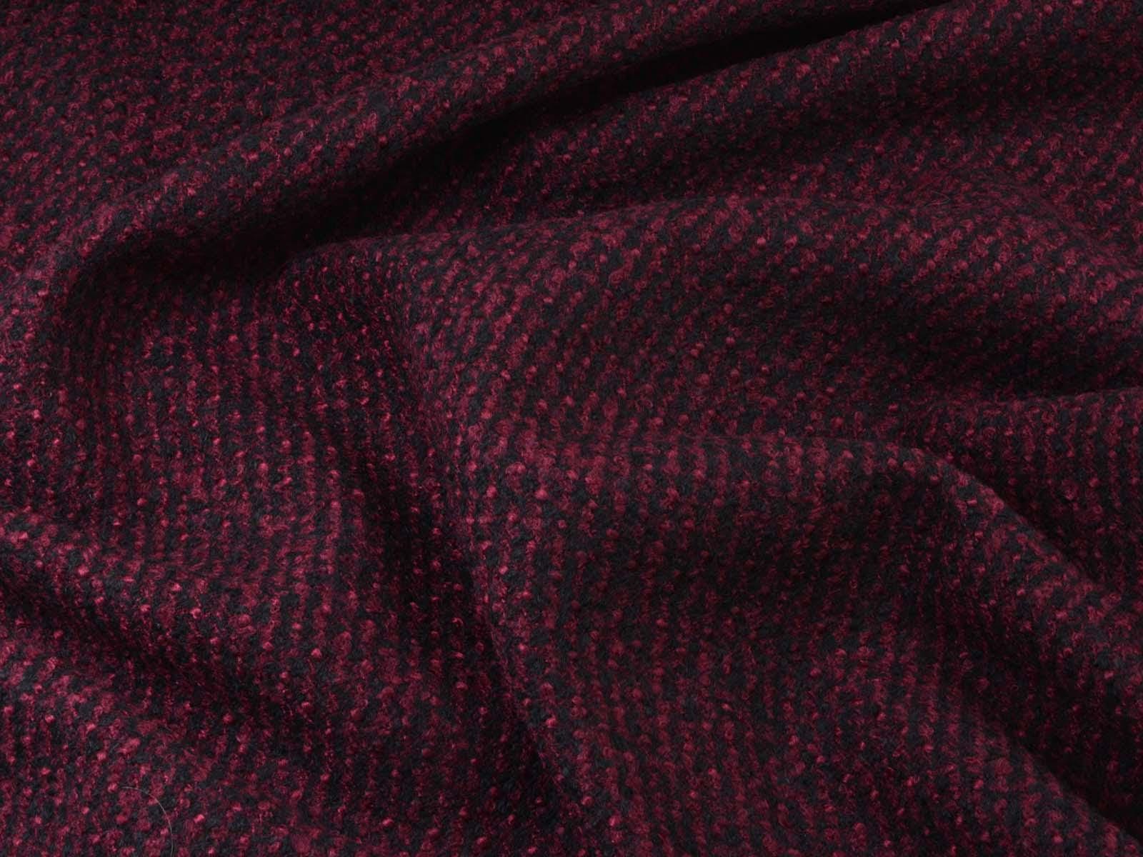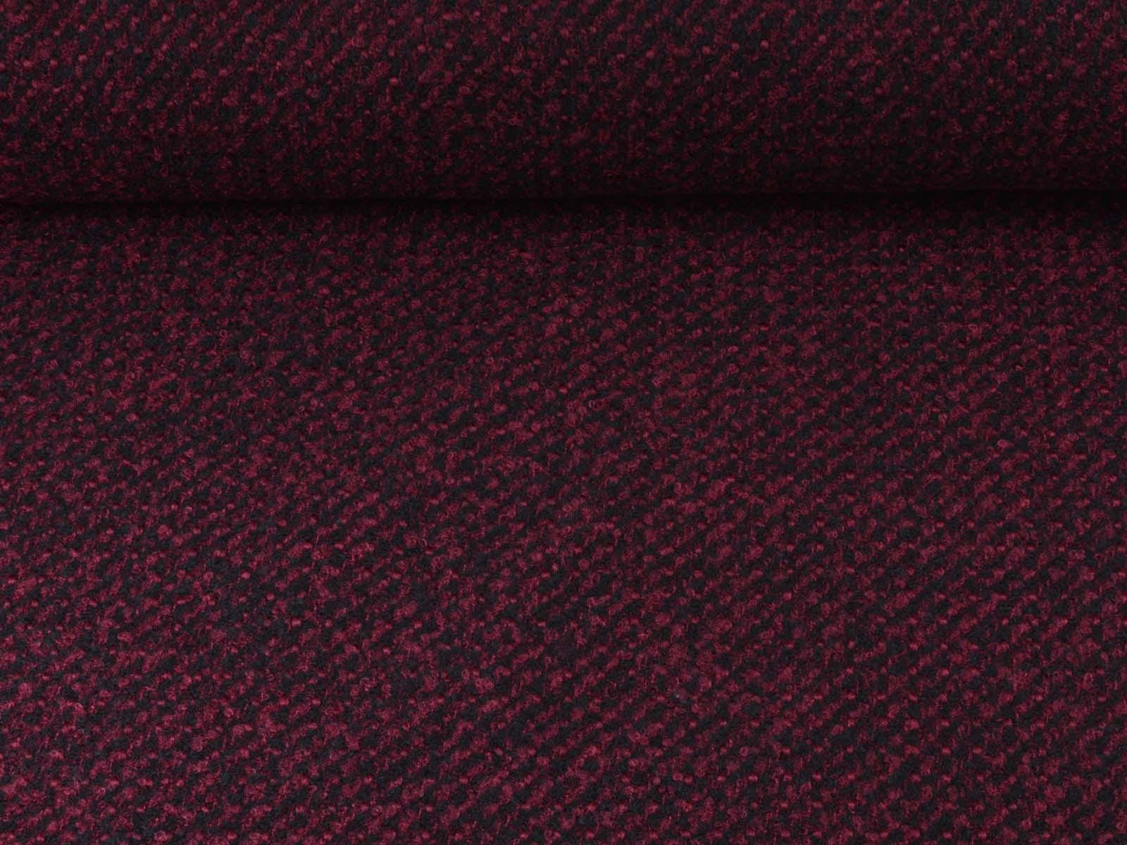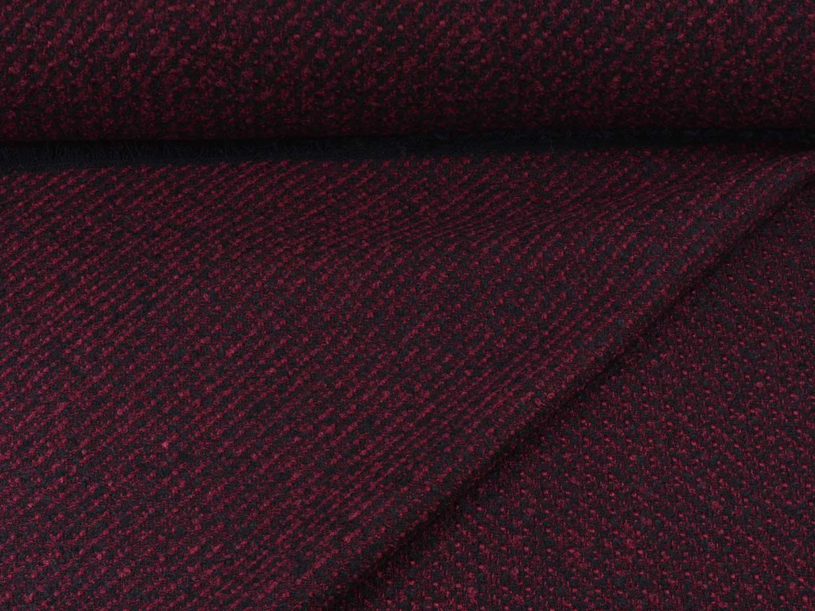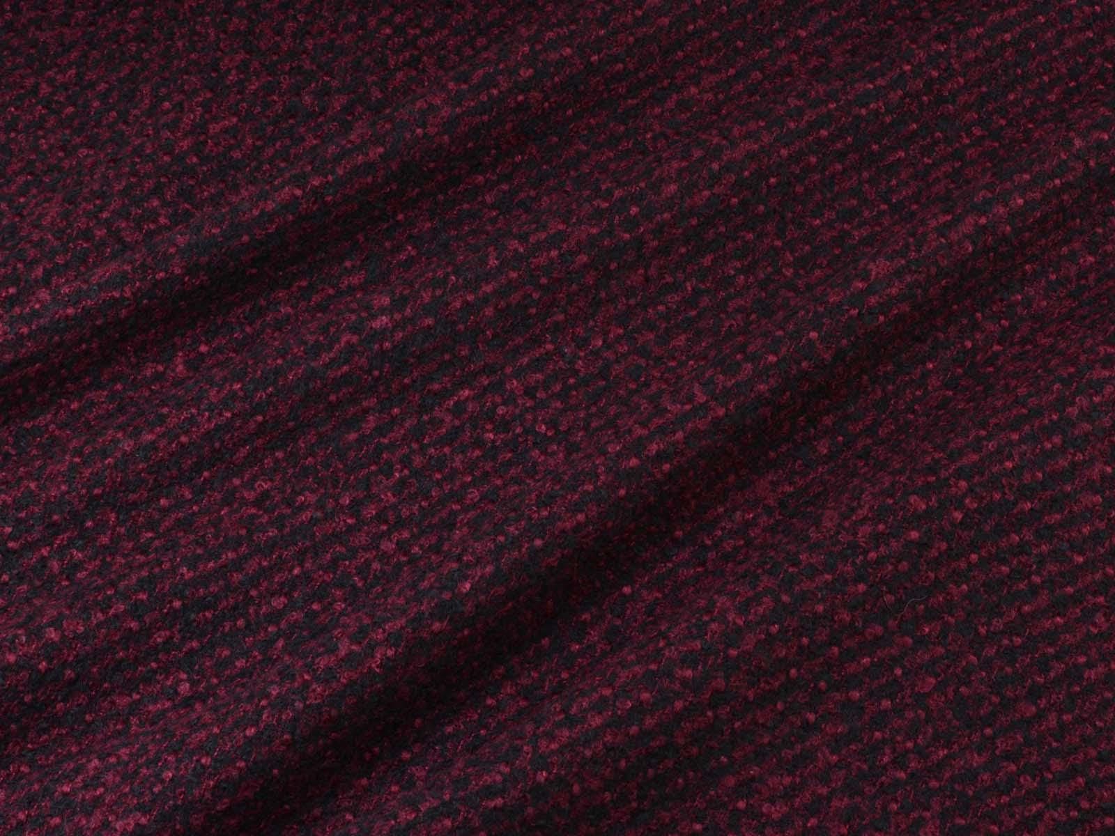 High-quality woven fabric made of wool and cotton in mottled red and black. The fabric is sturdy, heavy, and medium-thick. It looks like a boucle fabric due to the varying thickness of the threads. The fabric is suitable for sewing jackets and coats.