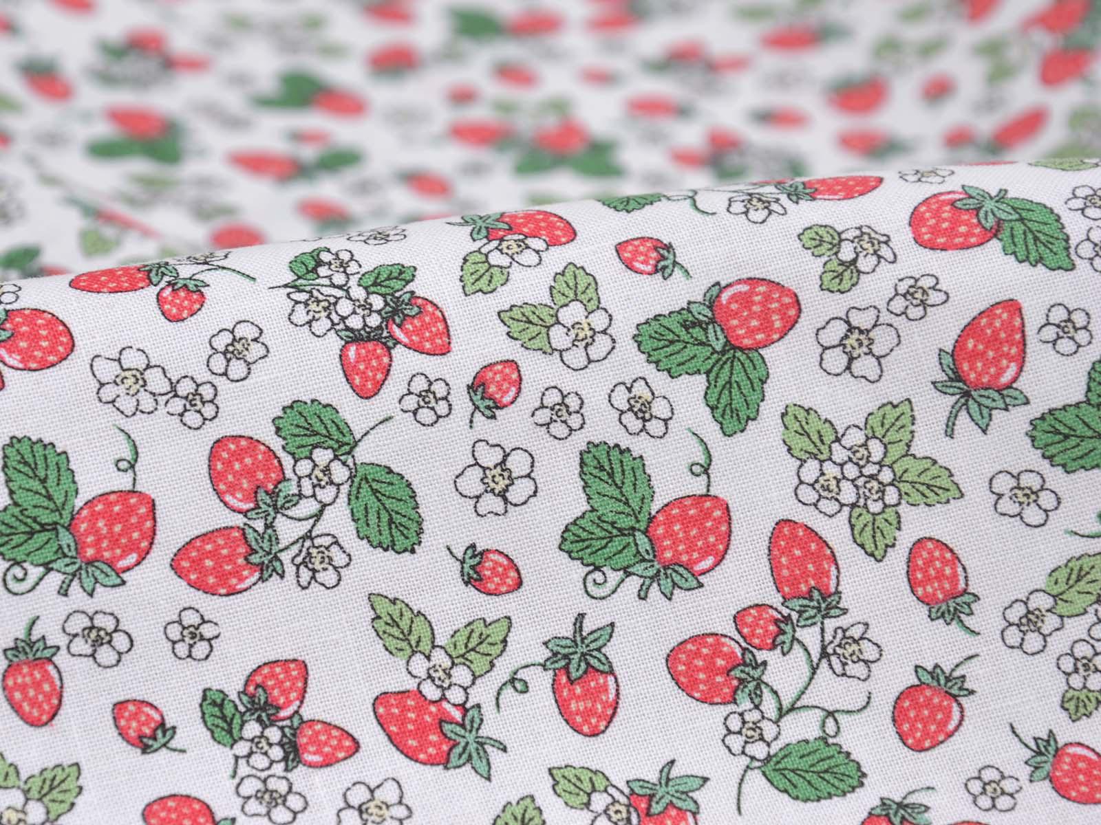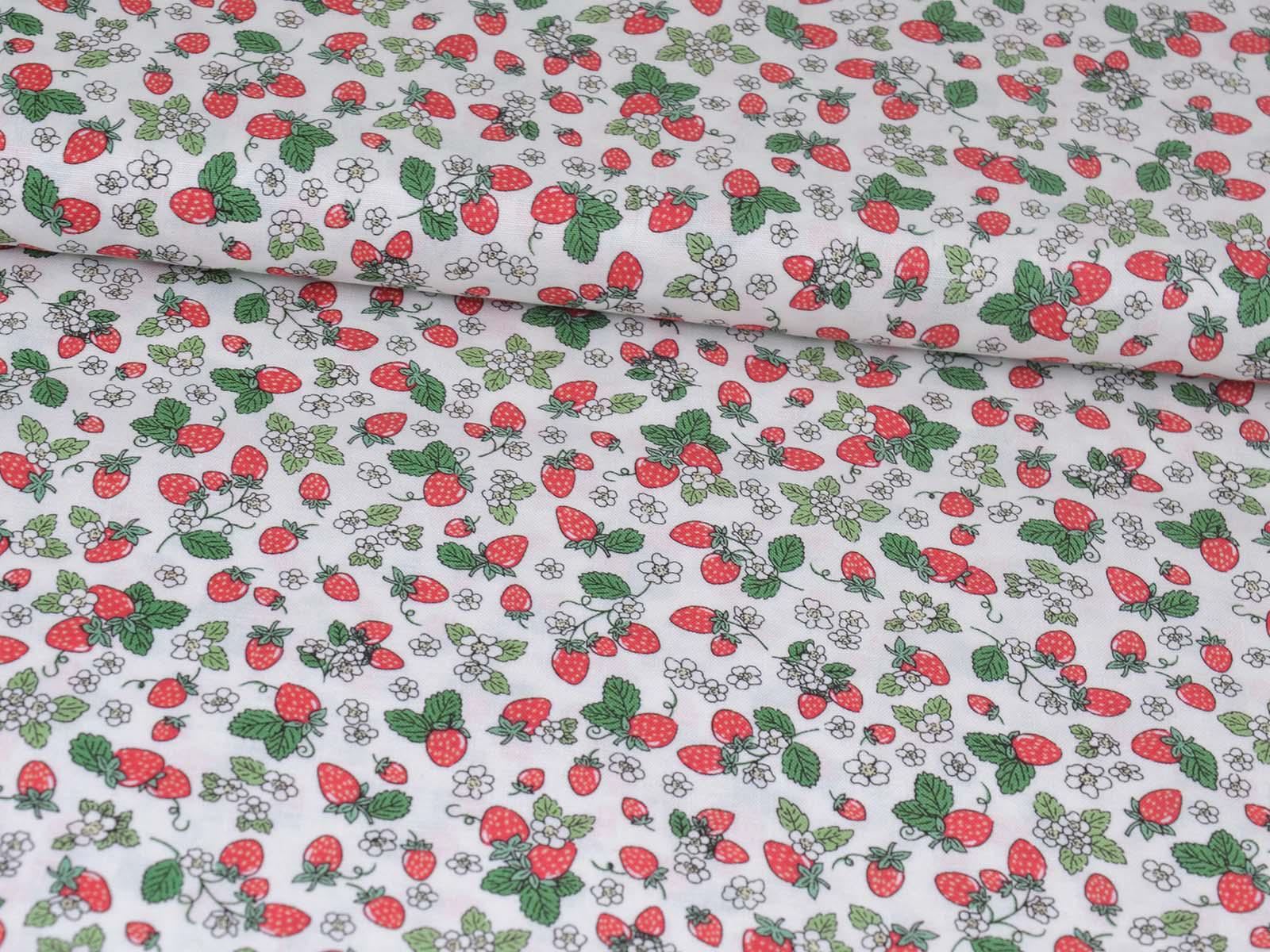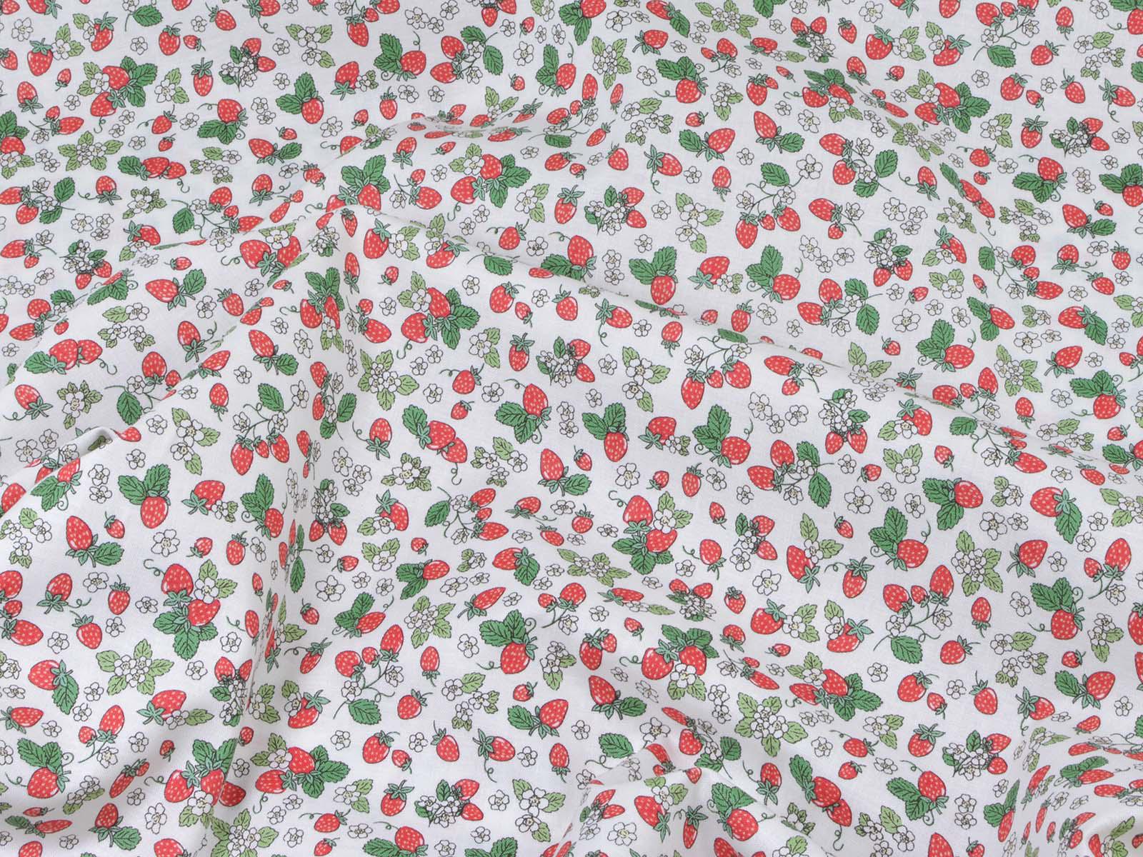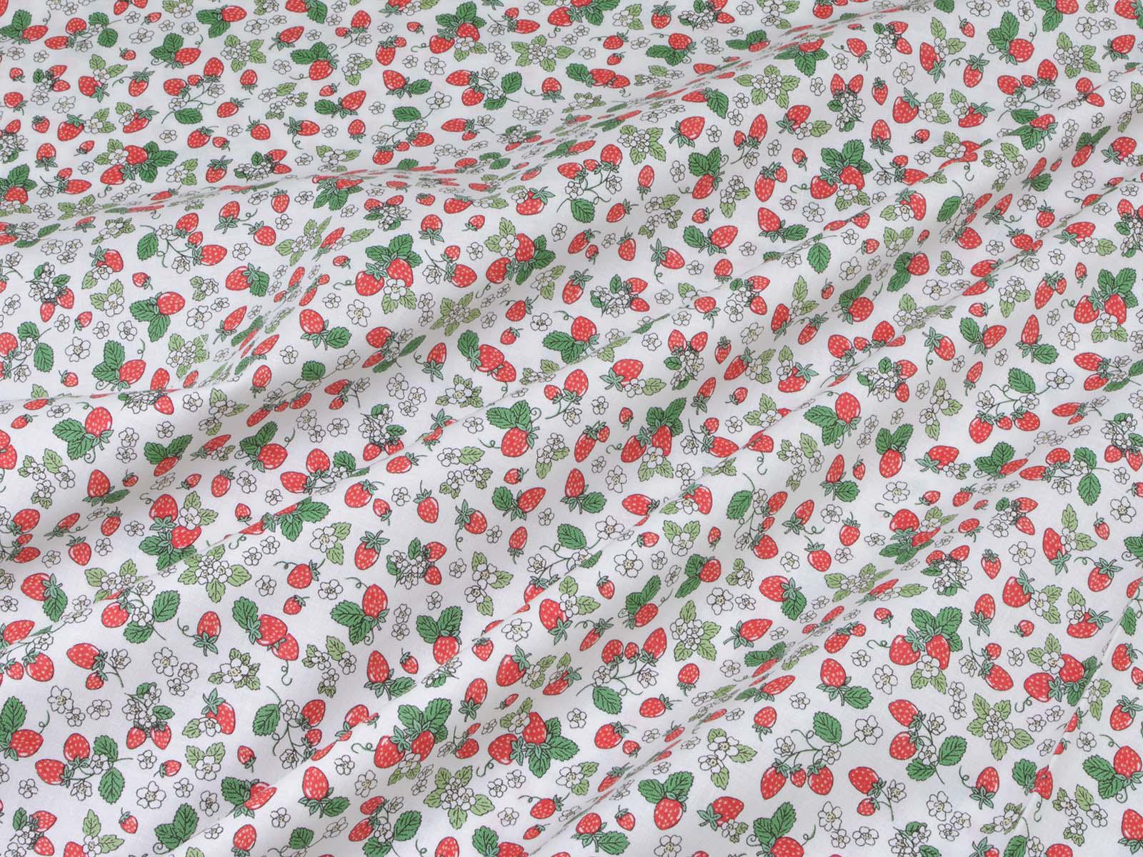 High-quality printed cotton fabric. The fabric features small, red strawberries and white flowers. This cotton fabric from Makower is sturdy and therefore ideal for sewing cushions, bags, patchwork projects, tablecloths, blouses, and much more.