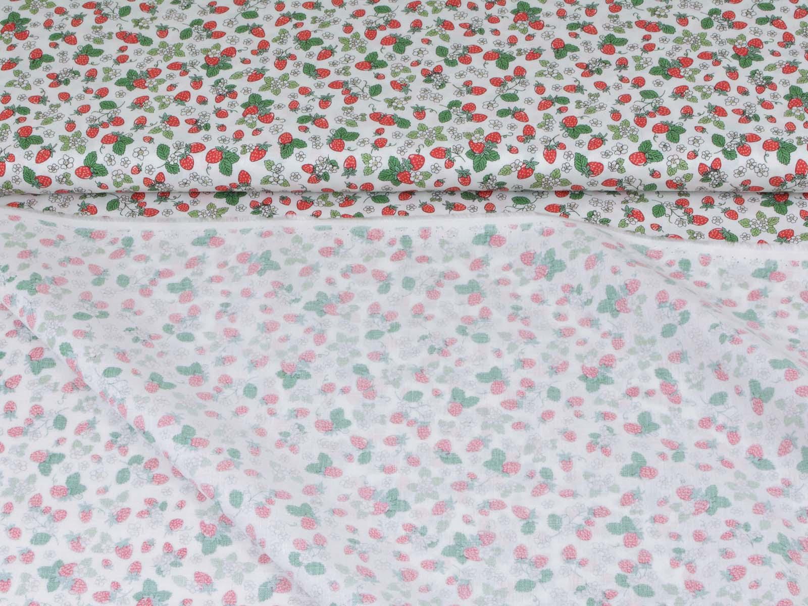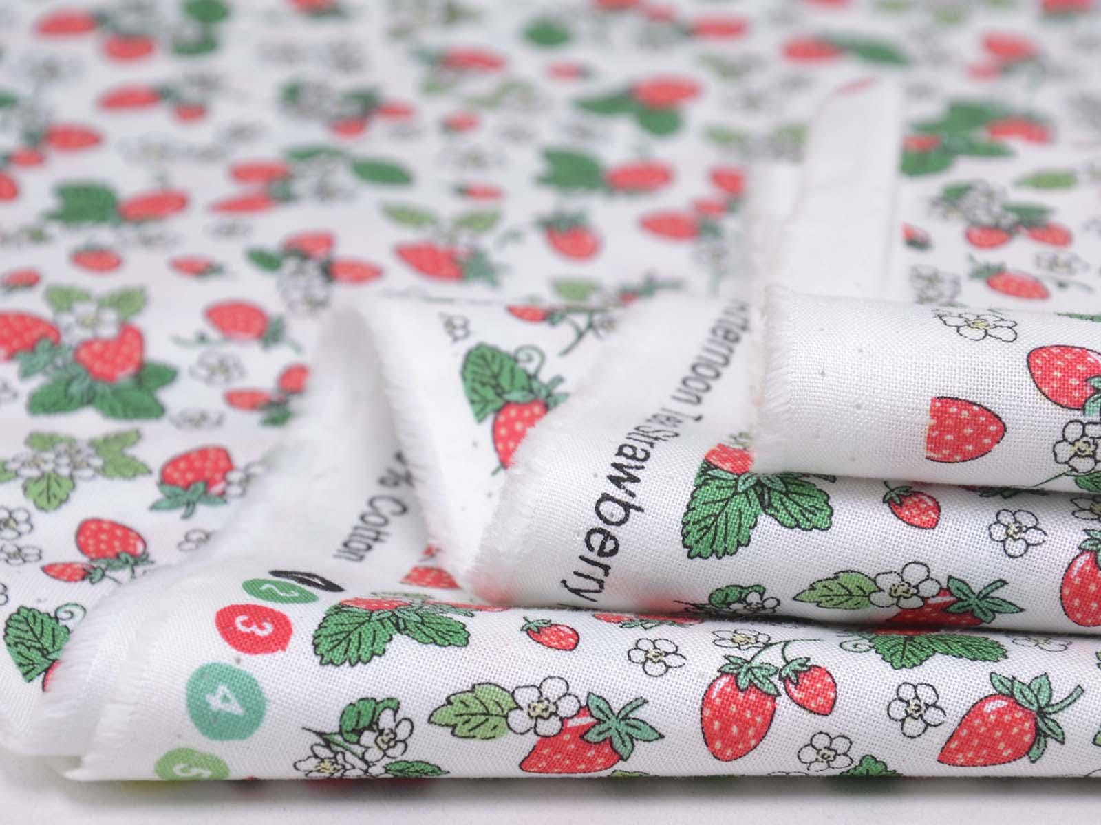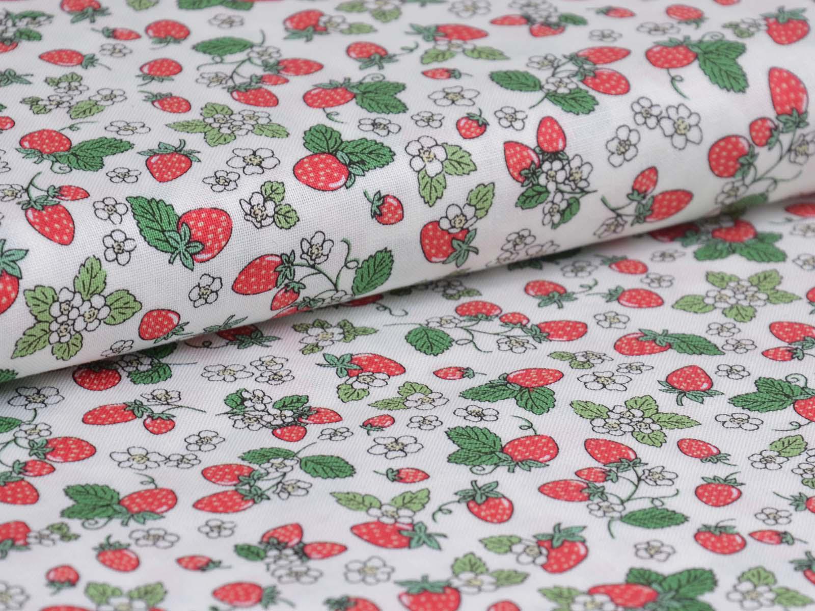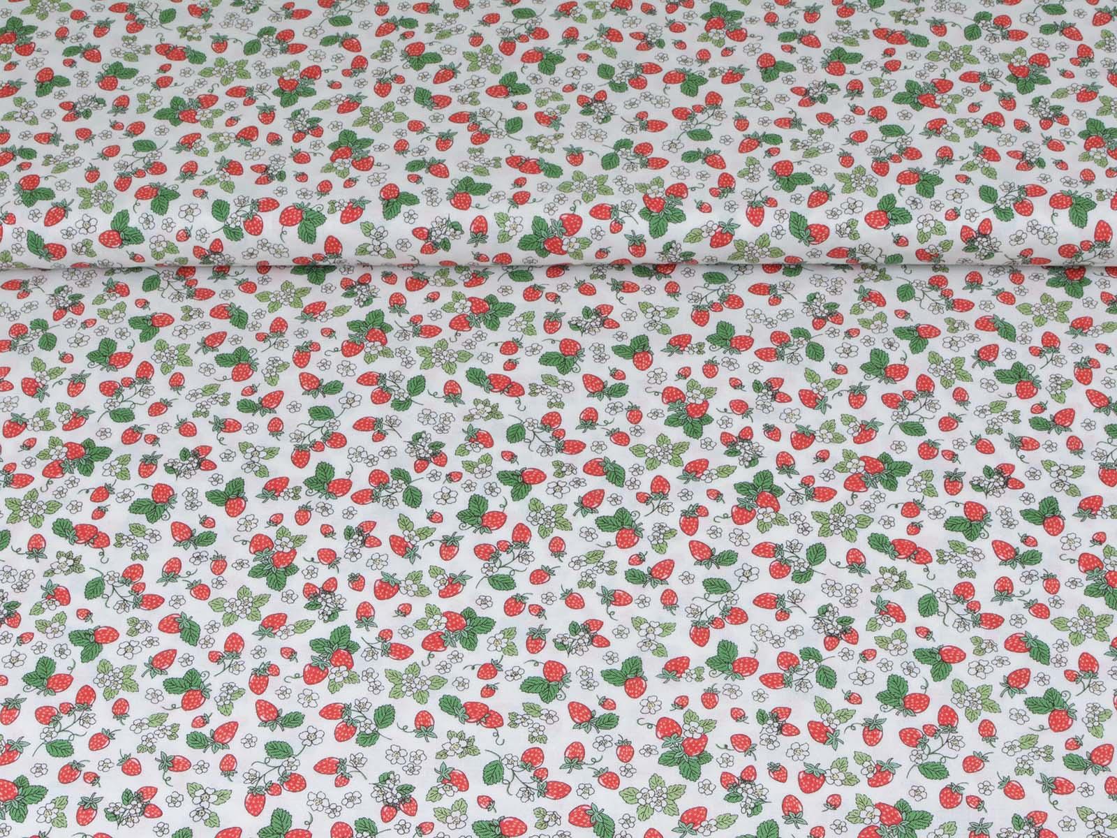 High-quality printed cotton fabric. The fabric features small, red strawberries and white flowers. This cotton fabric from Makower is sturdy and therefore ideal for sewing cushions, bags, patchwork projects, tablecloths, blouses, and much more.