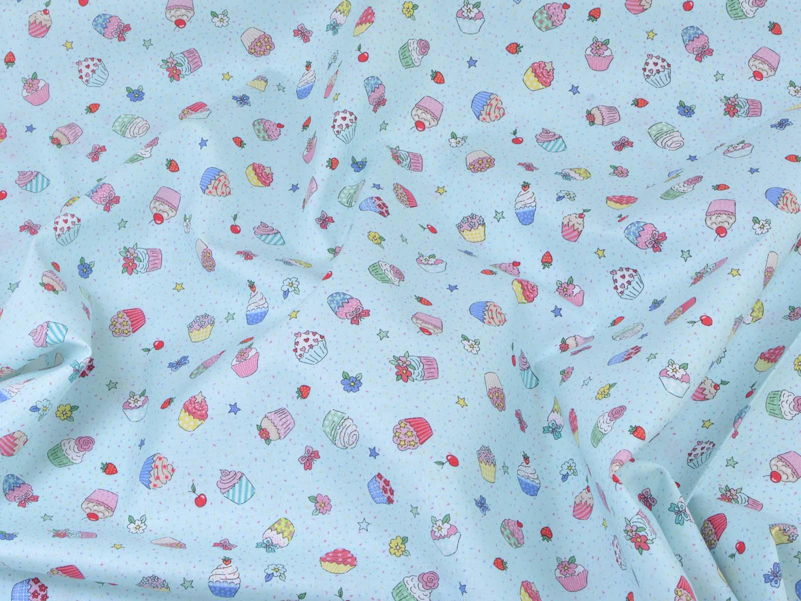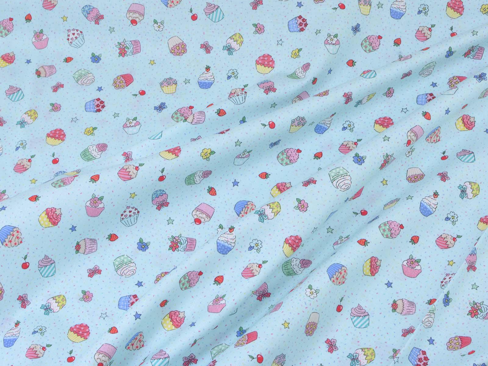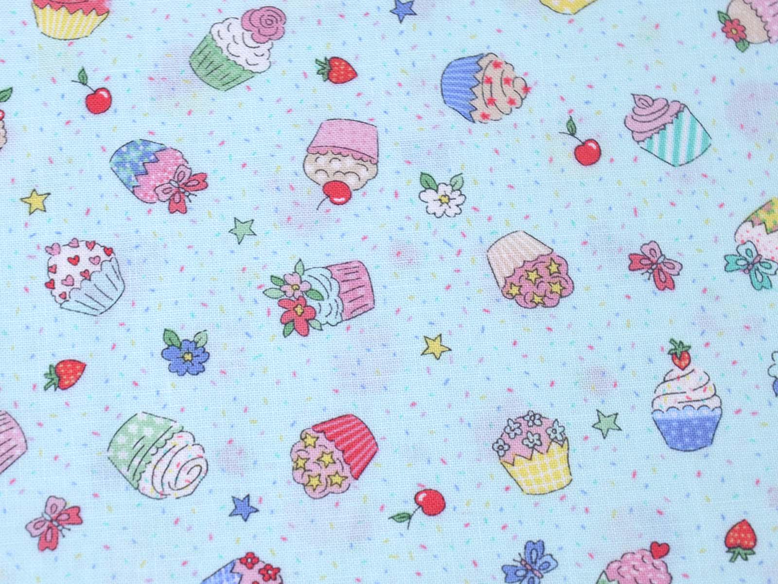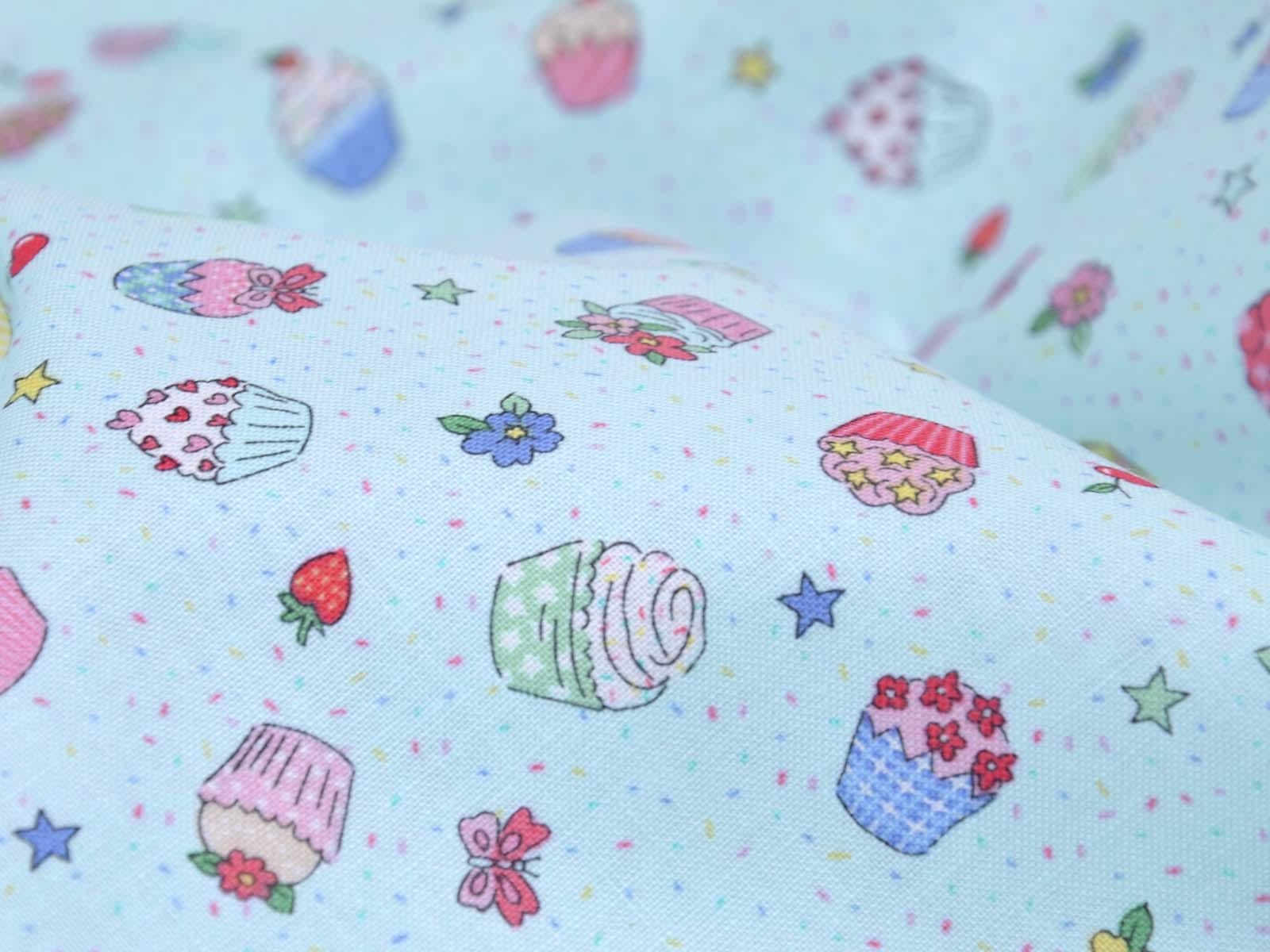 High-quality printed cotton fabric. The light blue fabric features colorful cupcakes, strawberries, cherries, and flowers. This cotton fabric from Makower is sturdy and therefore ideal for sewing pillows, bags, patchwork projects, tablecloths, blouses, and much more.