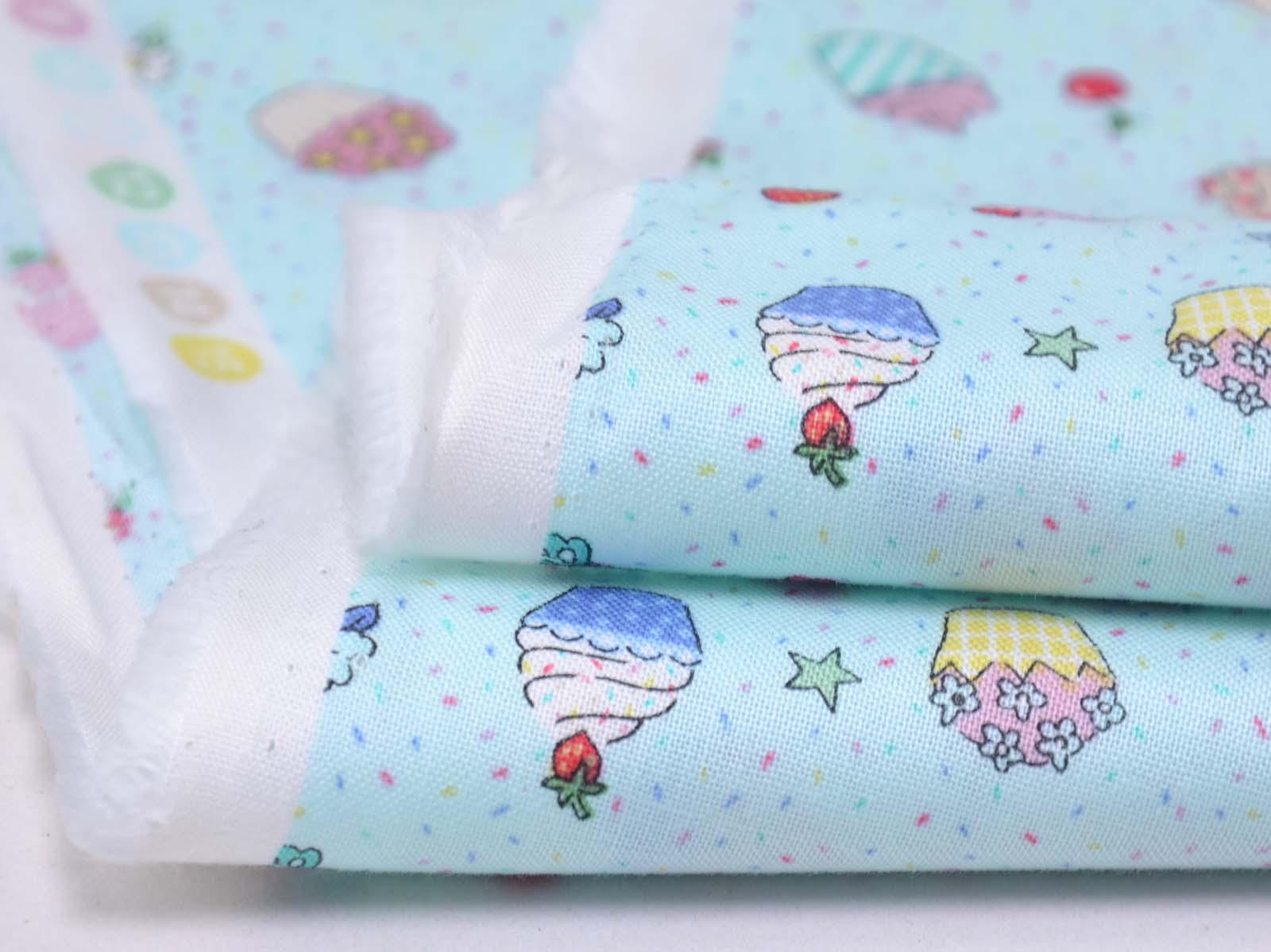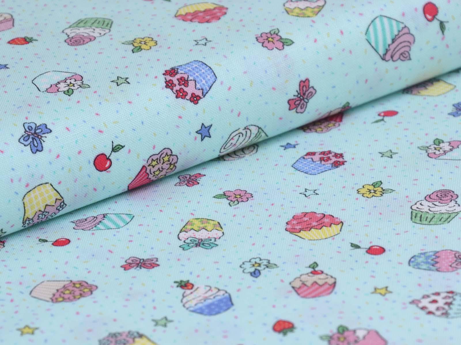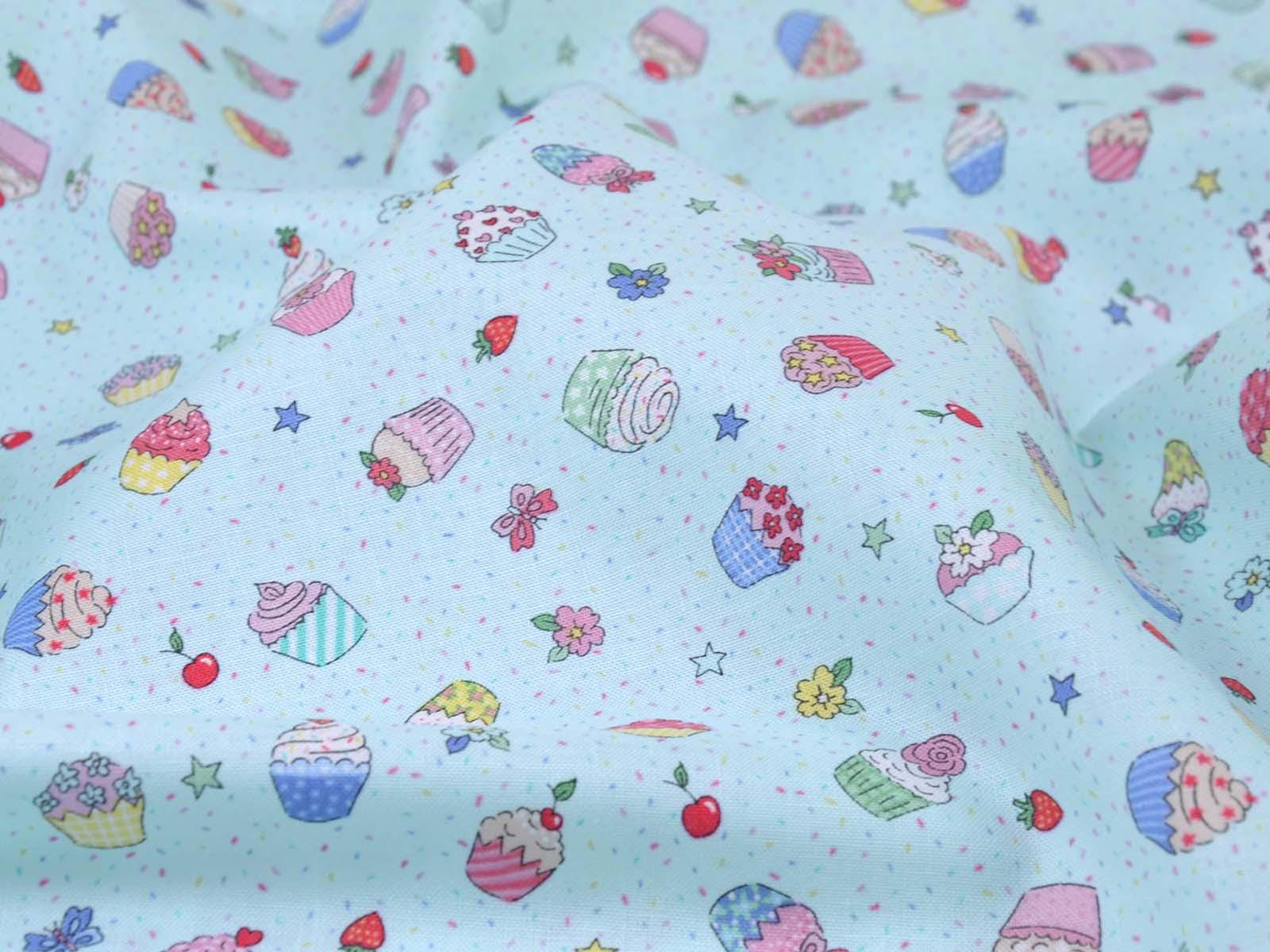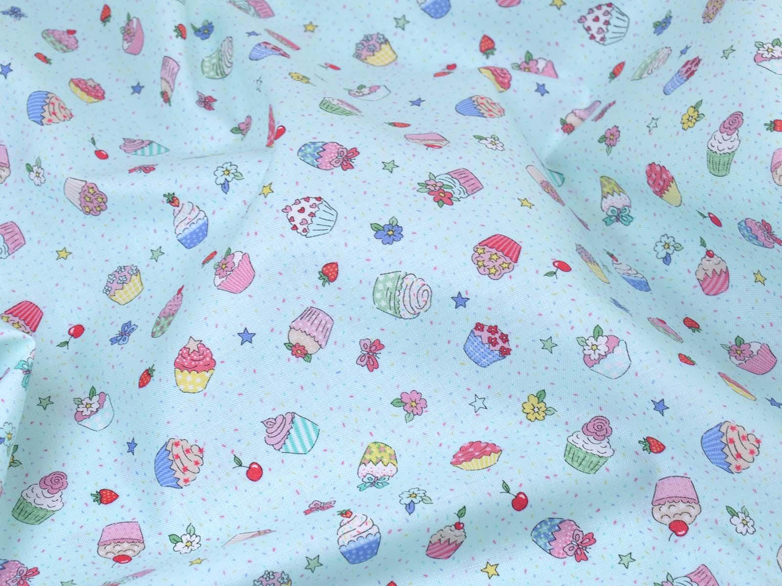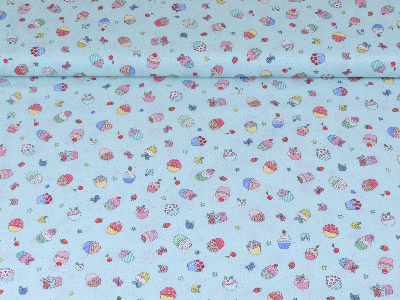 High-quality printed cotton fabric. The light blue fabric features colorful cupcakes, strawberries, cherries, and flowers. This cotton fabric from Makower is sturdy and therefore ideal for sewing pillows, bags, patchwork projects, tablecloths, blouses, and much more.