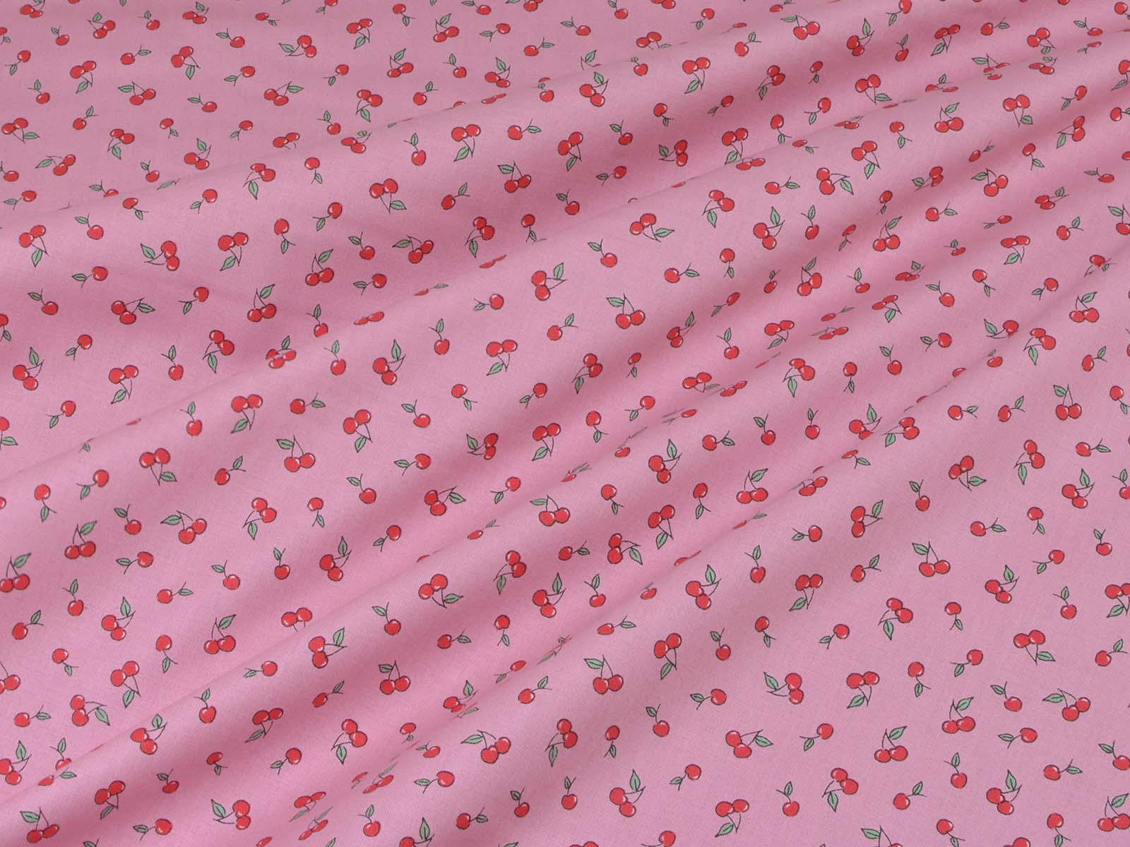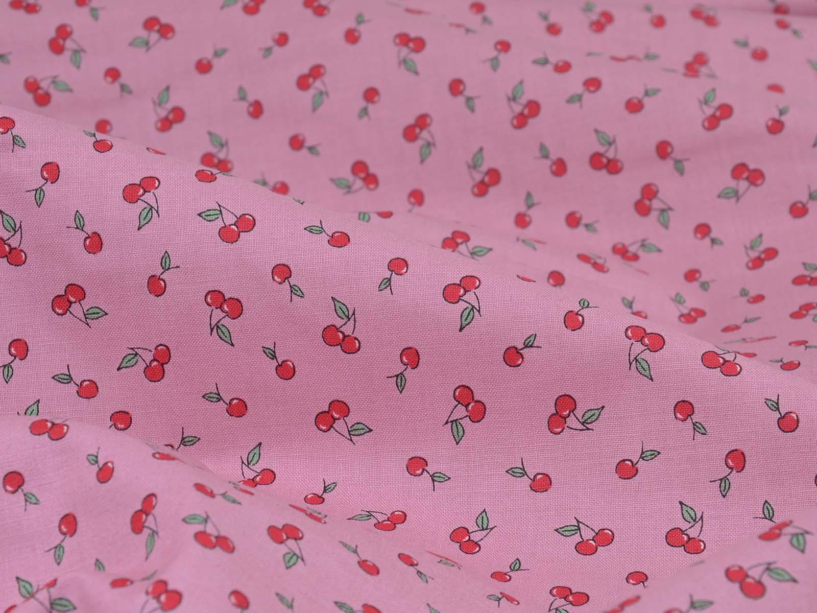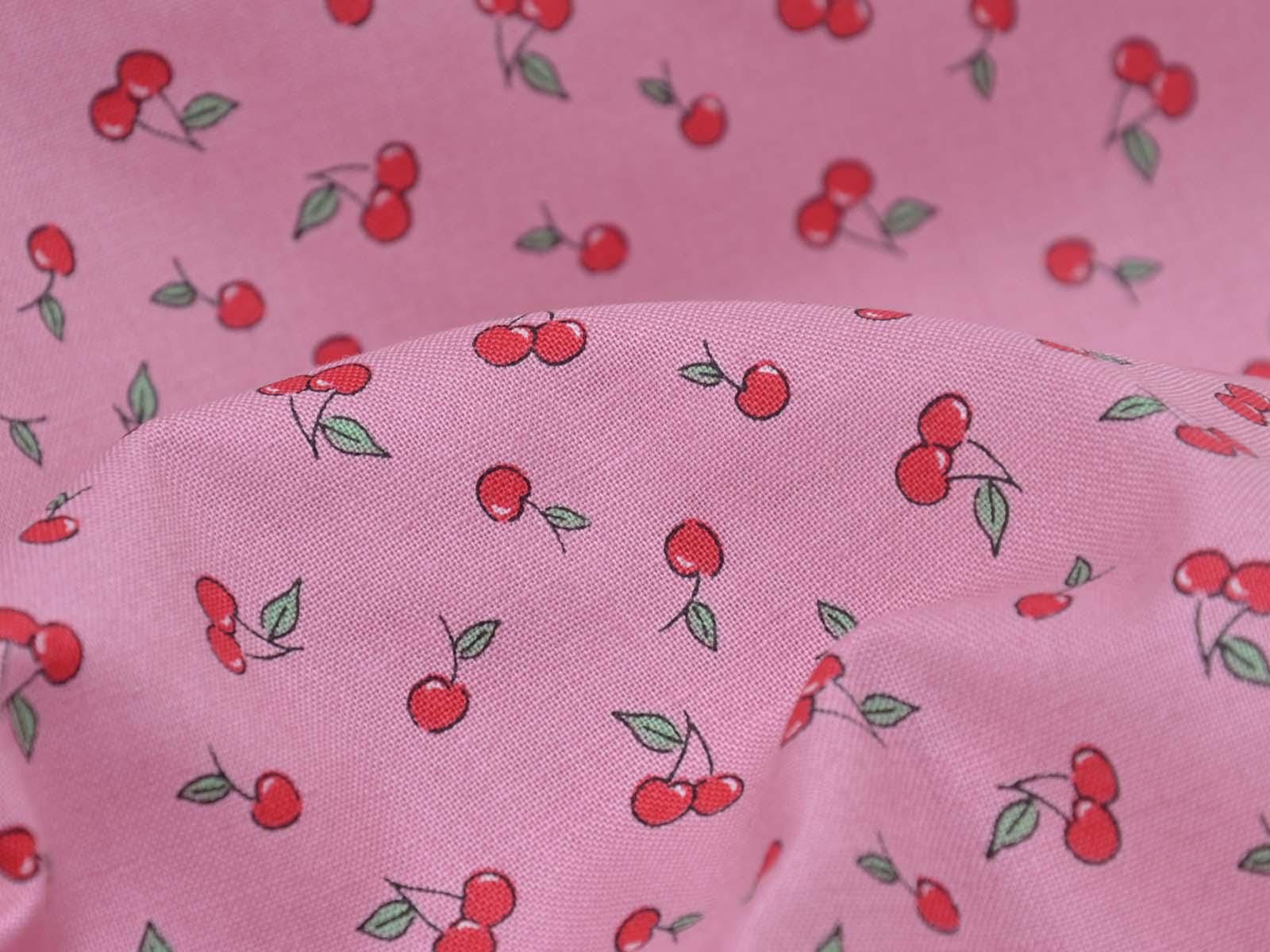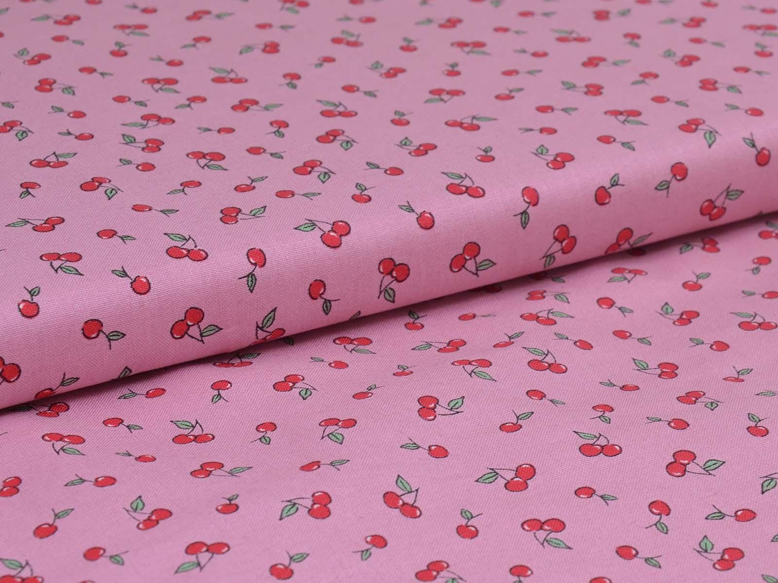 High-quality printed cotton fabric. The pink fabric features small red cherries. This cotton fabric from Makower is sturdy and therefore ideal for sewing cushions, bags, patchwork projects, tablecloths, blouses, and much more.