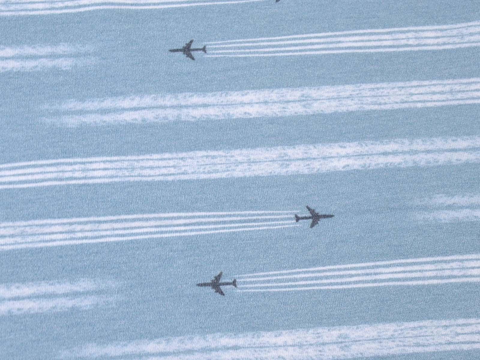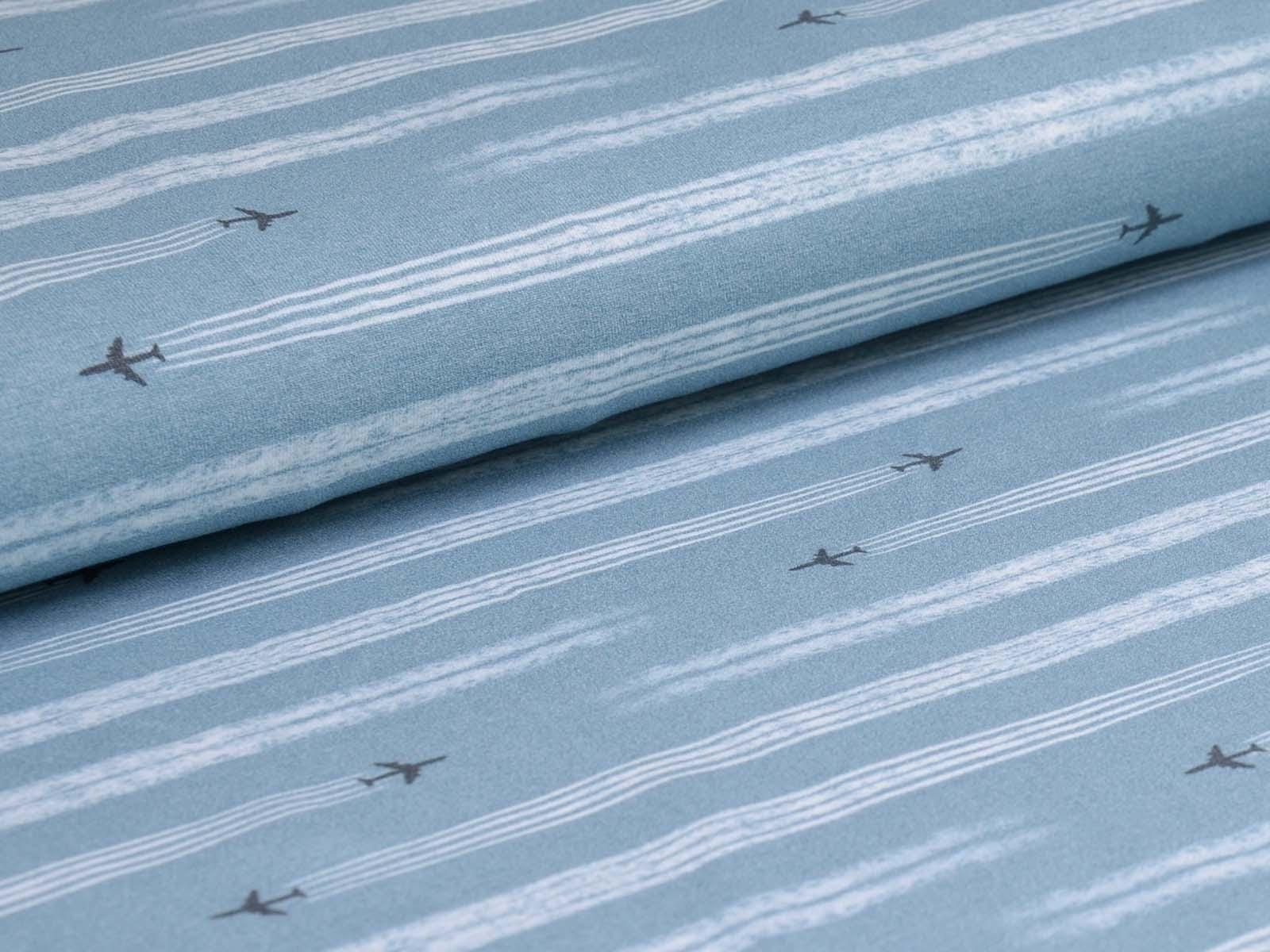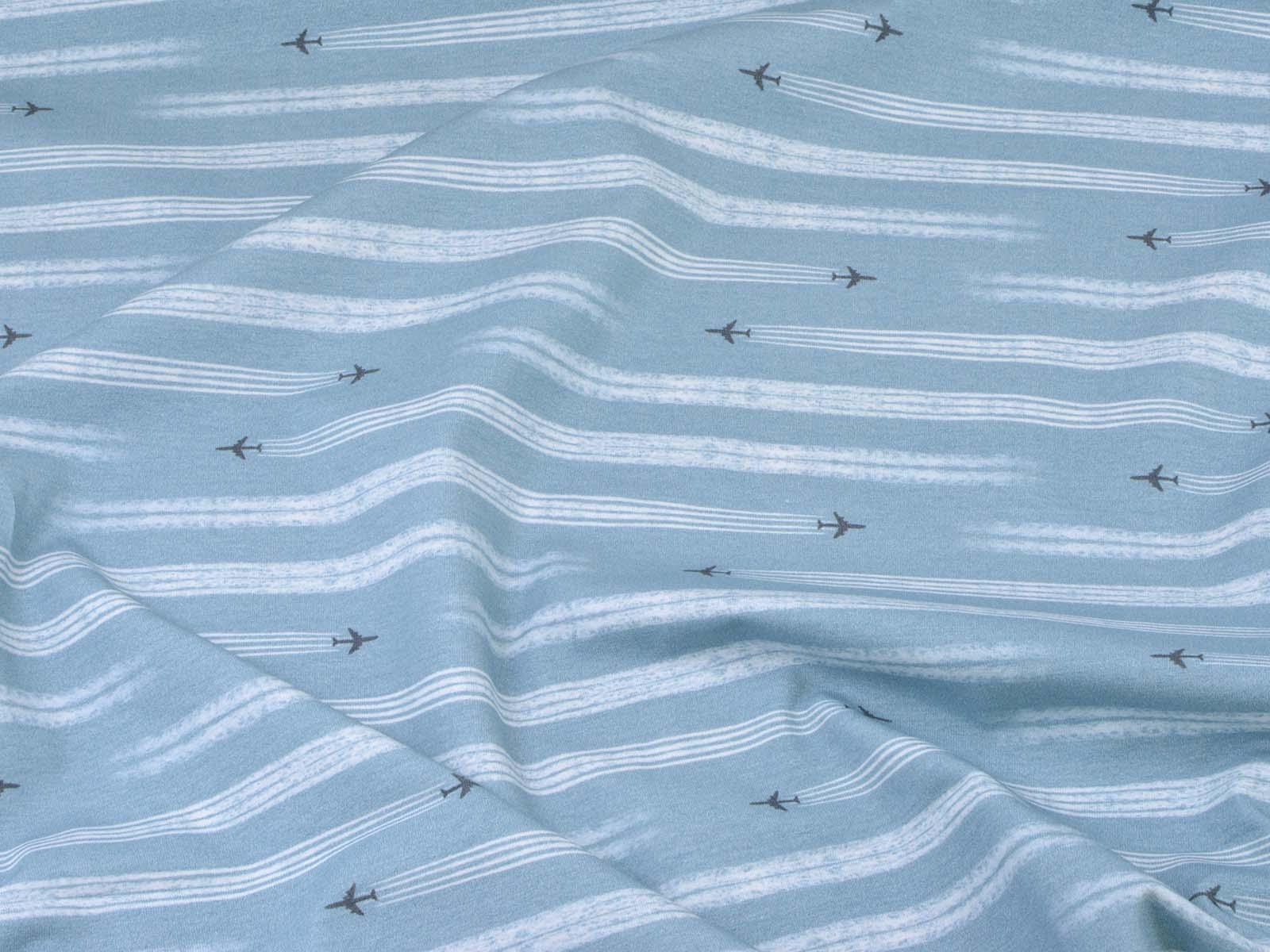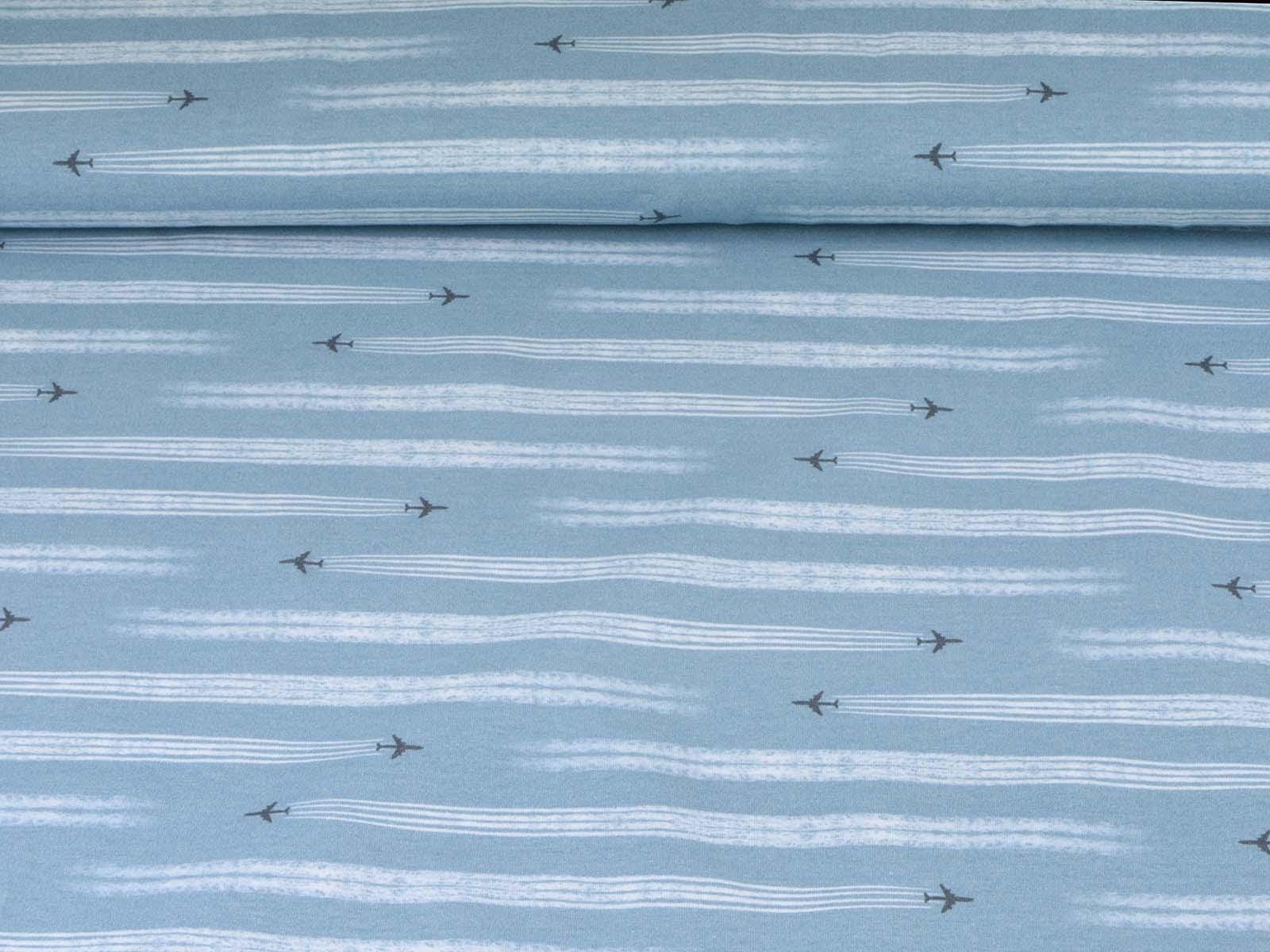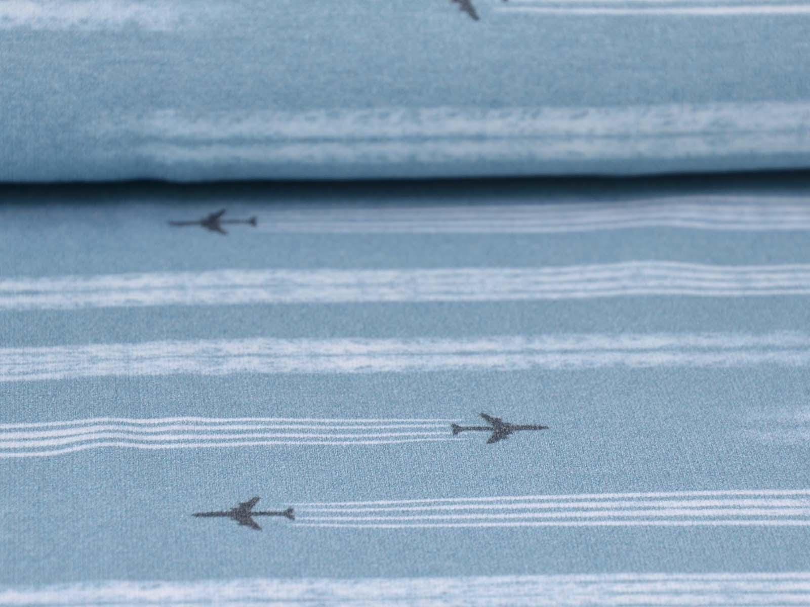 High-quality cotton jersey from Hilco. The fabric is smooth and matte. The jersey is blue with stripes and small airplanes. Perfect for sewing T-shirts, bloomers, leggings, dresses, and much more.