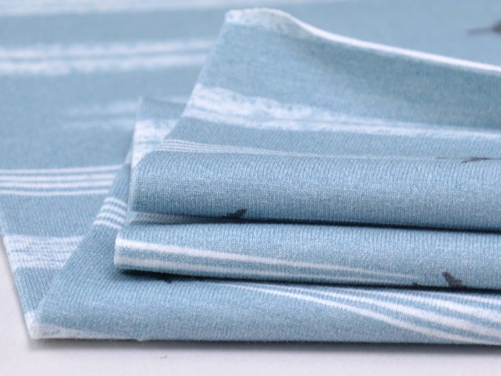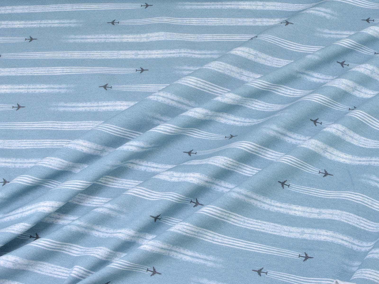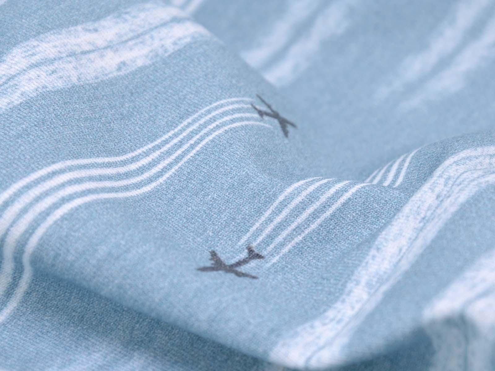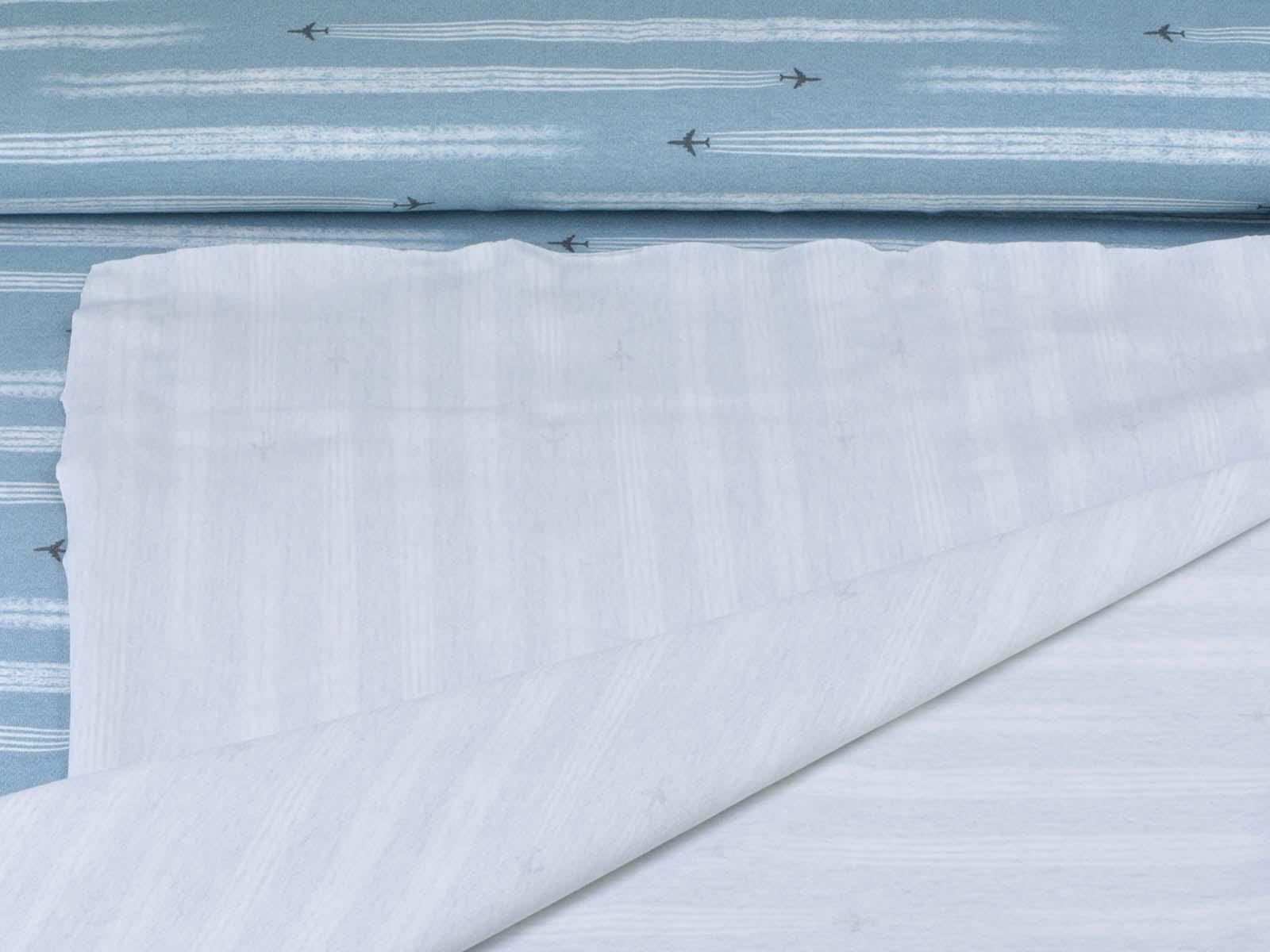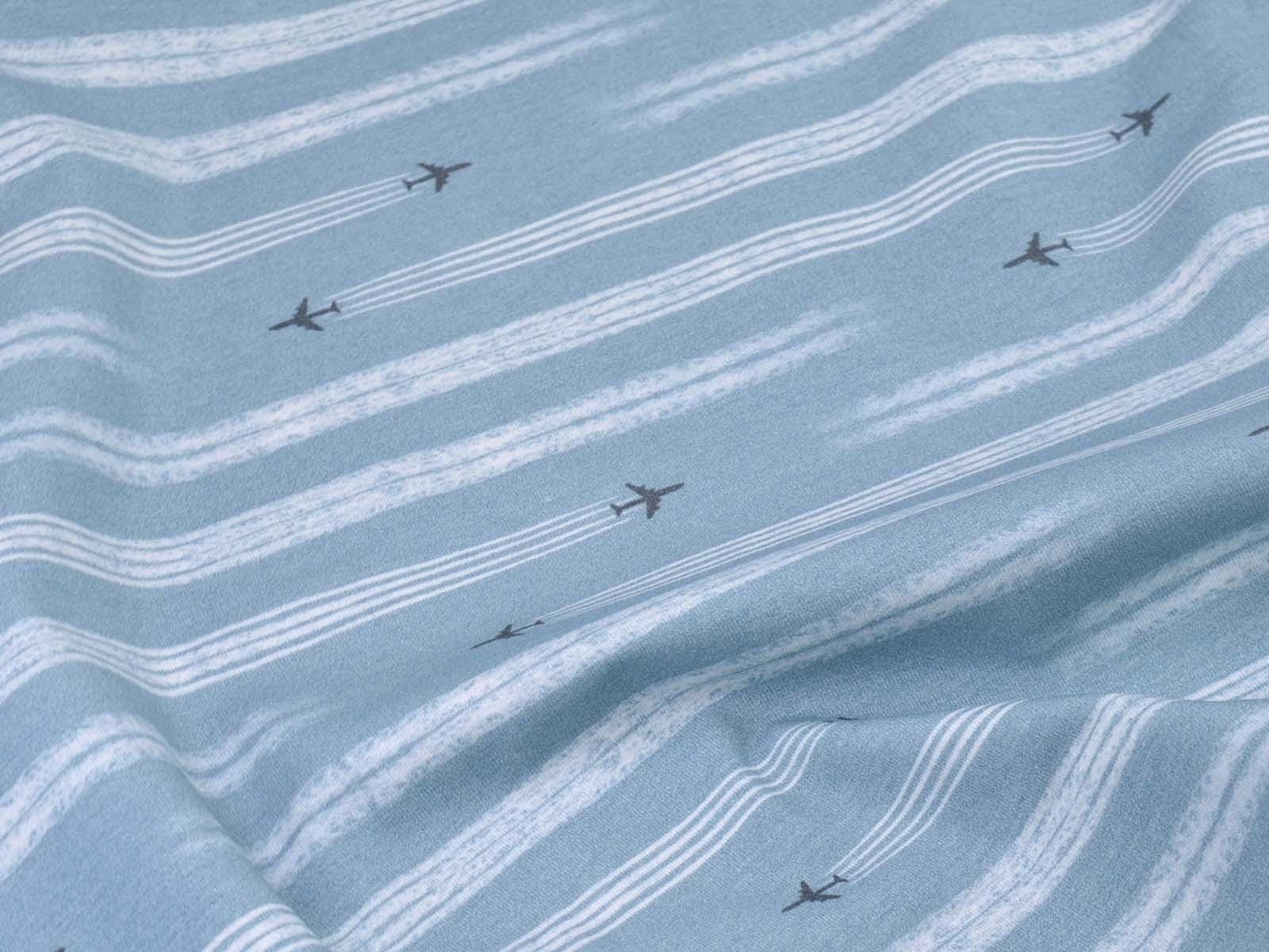 High-quality cotton jersey from Hilco. The fabric is smooth and matte. The jersey is blue with stripes and small airplanes. Perfect for sewing T-shirts, bloomers, leggings, dresses, and much more.