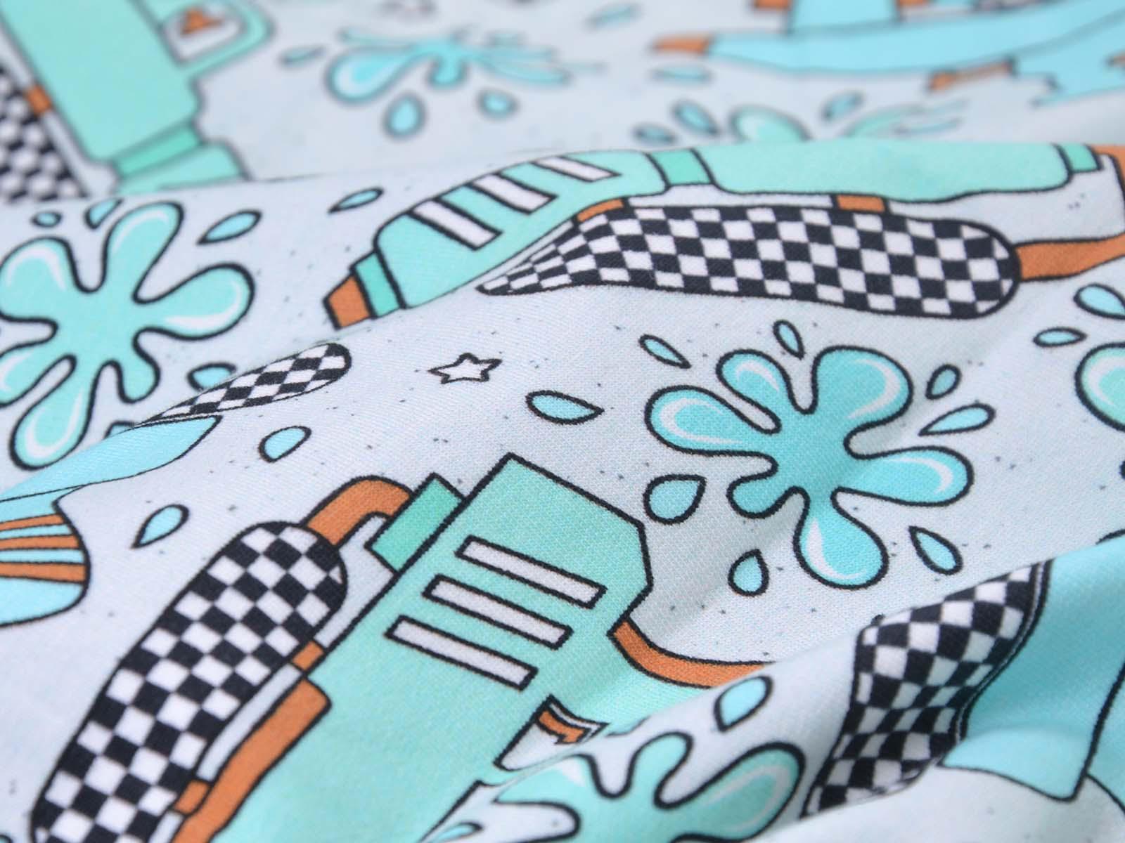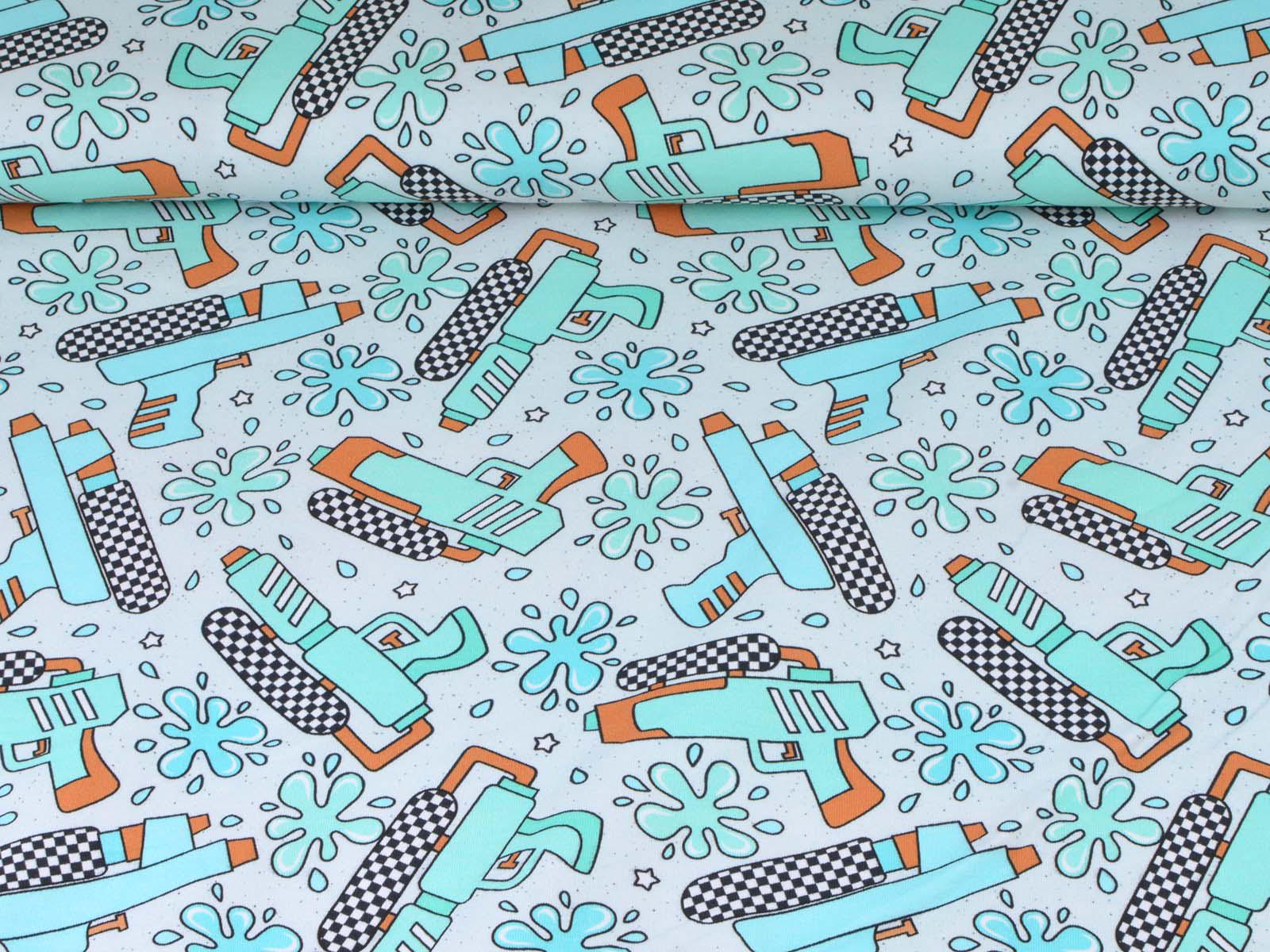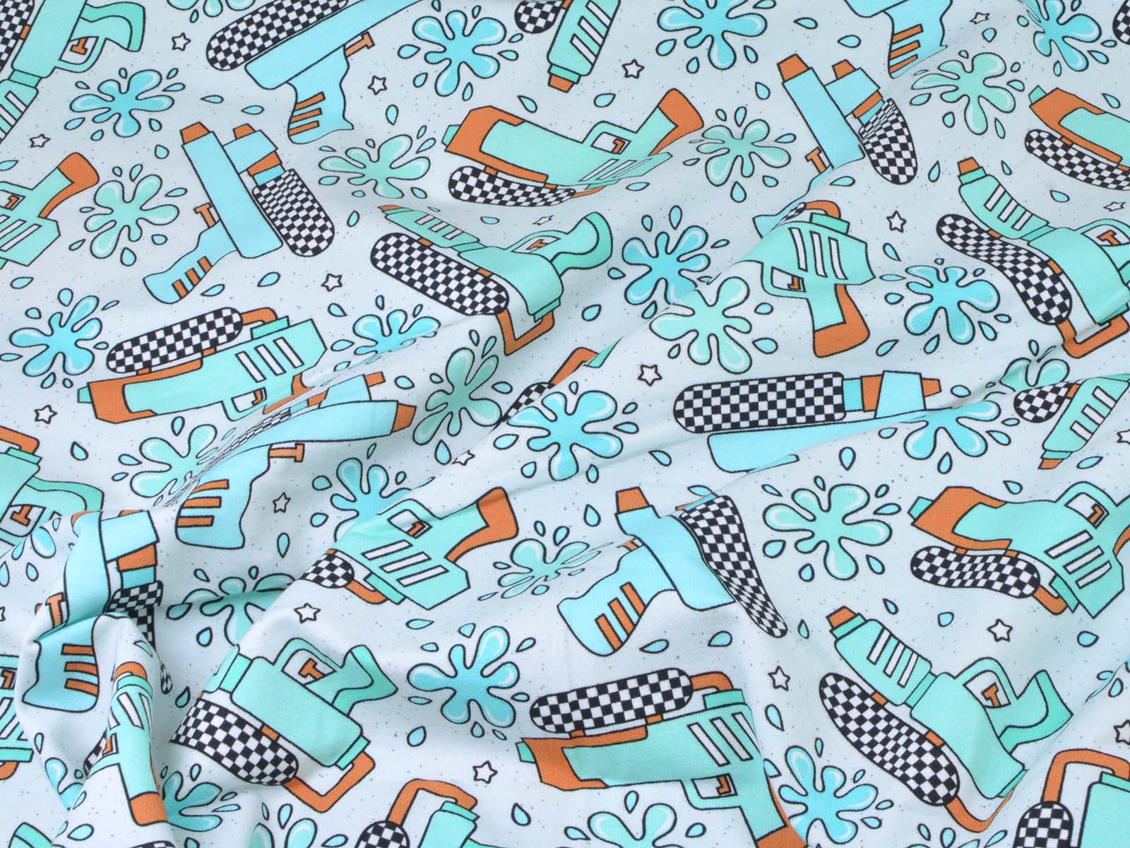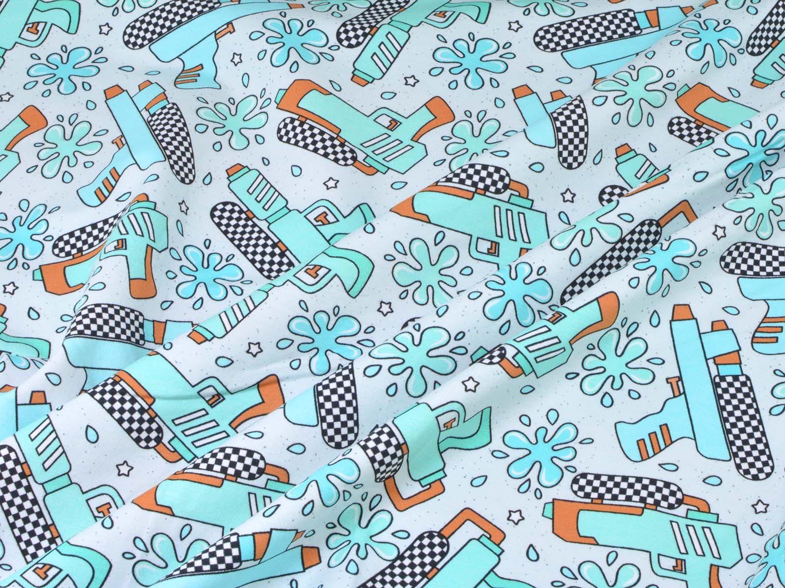 High-quality sweatshirt fabric from Hilco. The fabric is light blue with turquoise water pistols and splashes. Each water pistol is approximately 7 cm high and 10 cm wide. The sweatshirt fabric is smooth on one side and has soft loops on the other. It is suitable for sewing sweaters, comfortable pants, and much more.