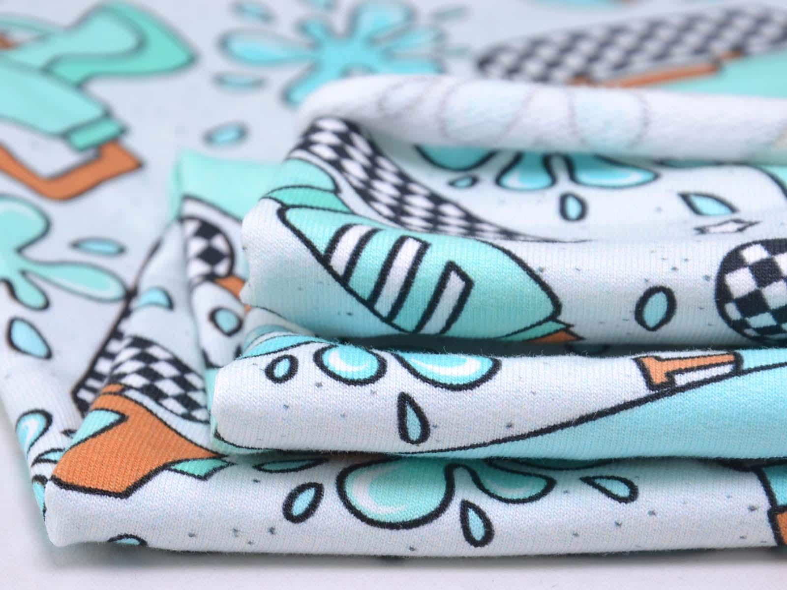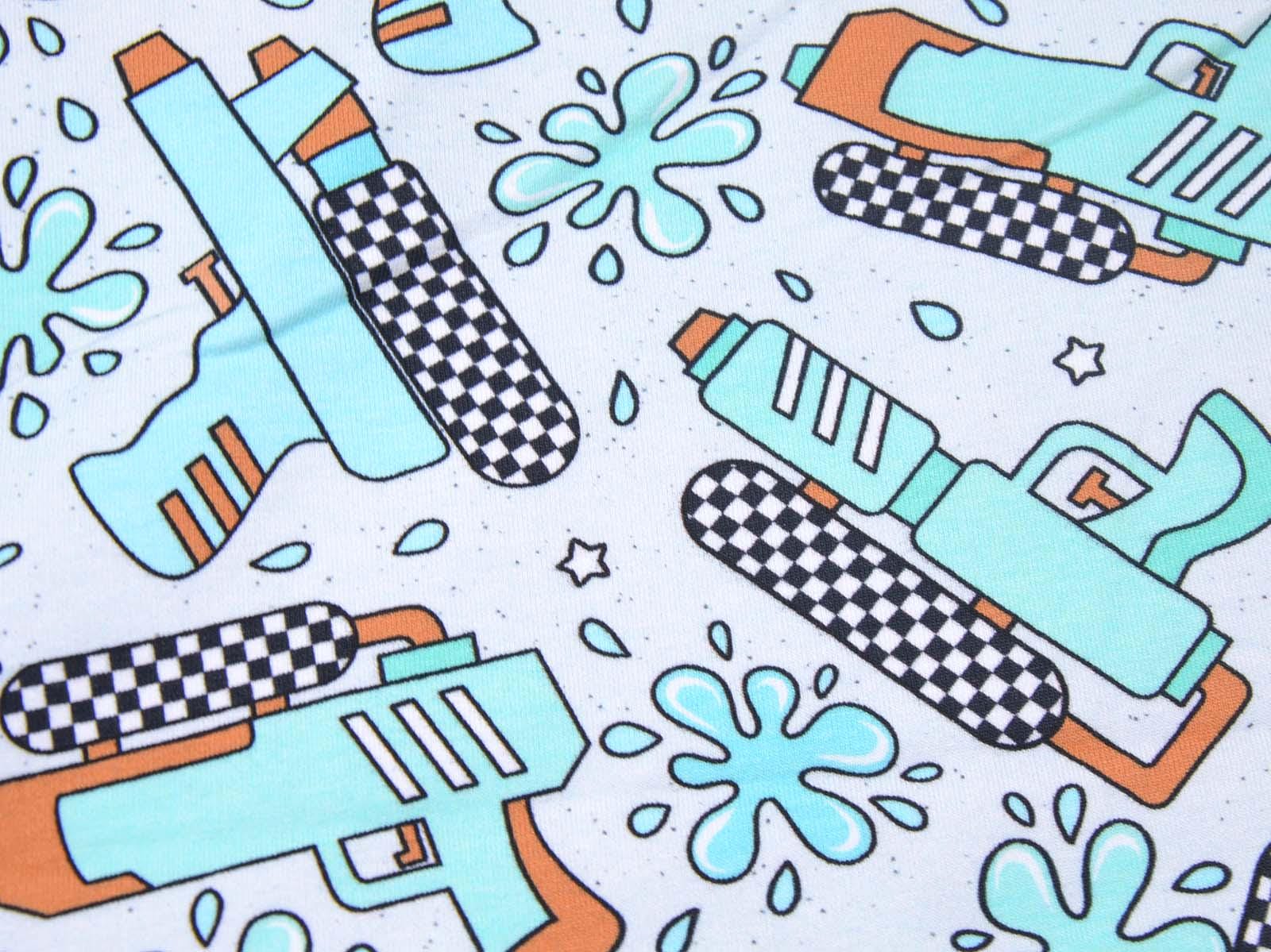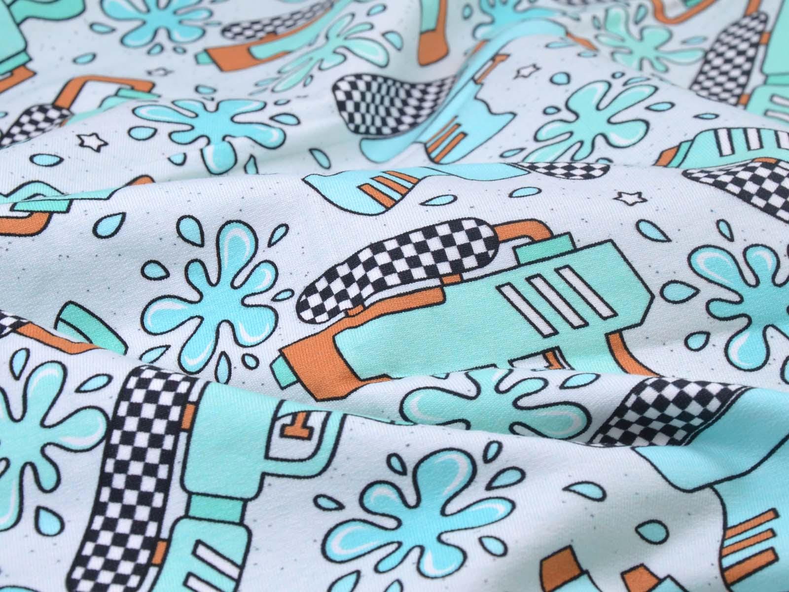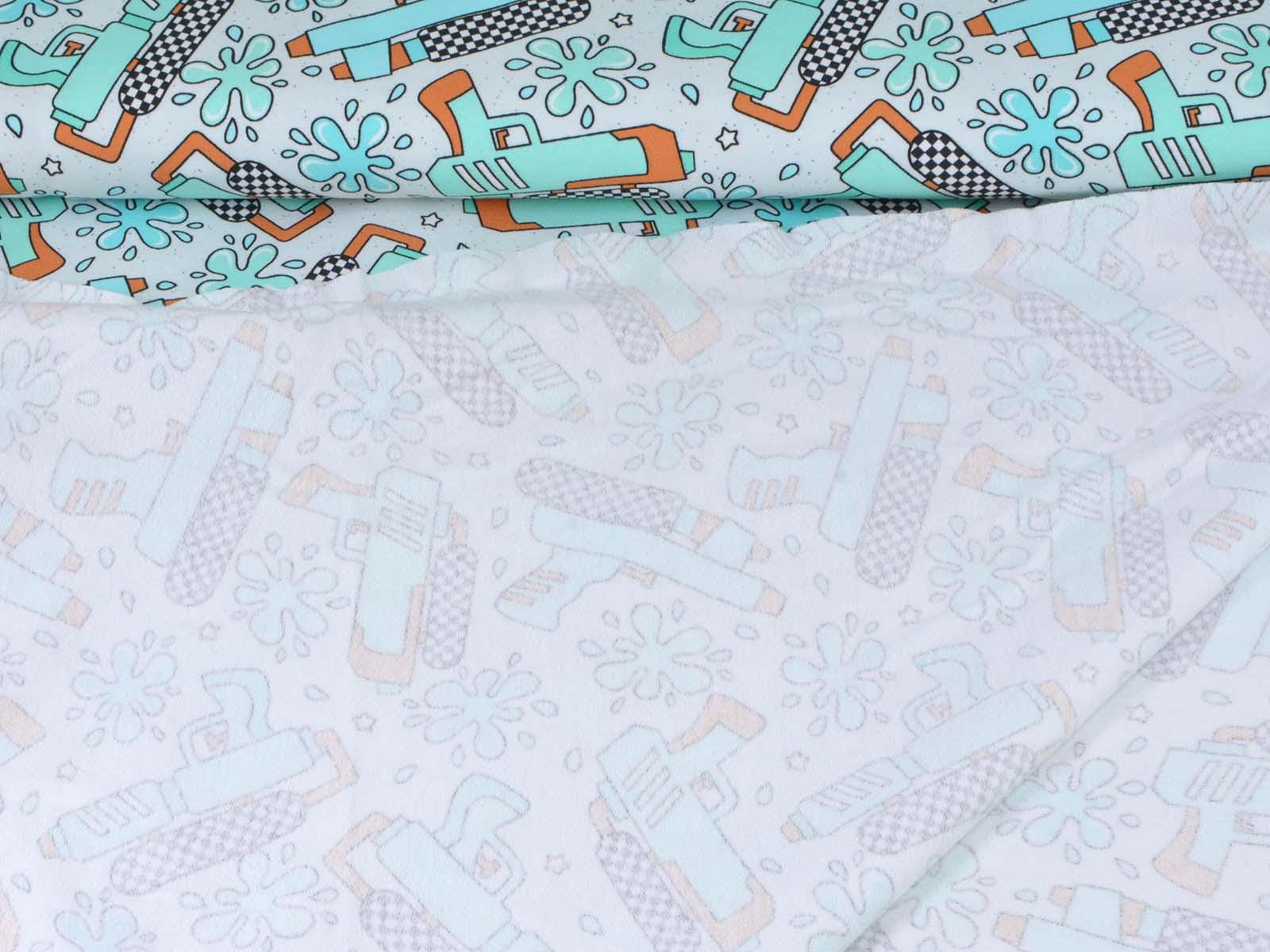 High-quality sweatshirt fabric from Hilco. The fabric is light blue with turquoise water pistols and splashes. Each water pistol is approximately 7 cm high and 10 cm wide. The sweatshirt fabric is smooth on one side and has soft loops on the other. It is suitable for sewing sweaters, comfortable pants, and much more.