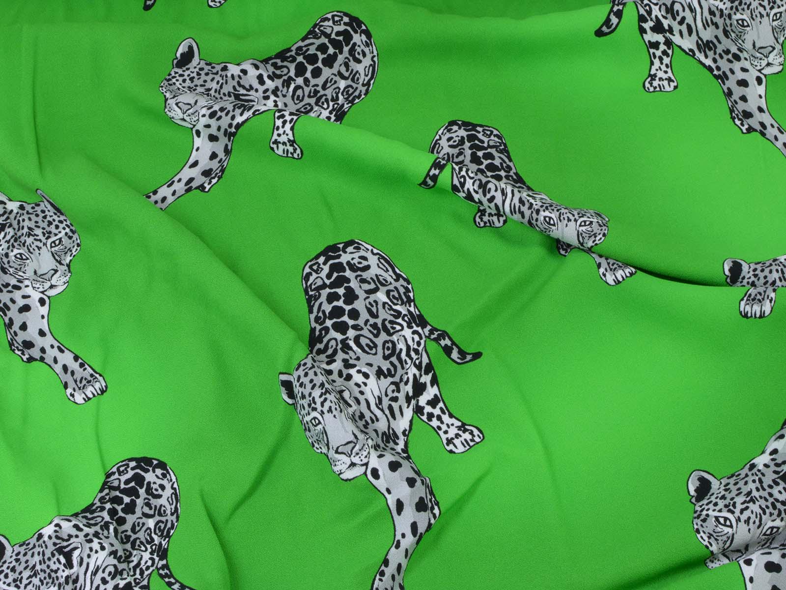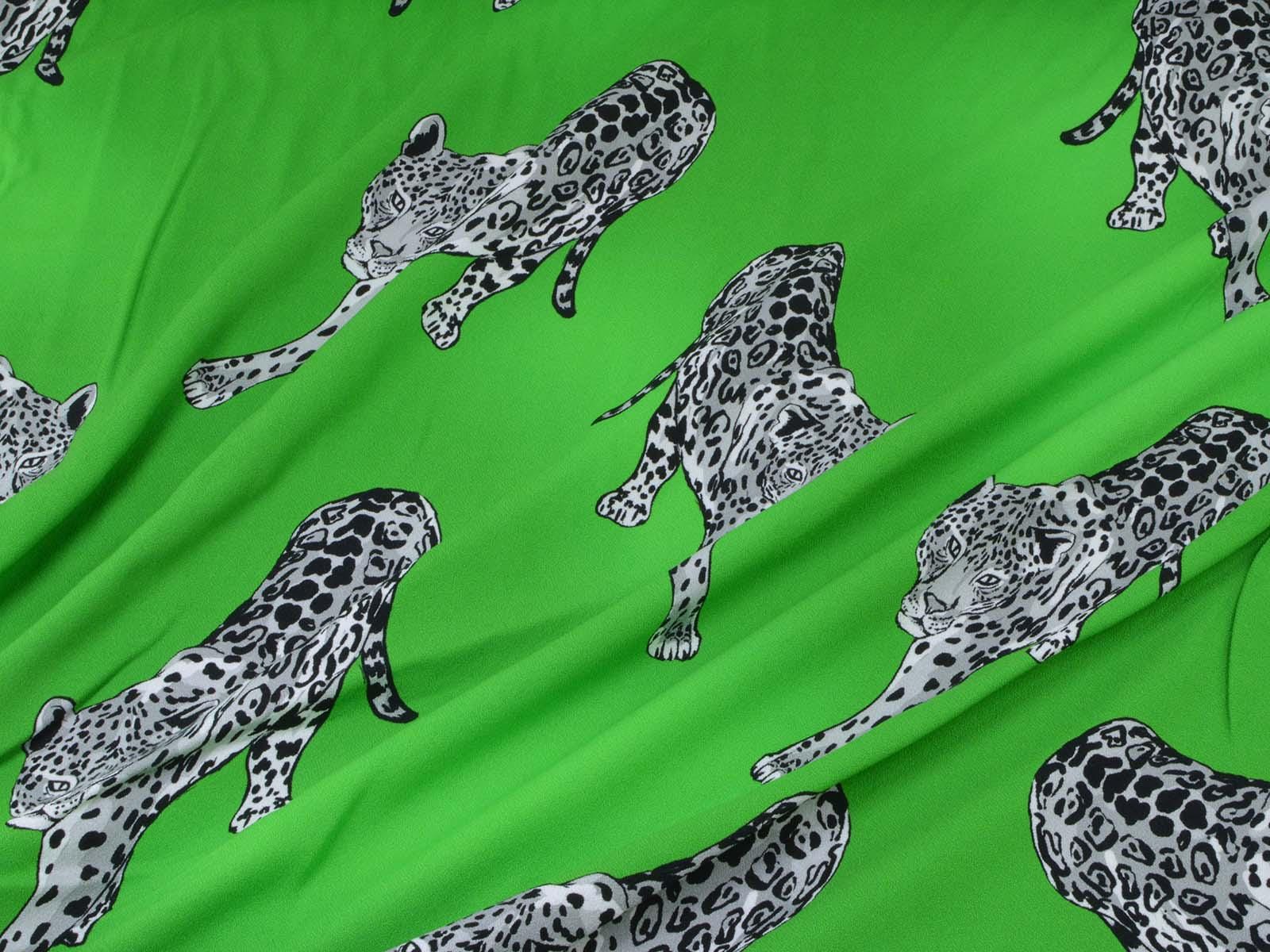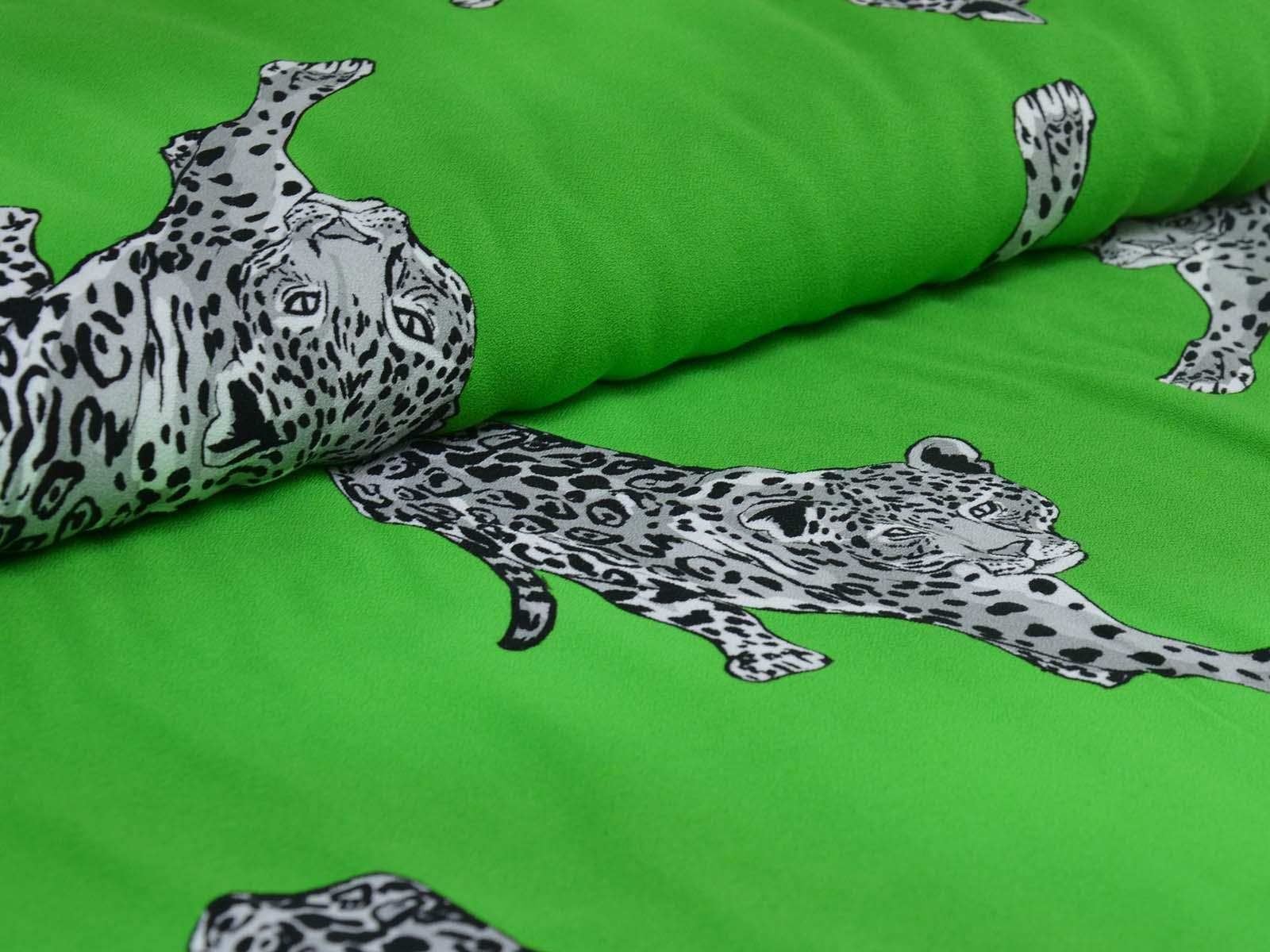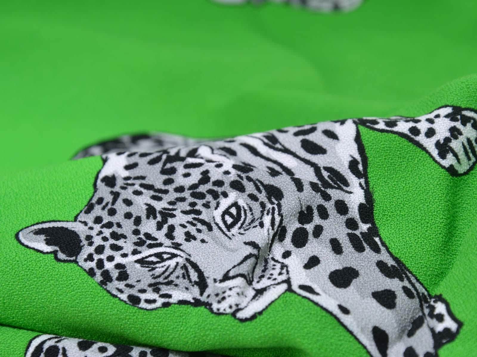 Woven viscose fabric from Hilco. The crepe fabric is thin, has a flowing drape, and is green with grey cheetah stripes. It is wonderfully suited for sewing shirt blouses, blouses, skirts, dresses, summer trousers, and much more.