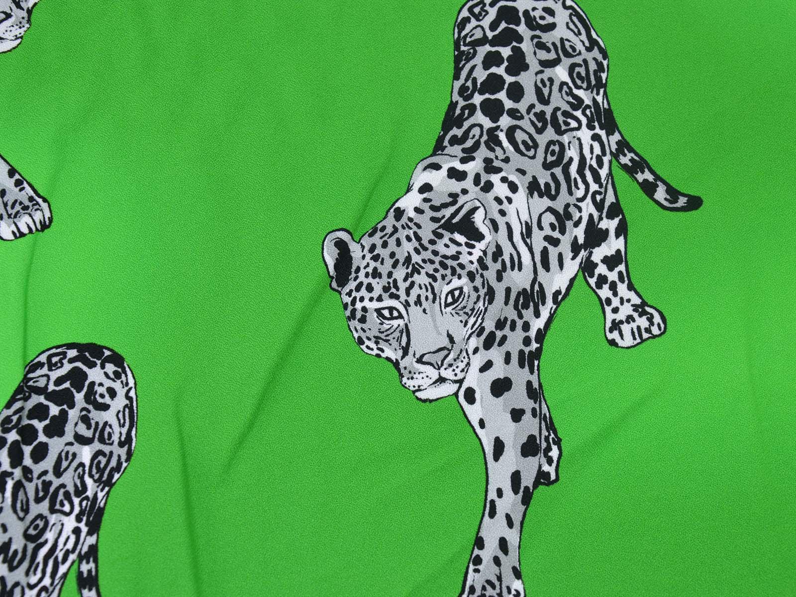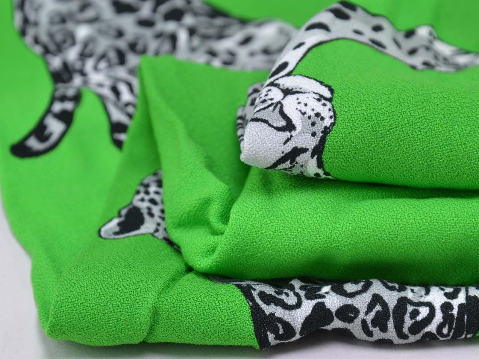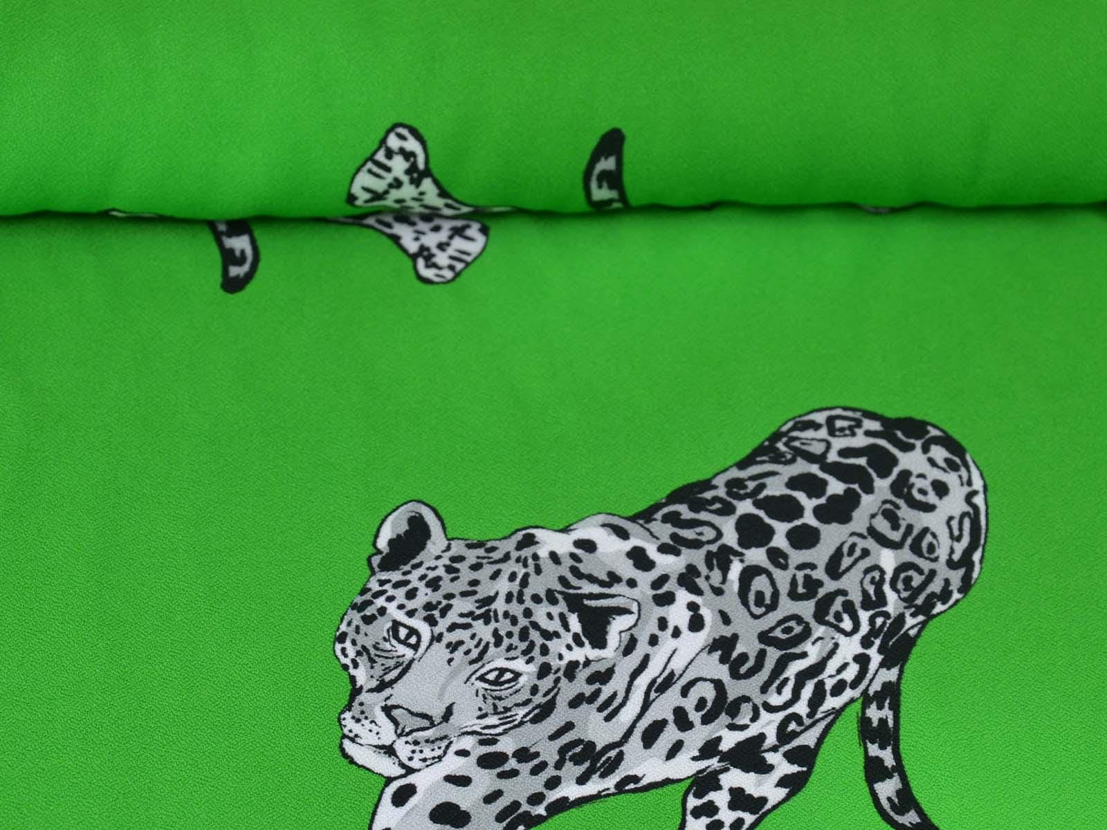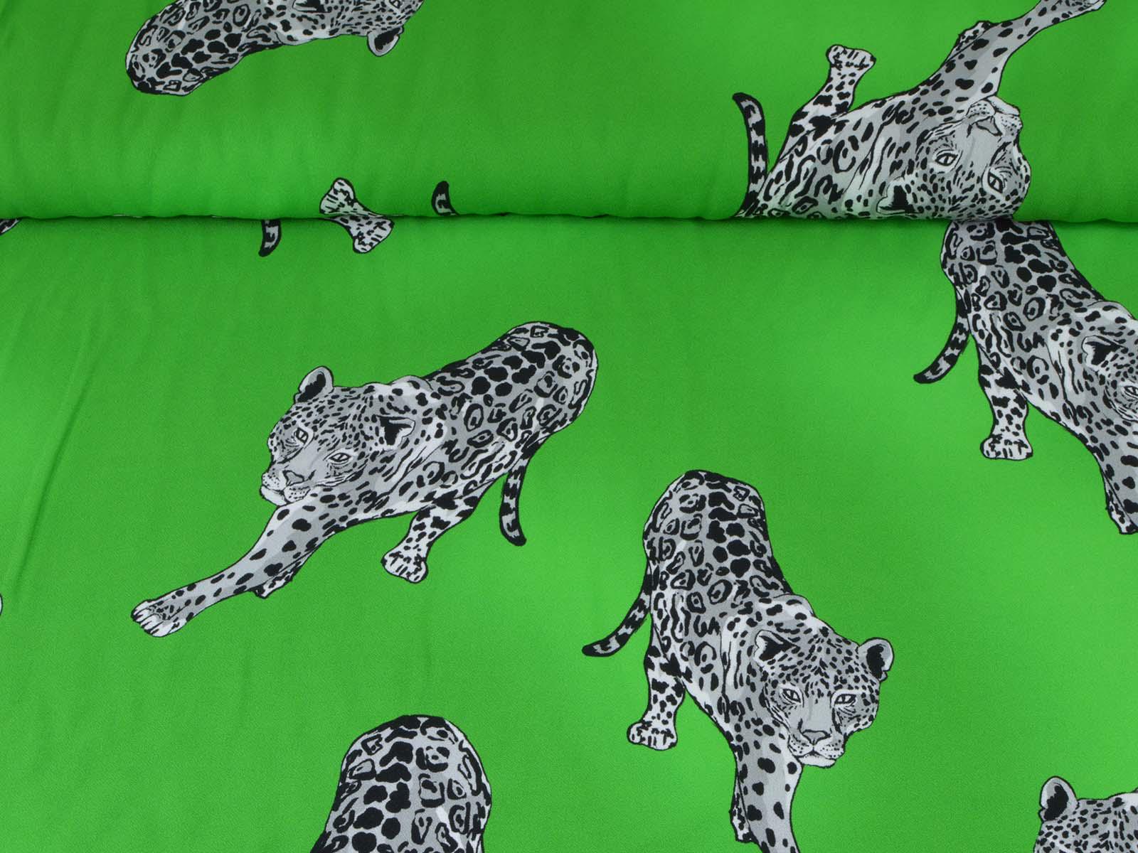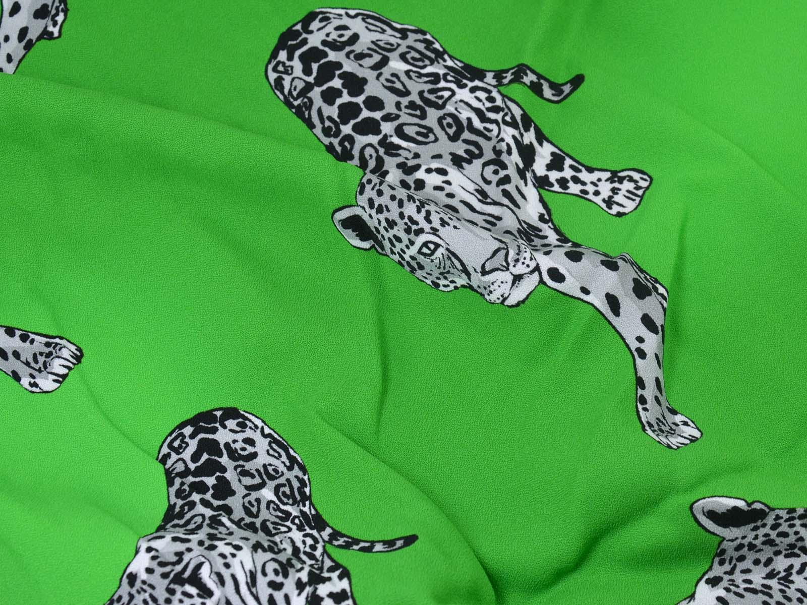 Woven viscose fabric from Hilco. The crepe fabric is thin, has a flowing drape, and is green with grey cheetah stripes. It is wonderfully suited for sewing shirt blouses, blouses, skirts, dresses, summer trousers, and much more.