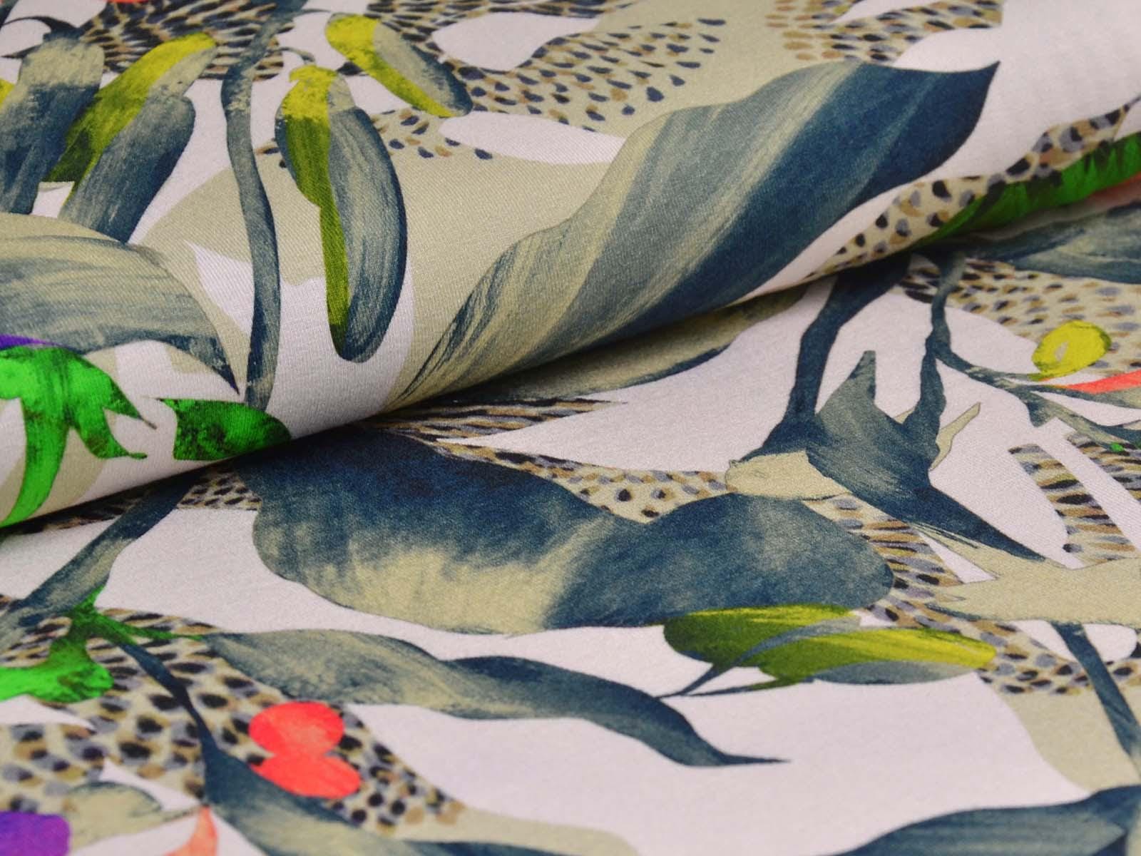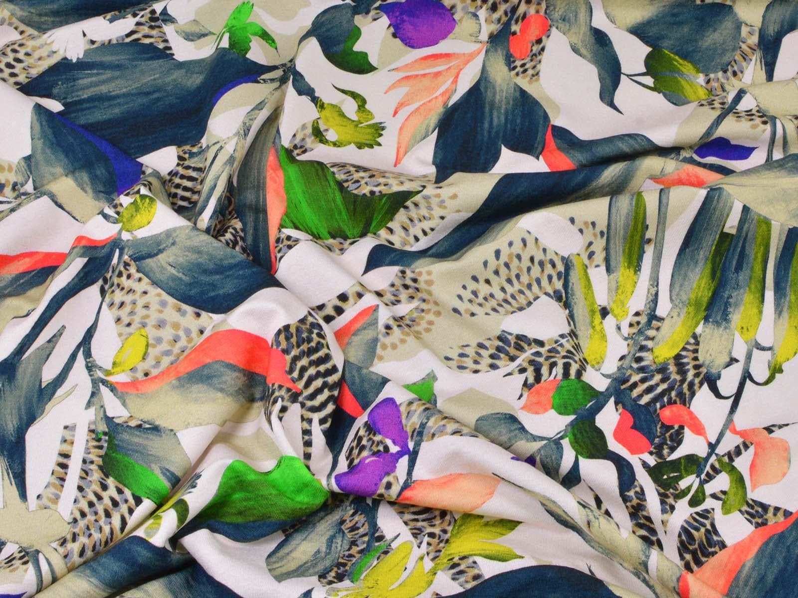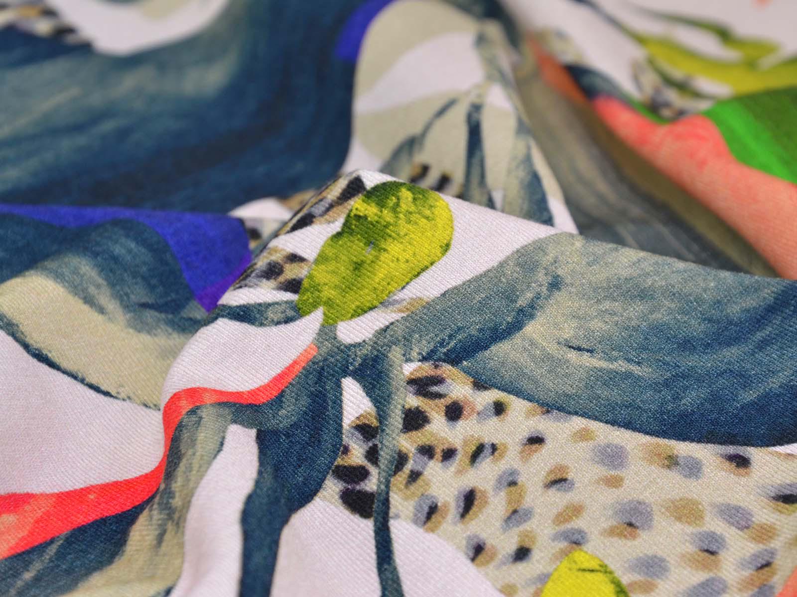 High-quality viscose jersey from Hilco. The jersey has a colorful pattern. It is perfect for sewing T-shirts, dresses, skirts, and much more. Viscose jersey is rather heavy, but has a beautiful, flowing drape.