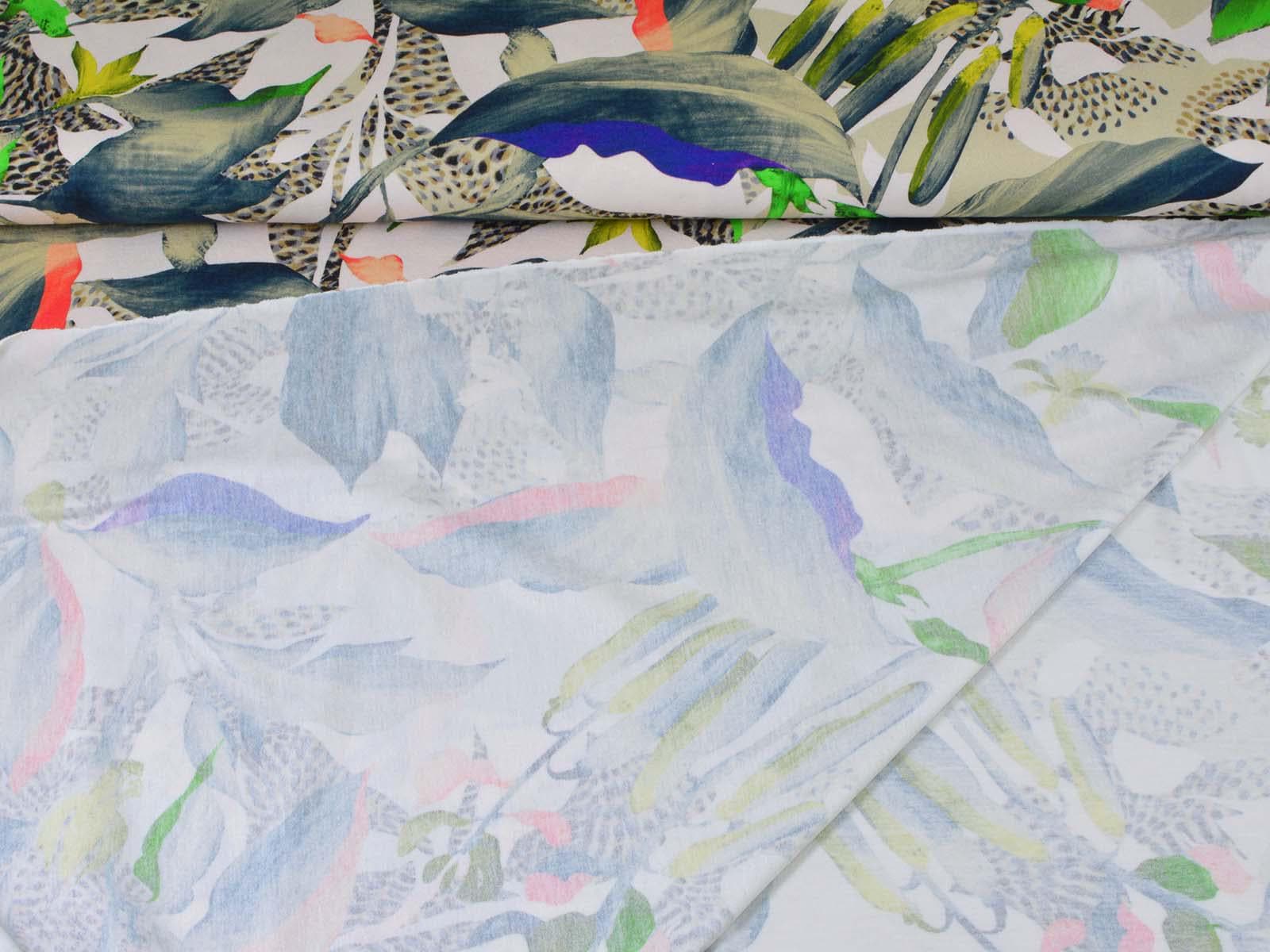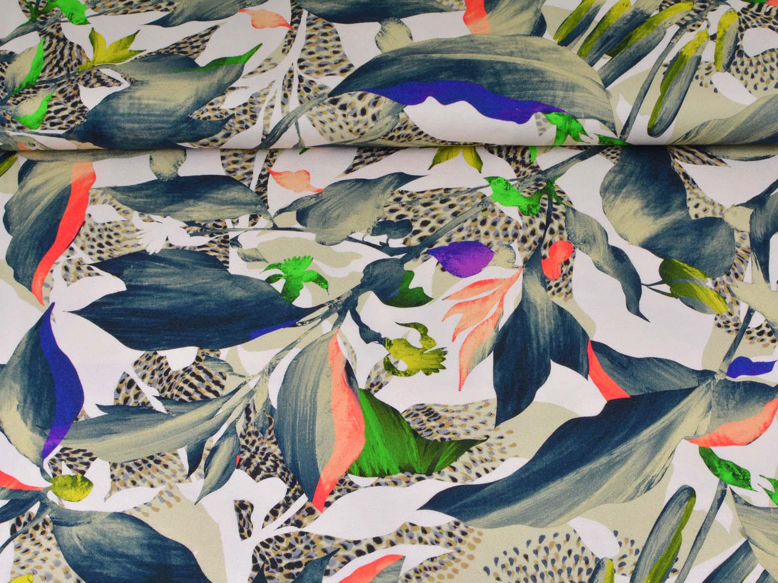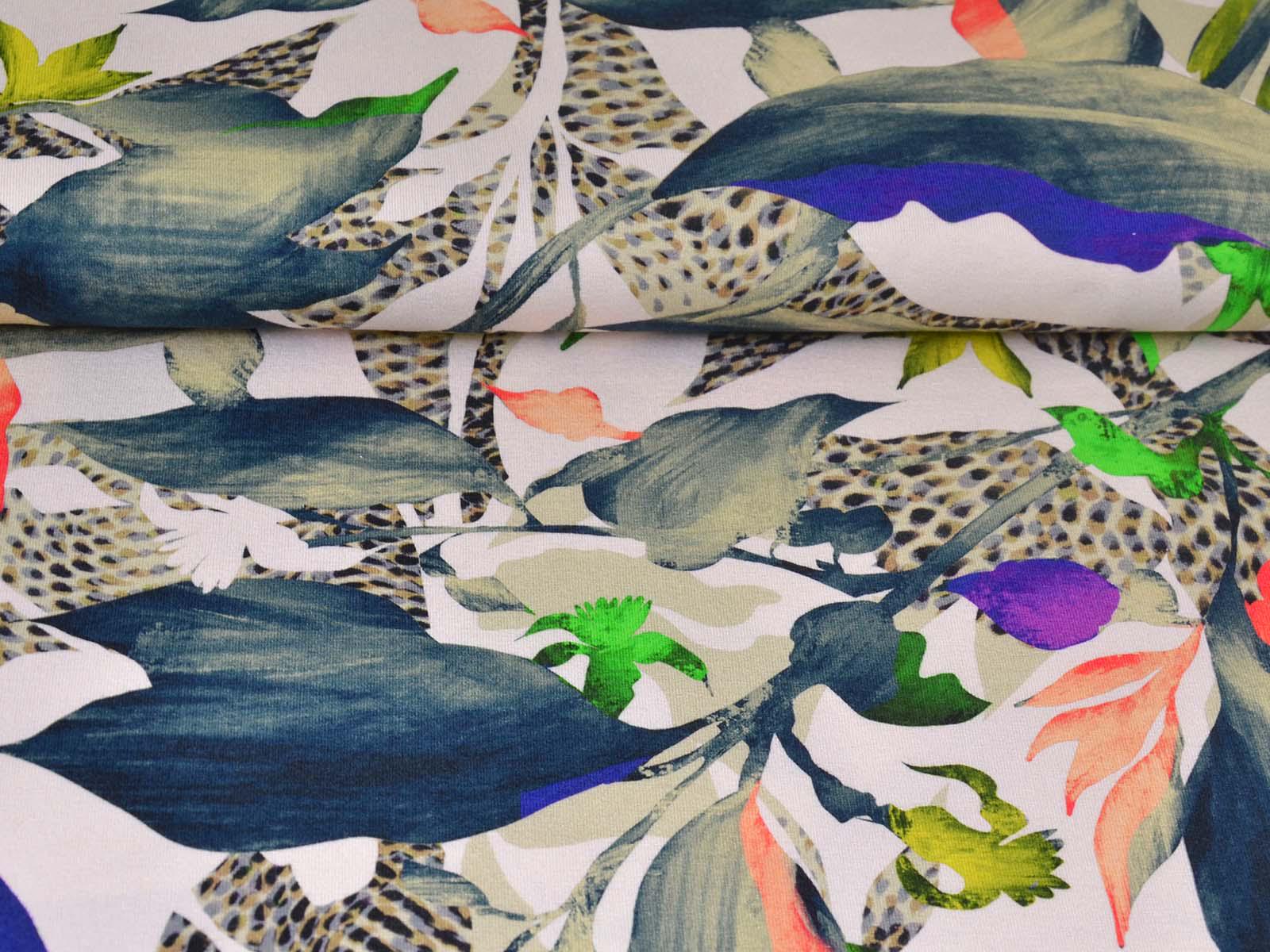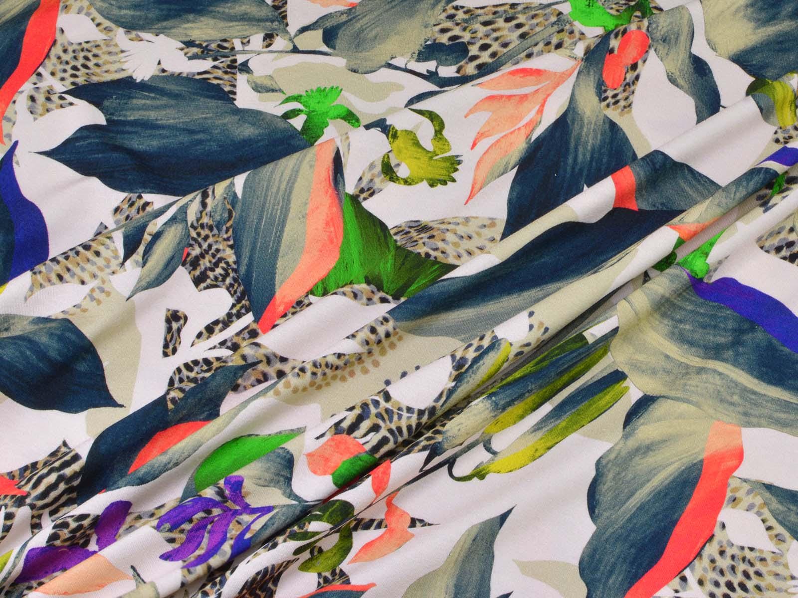 High-quality viscose jersey from Hilco. The jersey has a colorful pattern. It is perfect for sewing T-shirts, dresses, skirts, and much more. Viscose jersey is rather heavy, but has a beautiful, flowing drape.