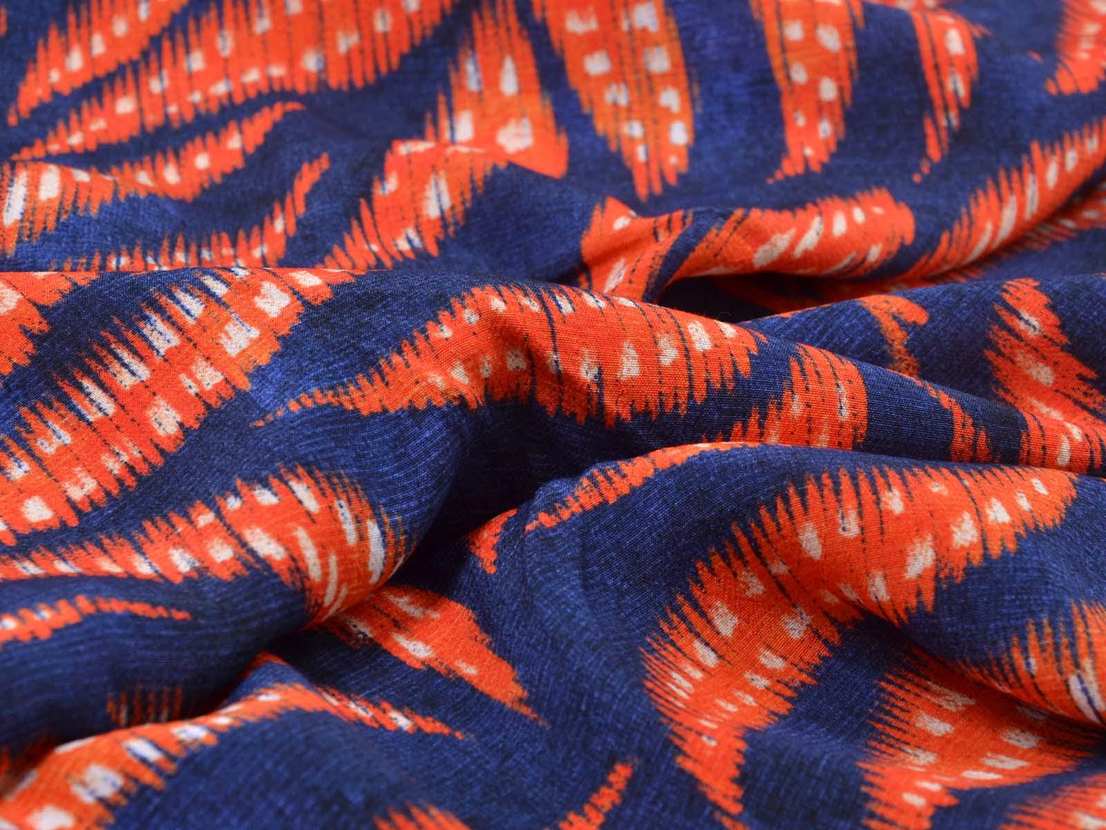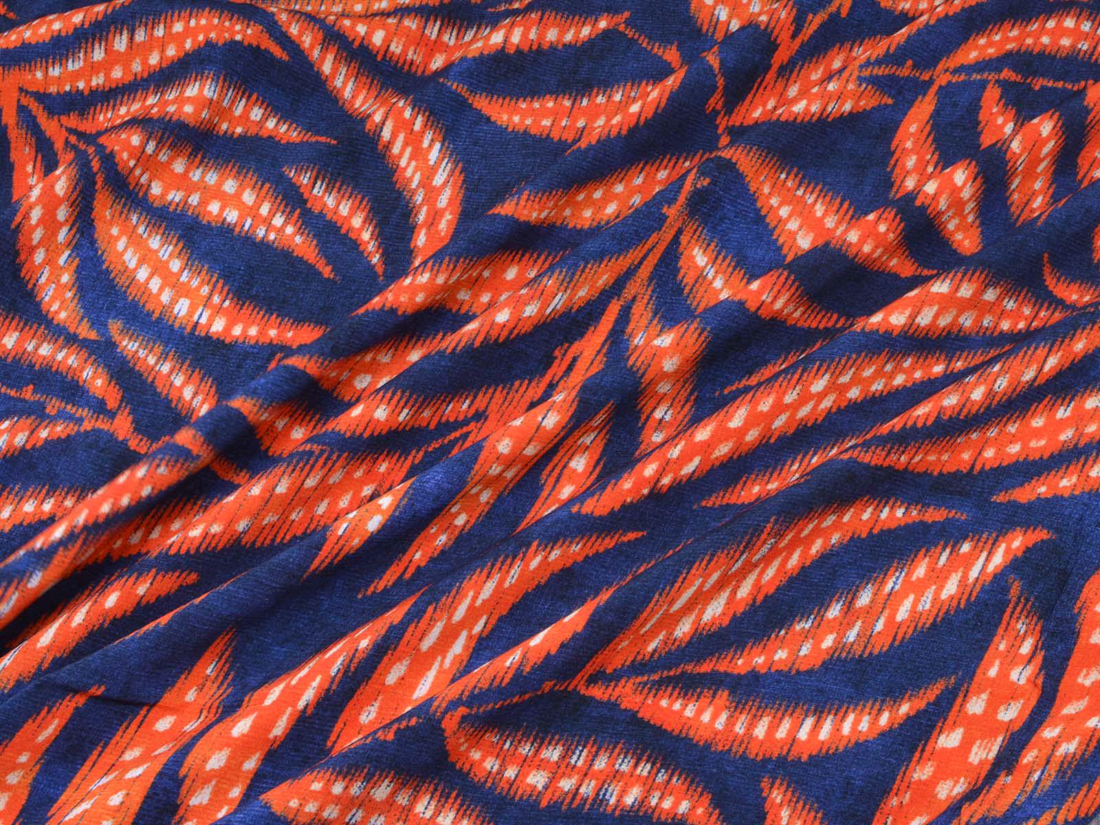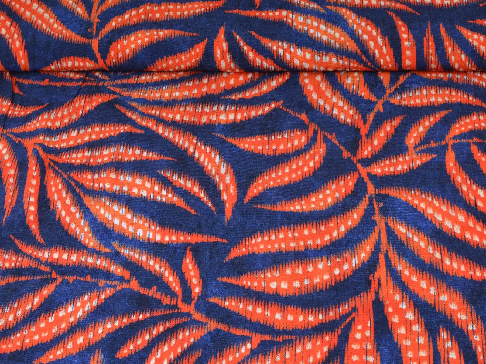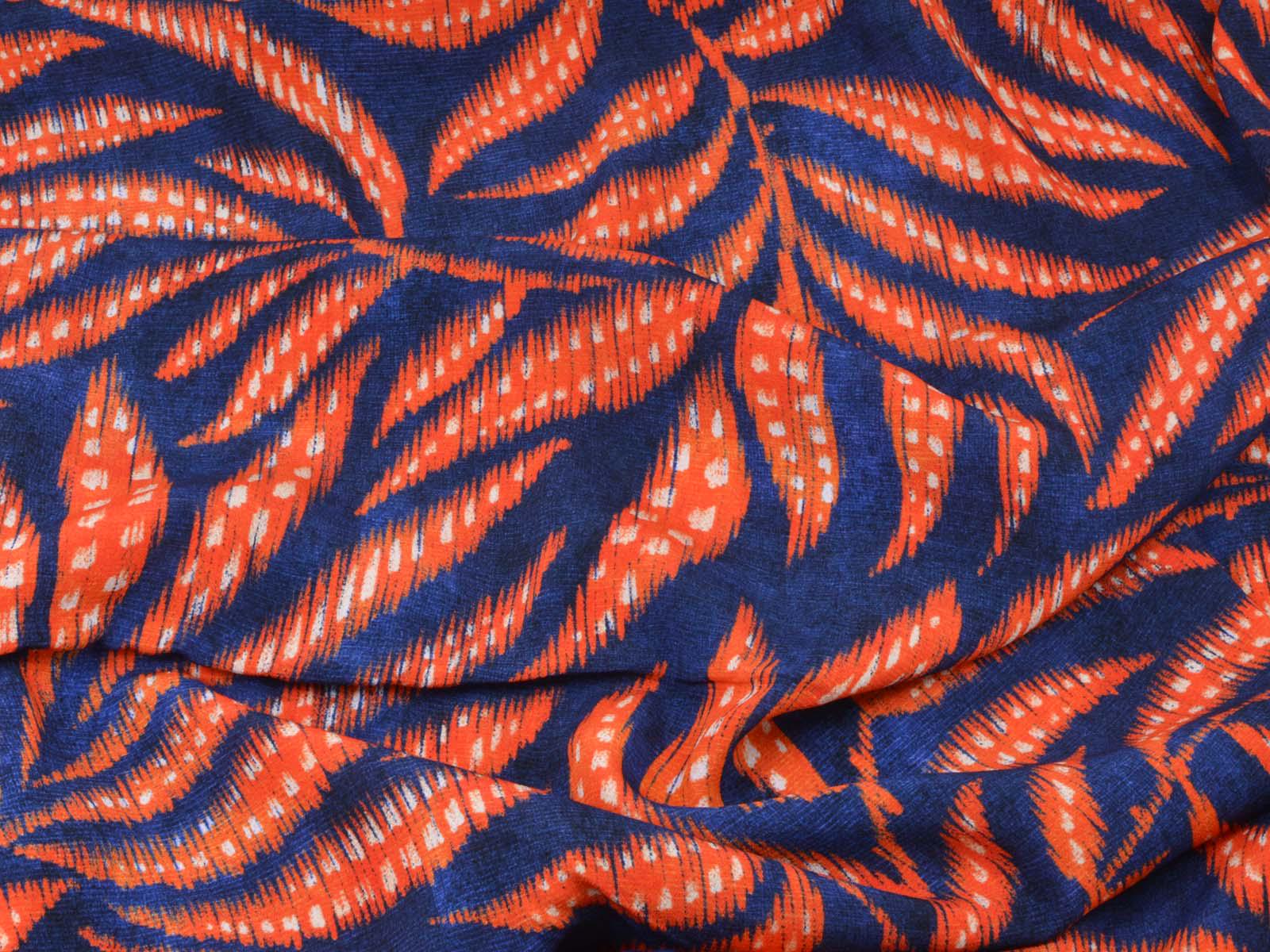 High-quality woven viscose fabric. The fabric is dark blue with large, orange leaves. The crepe fabric is thin, lightweight, and drapes beautifully. Sew yourself wonderful summer dresses, trousers, skirts, blouses, and much more.