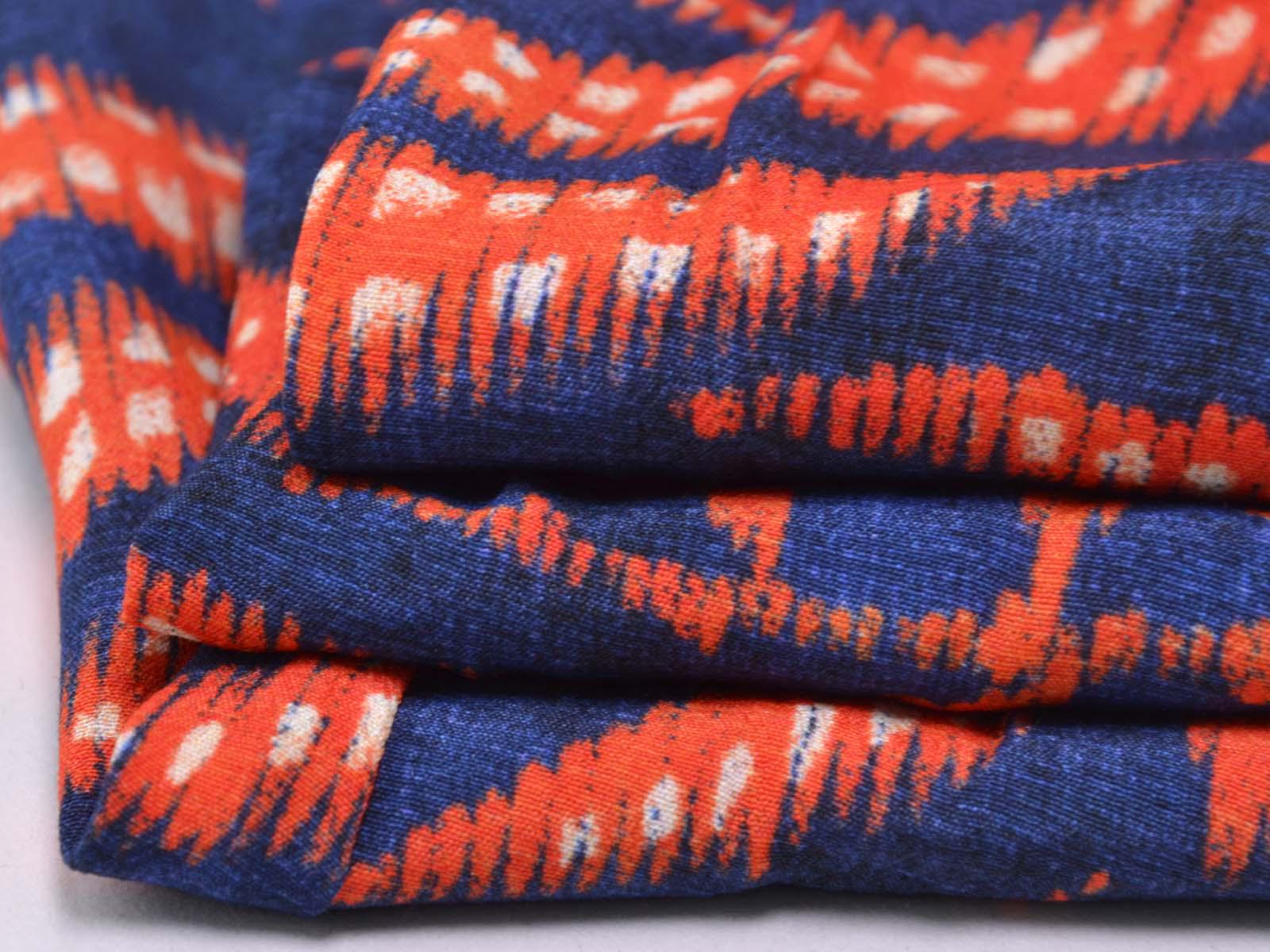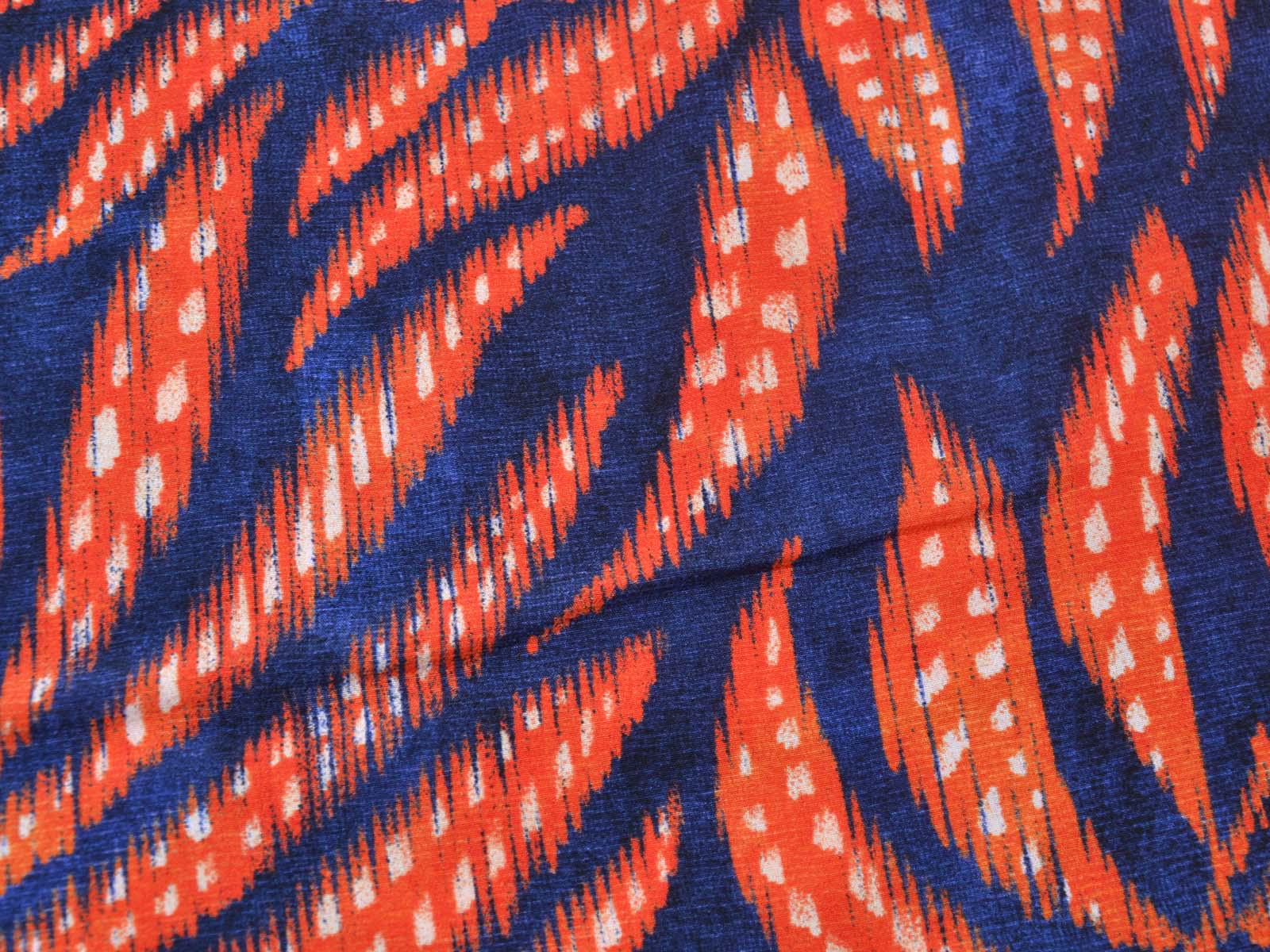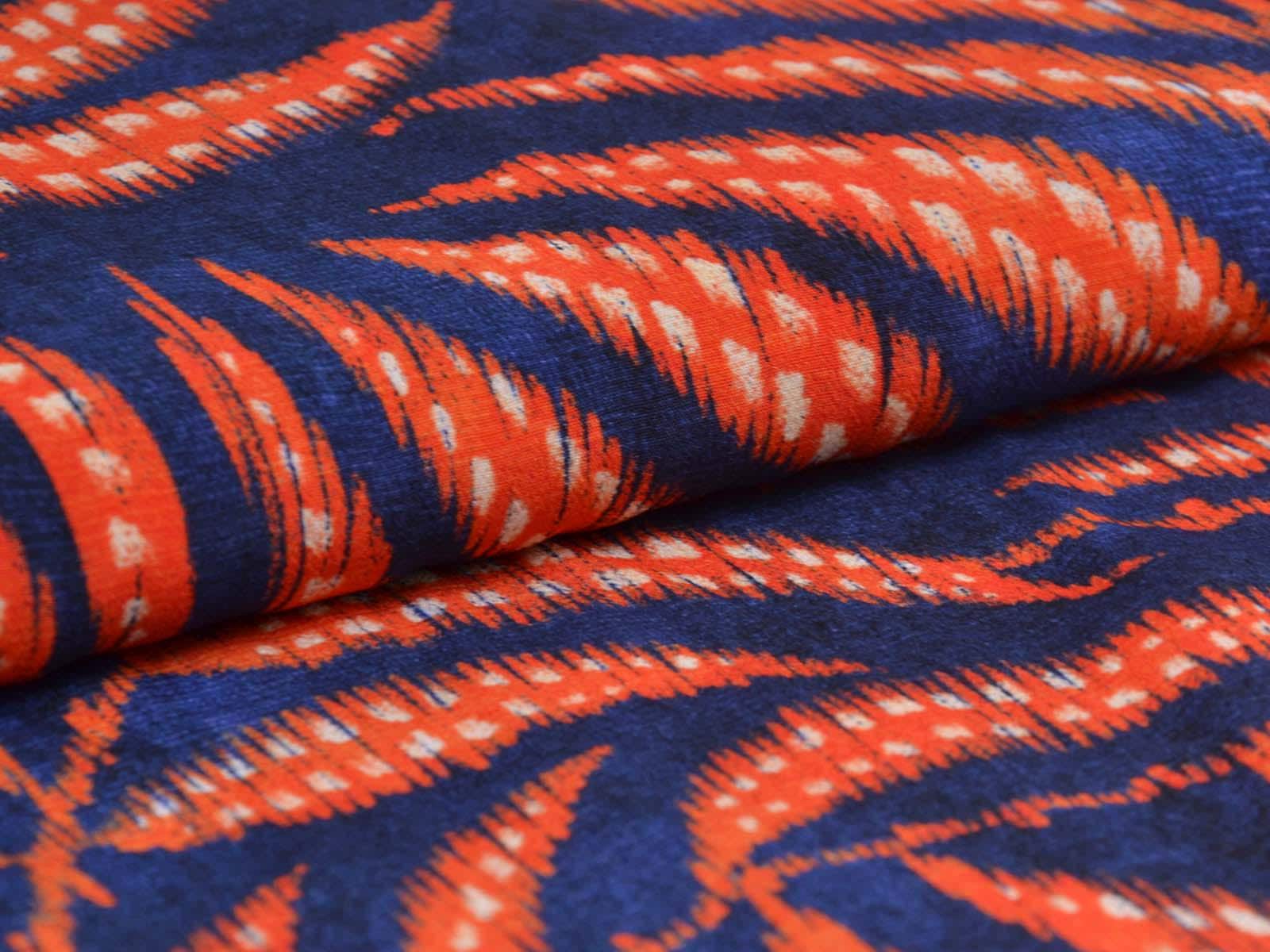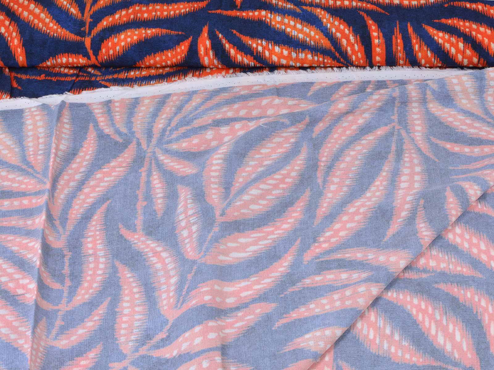 High-quality woven viscose fabric. The fabric is dark blue with large, orange leaves. The crepe fabric is thin, lightweight, and drapes beautifully. Sew yourself wonderful summer dresses, trousers, skirts, blouses, and much more.