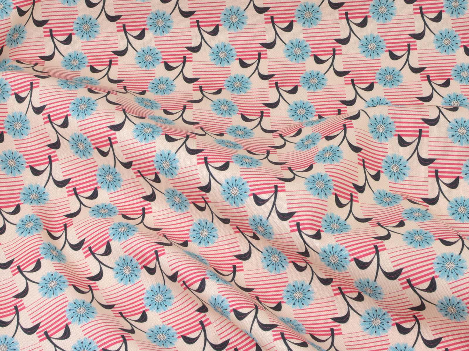 Sturdy woven cotton fabric. The printed fabric is cream-white with blue flowers and pink stripes. Each flower is approximately 4 cm high. The fabric is smooth and firm, making it ideal for sewing cushions, bags, accessories, and much more.