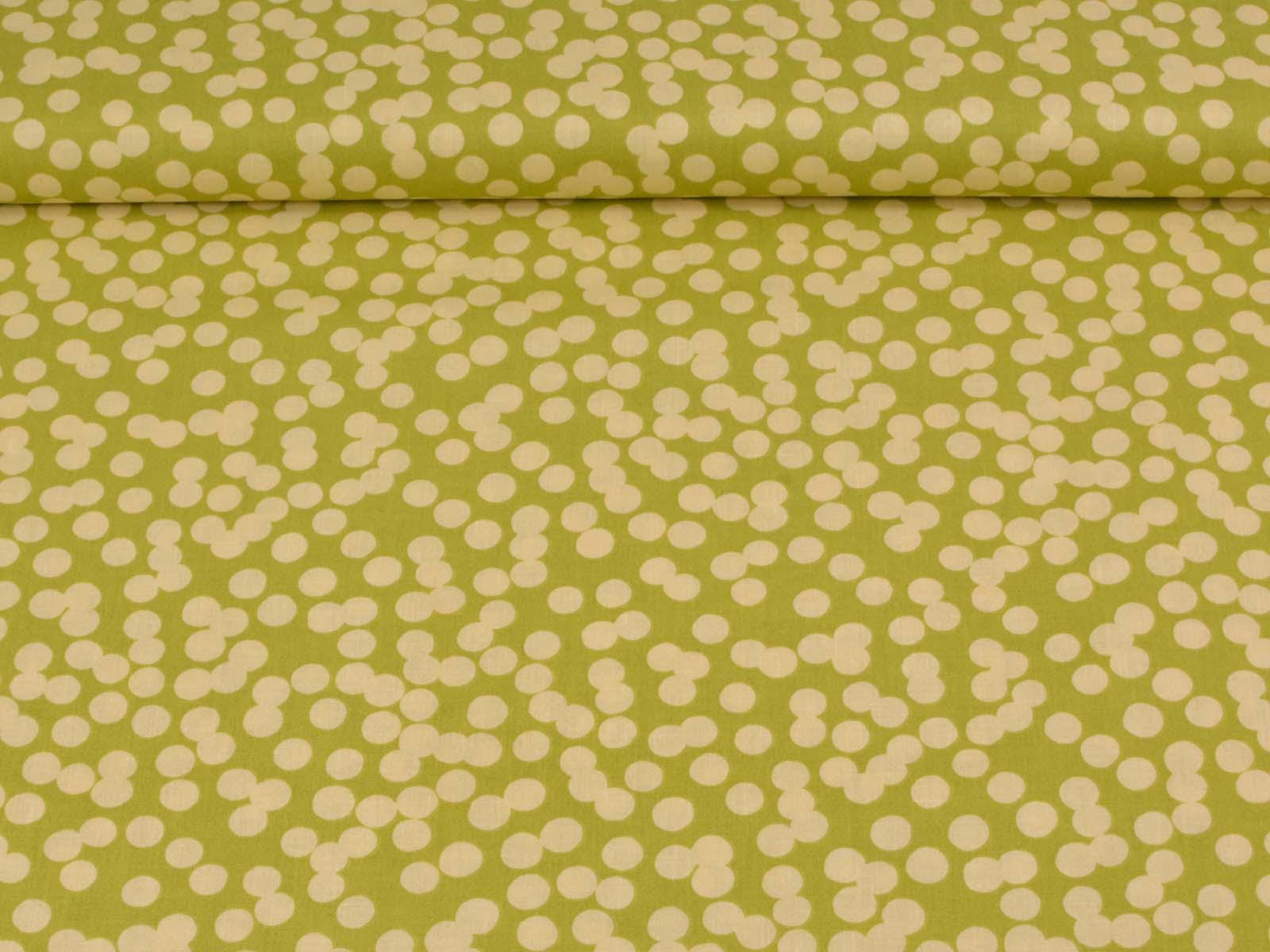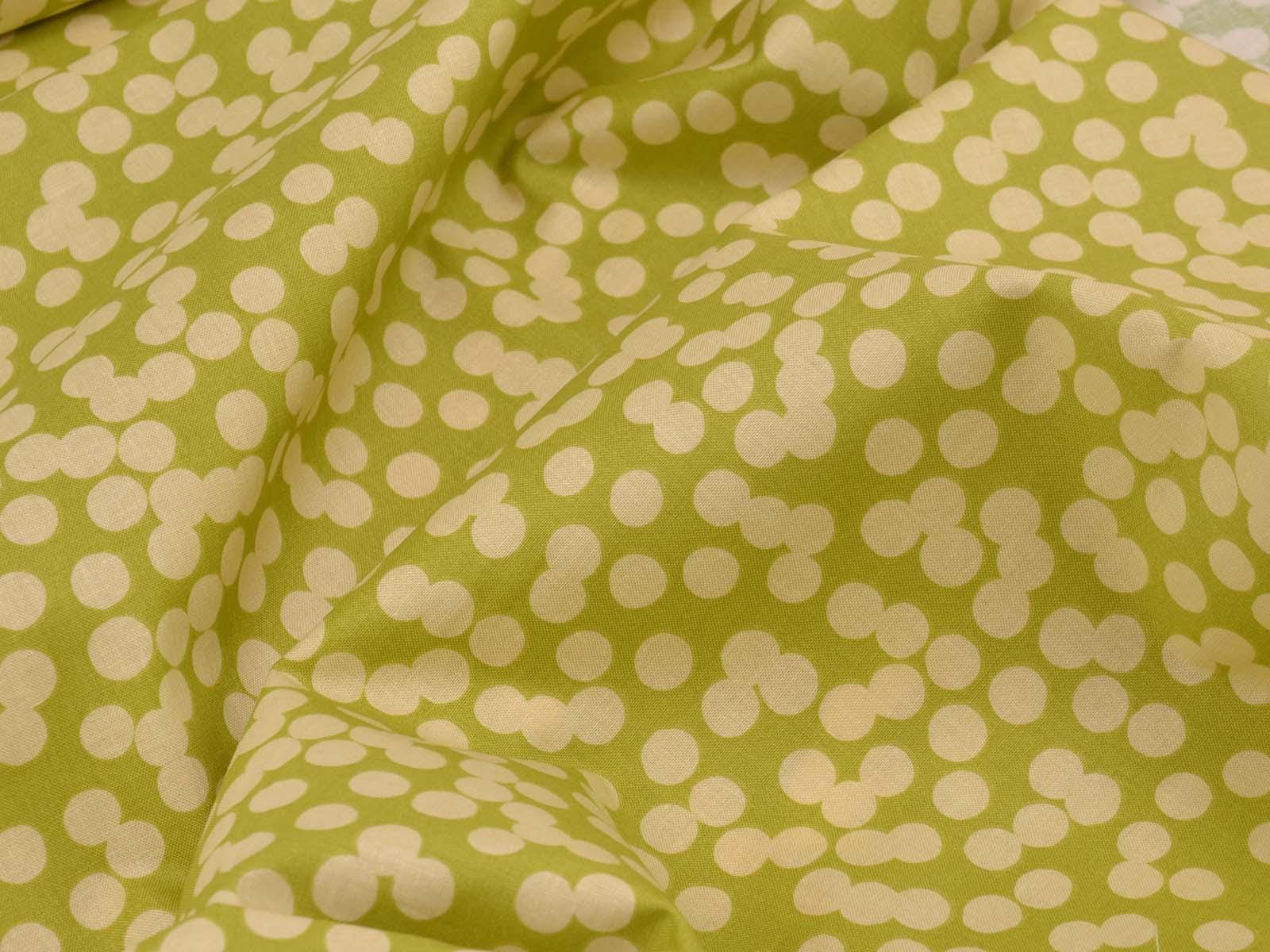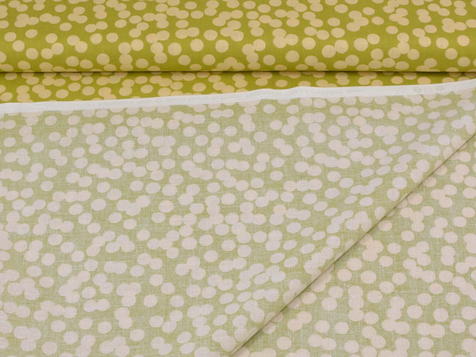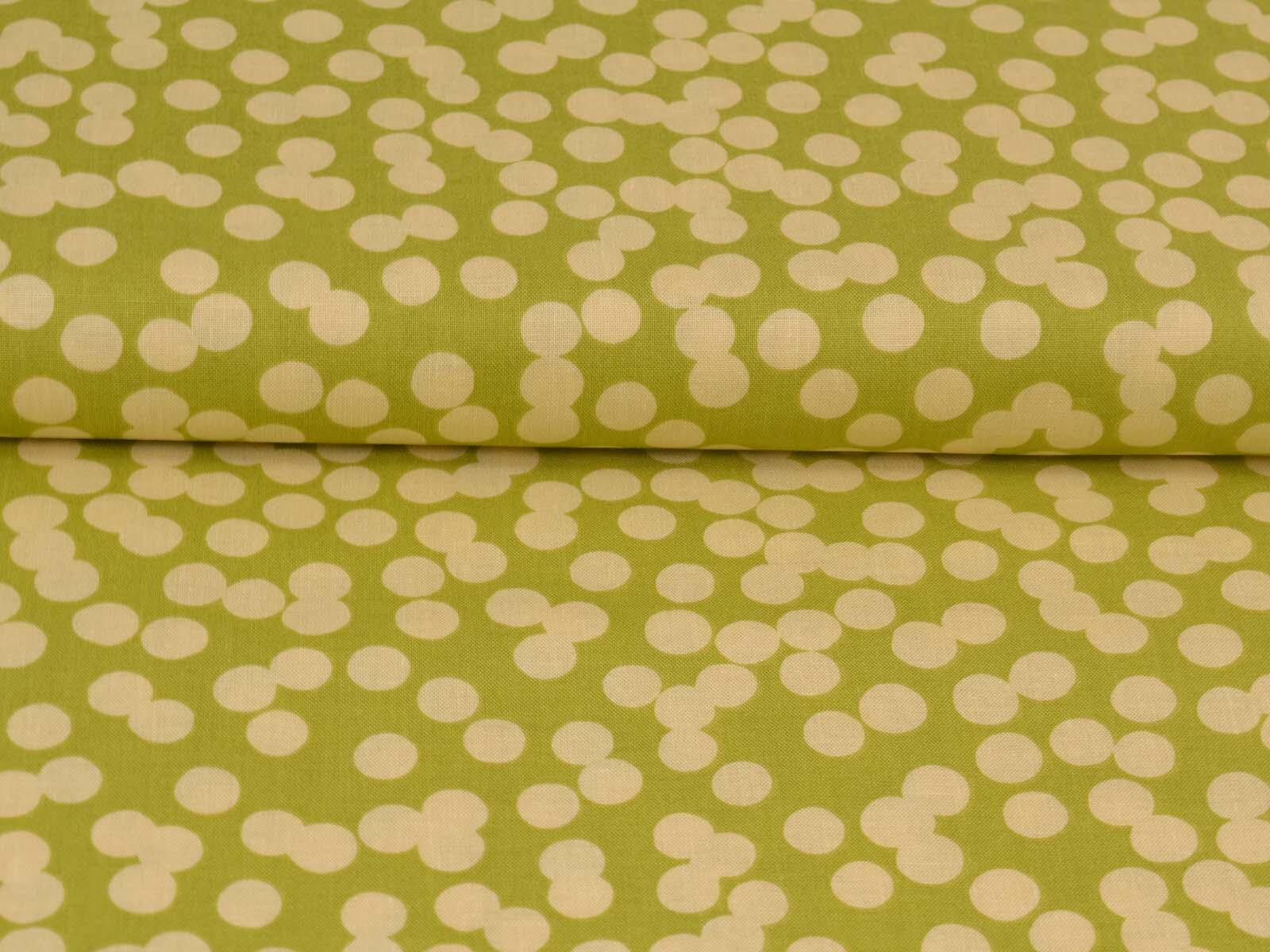 Patchwork fabric made of cotton. The fabric is thin, smooth, and matte. It is green with beige dots. The woven fabric is perfect for sewing pillows, accessories, bags, bag linings, and much more.