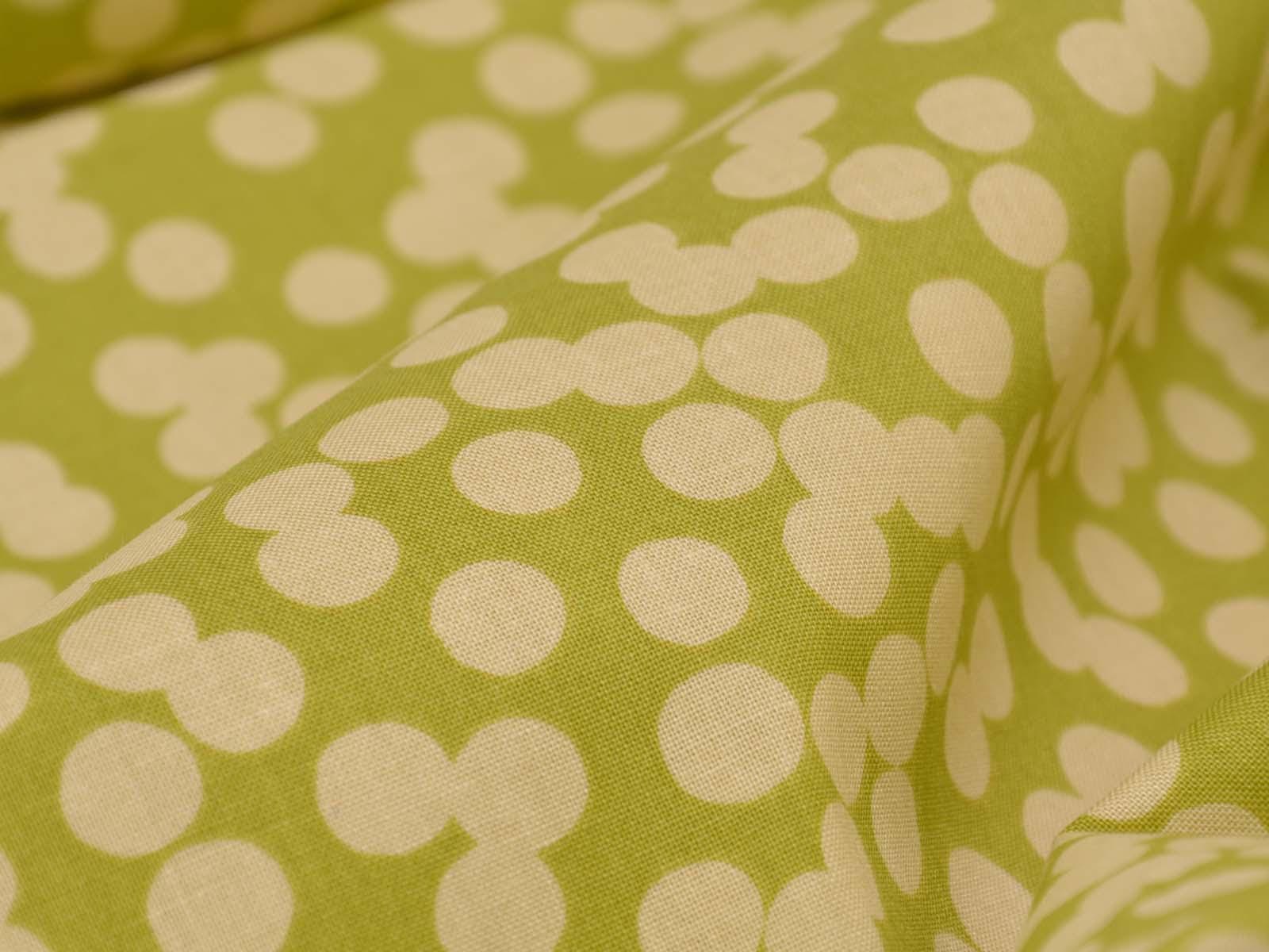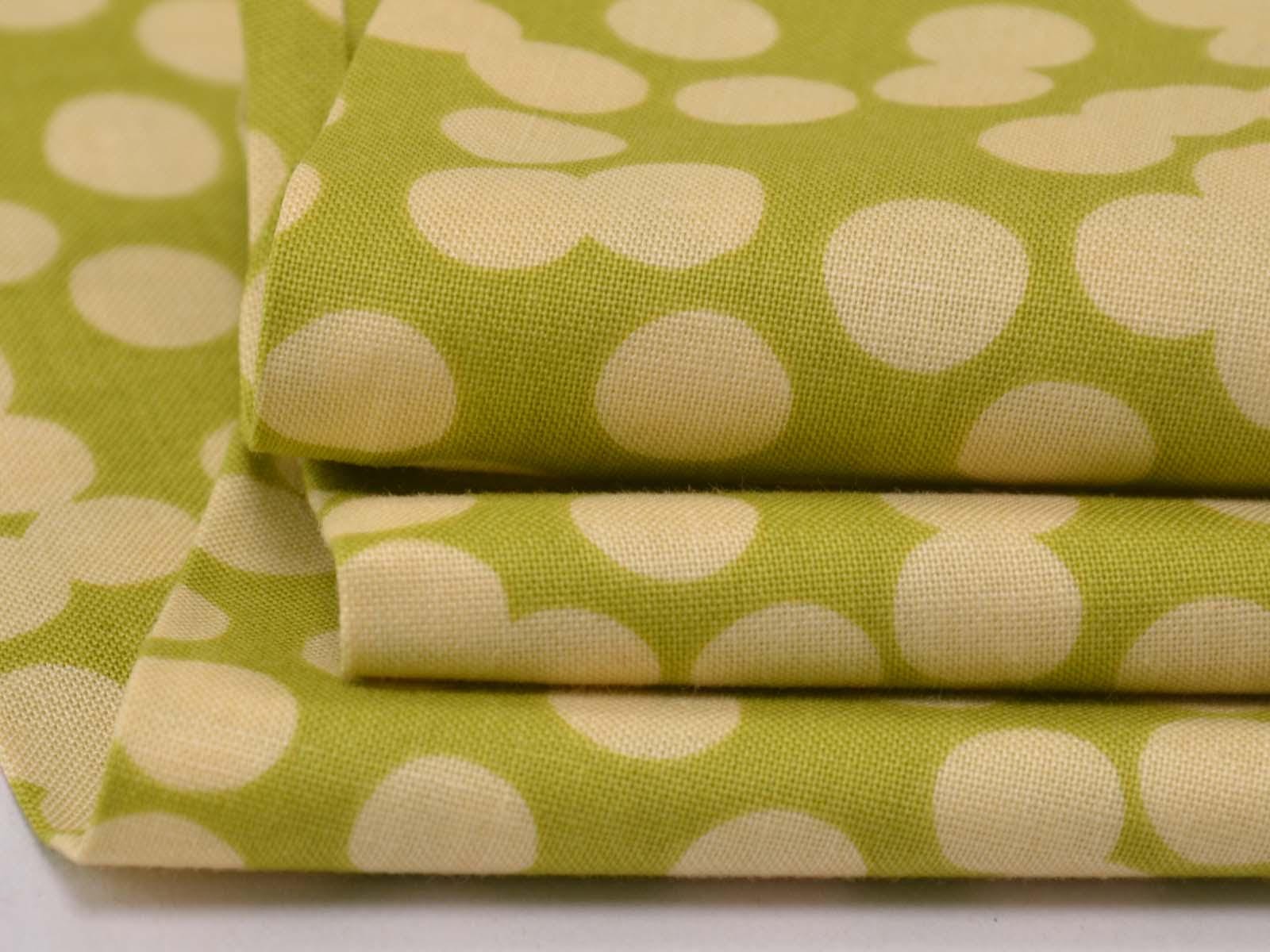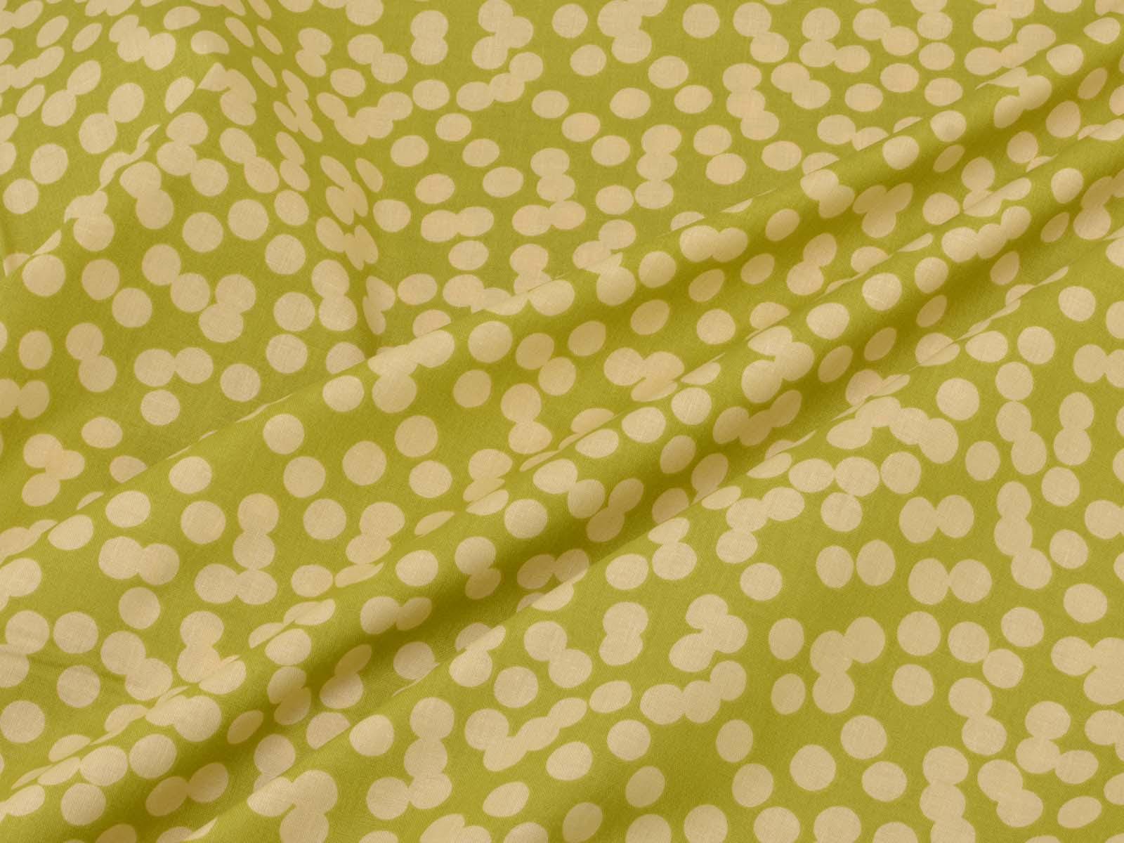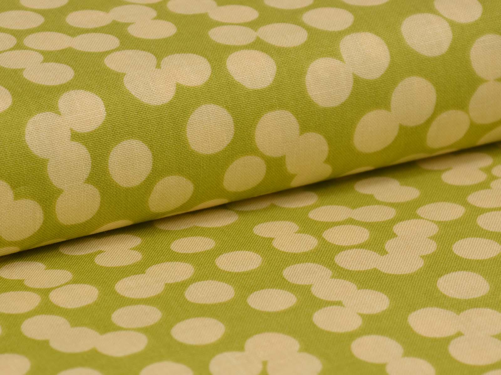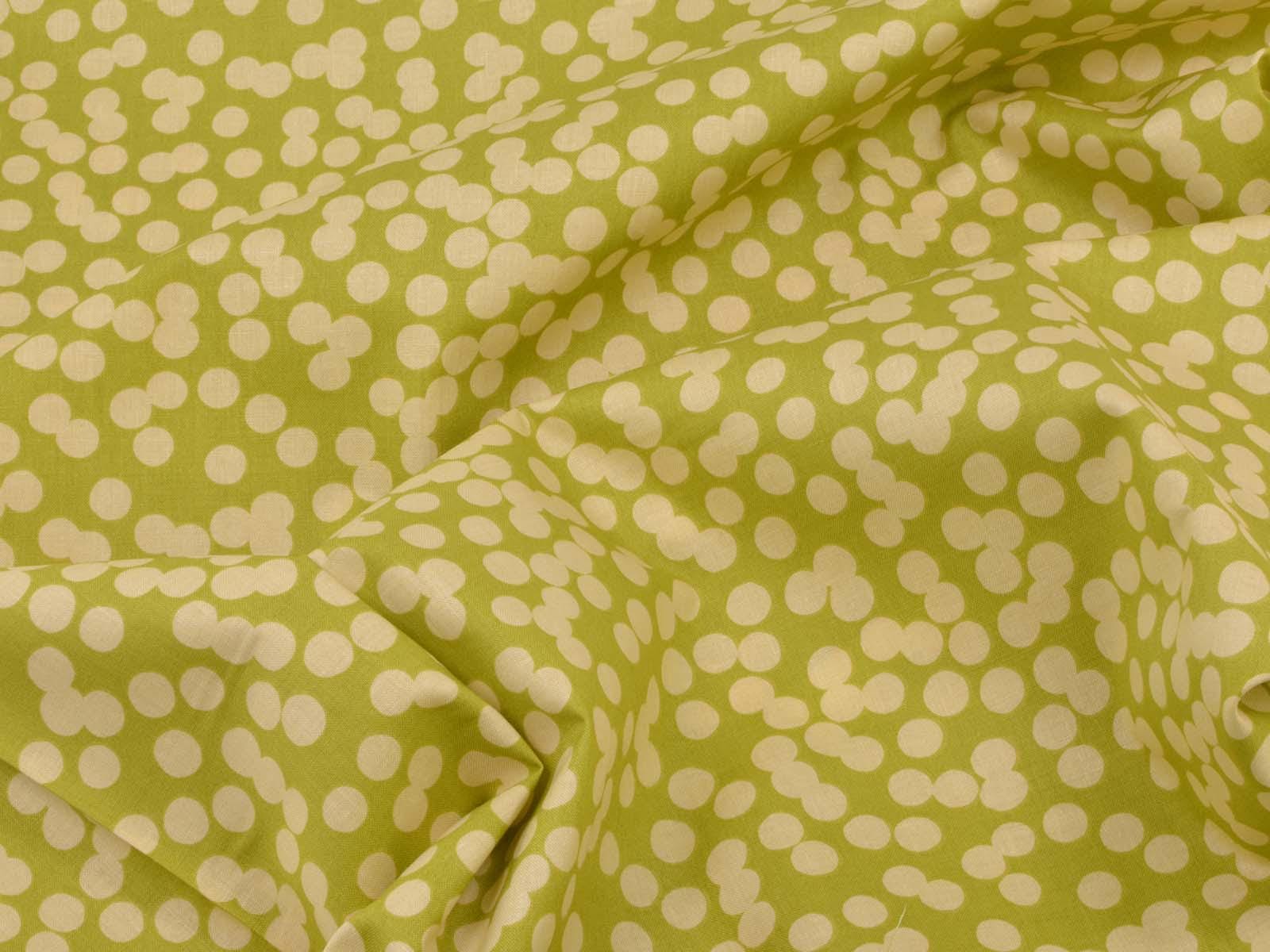 Patchwork fabric made of cotton. The fabric is thin, smooth, and matte. It is green with beige dots. The woven fabric is perfect for sewing pillows, accessories, bags, bag linings, and much more.