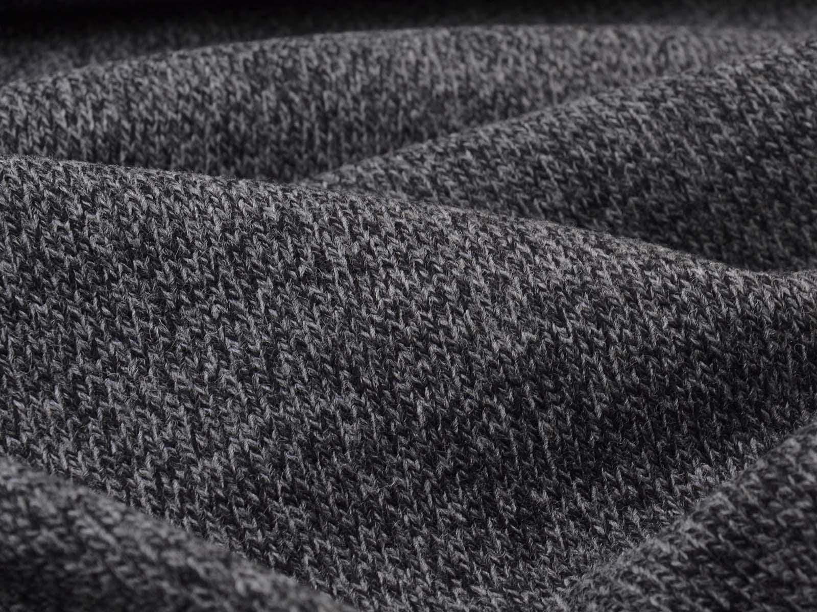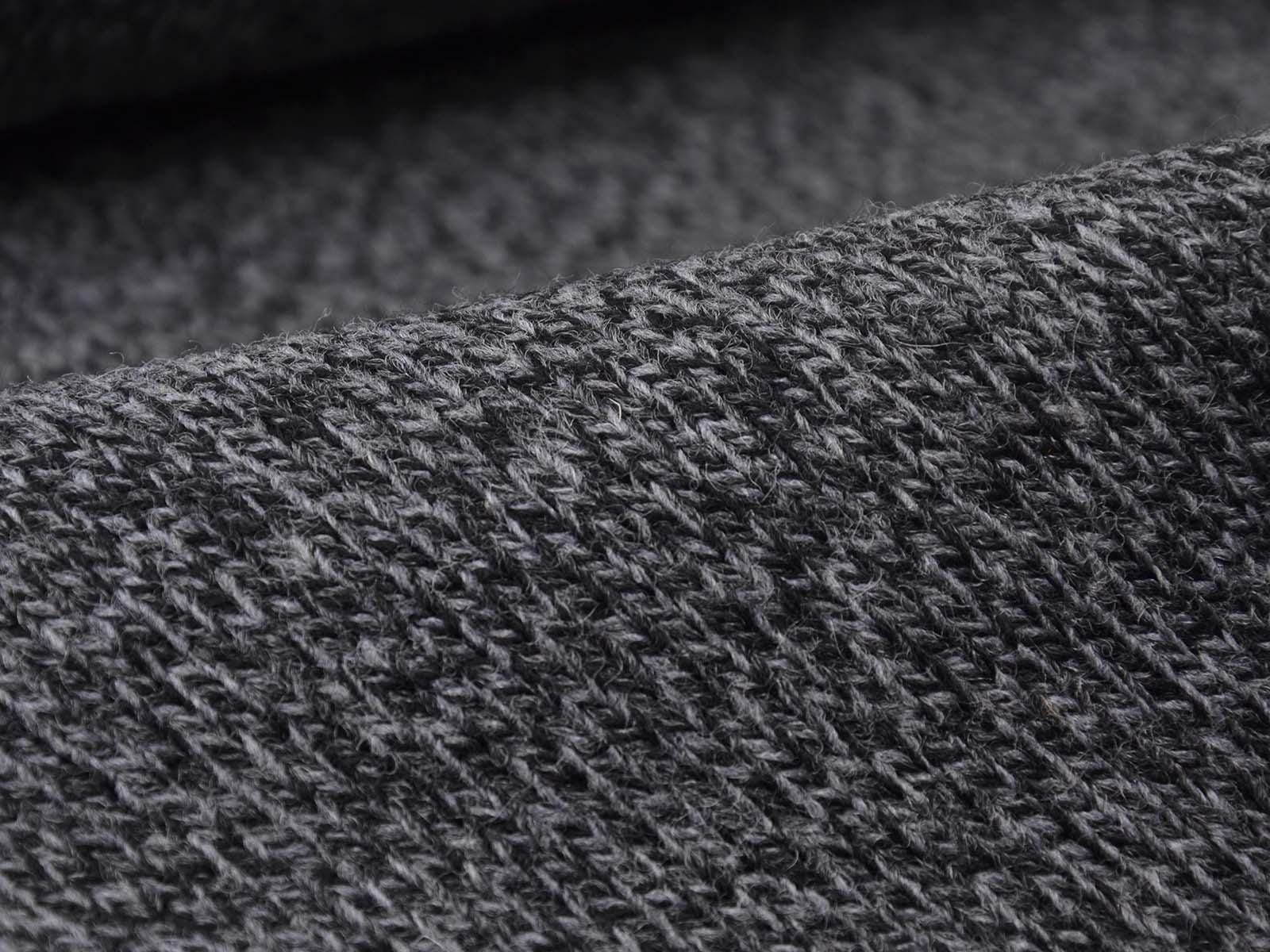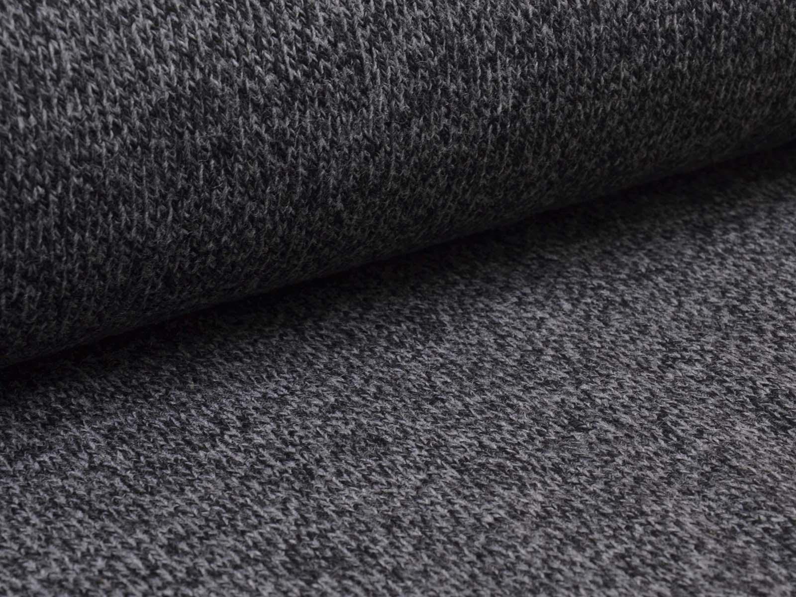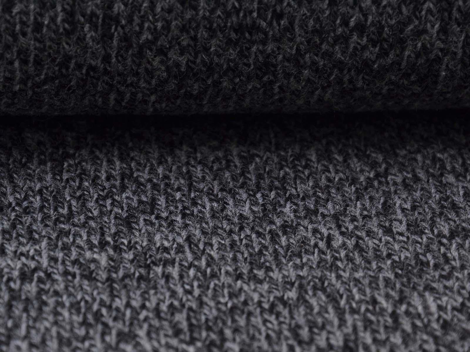 Very high-quality fabric with wool. Both sides of the fabric can be used. One side is a chunky knit in mottled dark gray. The other side is a black fleece. Sew great jackets, vests, and much more with it.