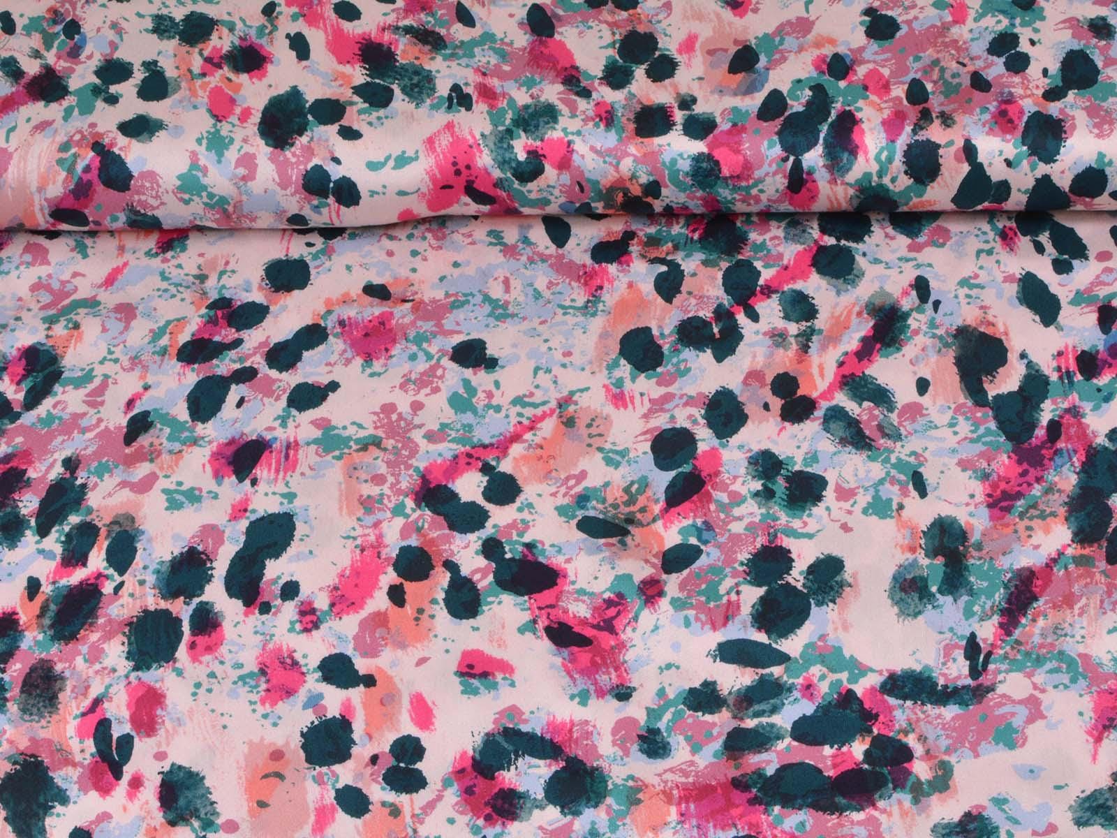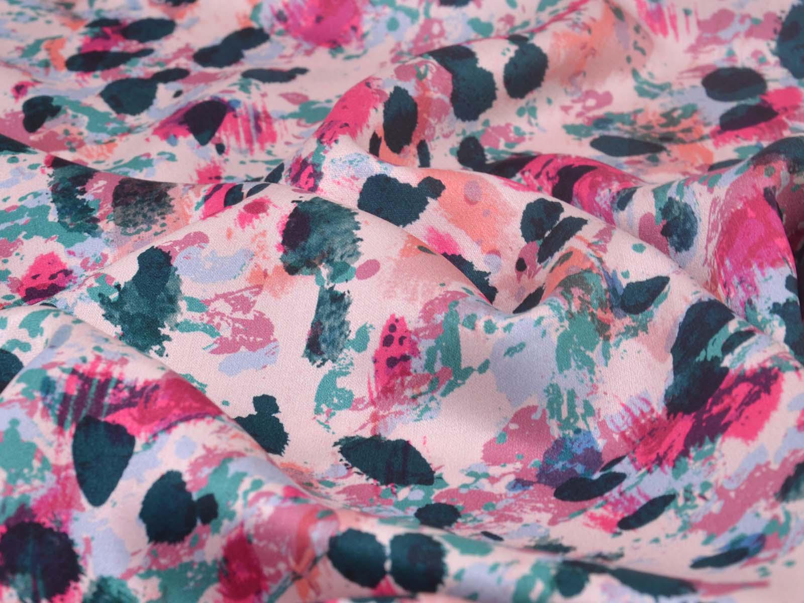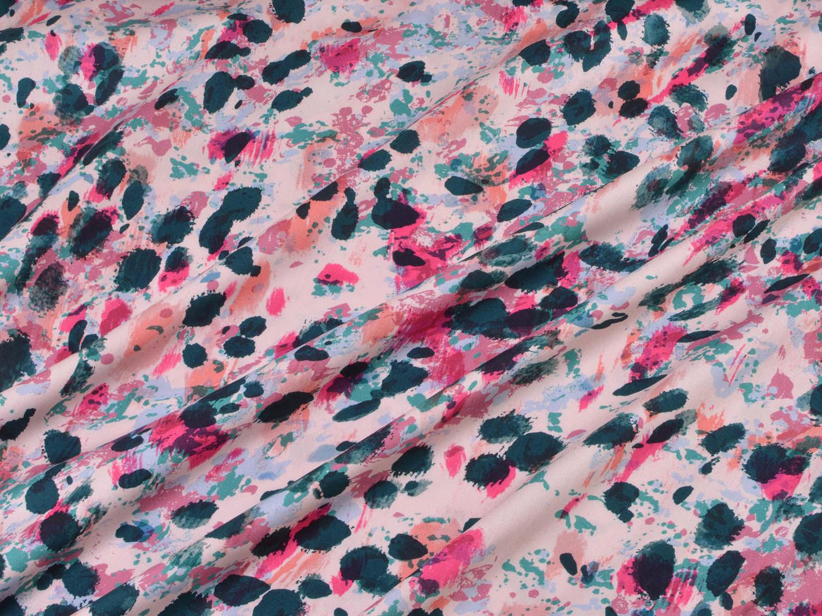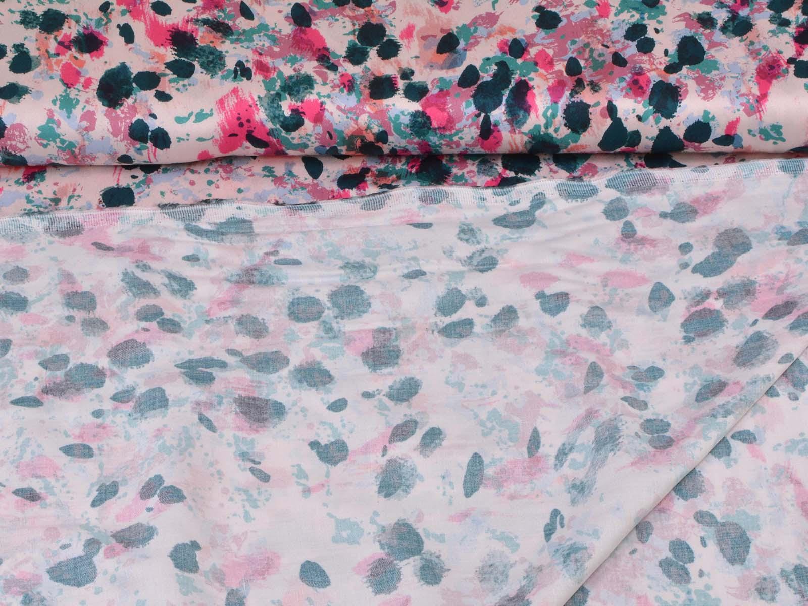Woven viscose fabric with splashes of petrol, pink, rose, and turquoise. The fabric is made in Italy. The viscose is lightweight, thin, drapes beautifully, and has a subtle sheen. It is perfect for sewing dresses, blouses, summer trousers, skirts, and much more.