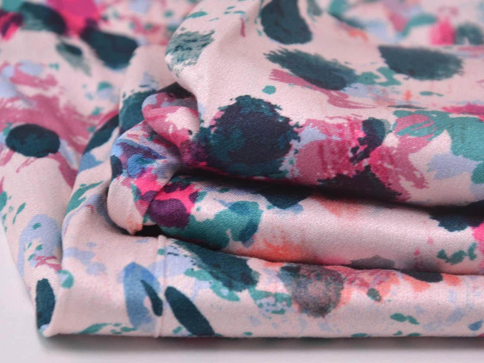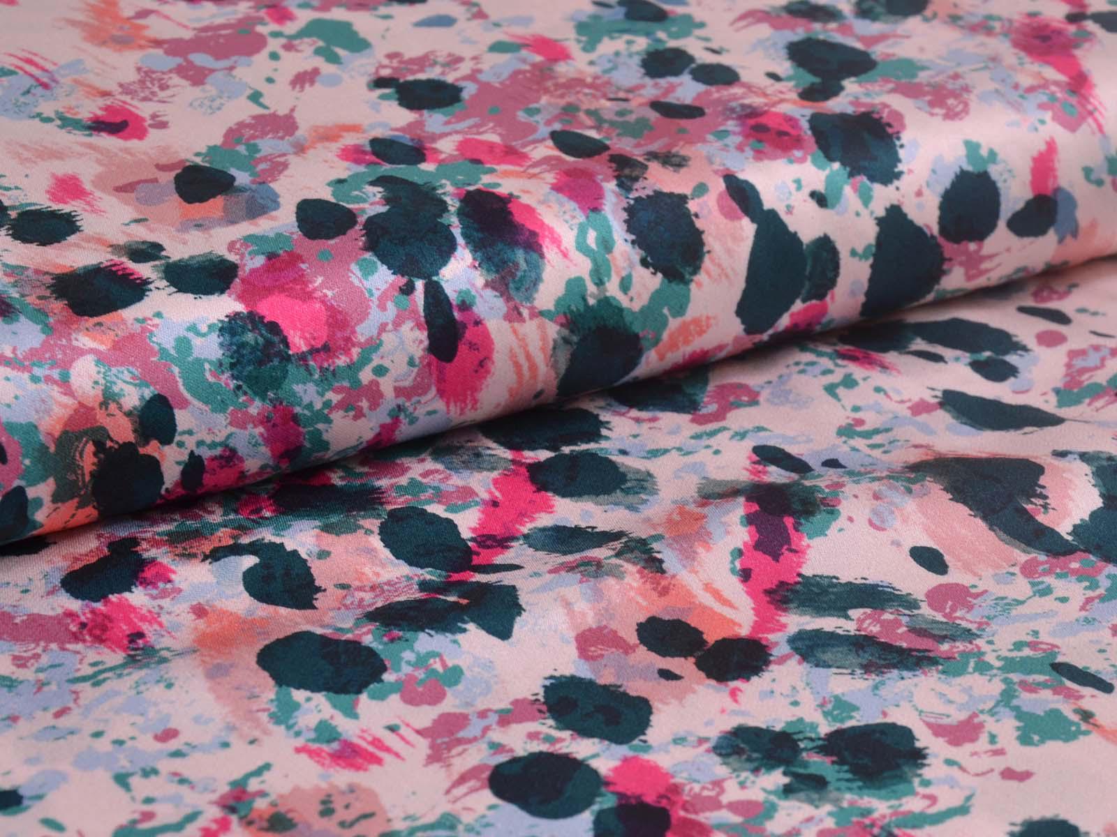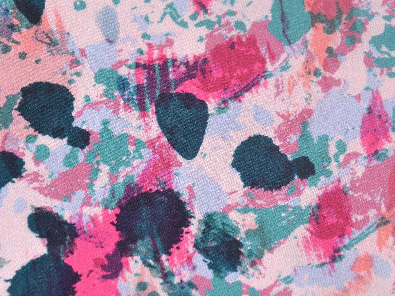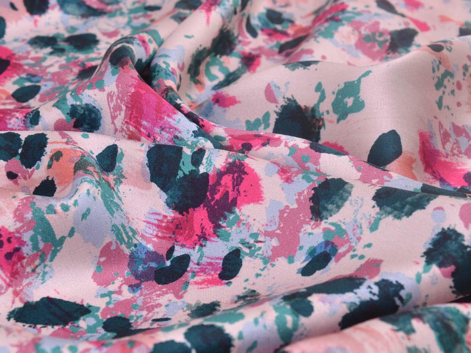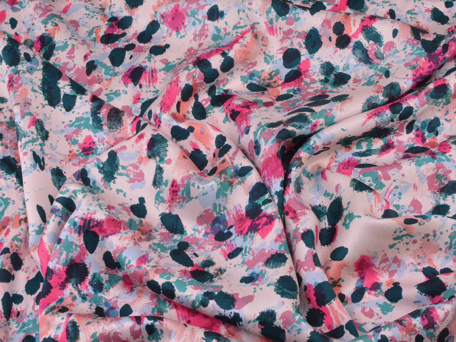 Woven viscose fabric with splashes of petrol, pink, rose, and turquoise. The fabric is made in Italy. The viscose is lightweight, thin, drapes beautifully, and has a subtle sheen. It is perfect for sewing dresses, blouses, summer trousers, skirts, and much more.