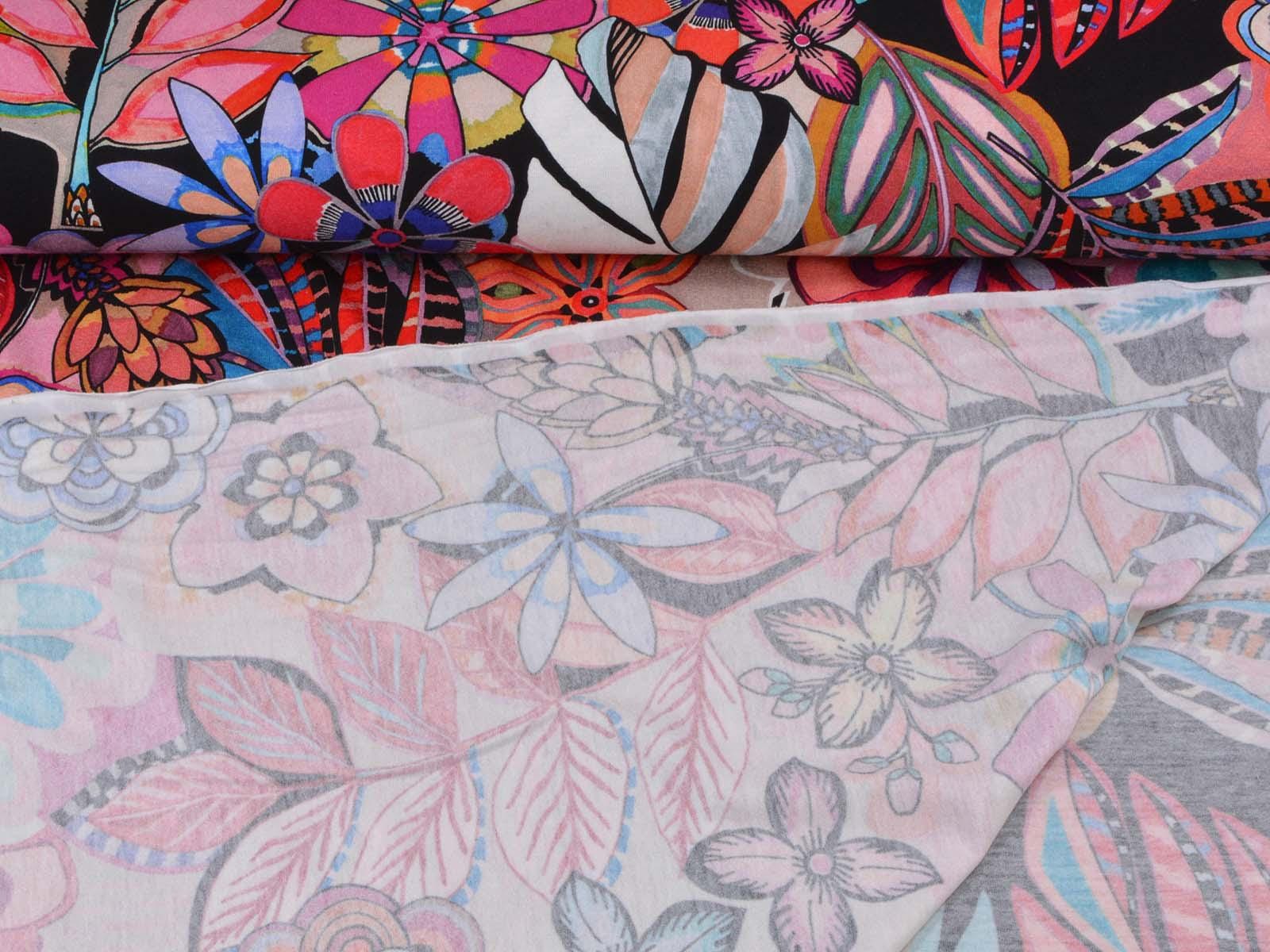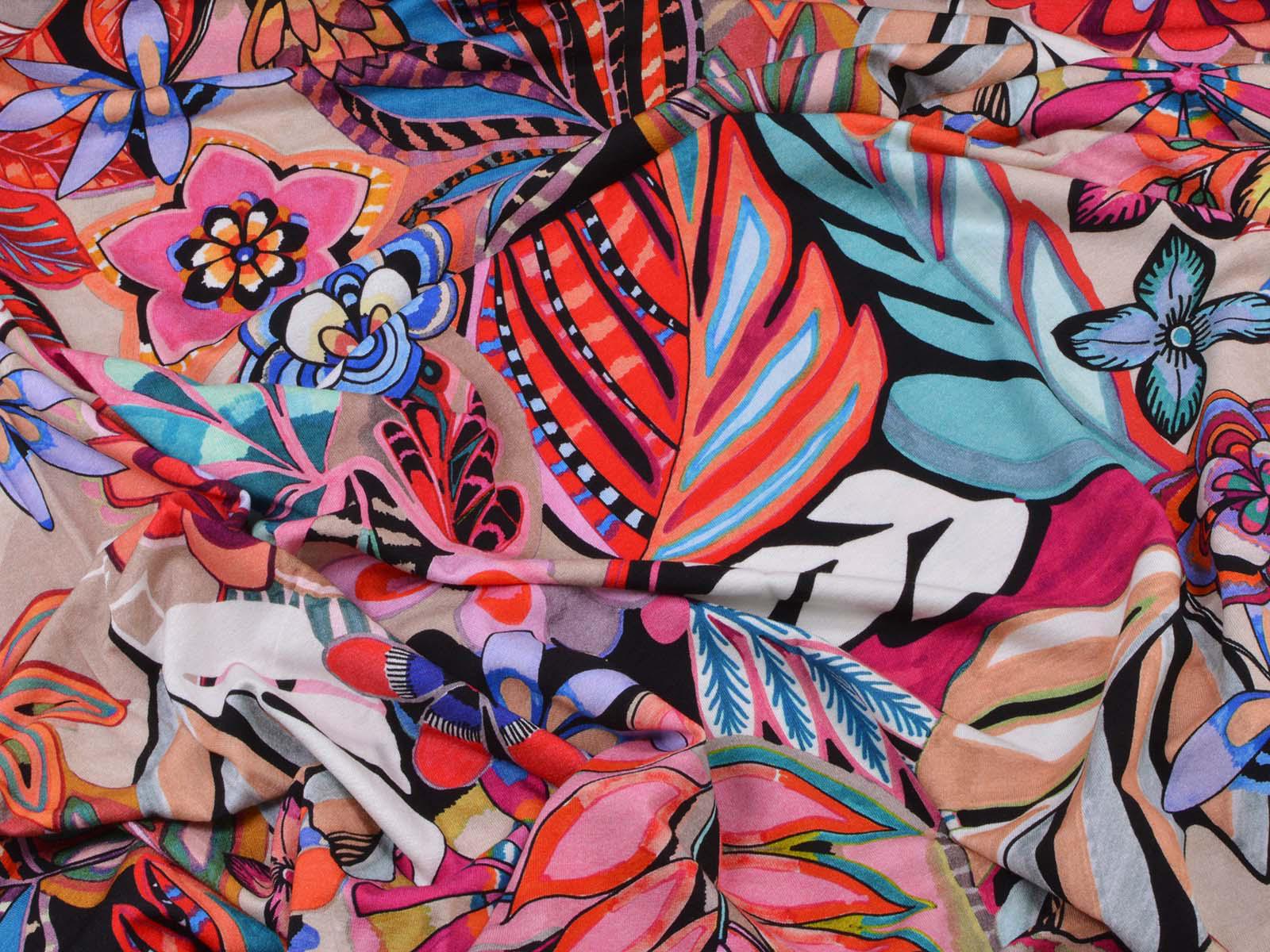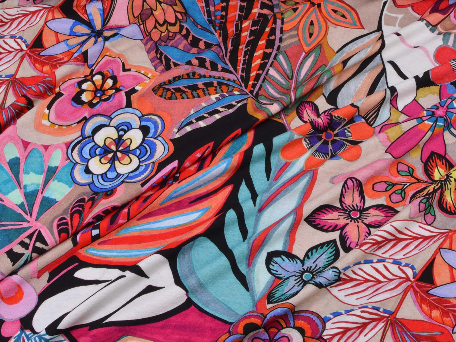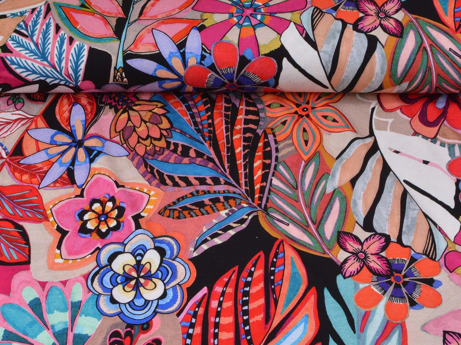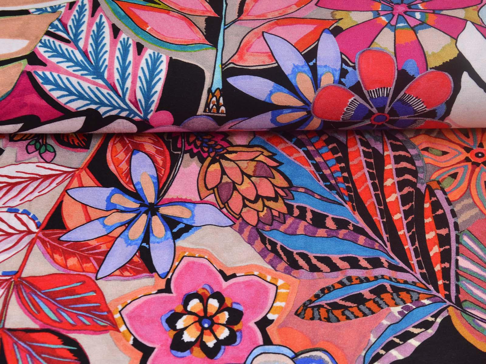 Jersey made of viscose and elastane, made in Italy. The fabric is thin, rather heavy, and has a flowing drape. It features large flowers. Use it to sew T-shirts, dresses, long-sleeved shirts, and much more.