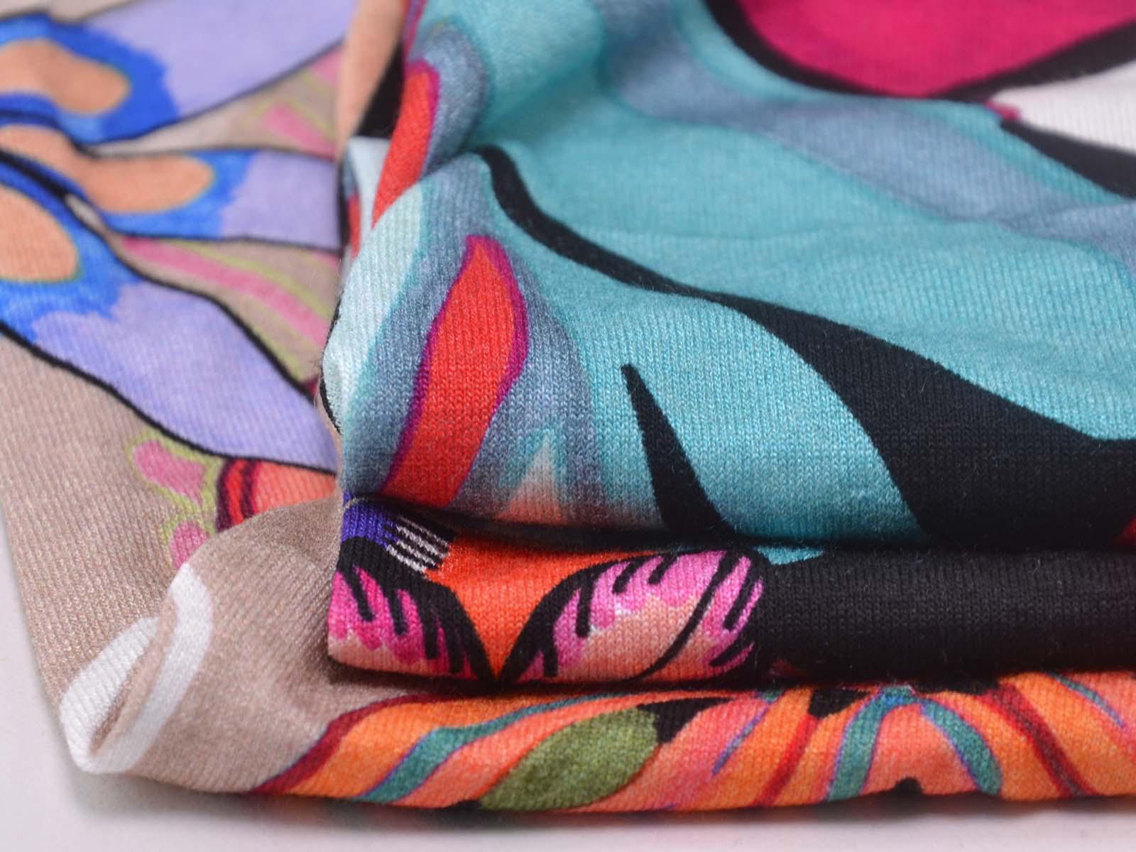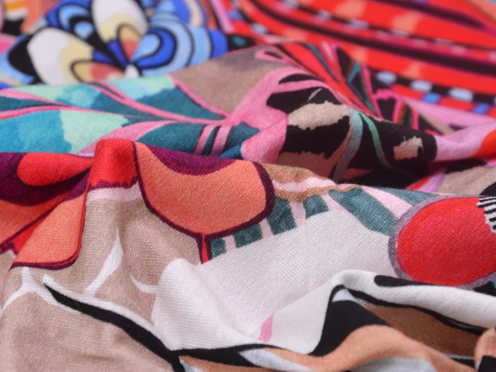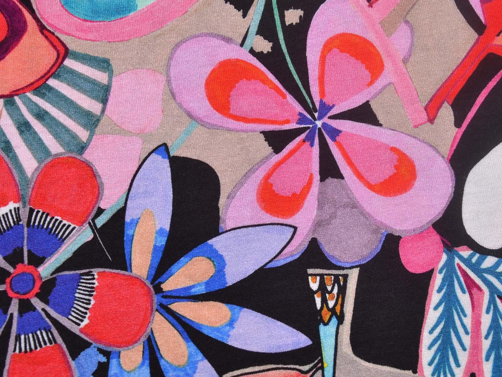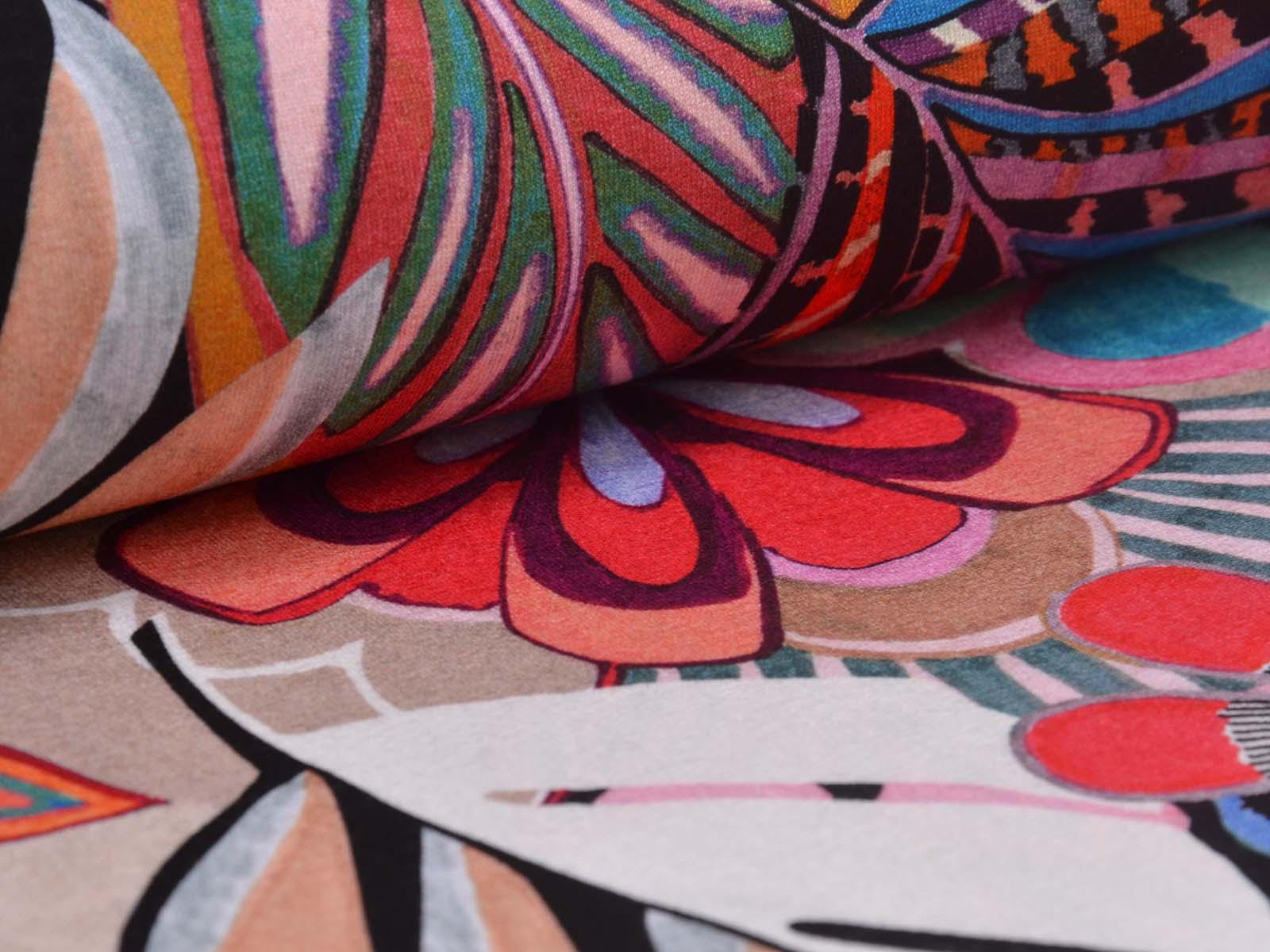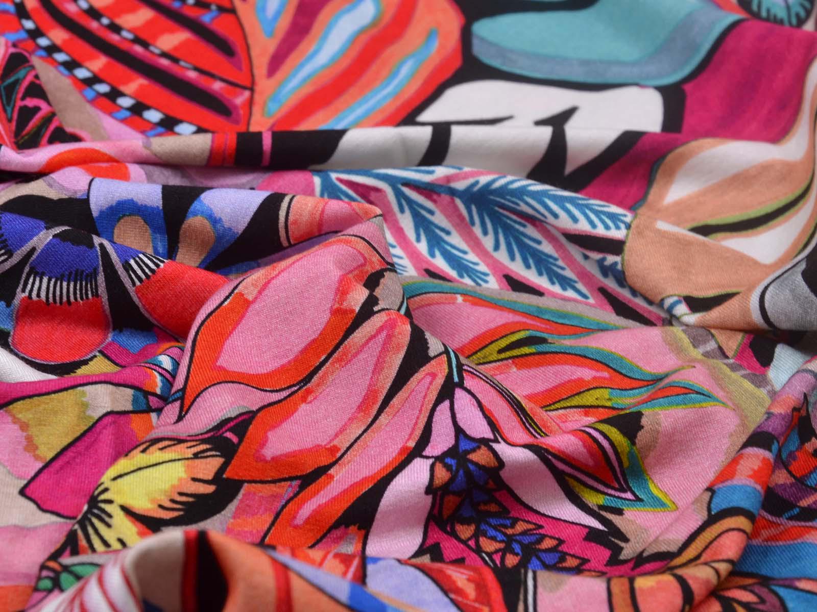 Jersey made of viscose and elastane, made in Italy. The fabric is thin, rather heavy, and has a flowing drape. It features large flowers. Use it to sew T-shirts, dresses, long-sleeved shirts, and much more.