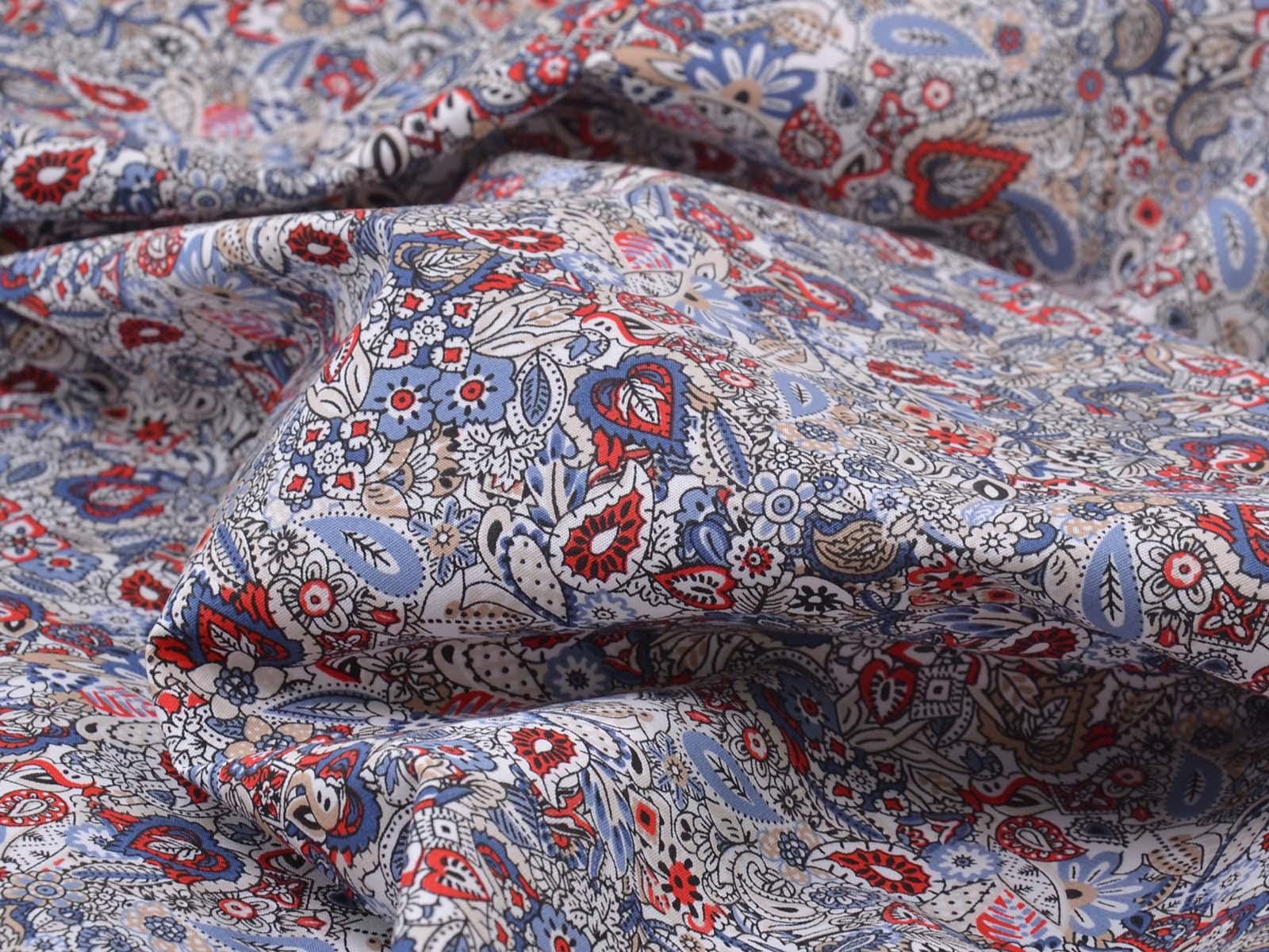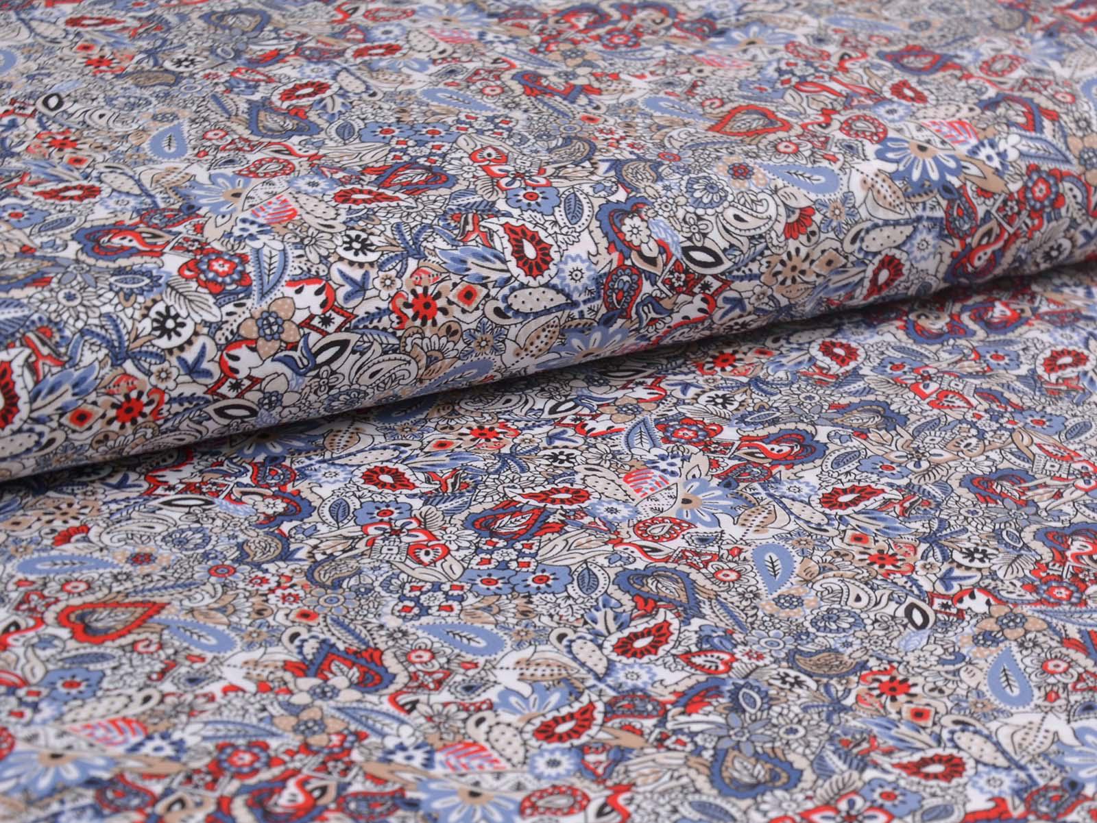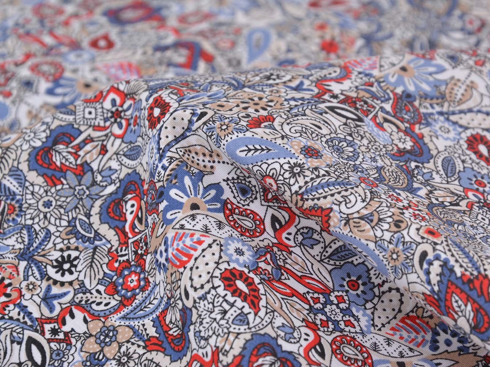 Woven cotton fabric with a floral and paisley pattern. The fabric is thin, medium-weight, smooth, and stretchy. It is suitable for sewing summer clothing such as blouses, dresses, trousers, and skirts.