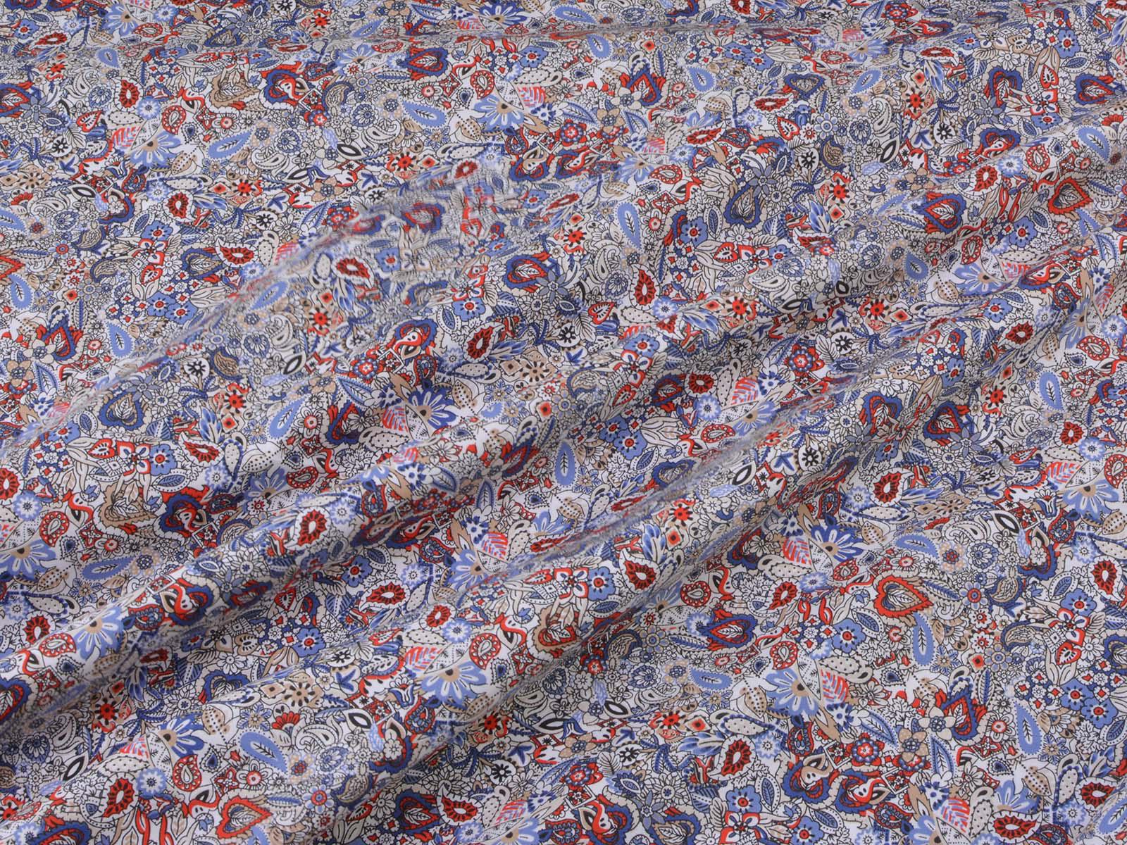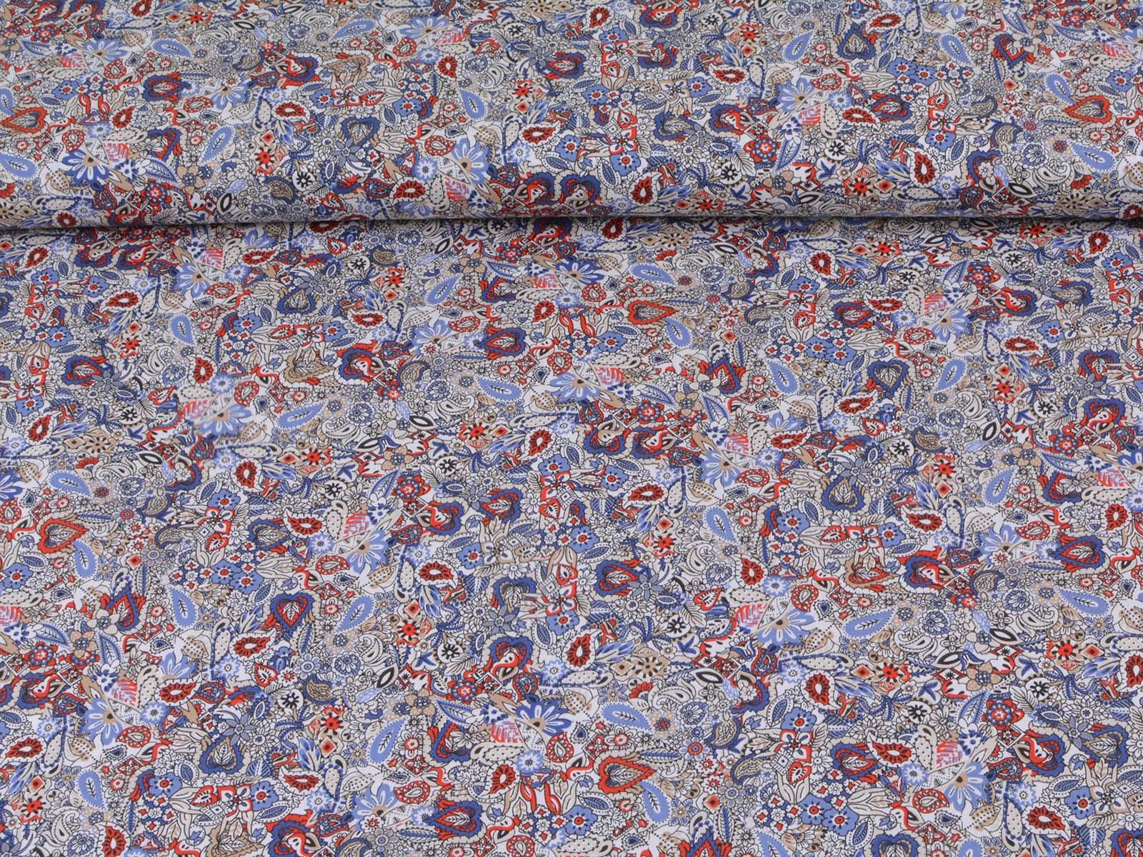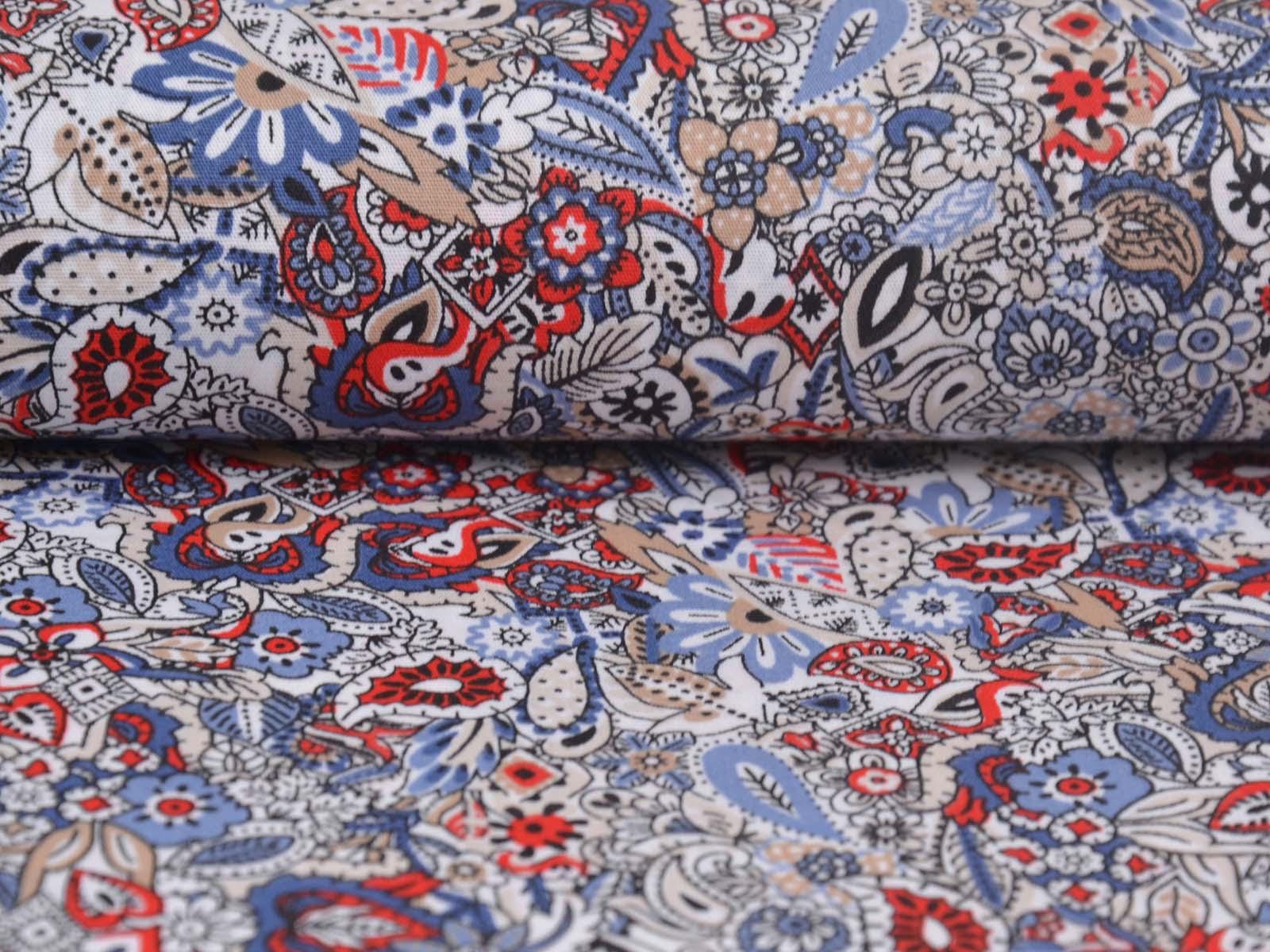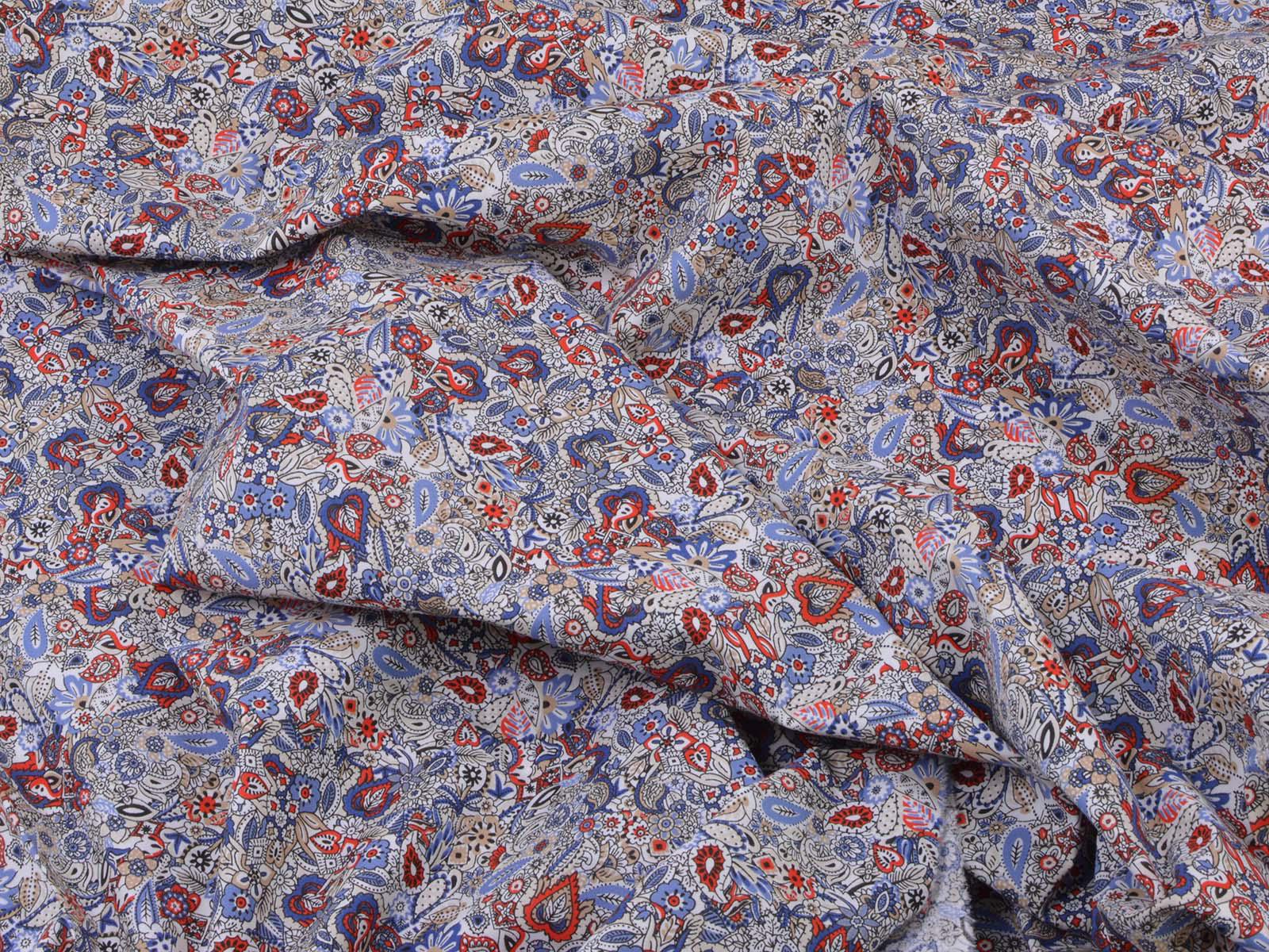 Woven cotton fabric with a floral and paisley pattern. The fabric is thin, medium-weight, smooth, and stretchy. It is suitable for sewing summer clothing such as blouses, dresses, trousers, and skirts.