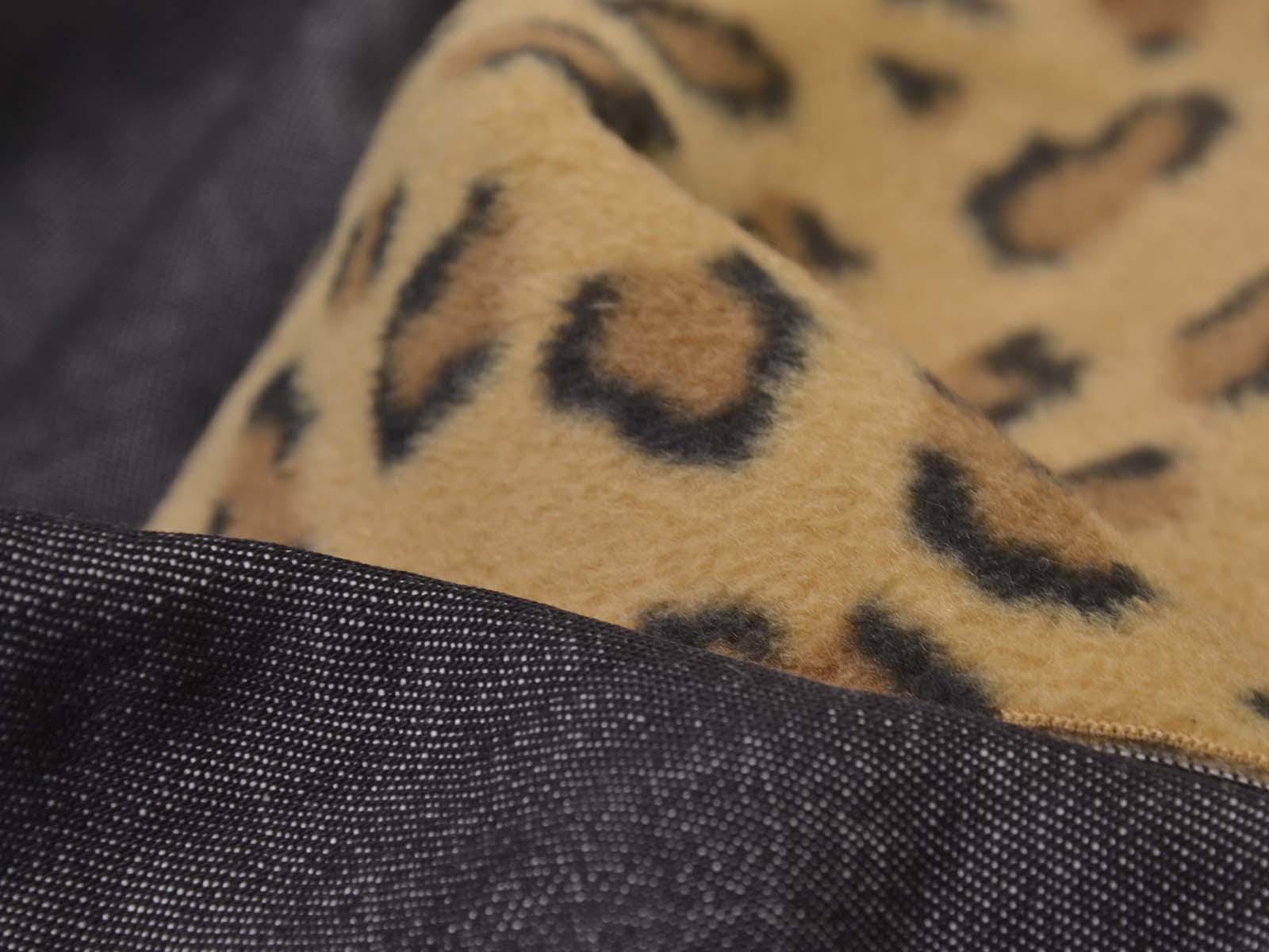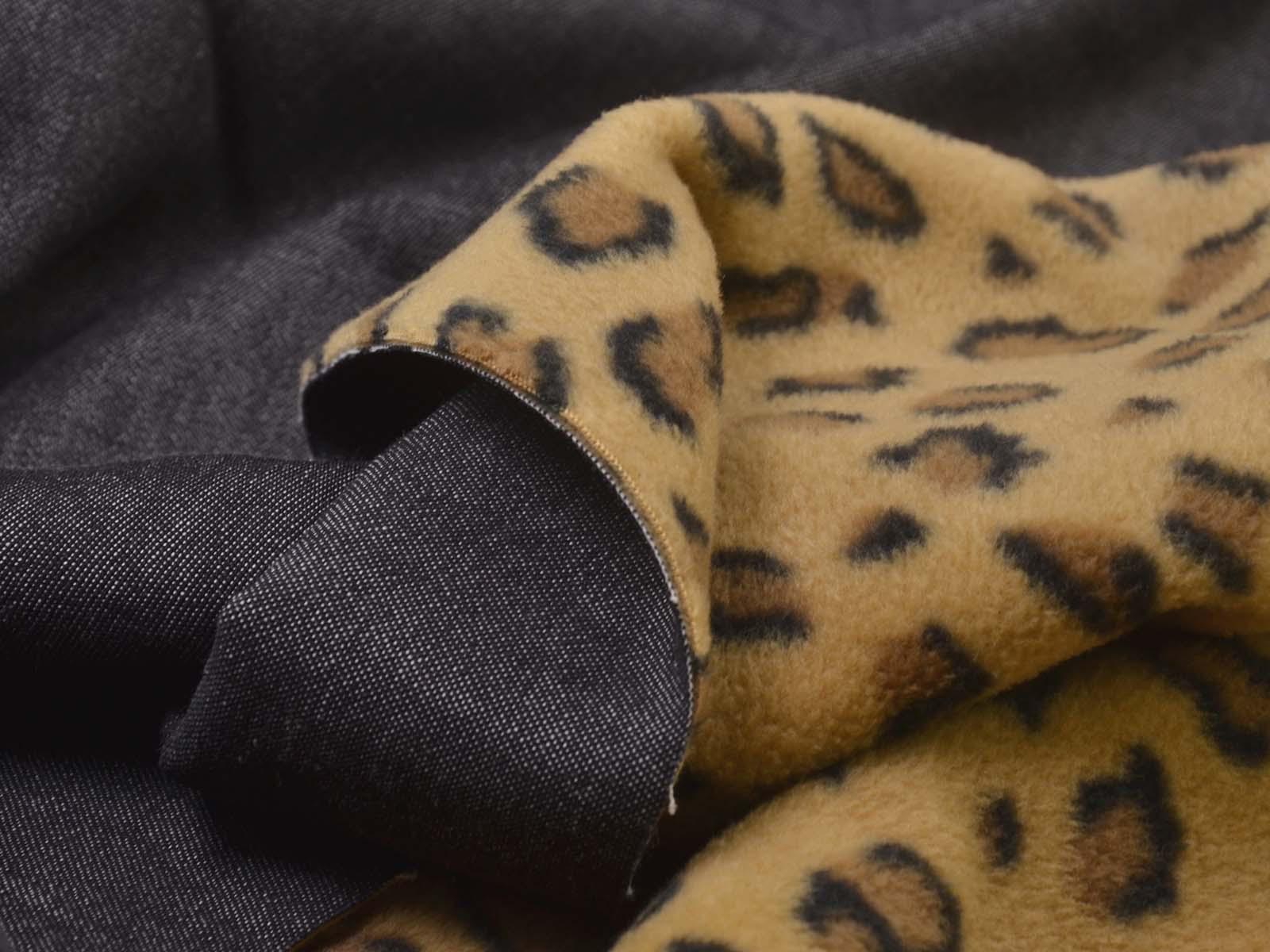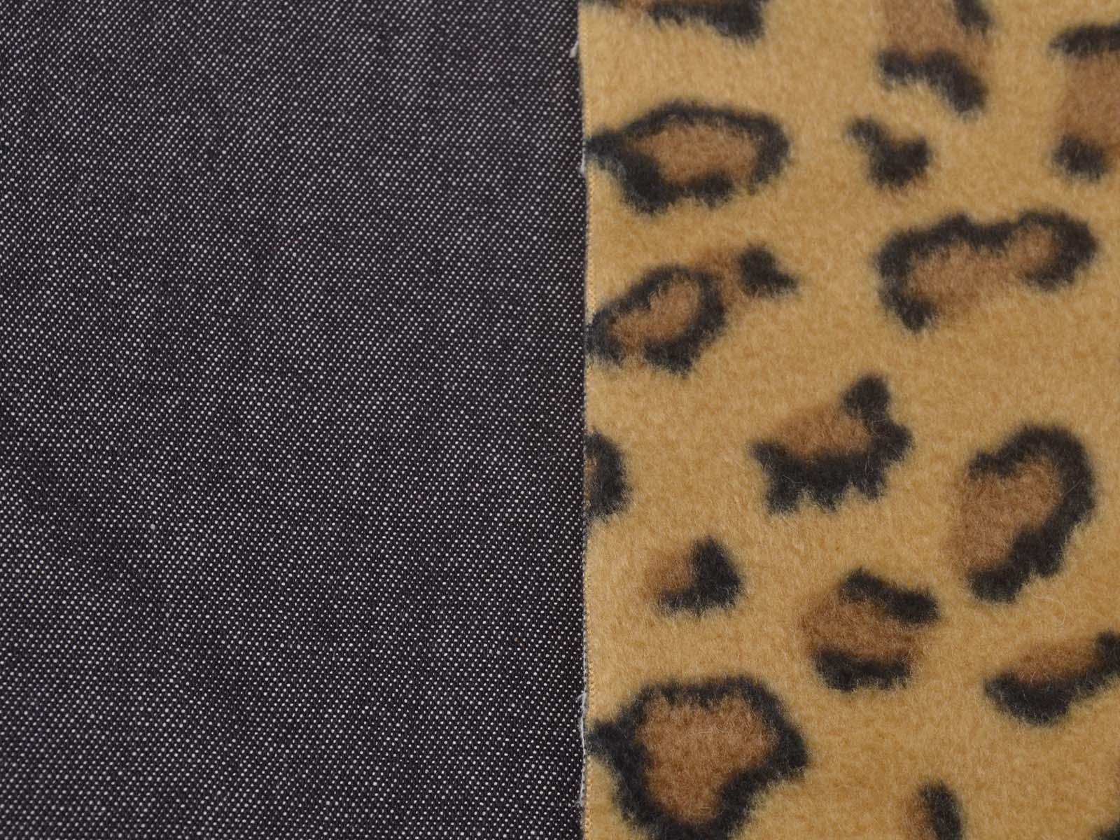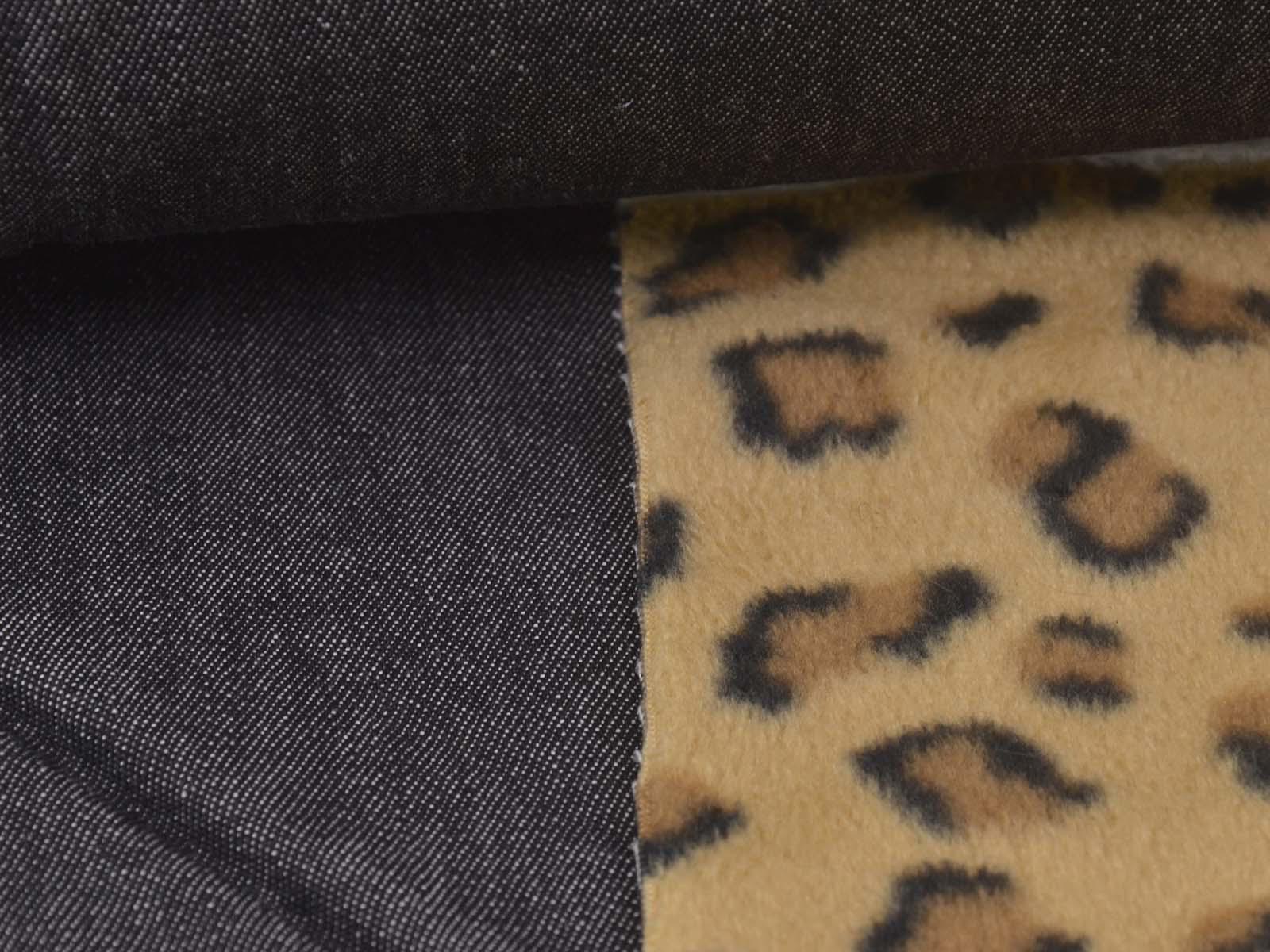 Cotton denim with a fleece backing. The denim is black melange. The fleece is beige with a leopard print. The denim is medium-weight, firm, and rather heavy. The fleece is soft. This fabric is suitable for sewing jackets, vests, and coats. It can be used on either side.
