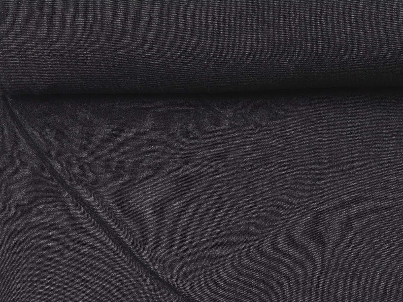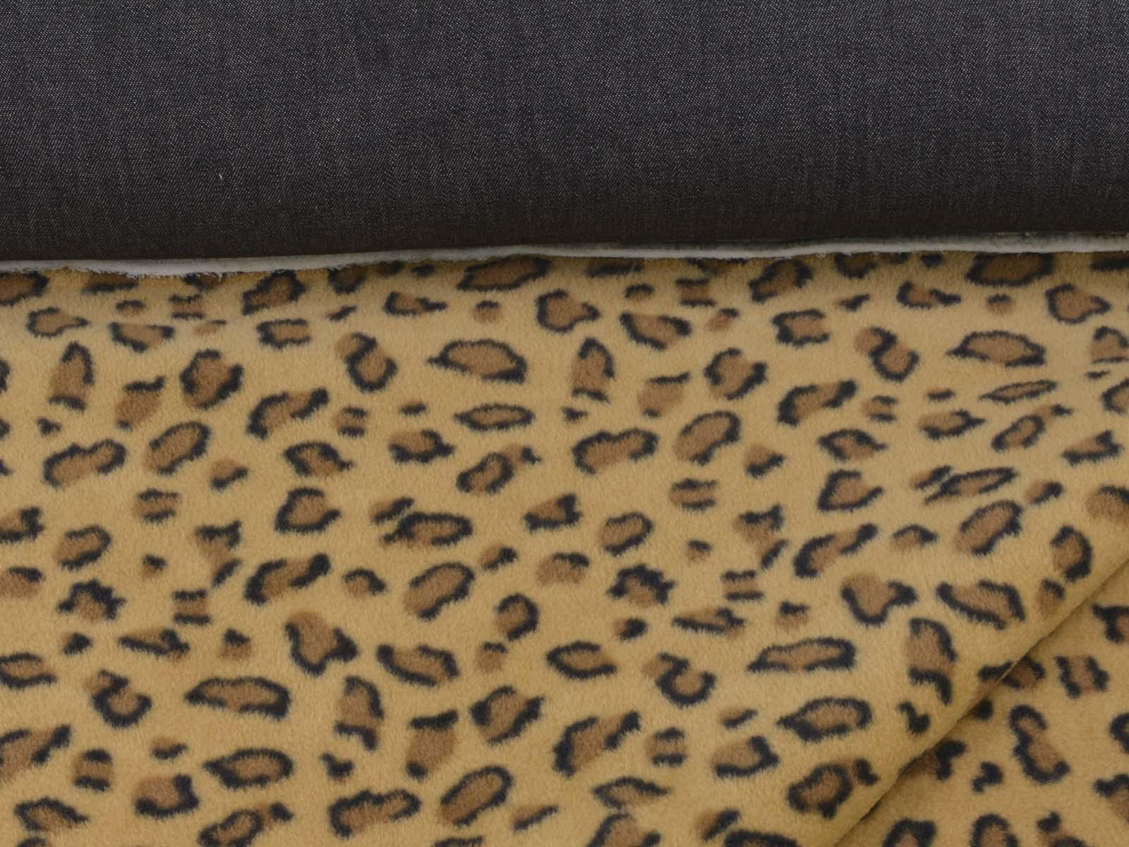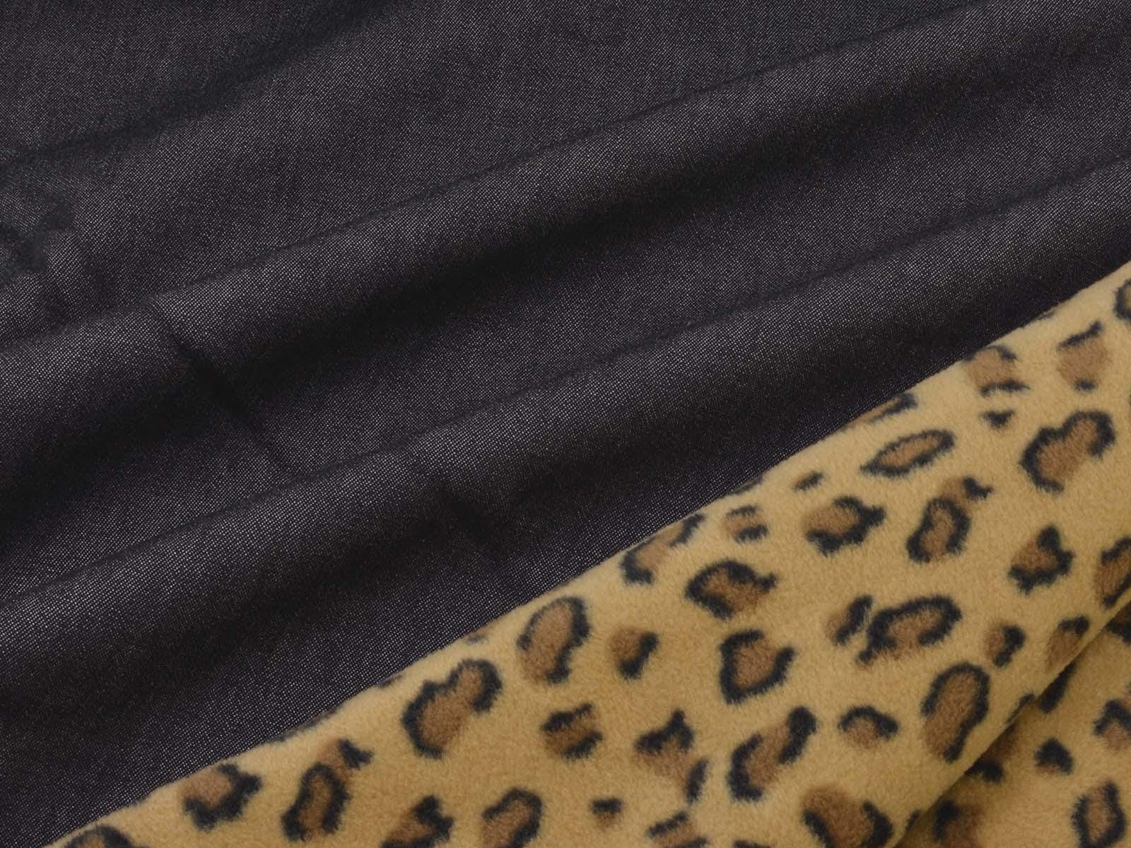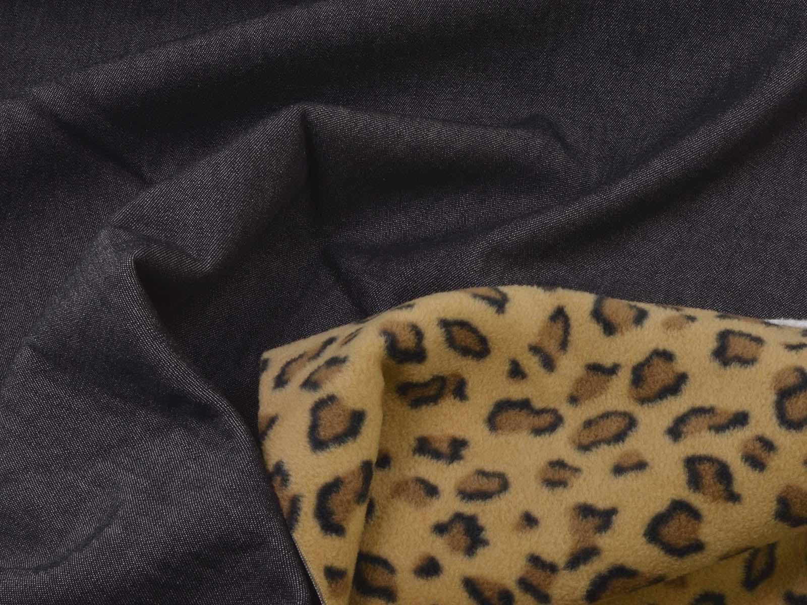 Cotton denim with a fleece backing. The denim is black melange. The fleece is beige with a leopard print. The denim is medium-weight, firm, and rather heavy. The fleece is soft. This fabric is suitable for sewing jackets, vests, and coats. It can be used on either side.