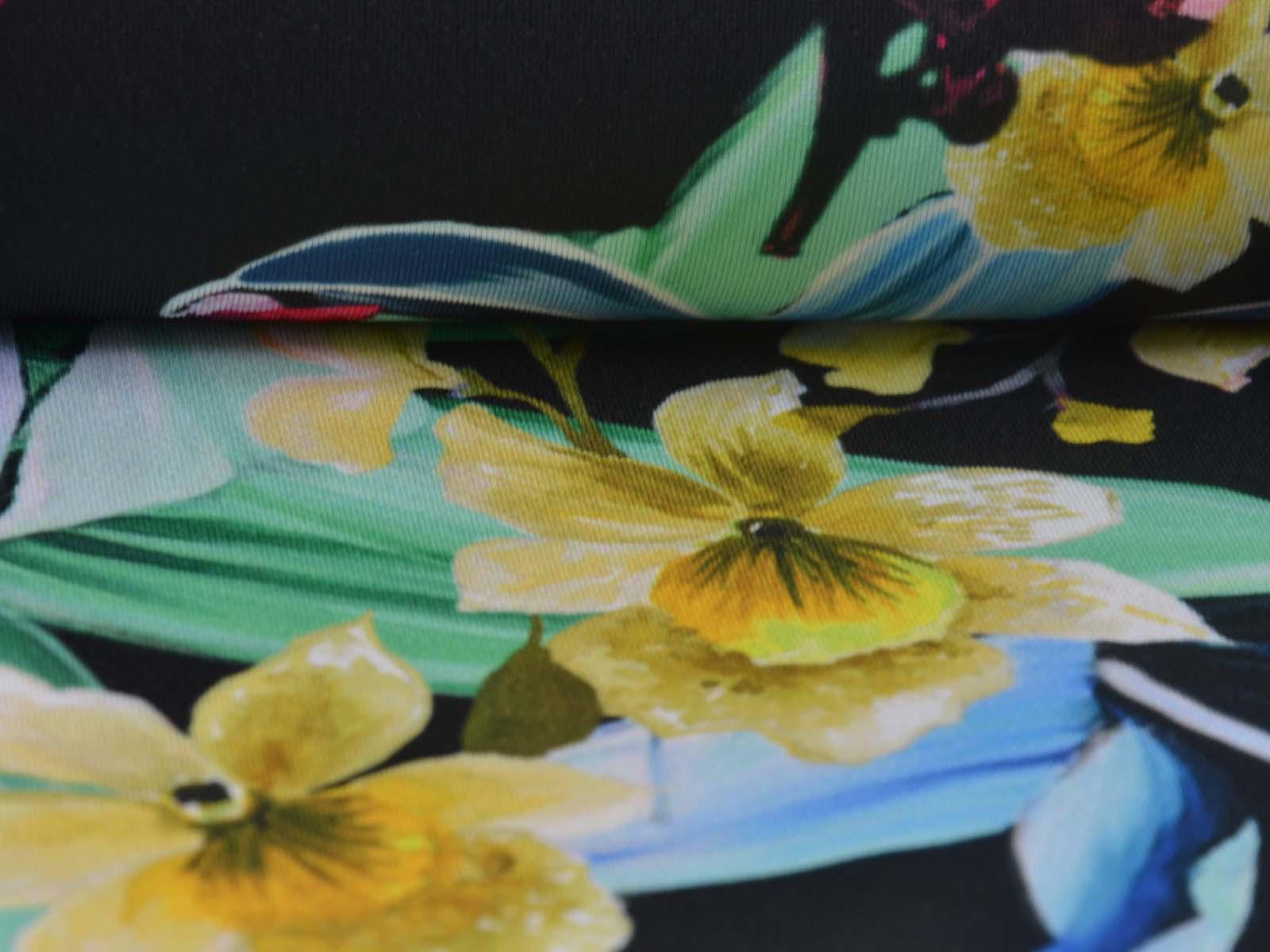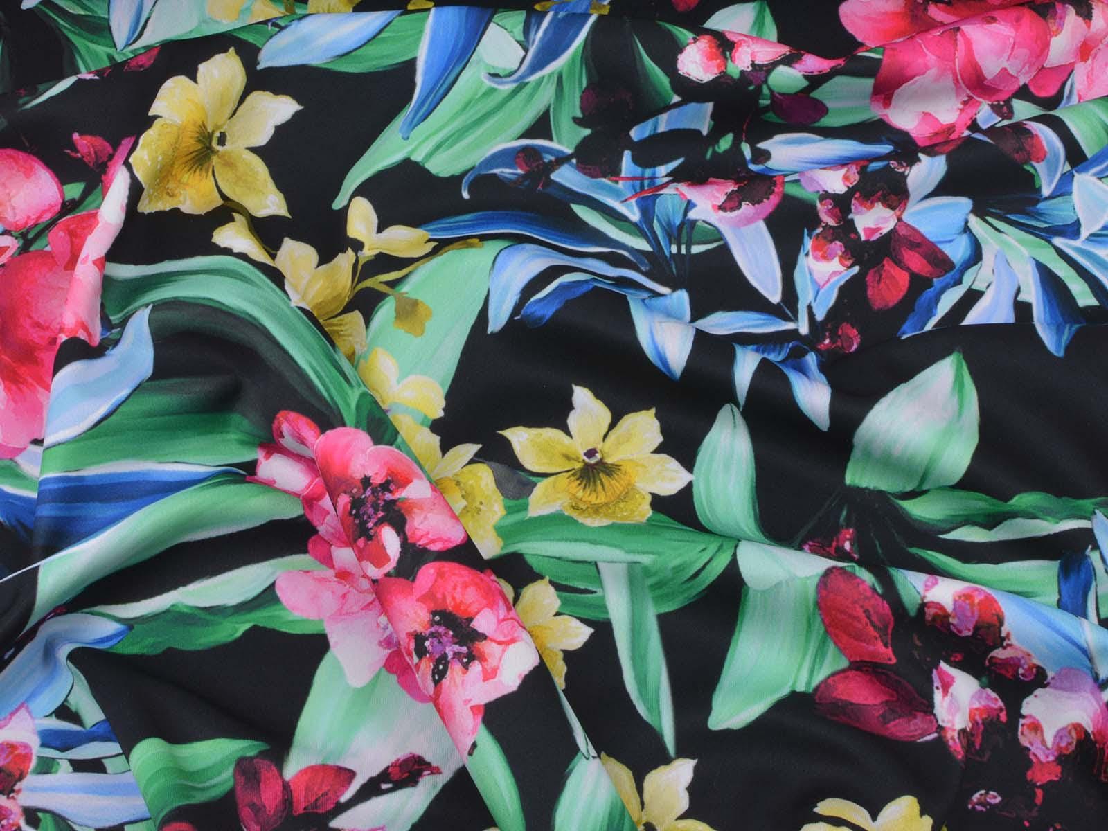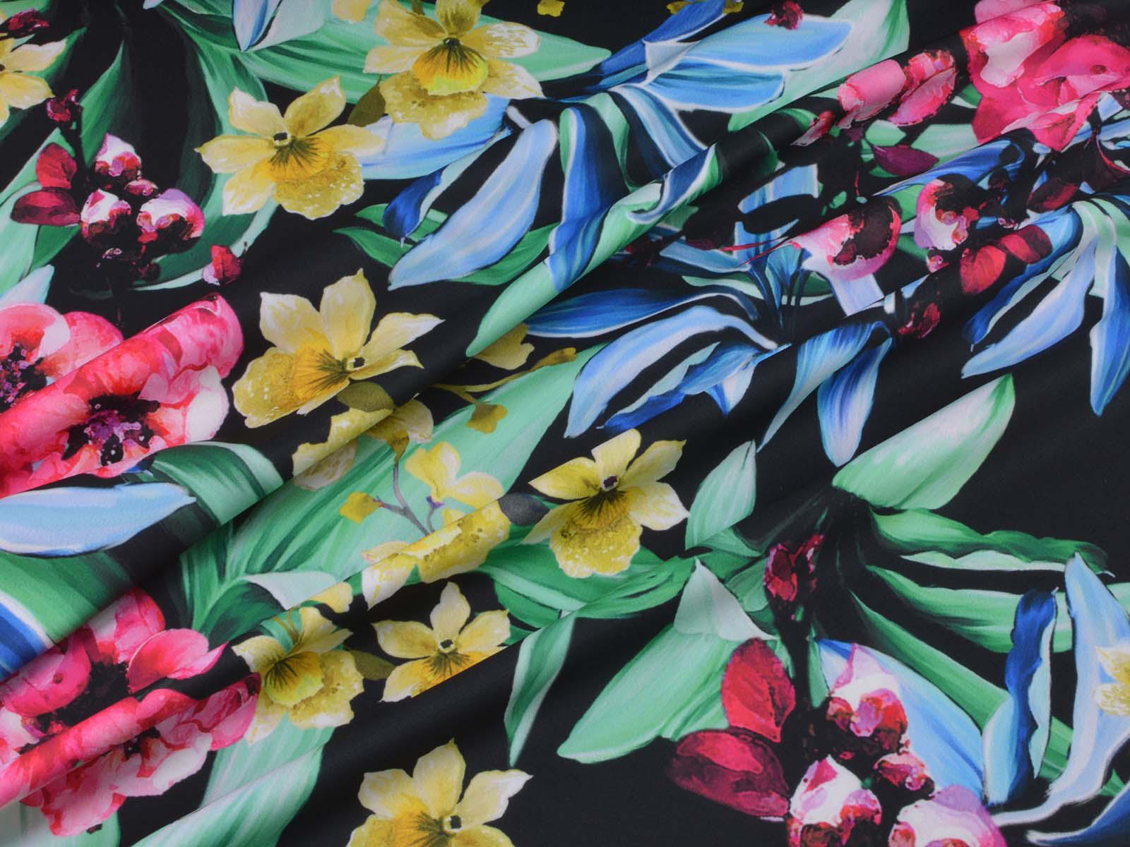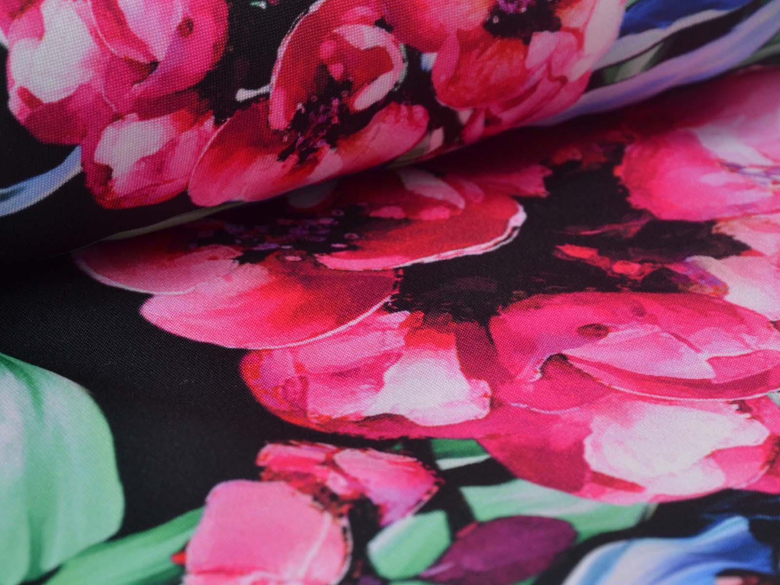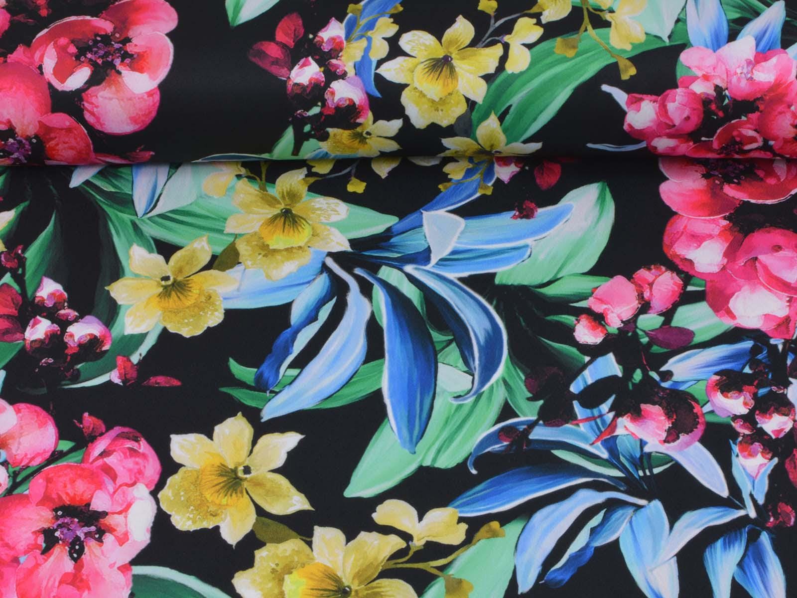 Polyester jersey with a floral pattern. The scuba fabric is double-knit. The reverse side is white, the right side has a colorful pattern. The fabric is smooth, rather heavy, and has a slight sheen. It is suitable for sewing sportswear, dresses, skirts, and much more.