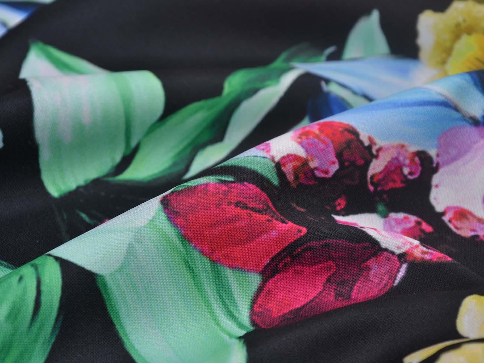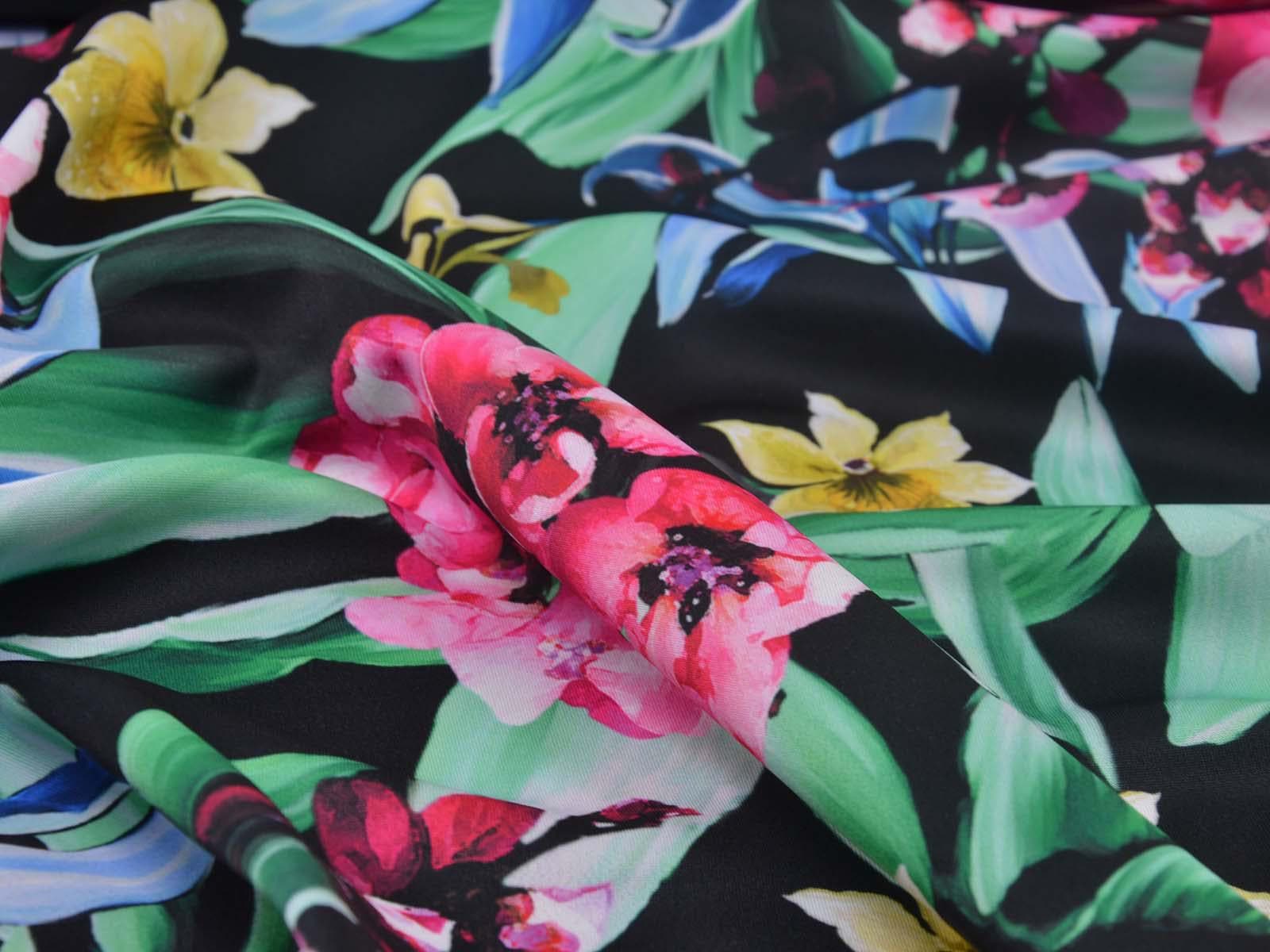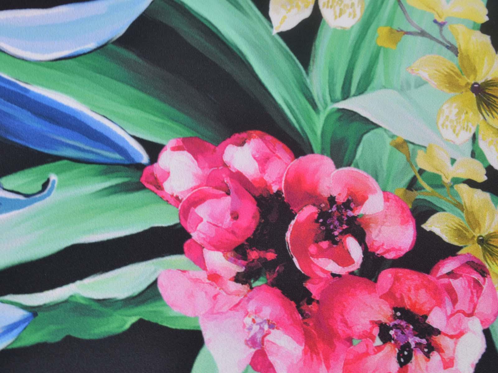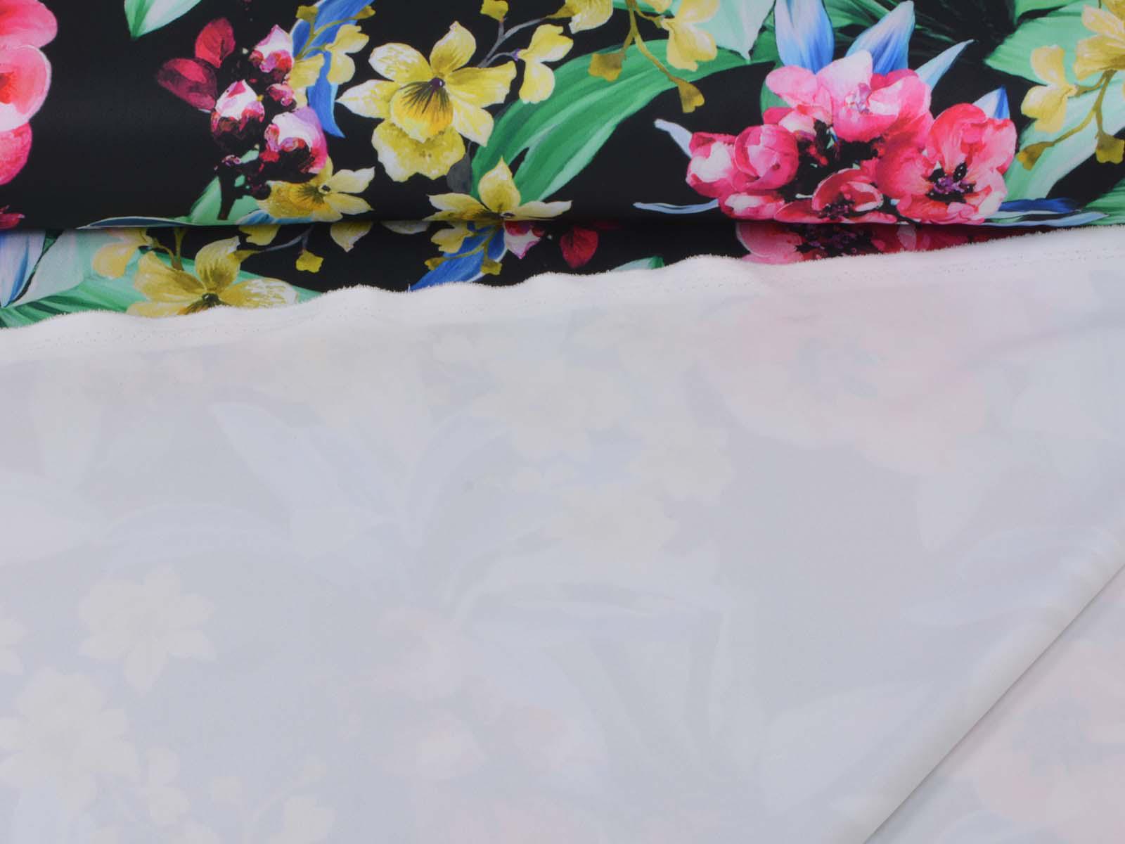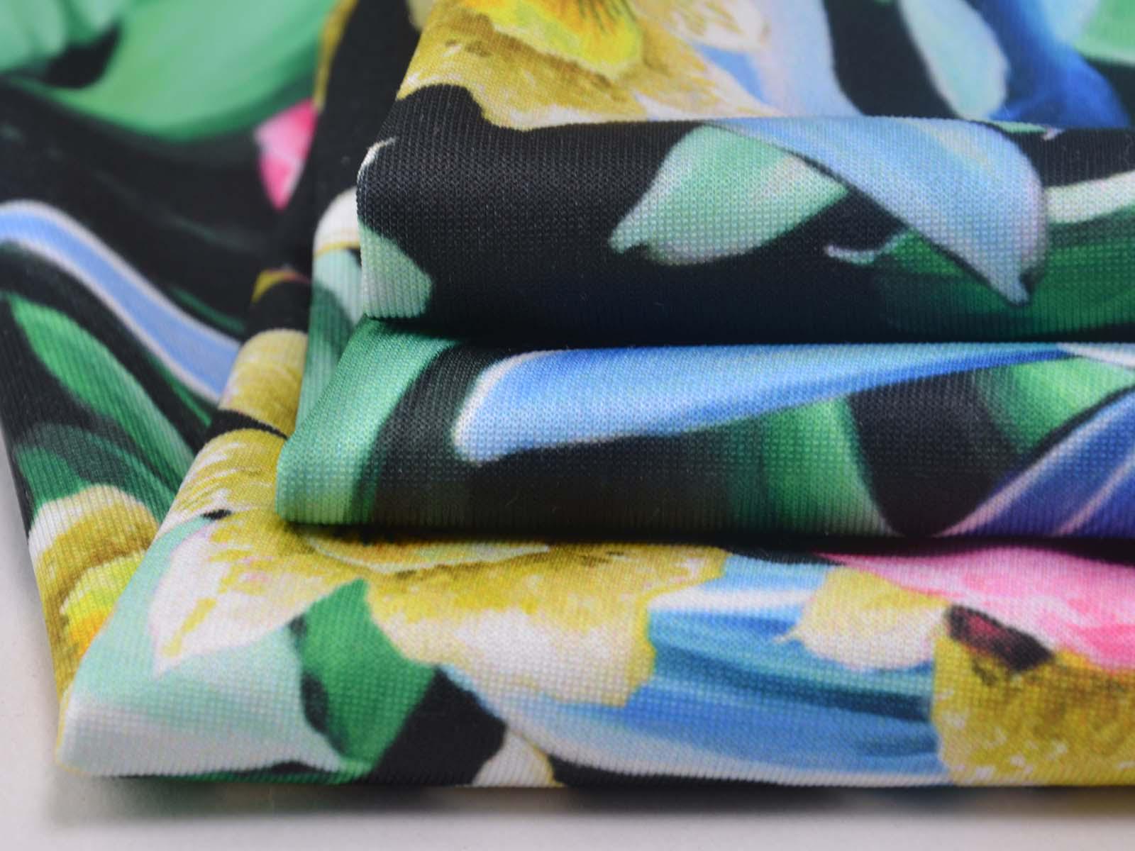 Polyester jersey with a floral pattern. The scuba fabric is double-knit. The reverse side is white, the right side has a colorful pattern. The fabric is smooth, rather heavy, and has a slight sheen. It is suitable for sewing sportswear, dresses, skirts, and much more.