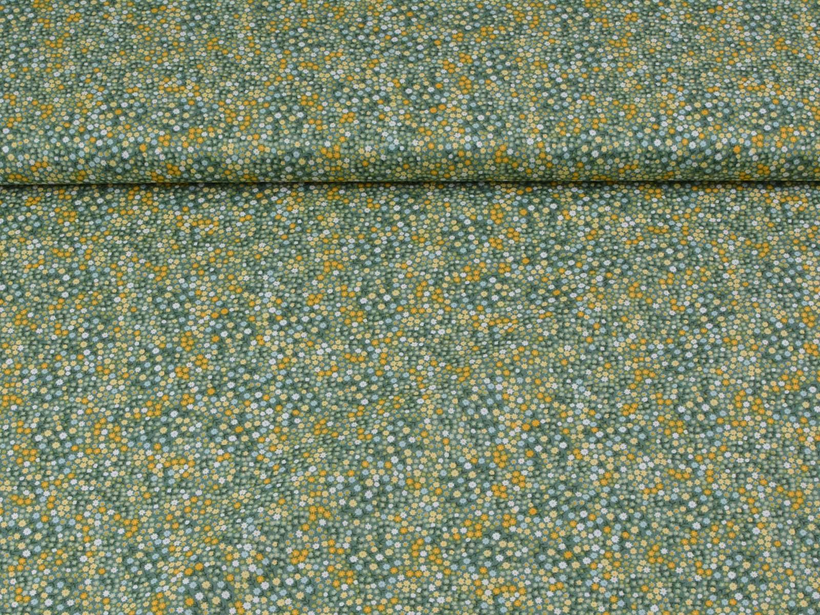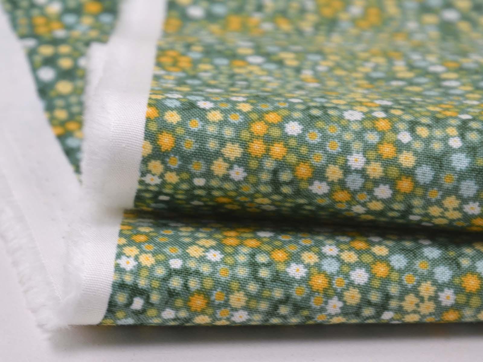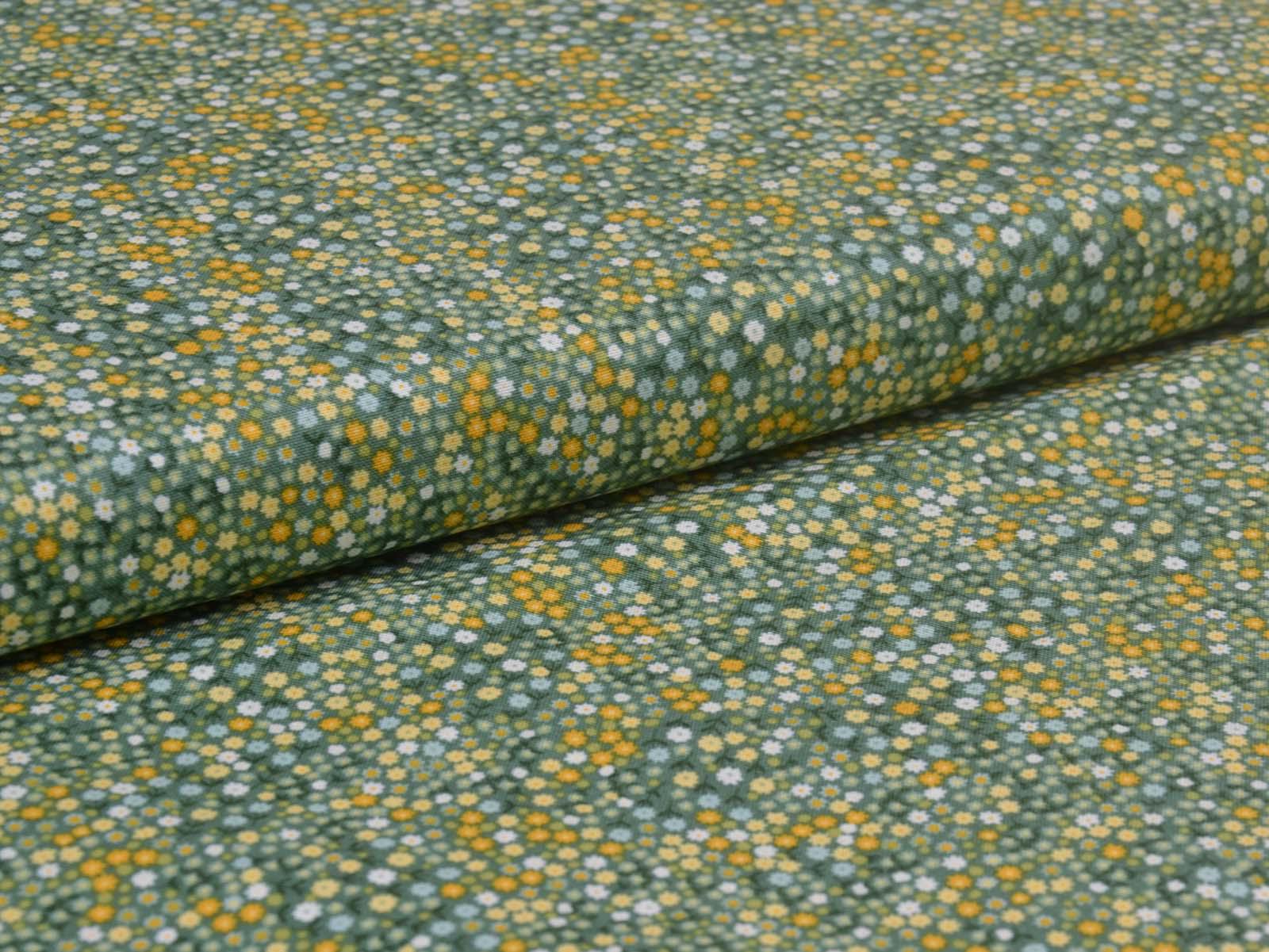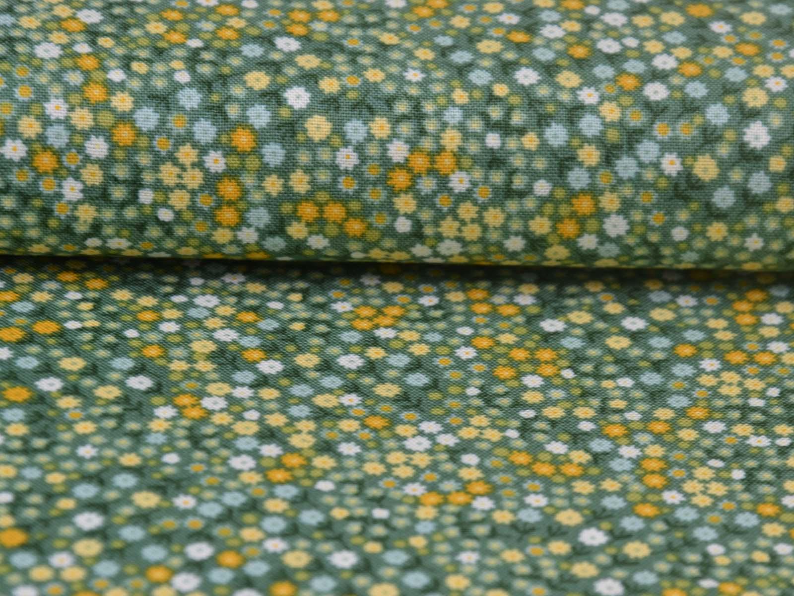 Woven cotton fabric from Makower UK. The fabric is green with small flowers. The cotton is smooth and thin. Sew cushions, bags, accessories, or use it for patchwork.